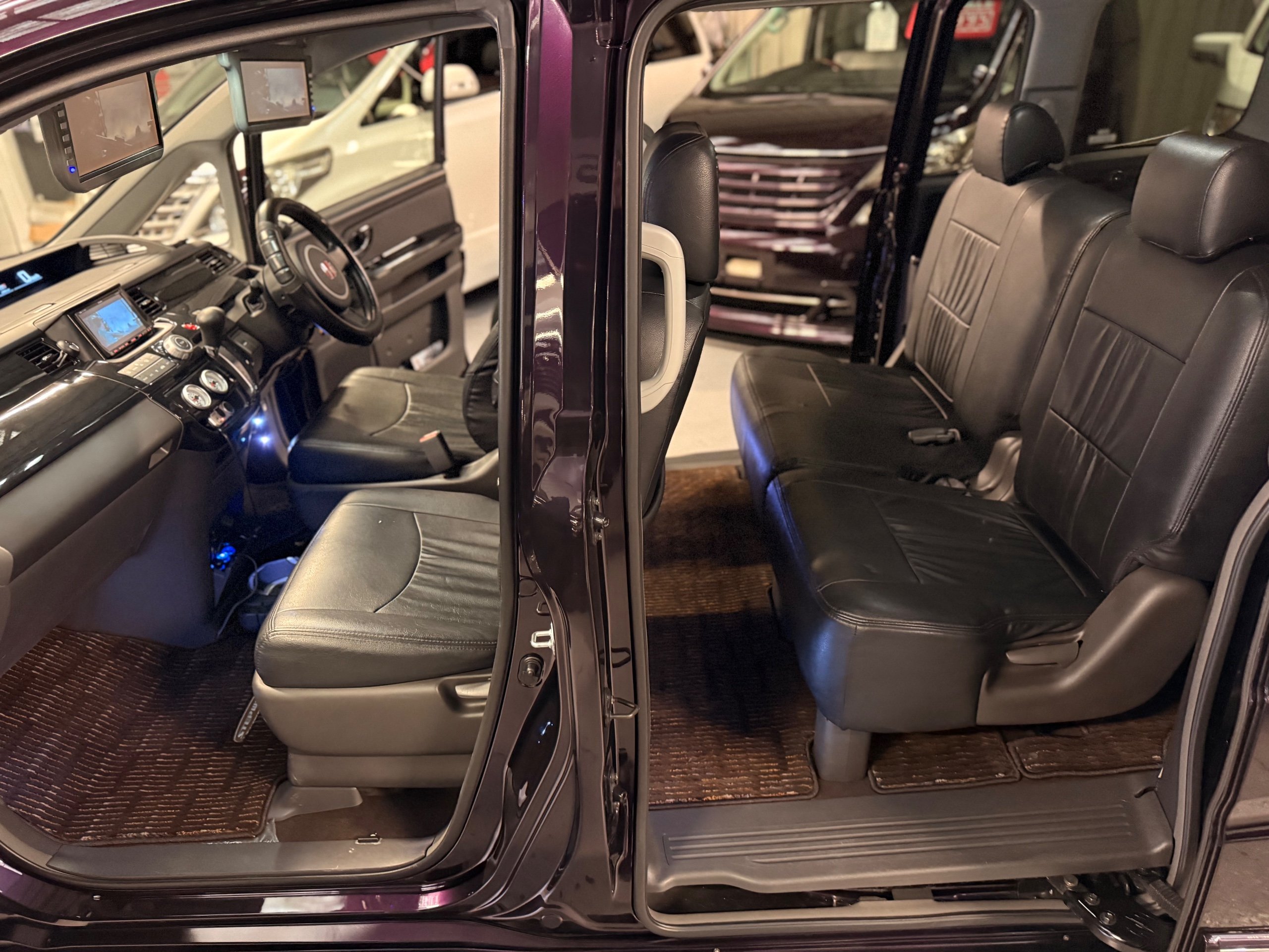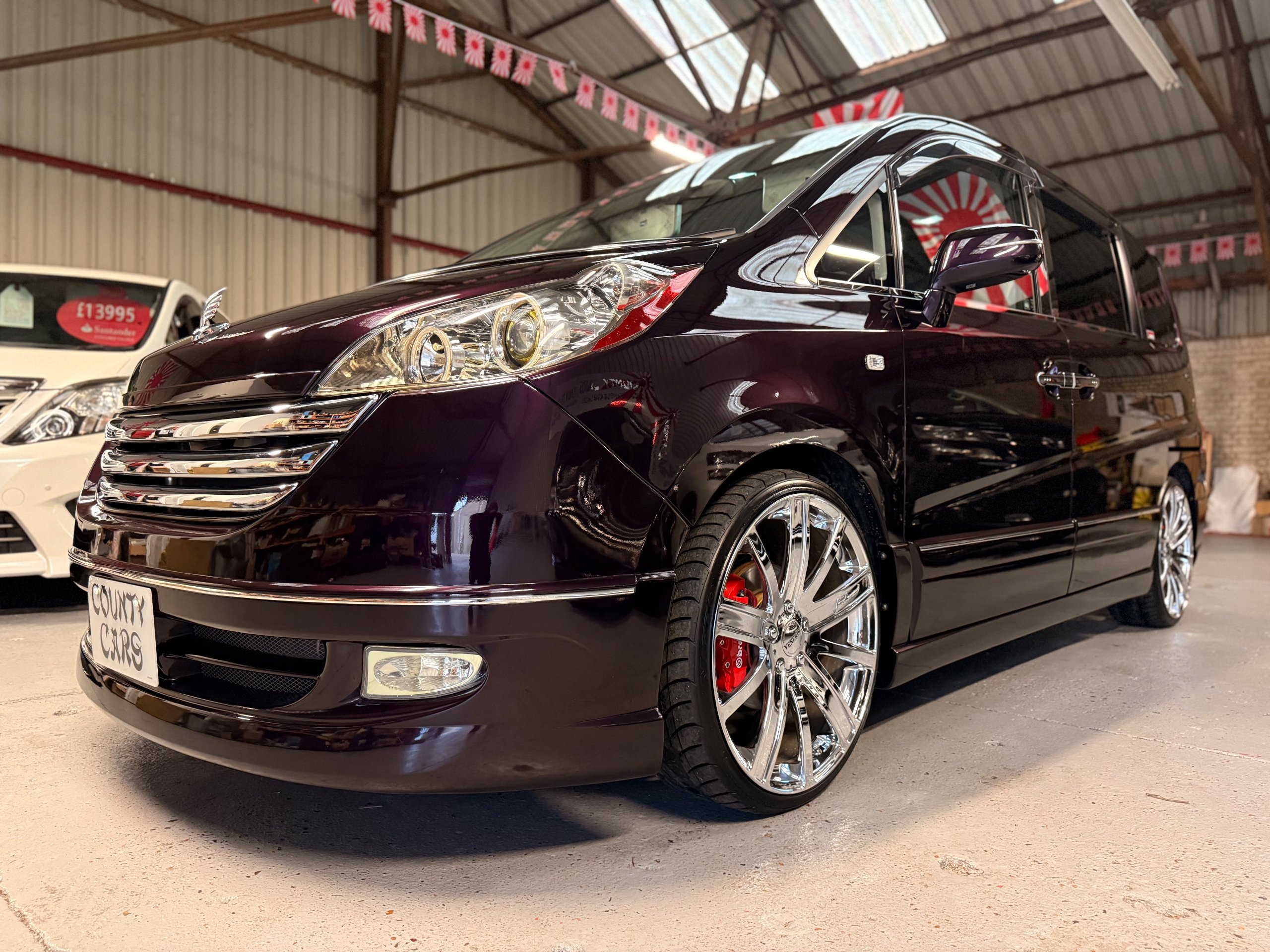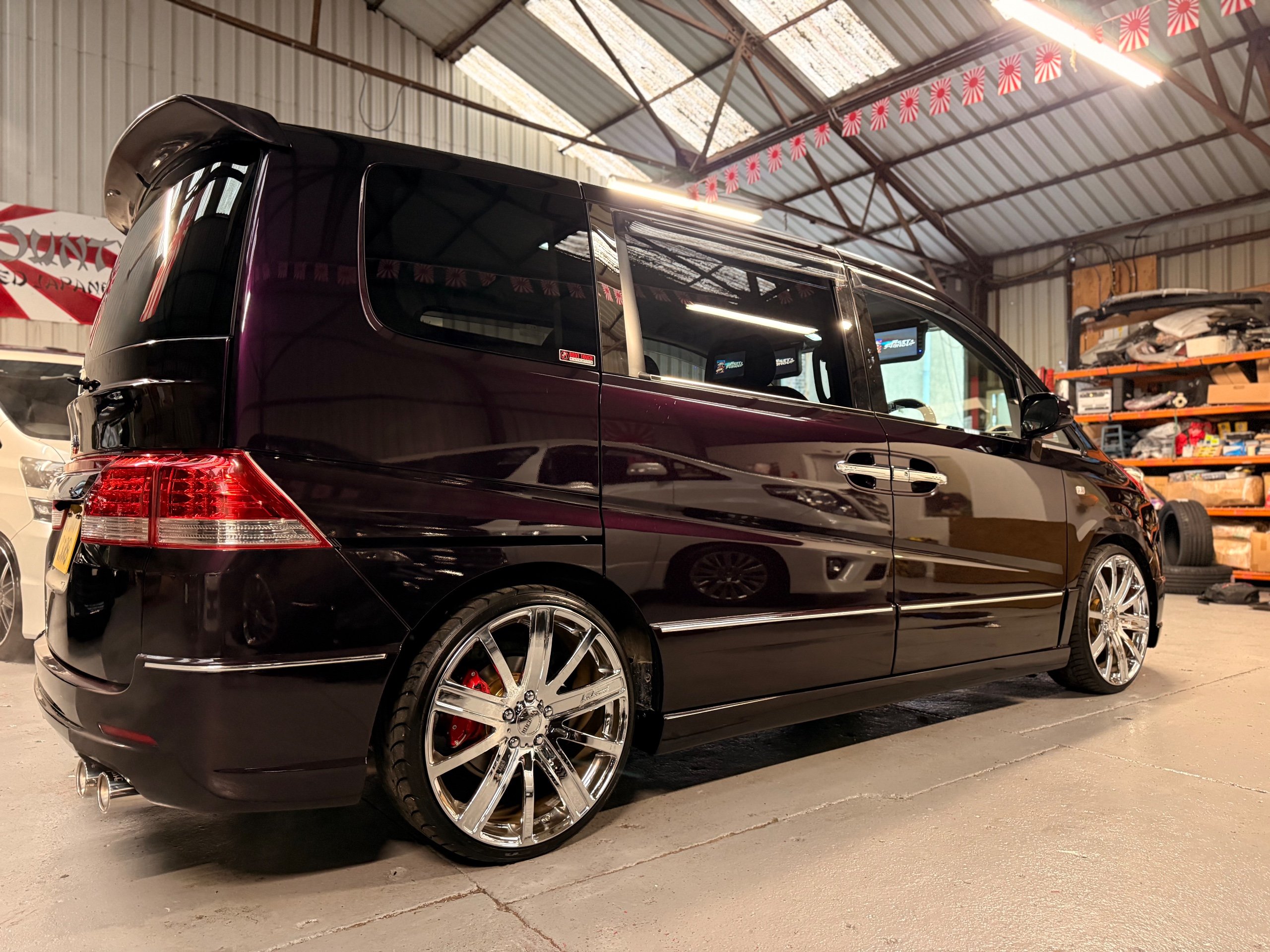 Honda Stepwagon 2.0 IVTEC Automatic G.L.S, Finished in Stunning Unmarked Metallic Purple Paintwork, Full Aero body kit including front and rear spoilers, side door mouldings and boot spoiler, Full l.e.d light conversion including front Angel light headlights, Rear full l.e.d lights, Unmarked 20” Venerdi Chrome Alloys, Full Air Ride Suspension. Brembo brake covers, Bonnet spoiler, Noblesse Quad Exhaust System, Full chrome pack including door rubbers and door mouldings, Only Covered 13,000 Miles From New, 8 Seater, 8 unmarked black leather look seat covers, Full In-car entertainment system including Kenwood speakers and sub, Front sun blinds have been changed to twin monitors, headrest monitors, UK Stereo system, Full dark wood pack including dash and door covers, This Stepwgn has been a show car in Japan, only covering 13,000 Miles, All the standard new parts come with the car including