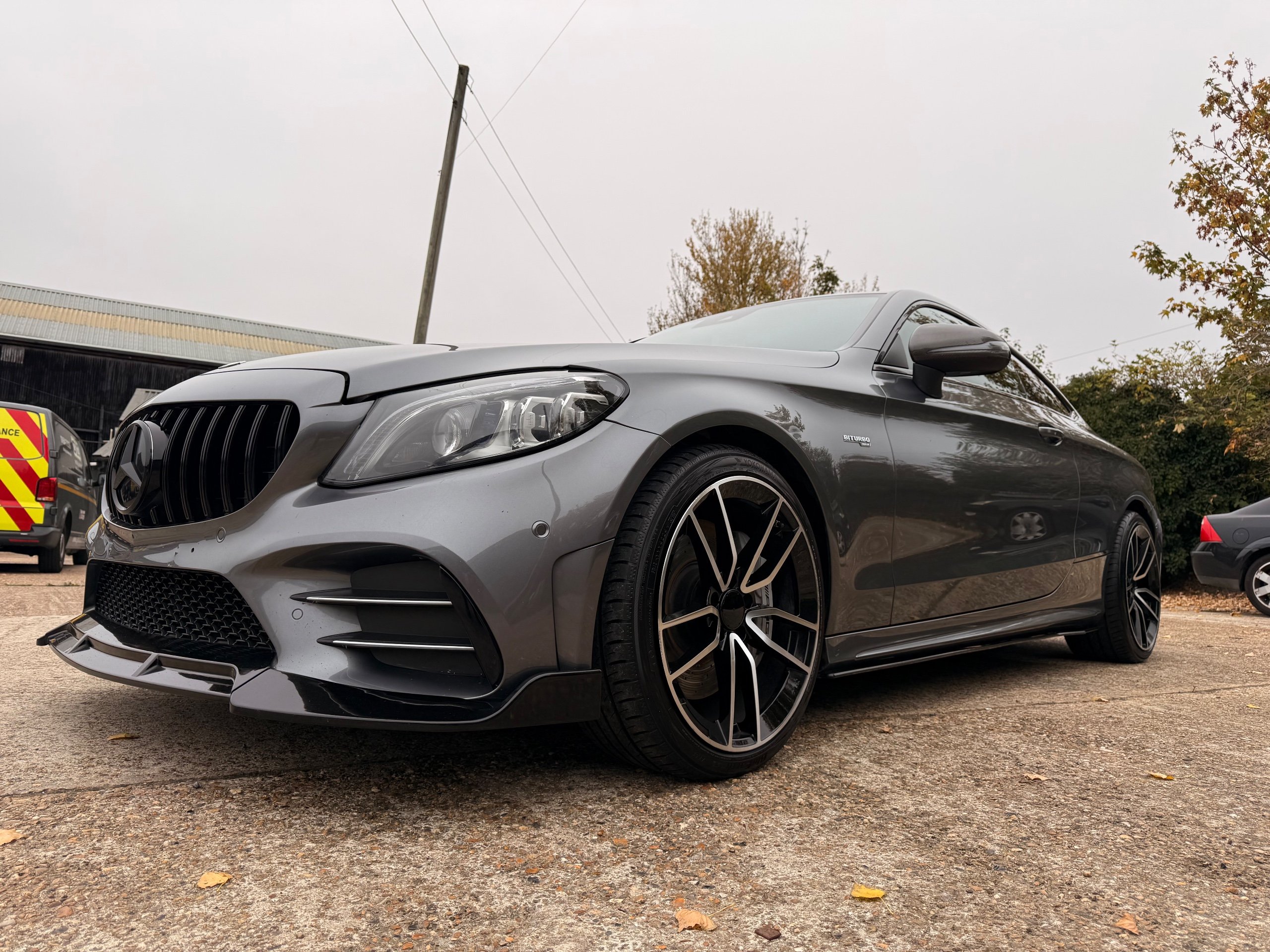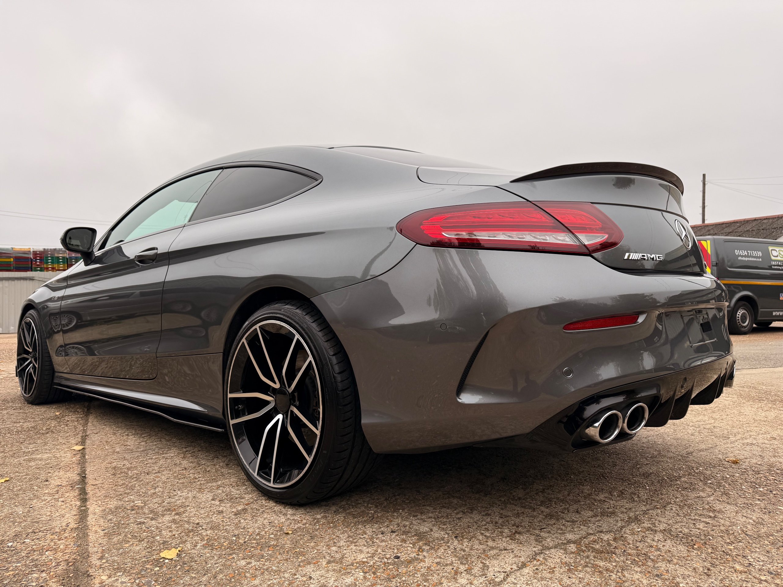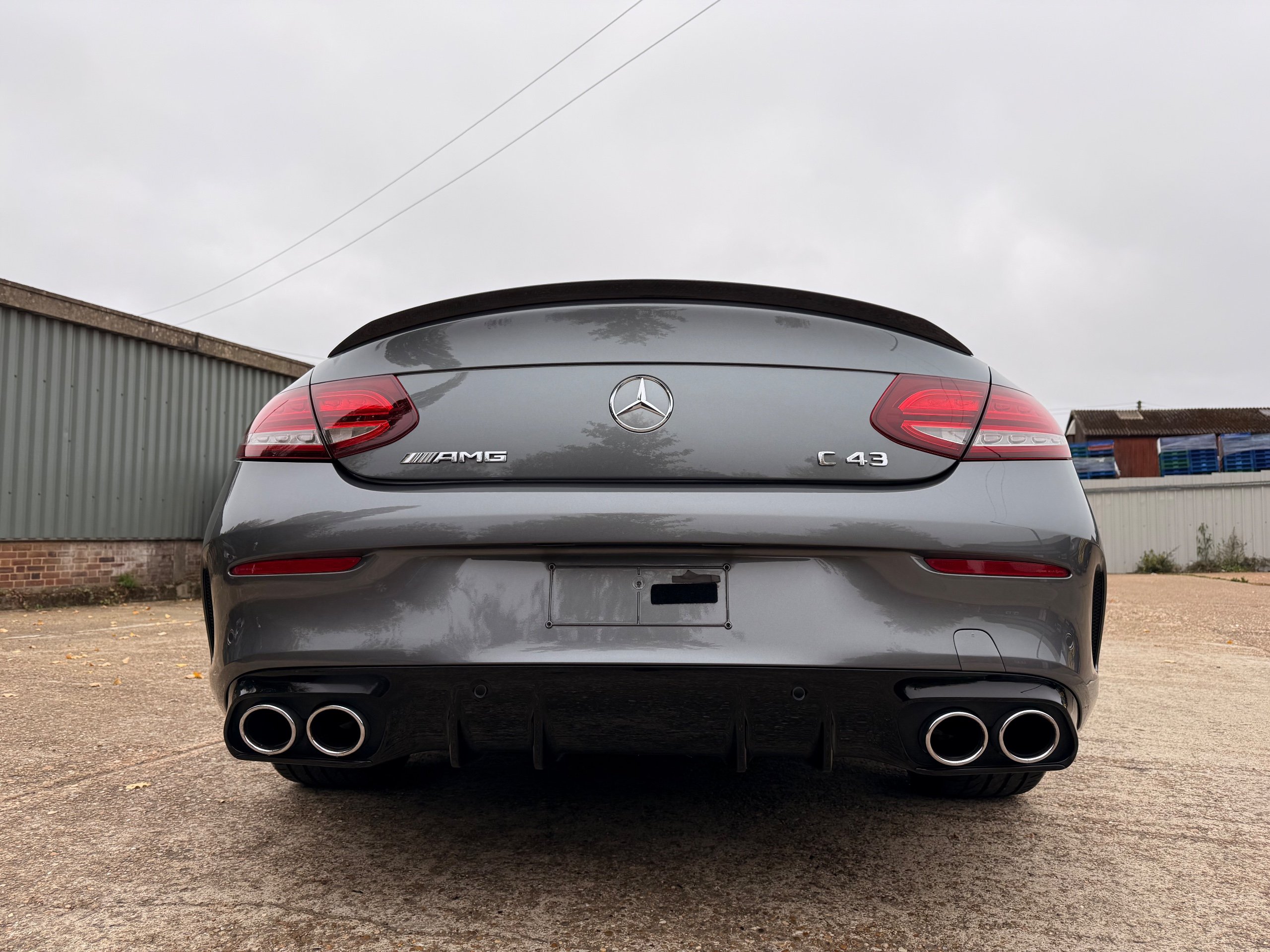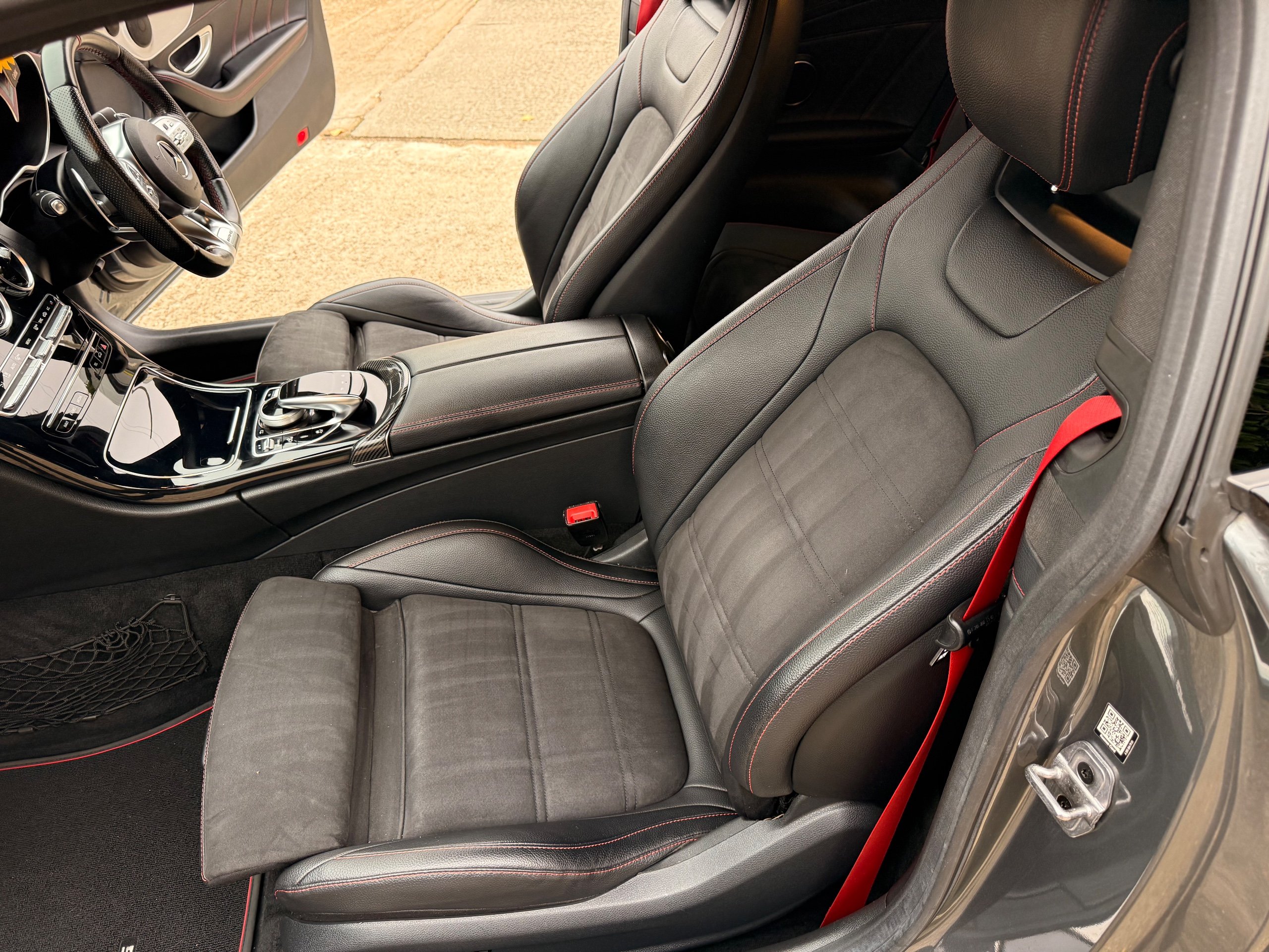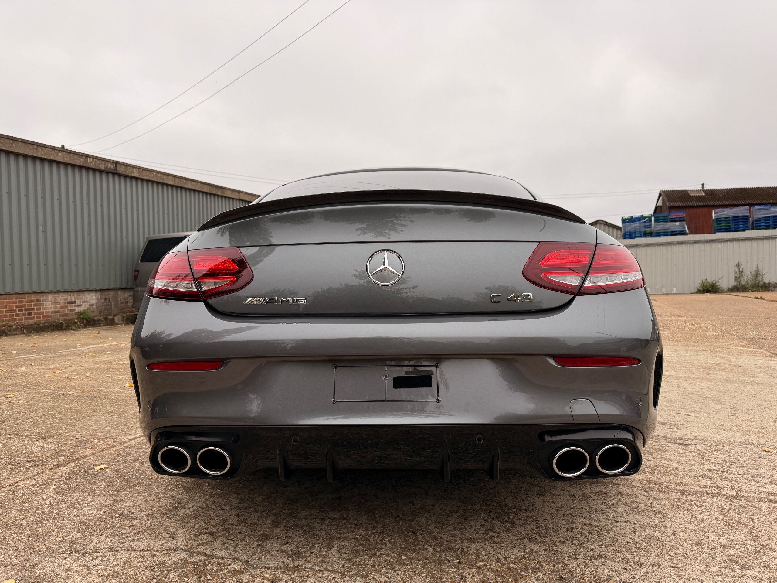 2018-18-Reg Mercedes-Benz C43 AMG 3.0 V6 Bi-Turbo 4Matic Premium Coupe, U.K Vehicle. 75,000 Miles, Metallic Grey Paintwork, Black Leather with red Stitching leather heated seats, 19” Diamond Cut with black gloss centres Alloy wheels, Black Gloss front grille with black Mercedes emblem, Front and Side Aero spoilers, Colour reversing camera, Heated Seats, Electric Memory Seats, Configurable Ambient Lighting, Privacy Glass, Switchable Exhaust, AMG Ride Control, Power Operated Bootlid, Cruise Control, Front and Rear parking Sensors, DAB Radio, Bluetooth, Handsfree, Power Folding Carbon Wing mirrors,