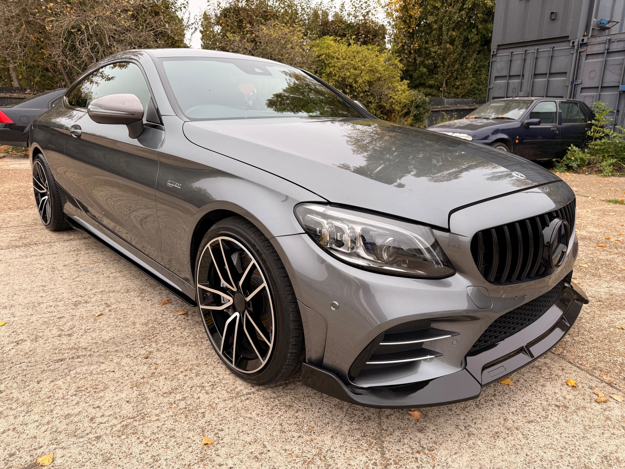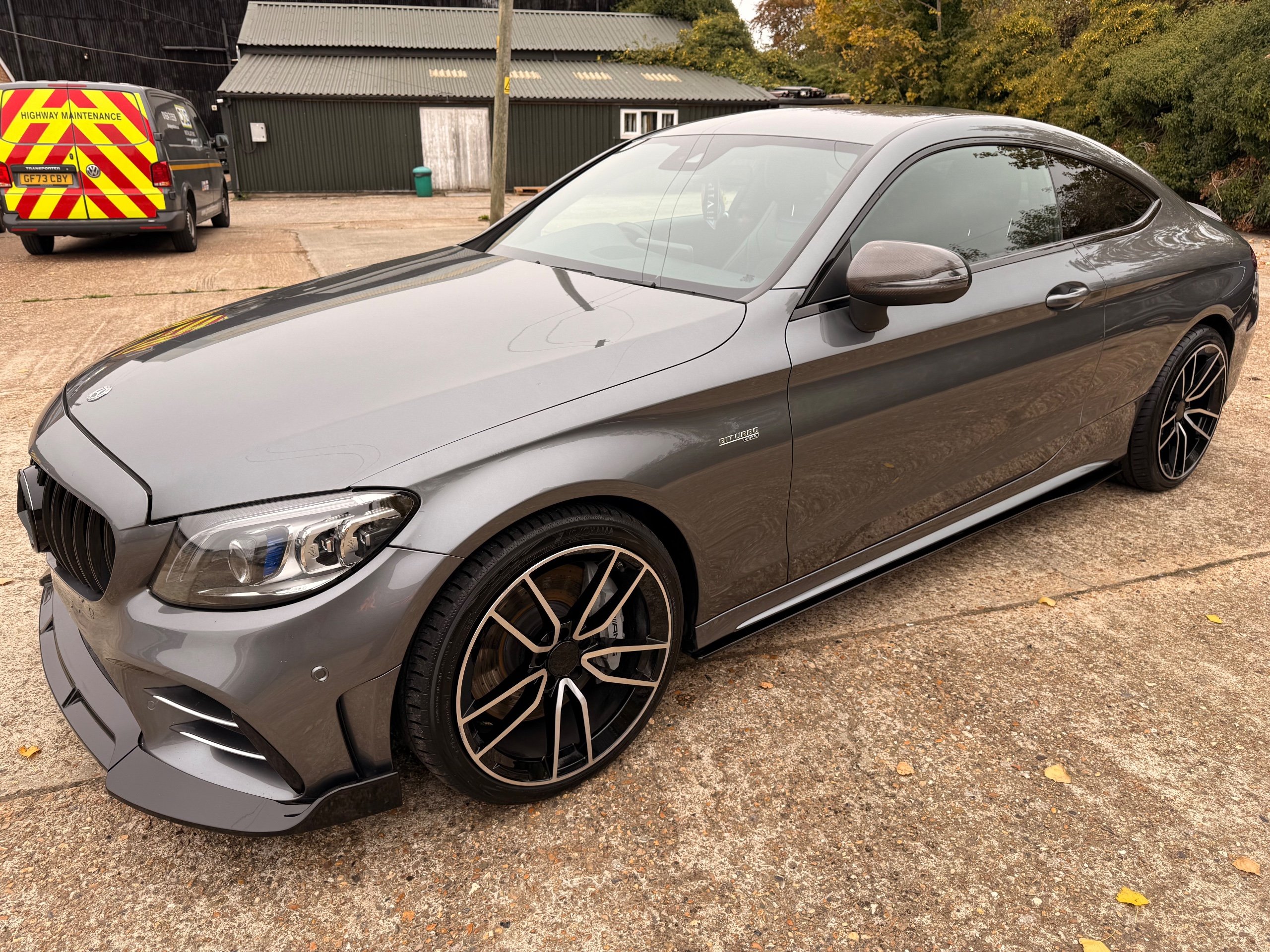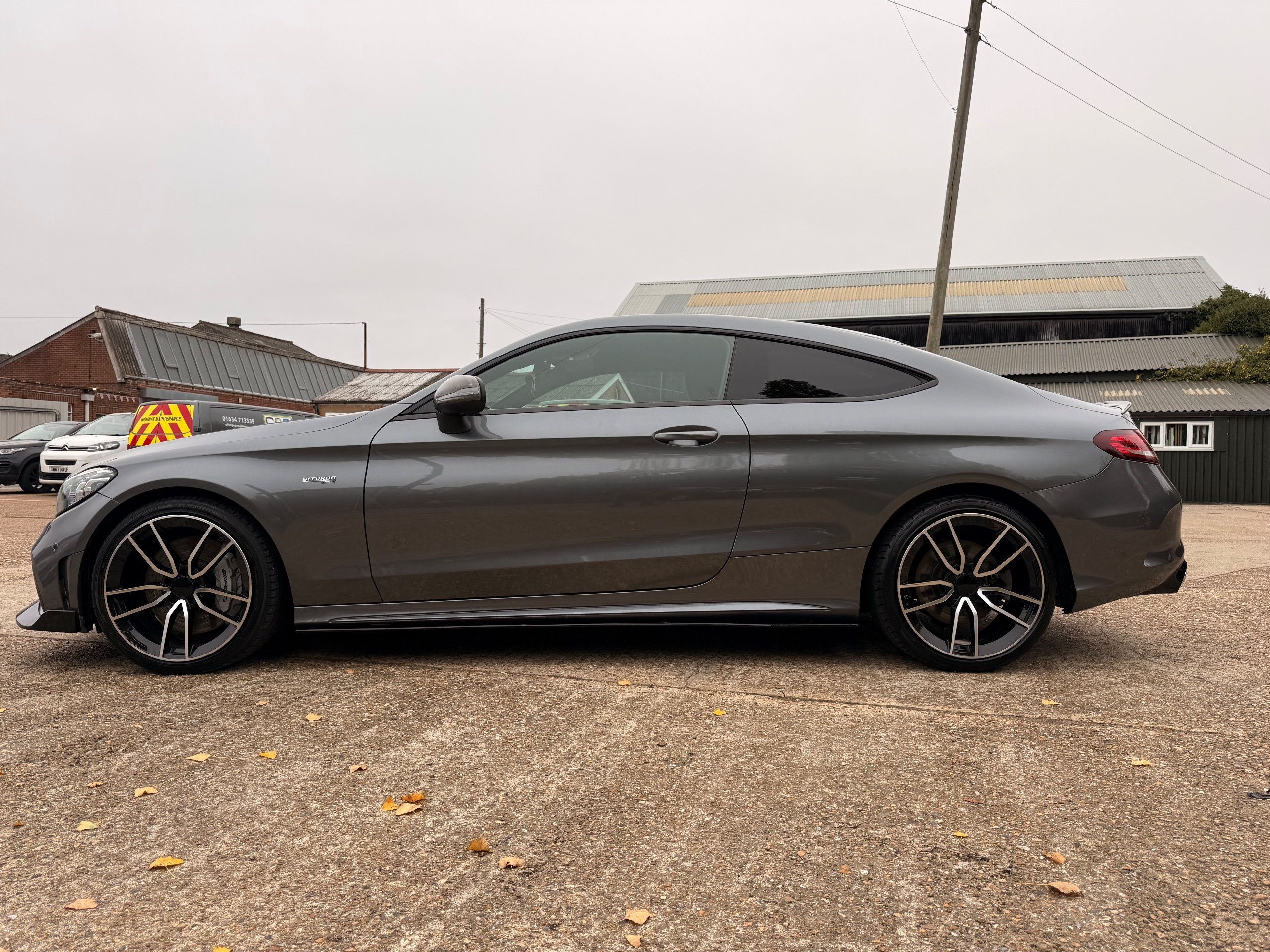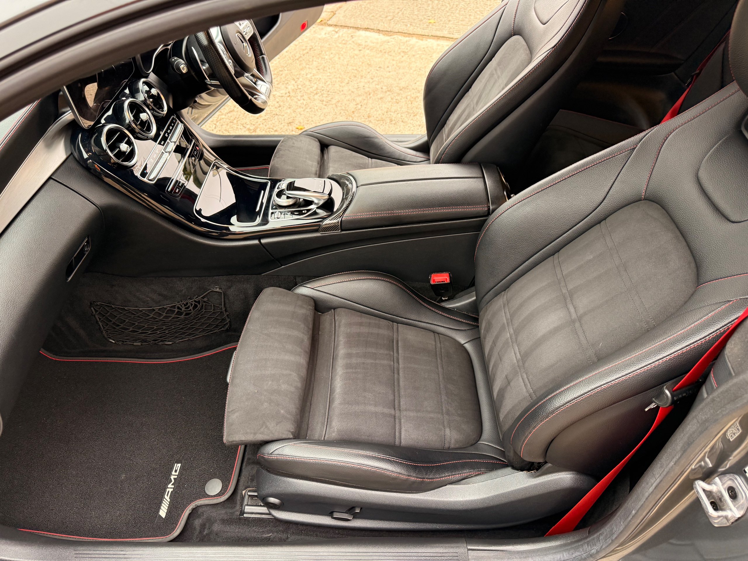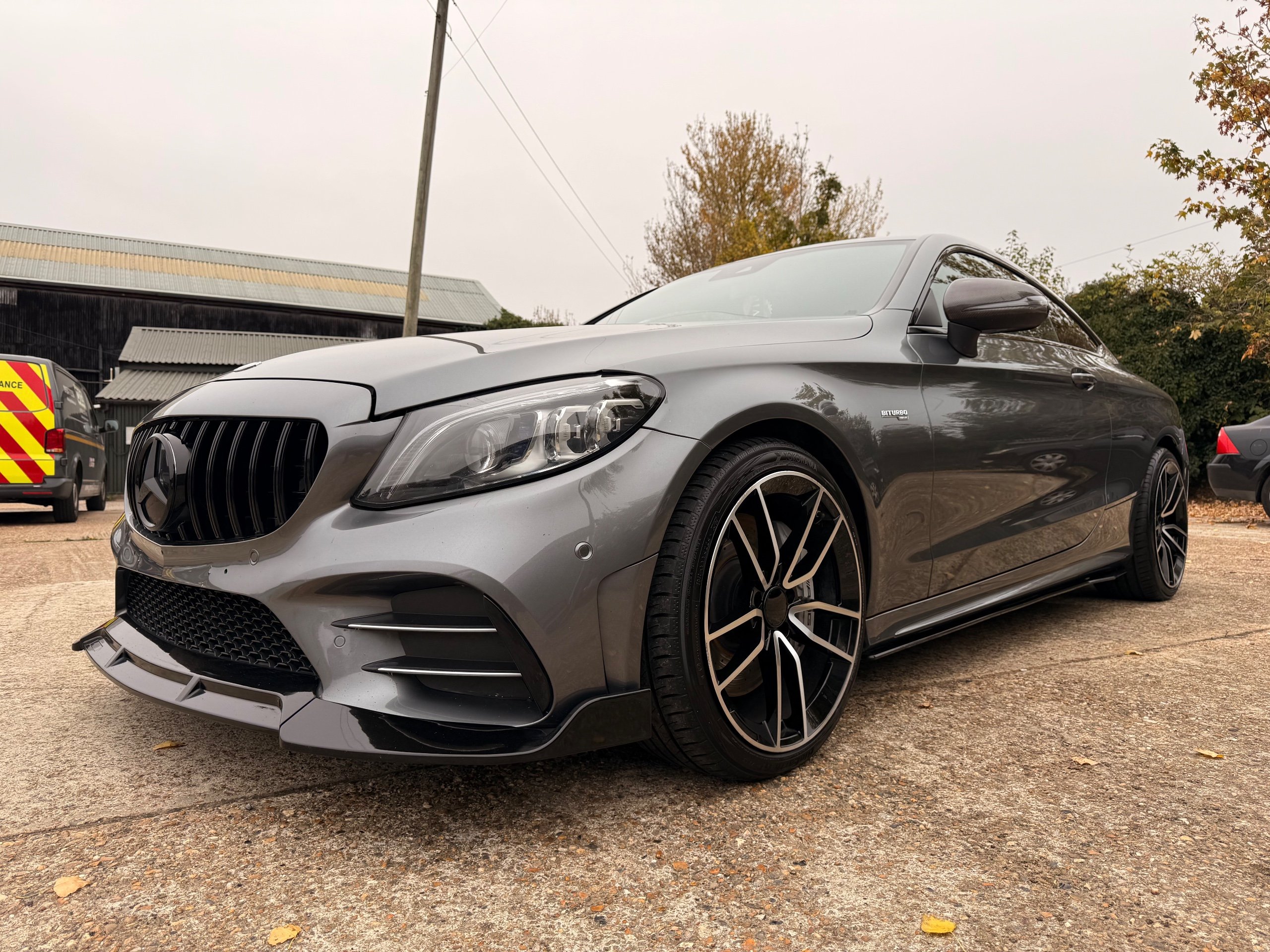 2018-18-Reg Mercedes-Benz C43 AMG 3.0 V6 Bi-Turbo 4Matic Premium Coupe, U.K Vehicle. 75,000 Miles, Metallic Grey Paintwork, Black Leather with red Stitching leather heated seats, 19” Diamond Cut with black gloss centres Alloy wheels, Black Gloss front grille with black Mercedes emblem, Front and Side Aero spoilers, Colour reversing camera, Heated Seats, Electric Memory Seats, Configurable Ambient Lighting, Privacy Glass, Switchable Exhaust, AMG Ride Control, Power Operated Bootlid, Cruise Control, Front and Rear parking Sensors, DAB Radio, Bluetooth, Handsfree, Power Folding Carbon Wing mirrors,