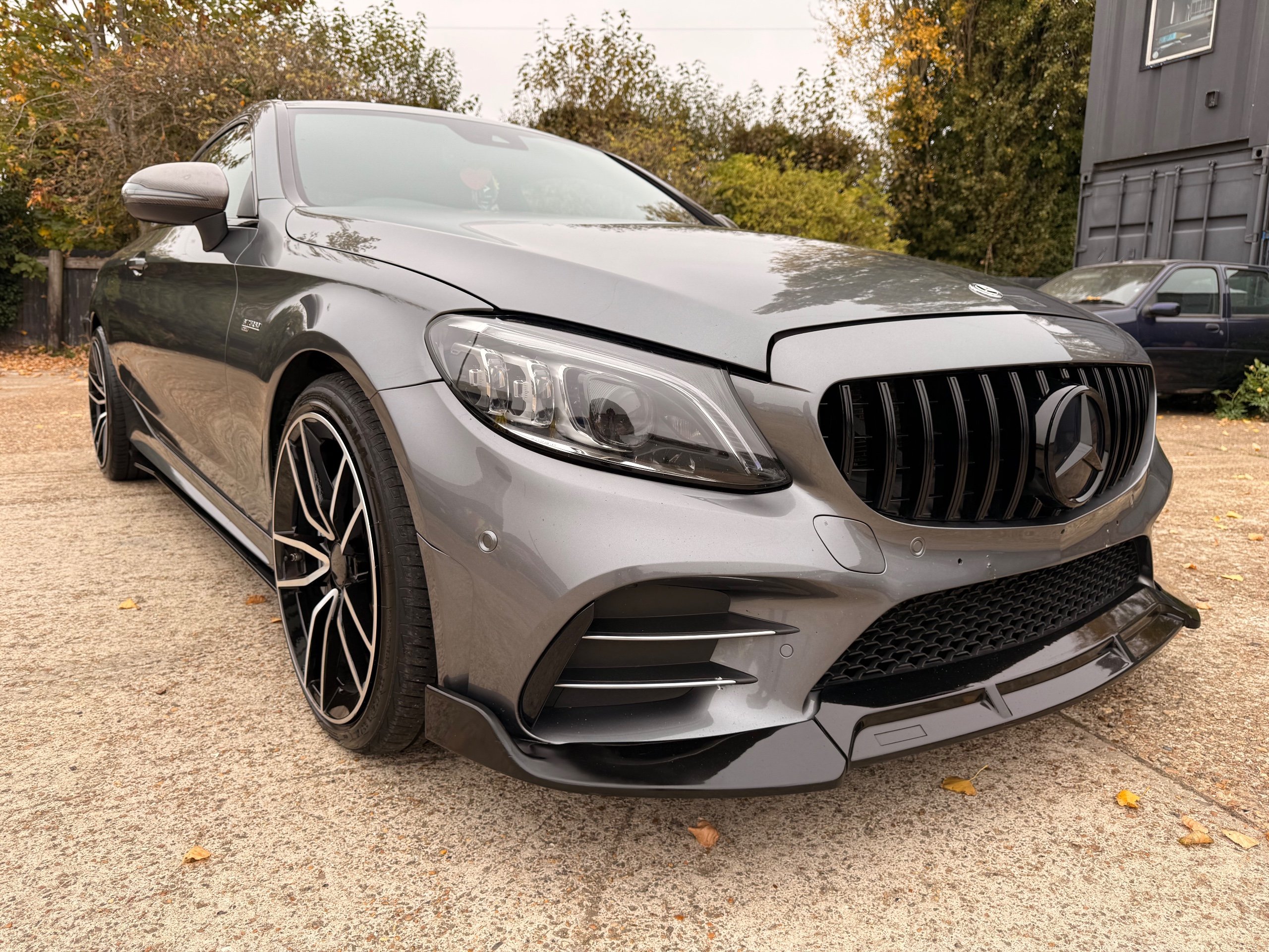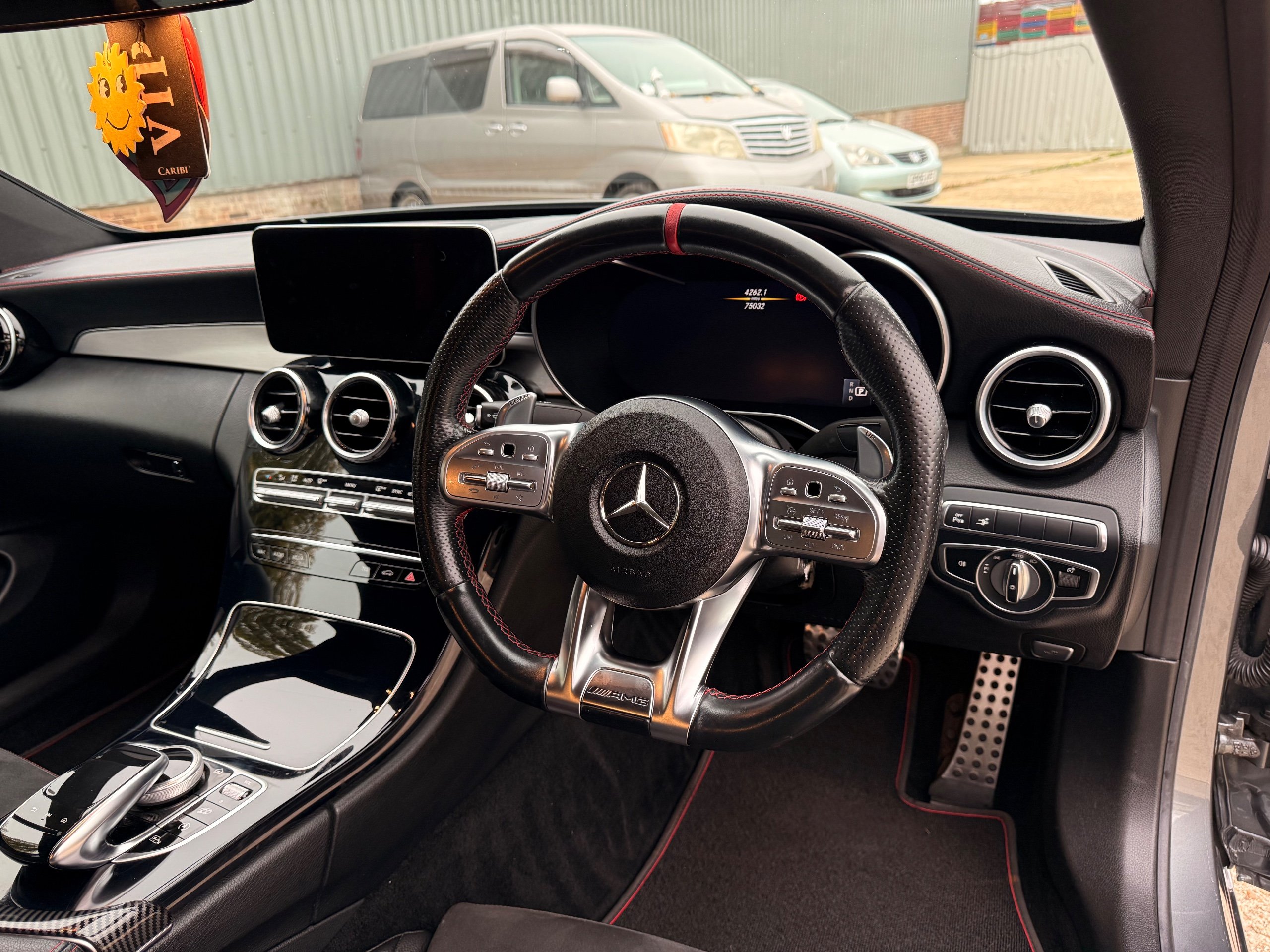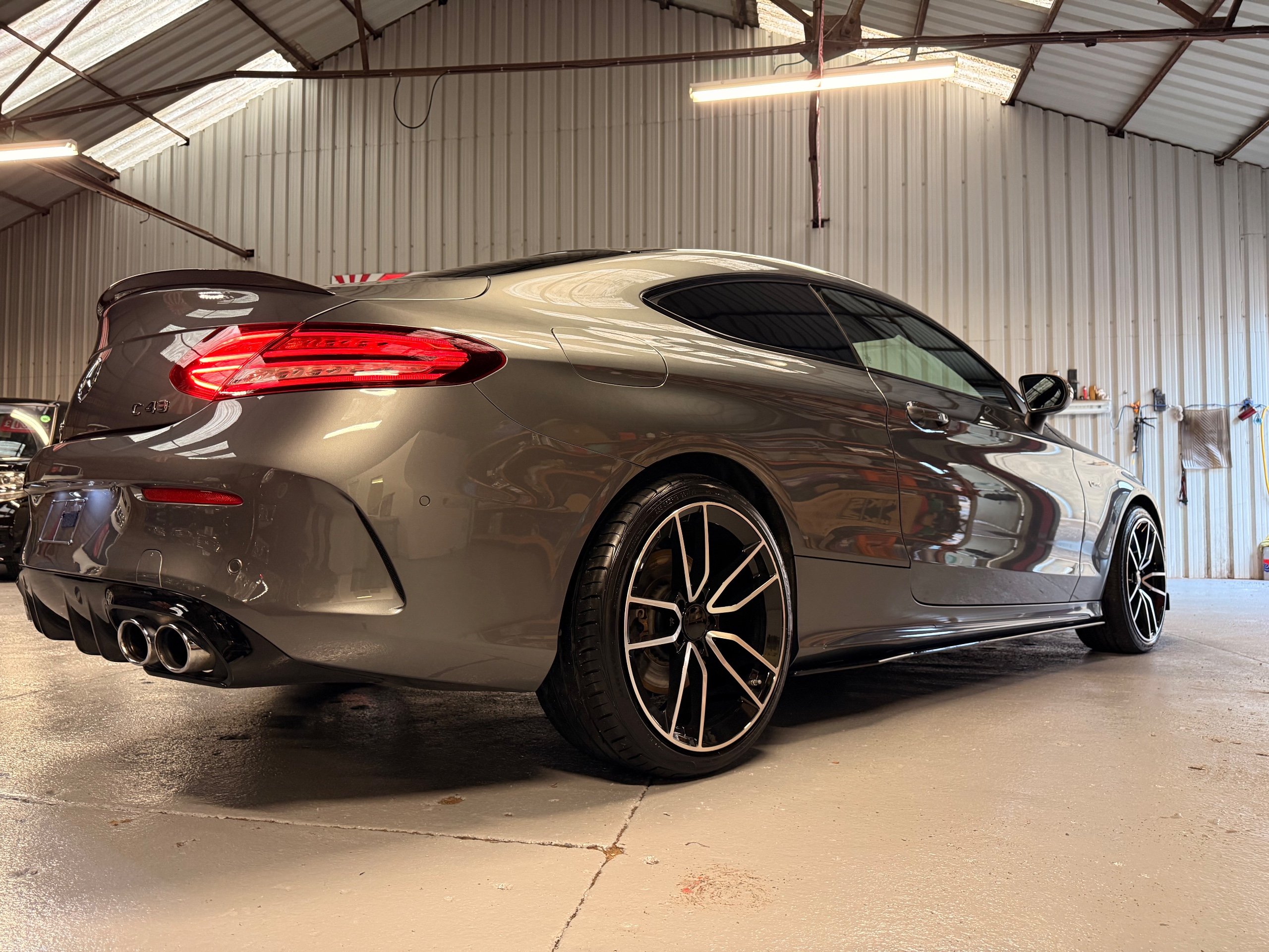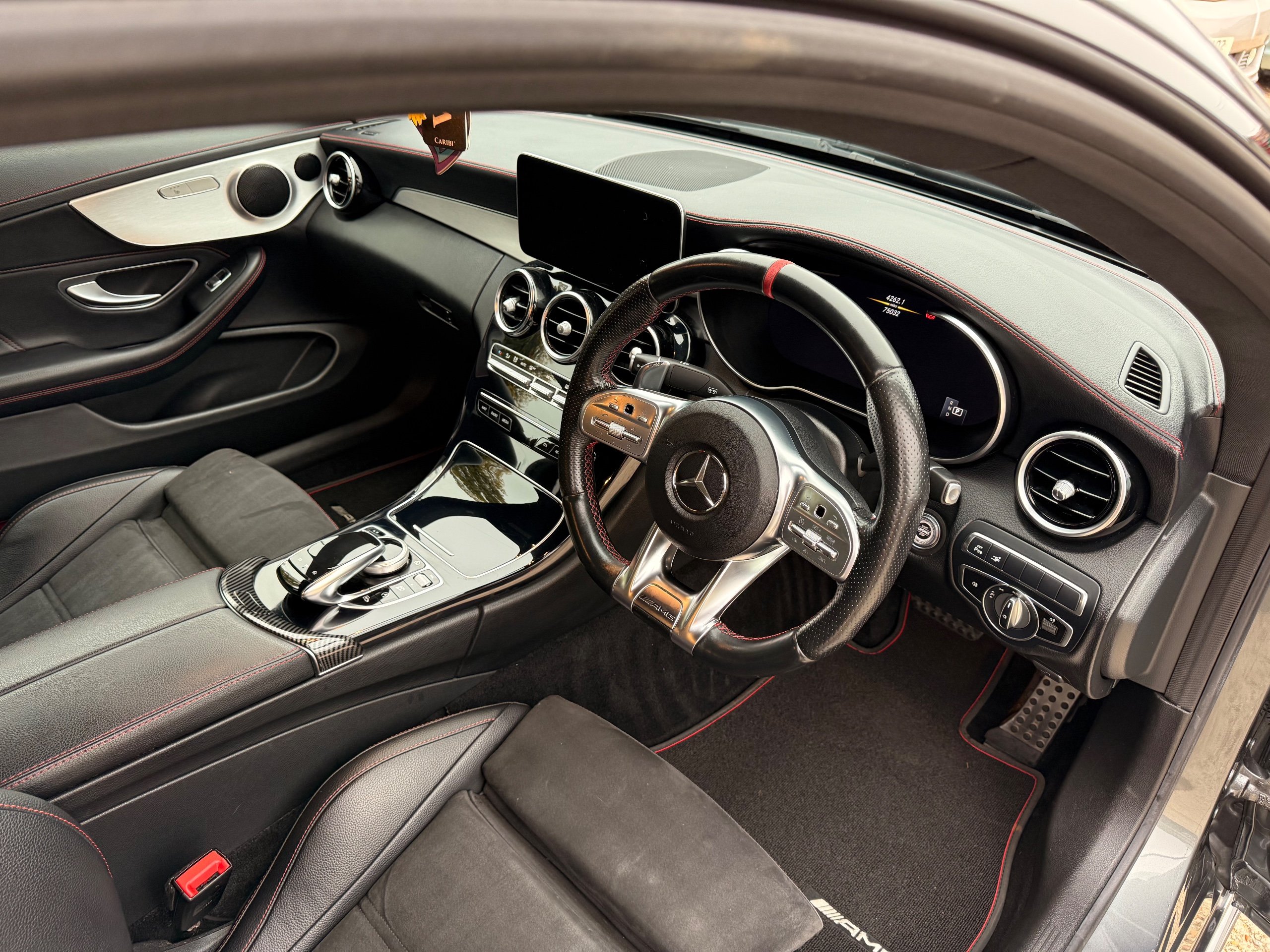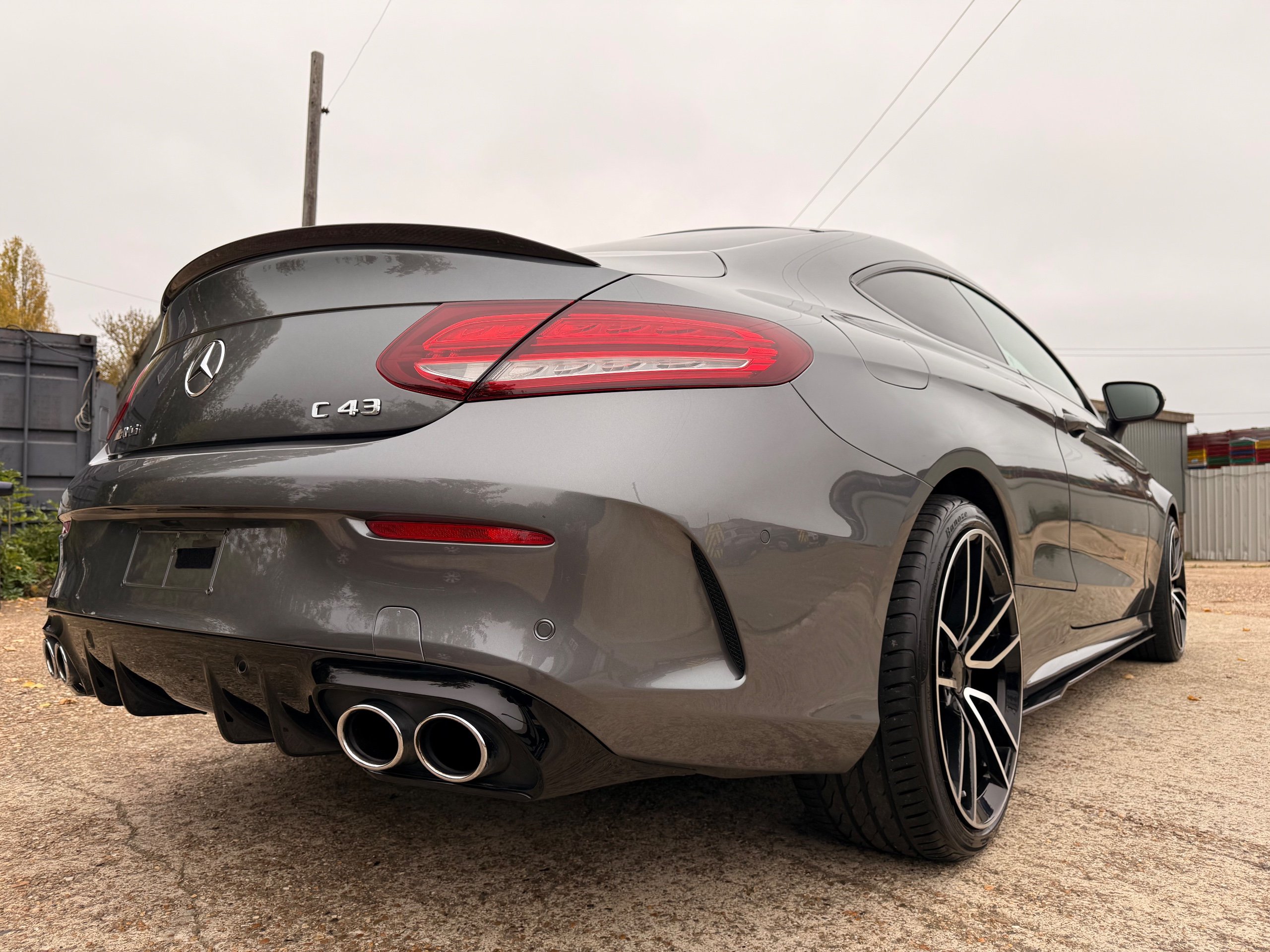 2018-18-Reg Mercedes-Benz C43 AMG 3.0 V6 Bi-Turbo 4Matic Premium Coupe, U.K Vehicle. 75,000 Miles, Metallic Grey Paintwork, Black Leather with red Stitching leather heated seats, 19” Diamond Cut with black gloss centres Alloy wheels, Black Gloss front grille with black Mercedes emblem, Front and Side Aero spoilers, Colour reversing camera, Heated Seats, Electric Memory Seats, Configurable Ambient Lighting, Privacy Glass, Switchable Exhaust, AMG Ride Control, Power Operated Bootlid, Cruise Control, Front and Rear parking Sensors, DAB Radio, Bluetooth, Handsfree, Power Folding Carbon Wing mirrors,