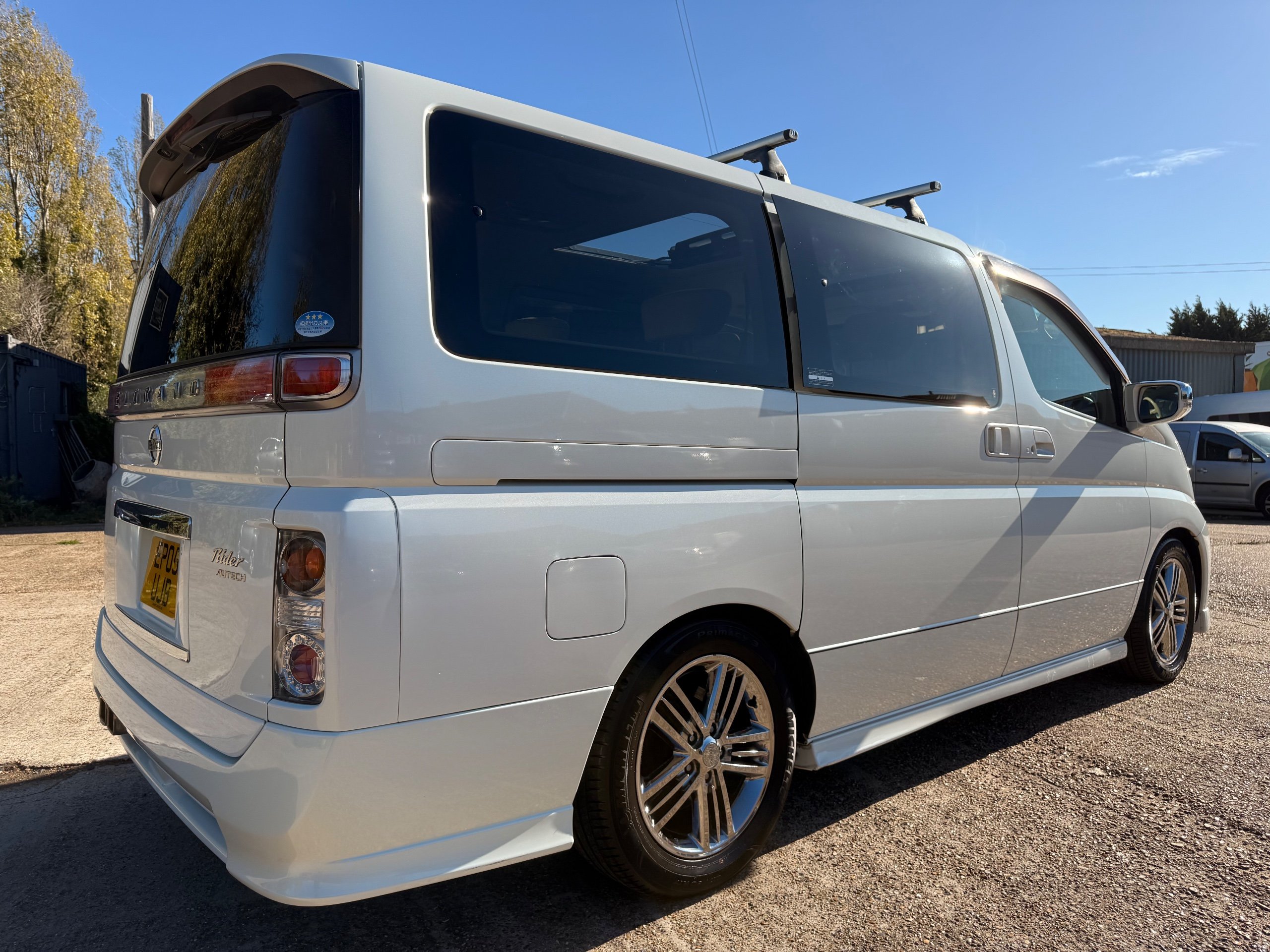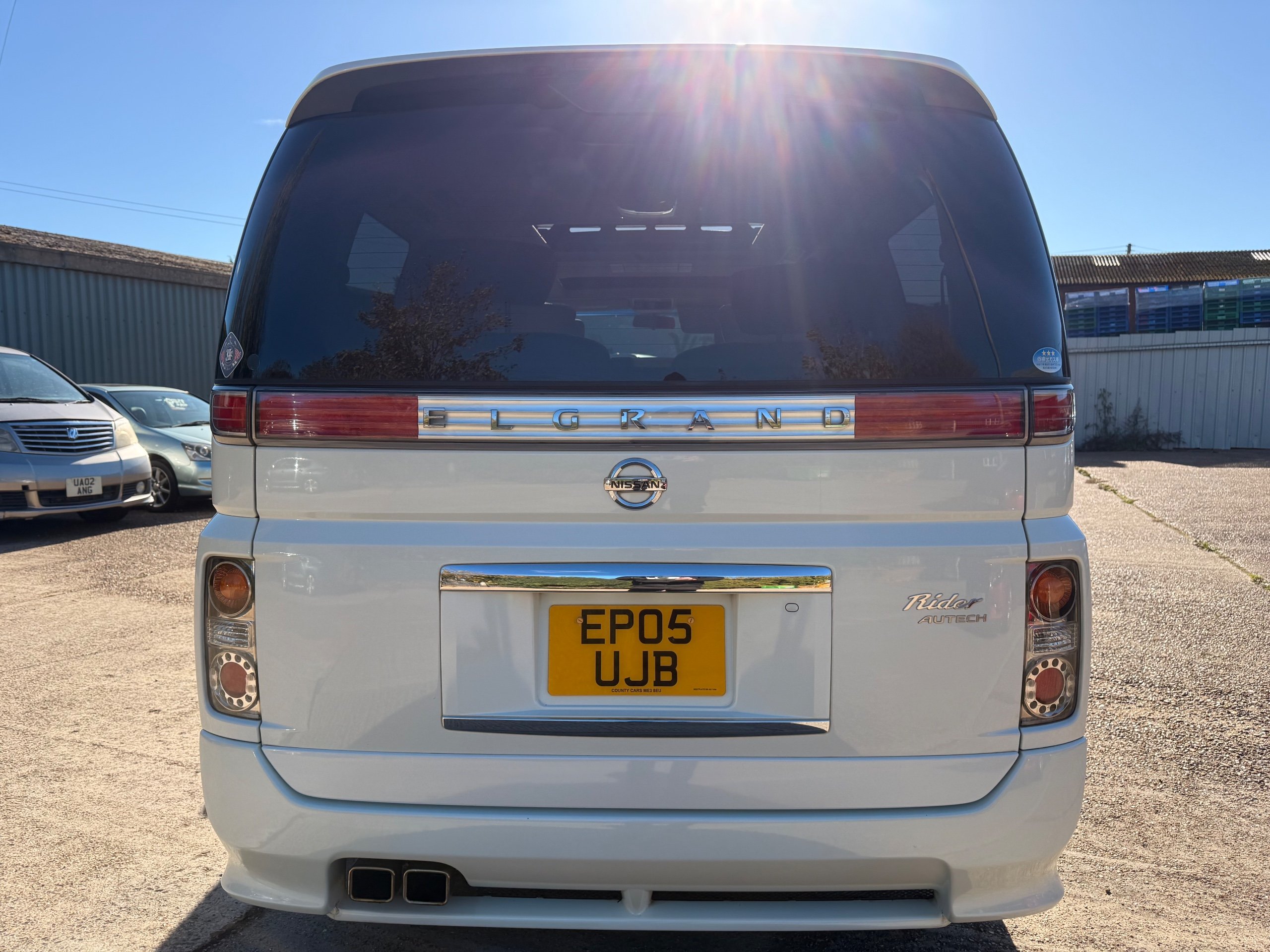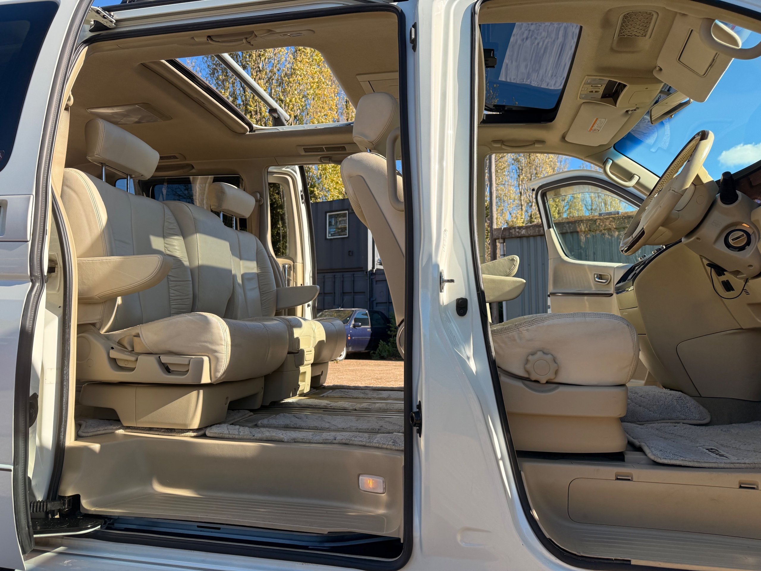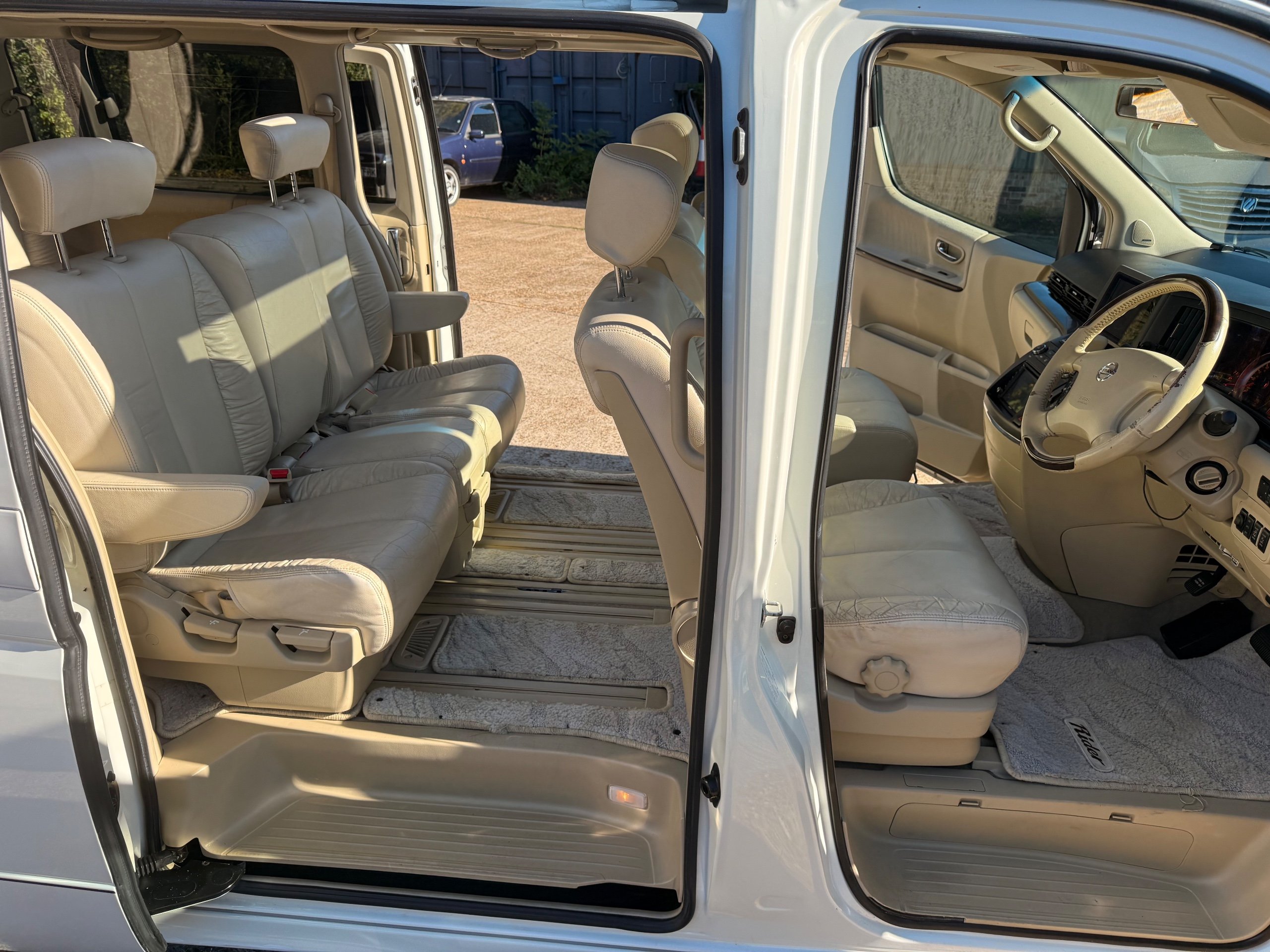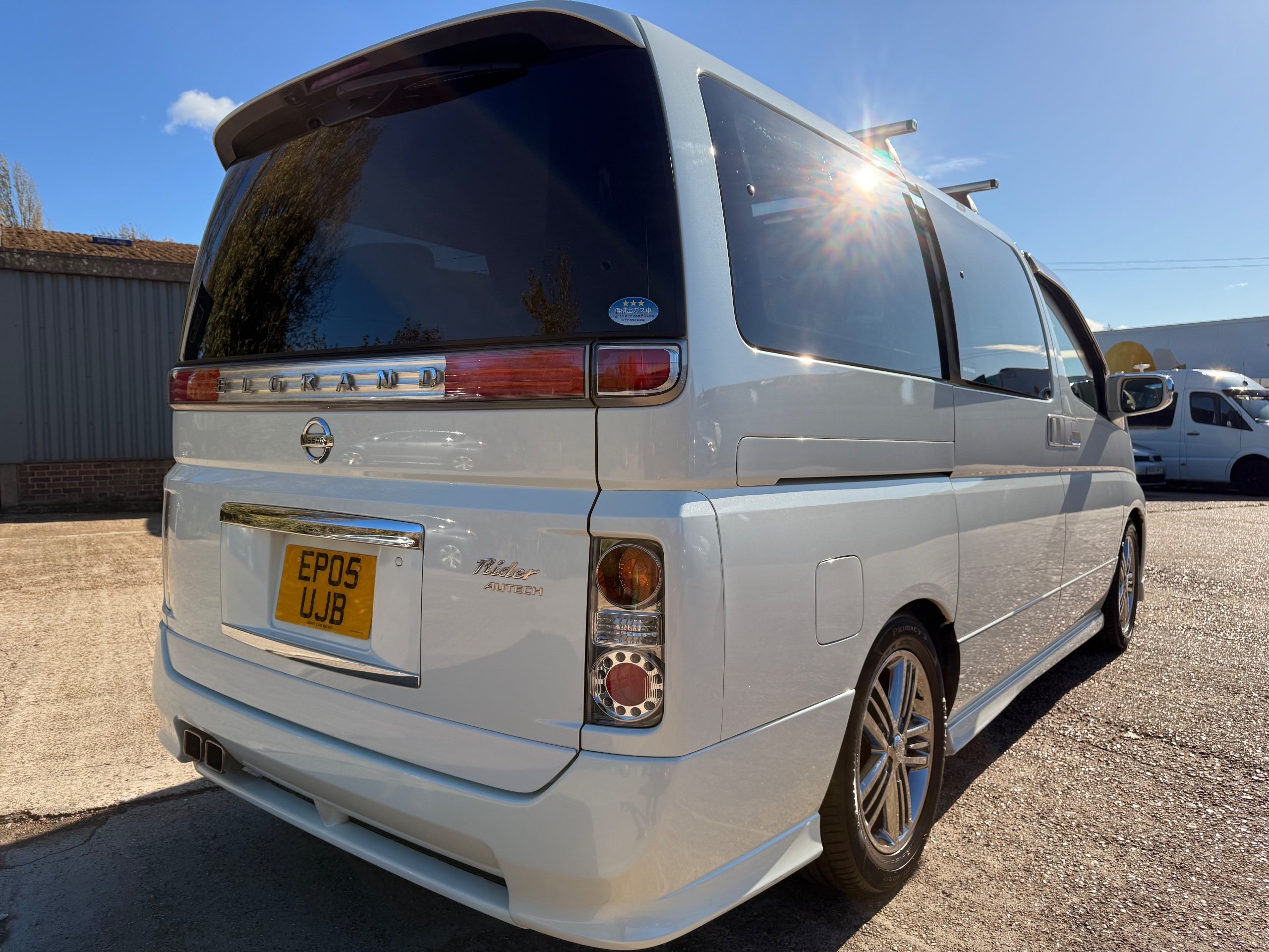 Nissan Elgrand Autech Rider 3.5 V6 Auto 2005-05-Reg, Pearlescent White Paintwork, 17” Chrome Rider Alloys, Autech pack, Full privacy glass, Twin Sunroofs. The rear sunroof is a electric moon roof, rear spoiler with built in brake light and colour reversing camera, front spots, Fold away wing mirrors with l.e.d indicators and chrome covers, Clear Rider back lights, Roof bars, 8 Seater, 8 Beige Leather seats, The front seats have armrests, The centre seats are fully rotational, The centre seat converts into a sliding table, The rear seats fold to the side to give way to a huge boot, Air-Con Climate Control, Rear Air con and climate, BOSE Sound System with UK stereo Rear Monitor to watch dvds, Imported by ourselves in 2020,