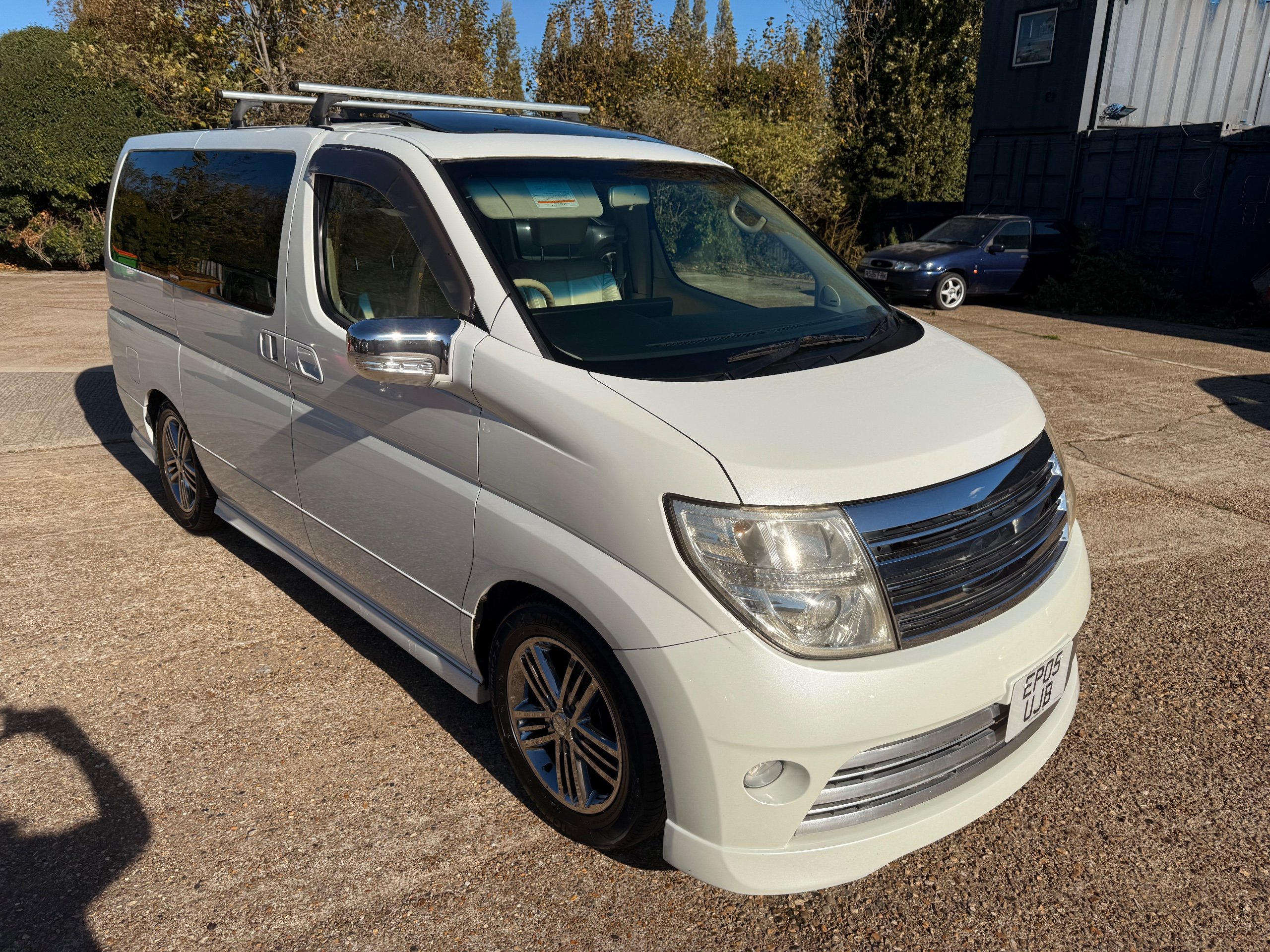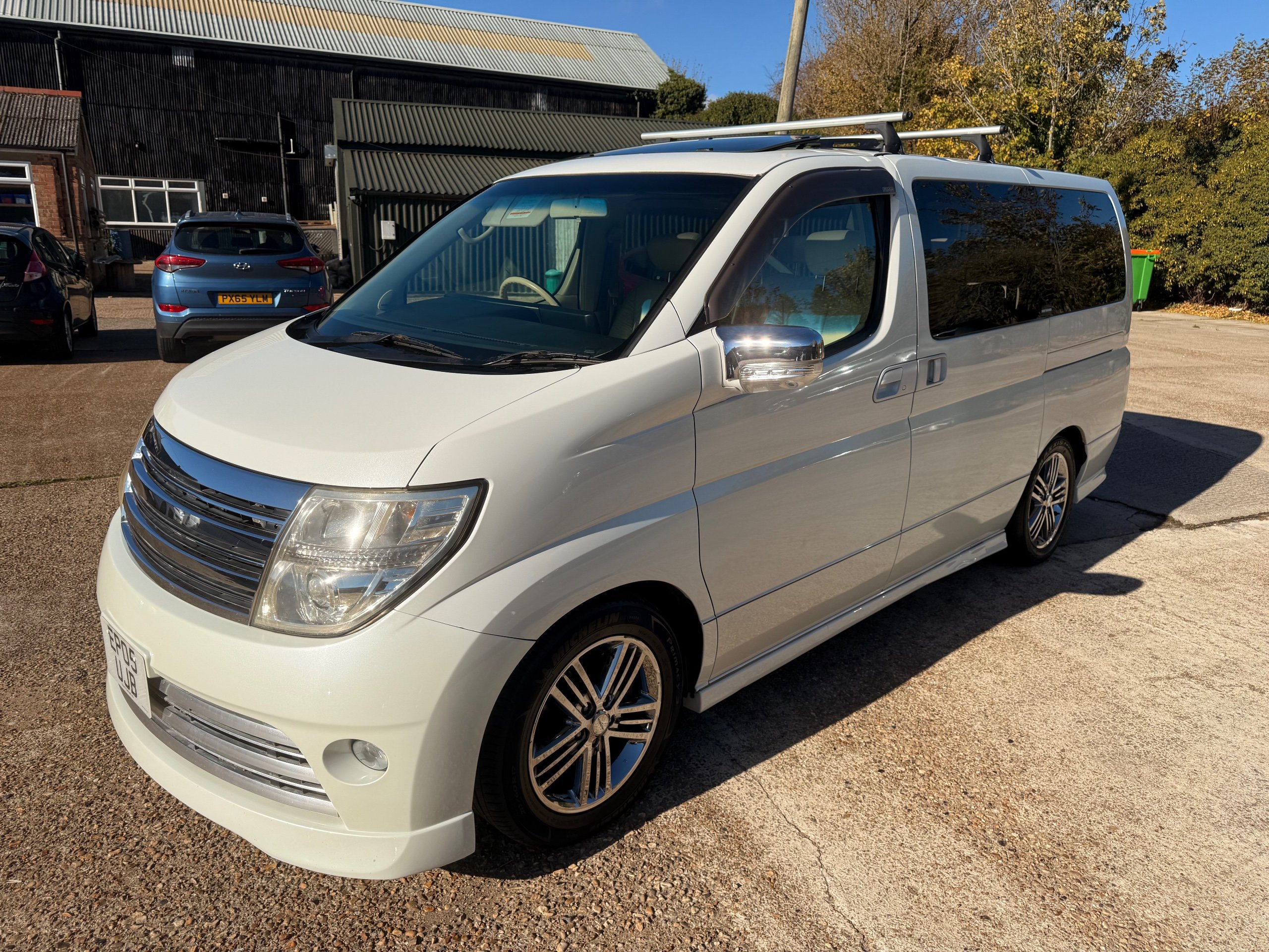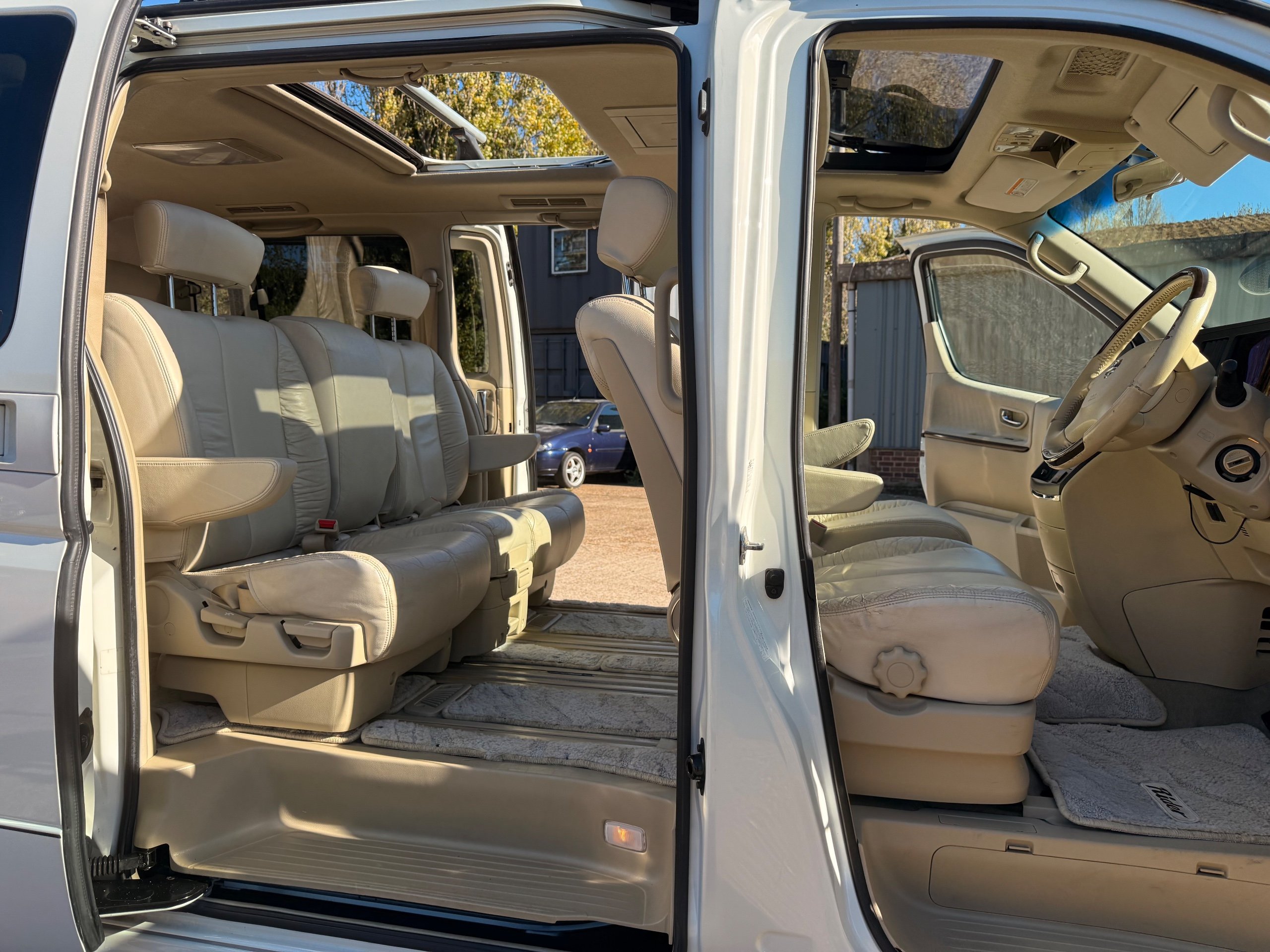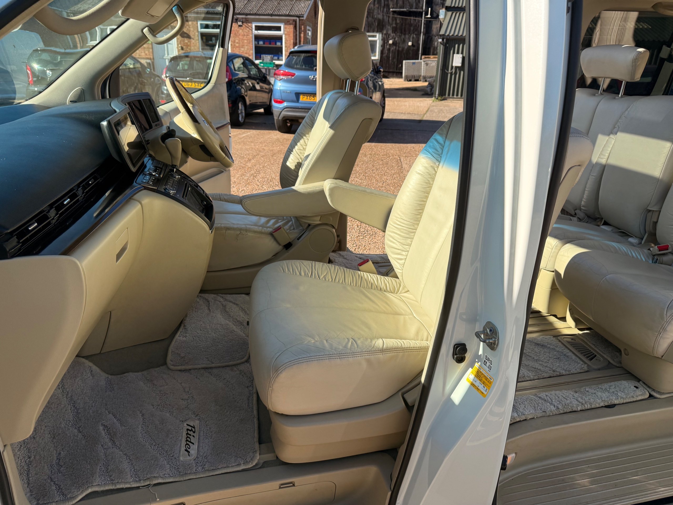 Nissan Elgrand Autech Rider 3.5 V6 Auto 2005-05-Reg, Pearlescent White Paintwork, 17” Chrome Rider Alloys, Autech pack, Full privacy glass, Twin Sunroofs. The rear sunroof is a electric moon roof, rear spoiler with built in brake light and colour reversing camera, front spots, Fold away wing mirrors with l.e.d indicators and chrome covers, Clear Rider back lights, Roof bars, 8 Seater, 8 Beige Leather seats, The front seats have armrests, The centre seats are fully rotational, The centre seat converts into a sliding table, The rear seats fold to the side to give way to a huge boot, Air-Con Climate Control, Rear Air con and climate, BOSE Sound System with UK stereo Rear Monitor to watch dvds, Imported by ourselves in 2020,
