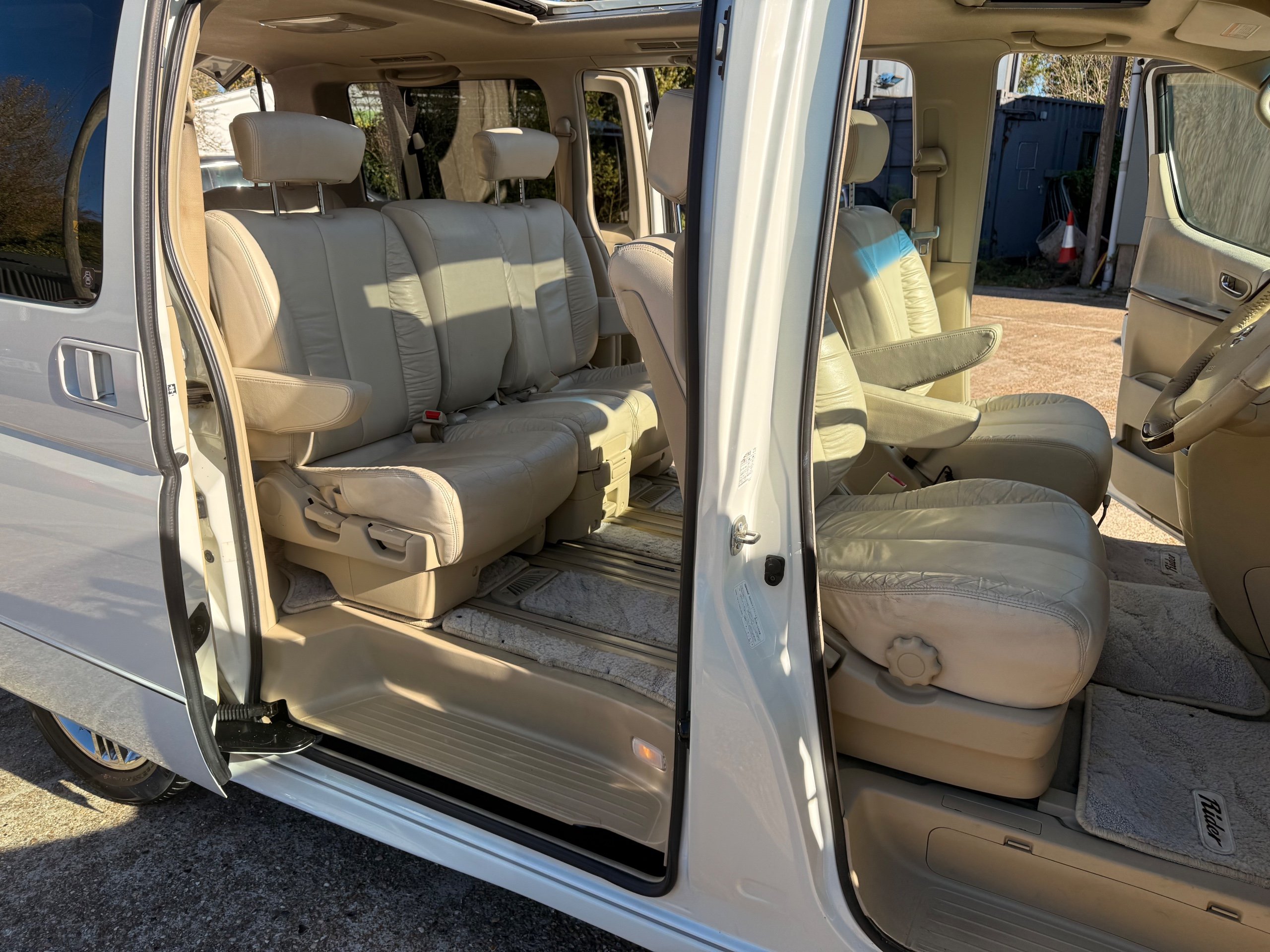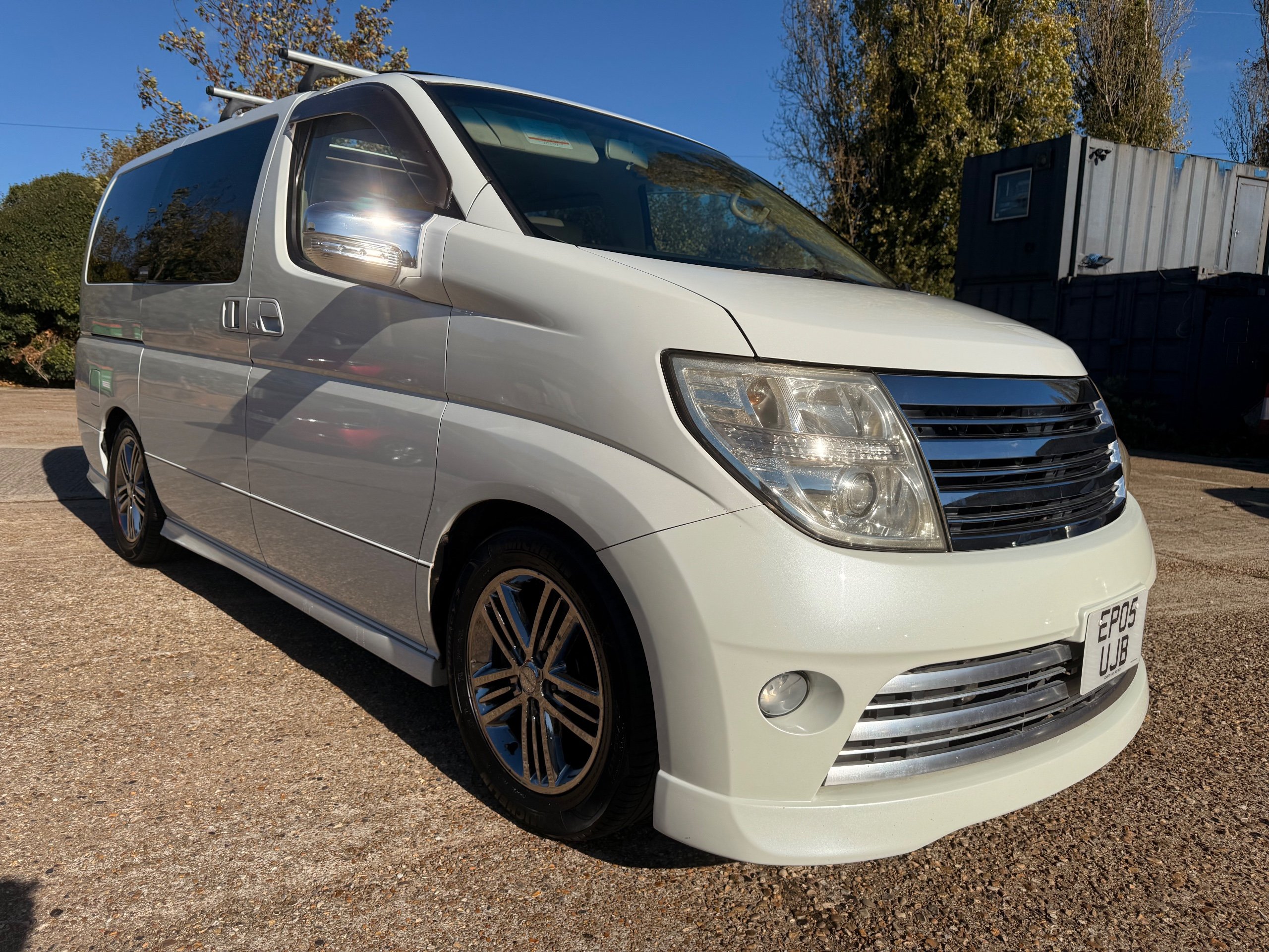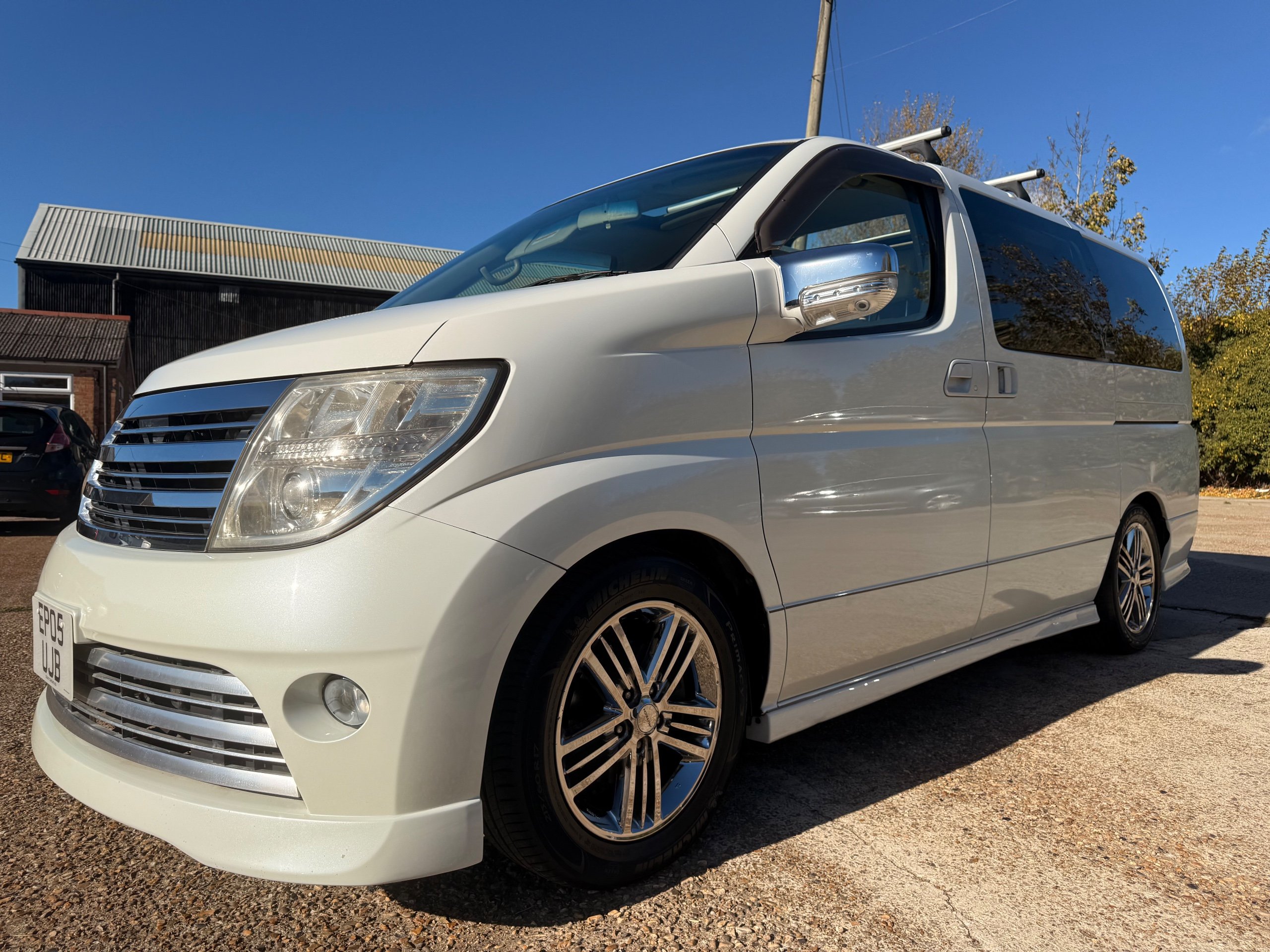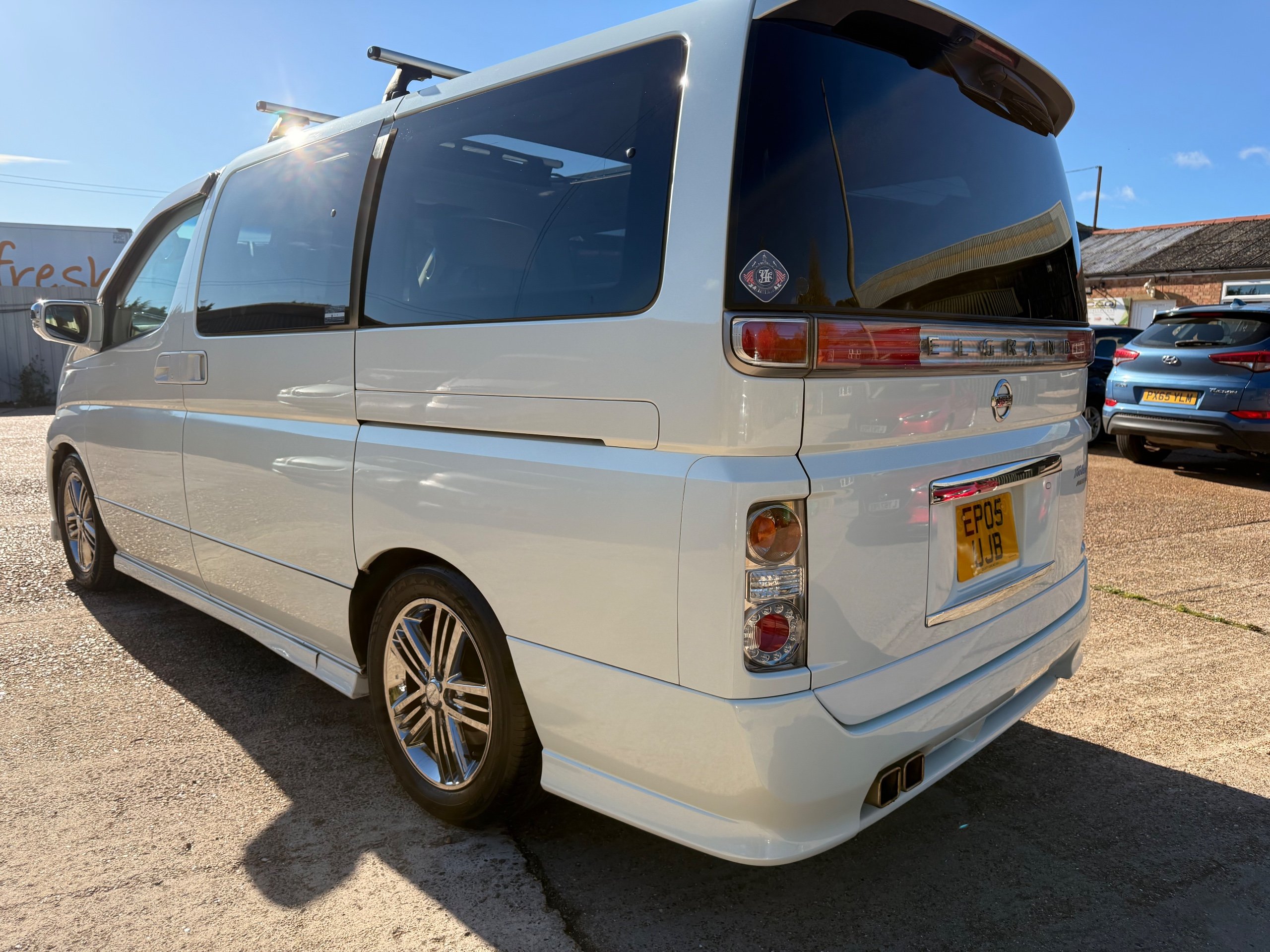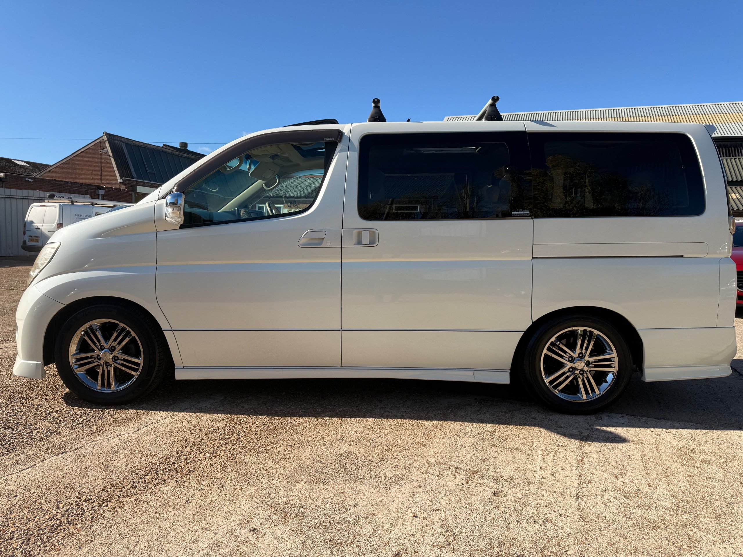 Nissan Elgrand Autech Rider 3.5 V6 Auto 2005-05-Reg, Pearlescent White Paintwork, 17” Chrome Rider Alloys, Autech pack, Full privacy glass, Twin Sunroofs. The rear sunroof is a electric moon roof, rear spoiler with built in brake light and colour reversing camera, front spots, Fold away wing mirrors with l.e.d indicators and chrome covers, Clear Rider back lights, Roof bars, 8 Seater, 8 Beige Leather seats, The front seats have armrests, The centre seats are fully rotational, The centre seat converts into a sliding table, The rear seats fold to the side to give way to a huge boot, Air-Con Climate Control, Rear Air con and climate, BOSE Sound System with UK stereo Rear Monitor to watch dvds, Imported by ourselves in 2020,