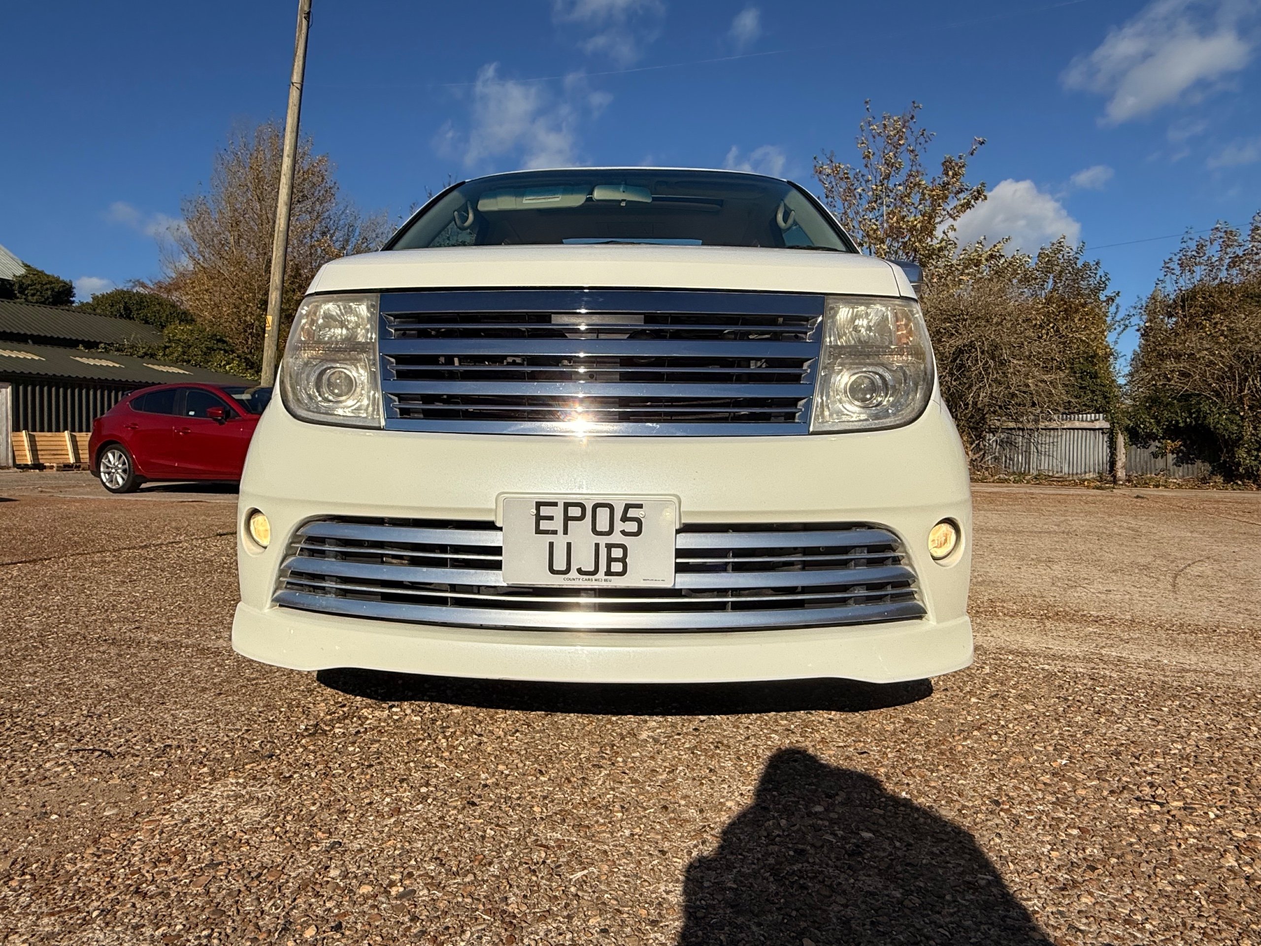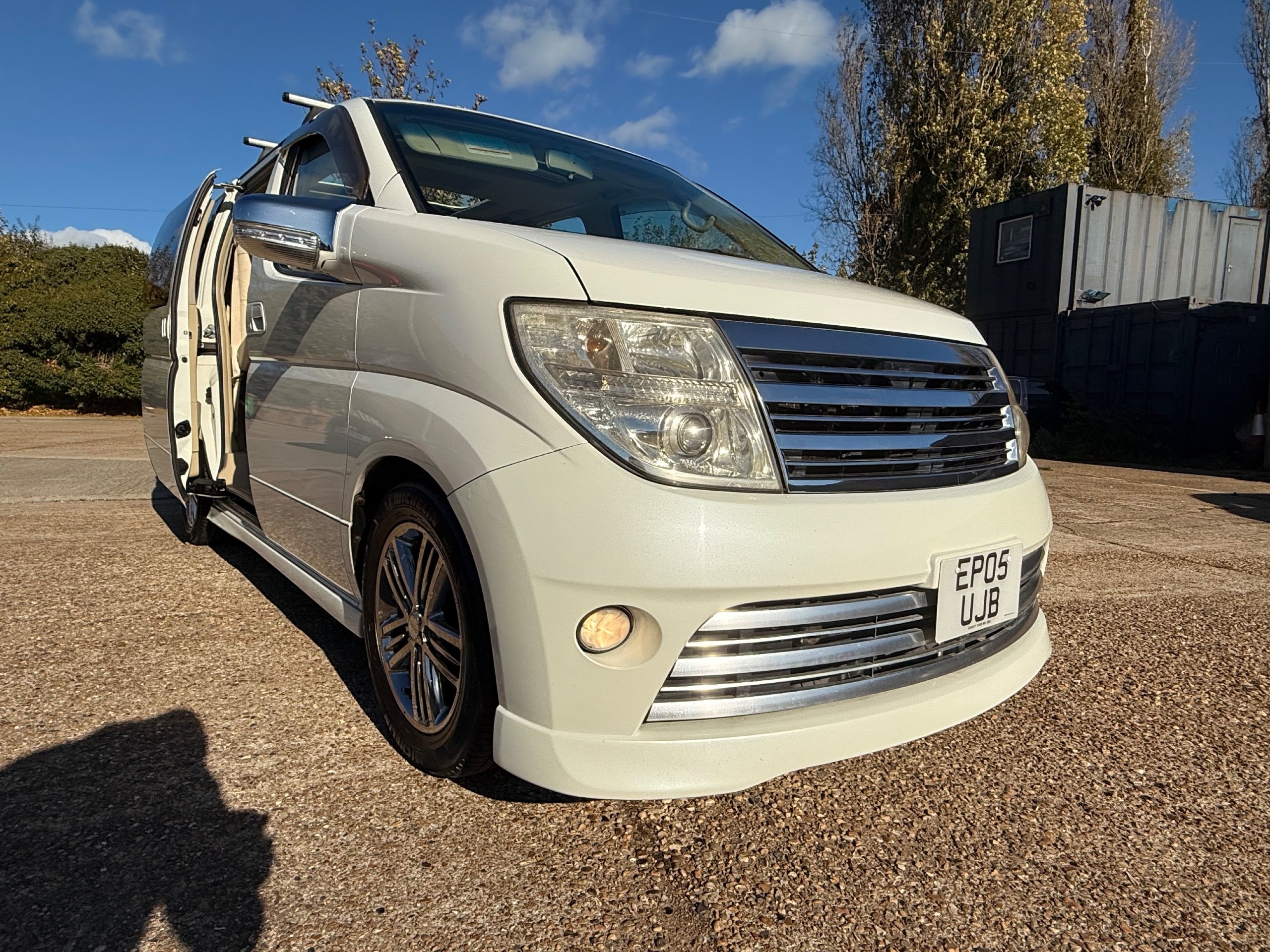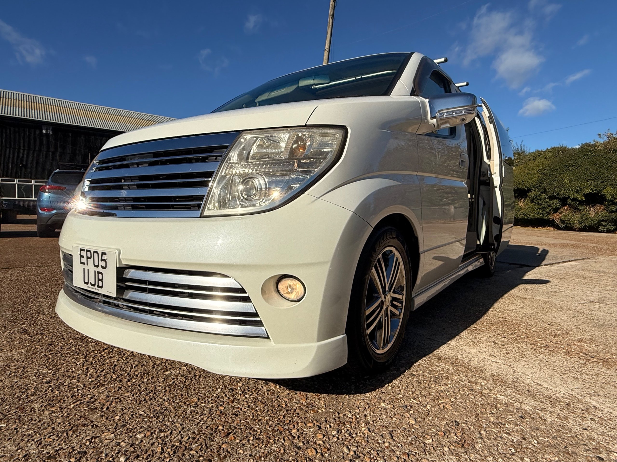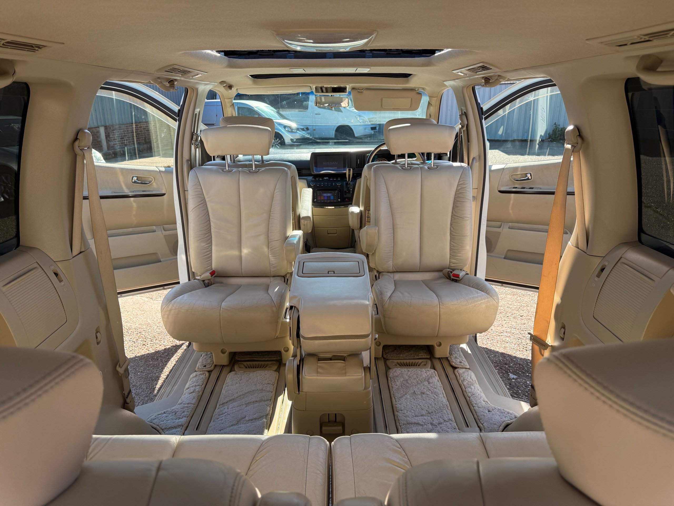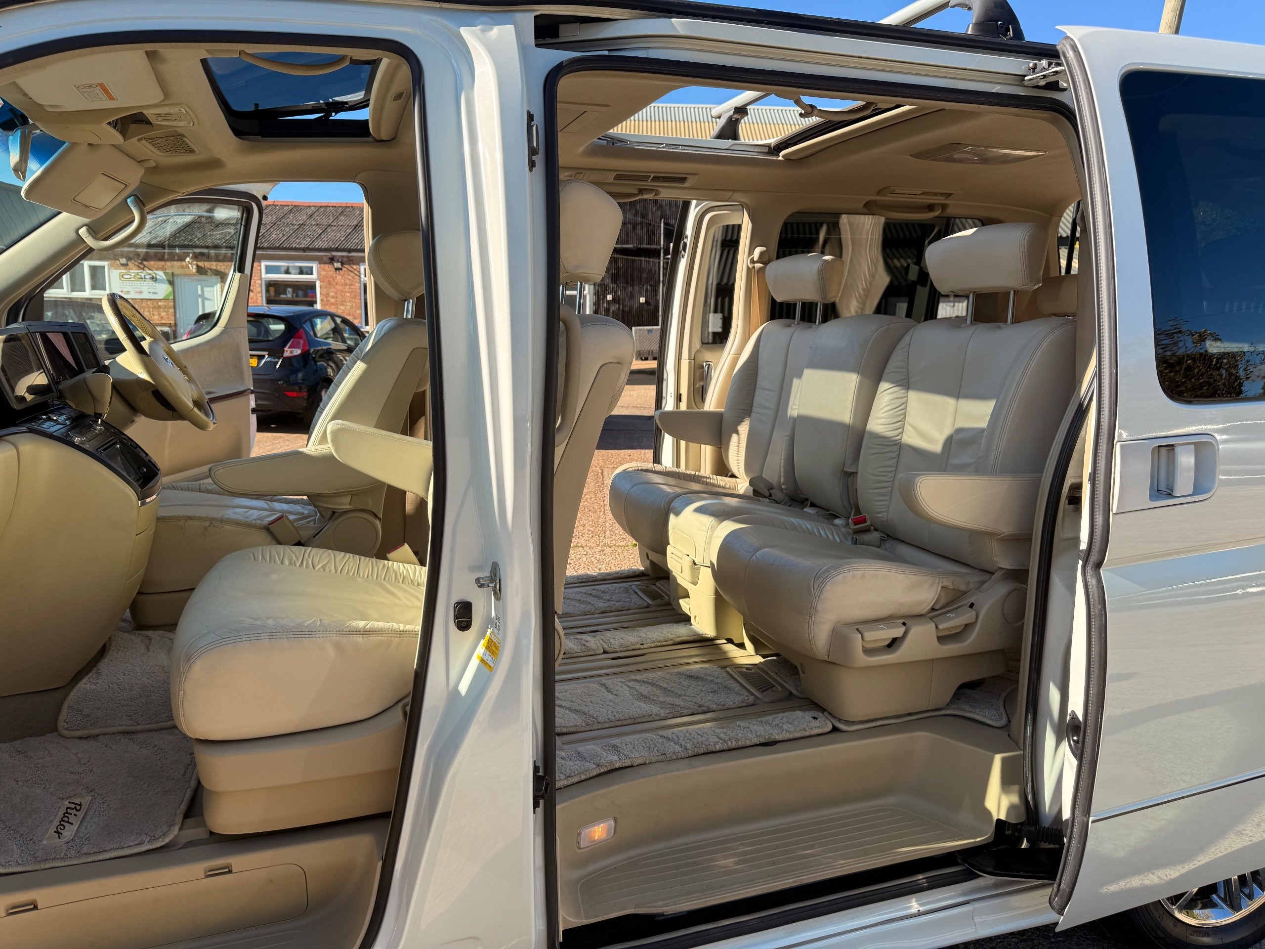 Nissan Elgrand Autech Rider 3.5 V6 Auto 2005-05-Reg, Pearlescent White Paintwork, 17” Chrome Rider Alloys, Autech pack, Full privacy glass, Twin Sunroofs. The rear sunroof is a electric moon roof, rear spoiler with built in brake light and colour reversing camera, front spots, Fold away wing mirrors with l.e.d indicators and chrome covers, Clear Rider back lights, Roof bars, 8 Seater, 8 Beige Leather seats, The front seats have armrests, The centre seats are fully rotational, The centre seat converts into a sliding table, The rear seats fold to the side to give way to a huge boot, Air-Con Climate Control, Rear Air con and climate, BOSE Sound System with UK stereo Rear Monitor to watch dvds, Imported by ourselves in 2020,