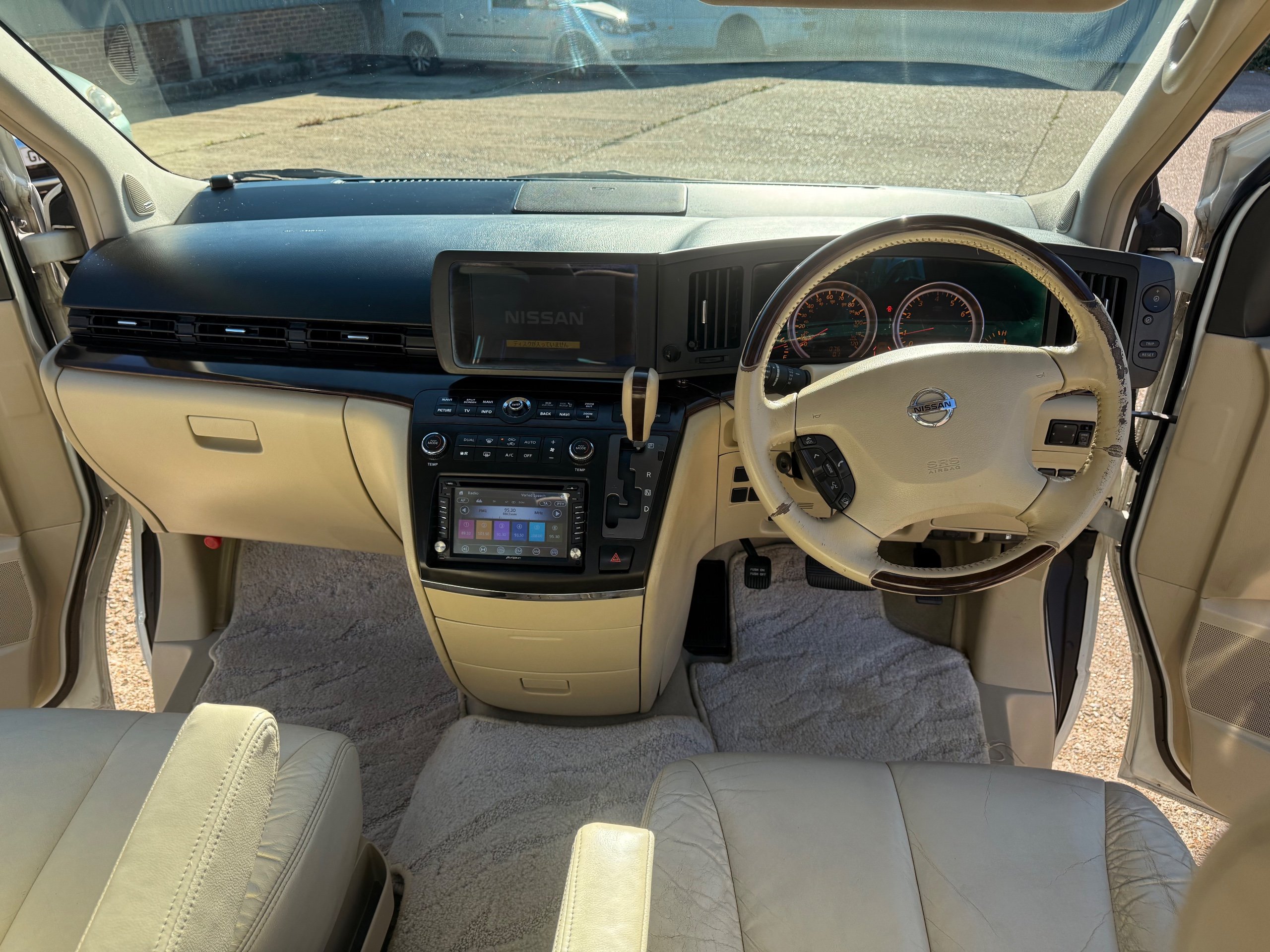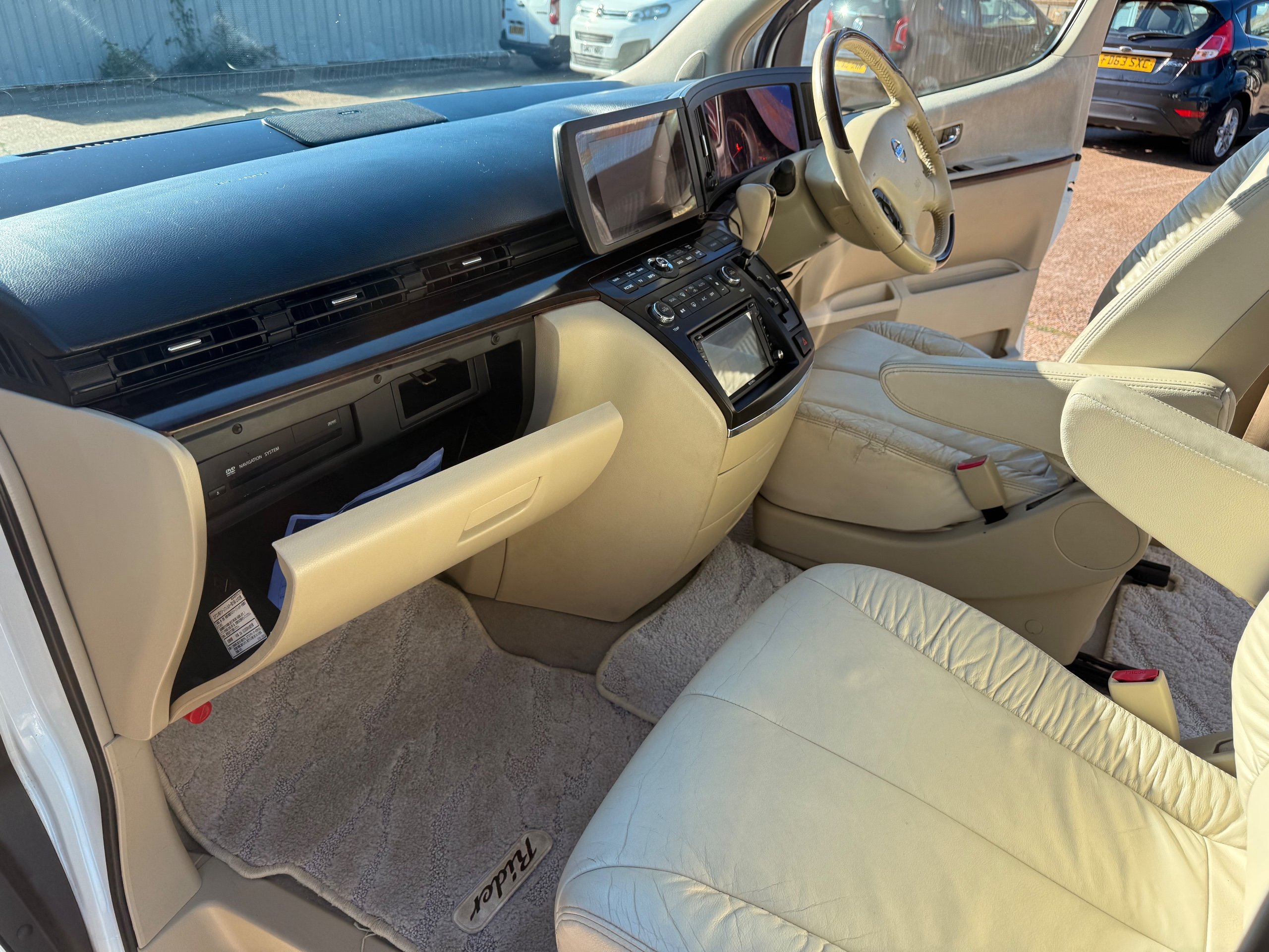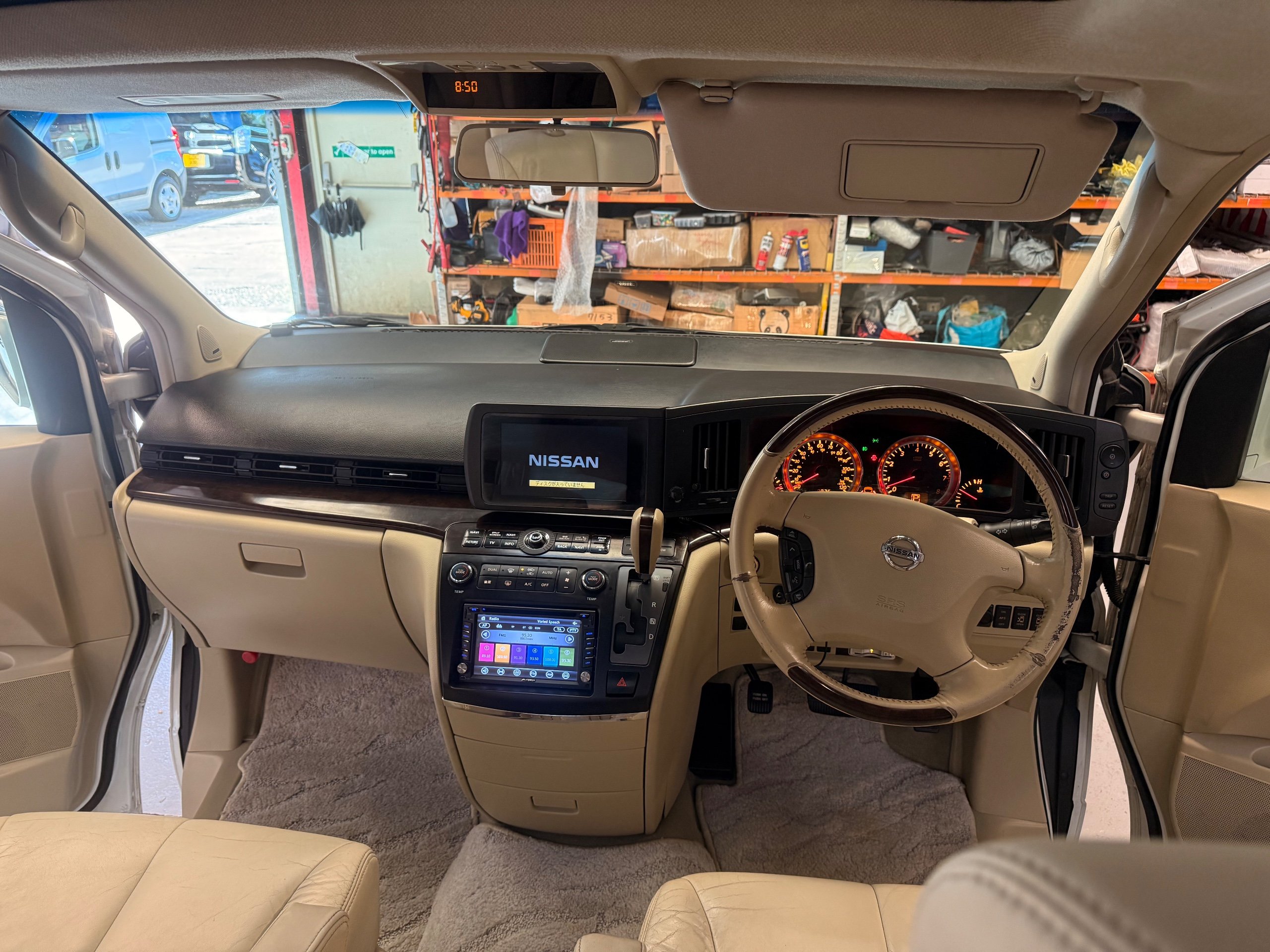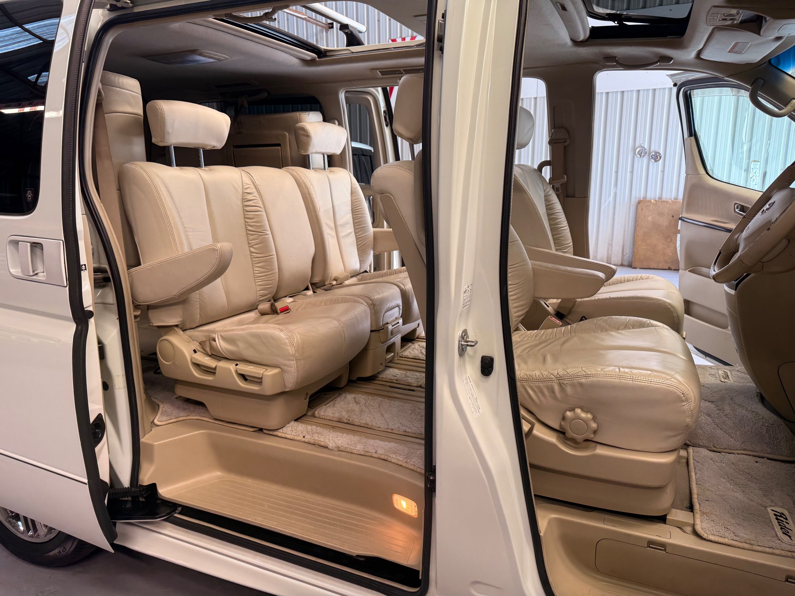 Nissan Elgrand Autech Rider 3.5 V6 Auto 2005-05-Reg, Pearlescent White Paintwork, 17” Chrome Rider Alloys, Autech pack, Full privacy glass, Twin Sunroofs. The rear sunroof is a electric moon roof, rear spoiler with built in brake light and colour reversing camera, front spots, Fold away wing mirrors with l.e.d indicators and chrome covers, Clear Rider back lights, Roof bars, 8 Seater, 8 Beige Leather seats, The front seats have armrests, The centre seats are fully rotational, The centre seat converts into a sliding table, The rear seats fold to the side to give way to a huge boot, Air-Con Climate Control, Rear Air con and climate, BOSE Sound System with UK stereo Rear Monitor to watch dvds, Imported by ourselves in 2020,