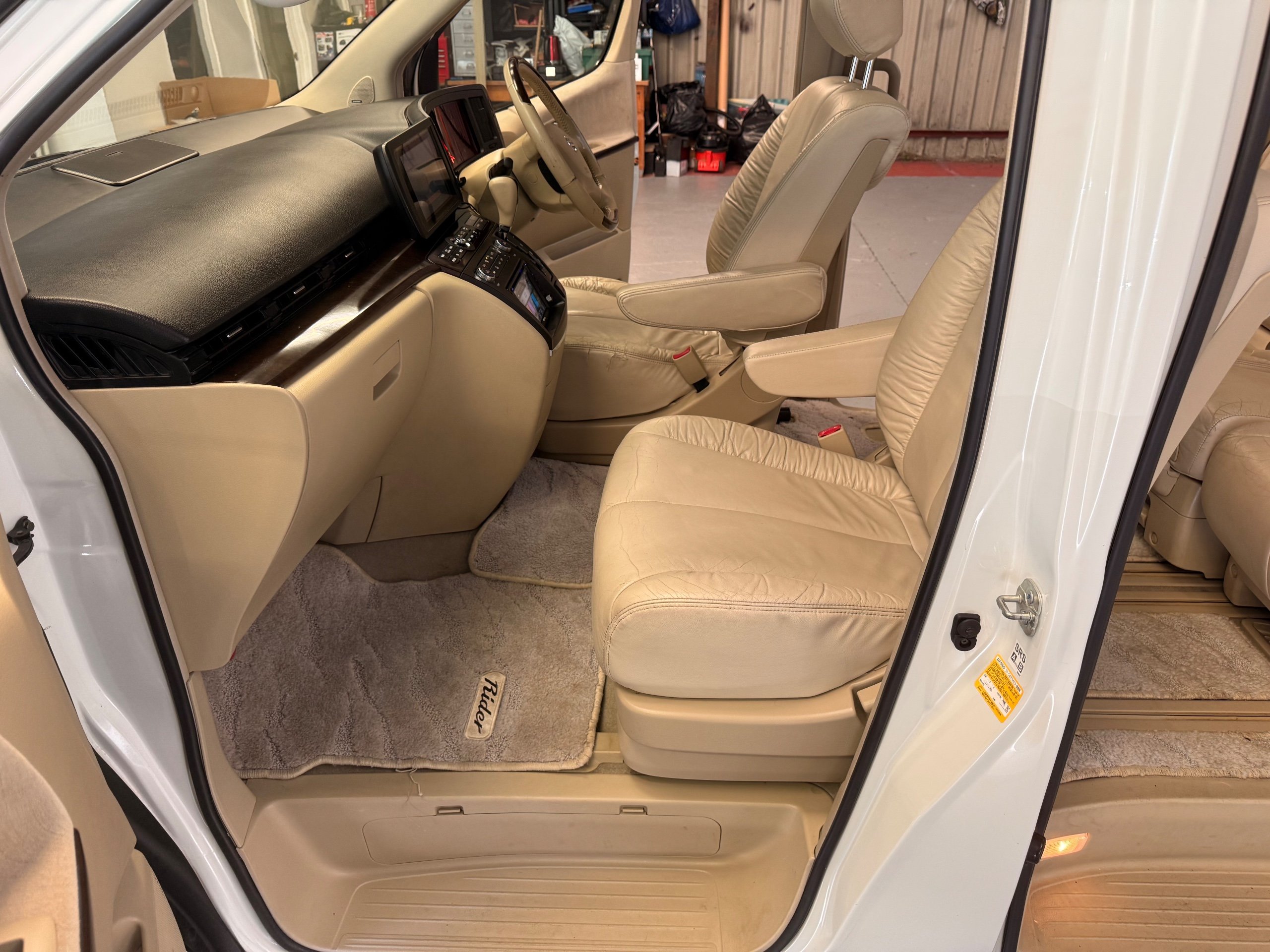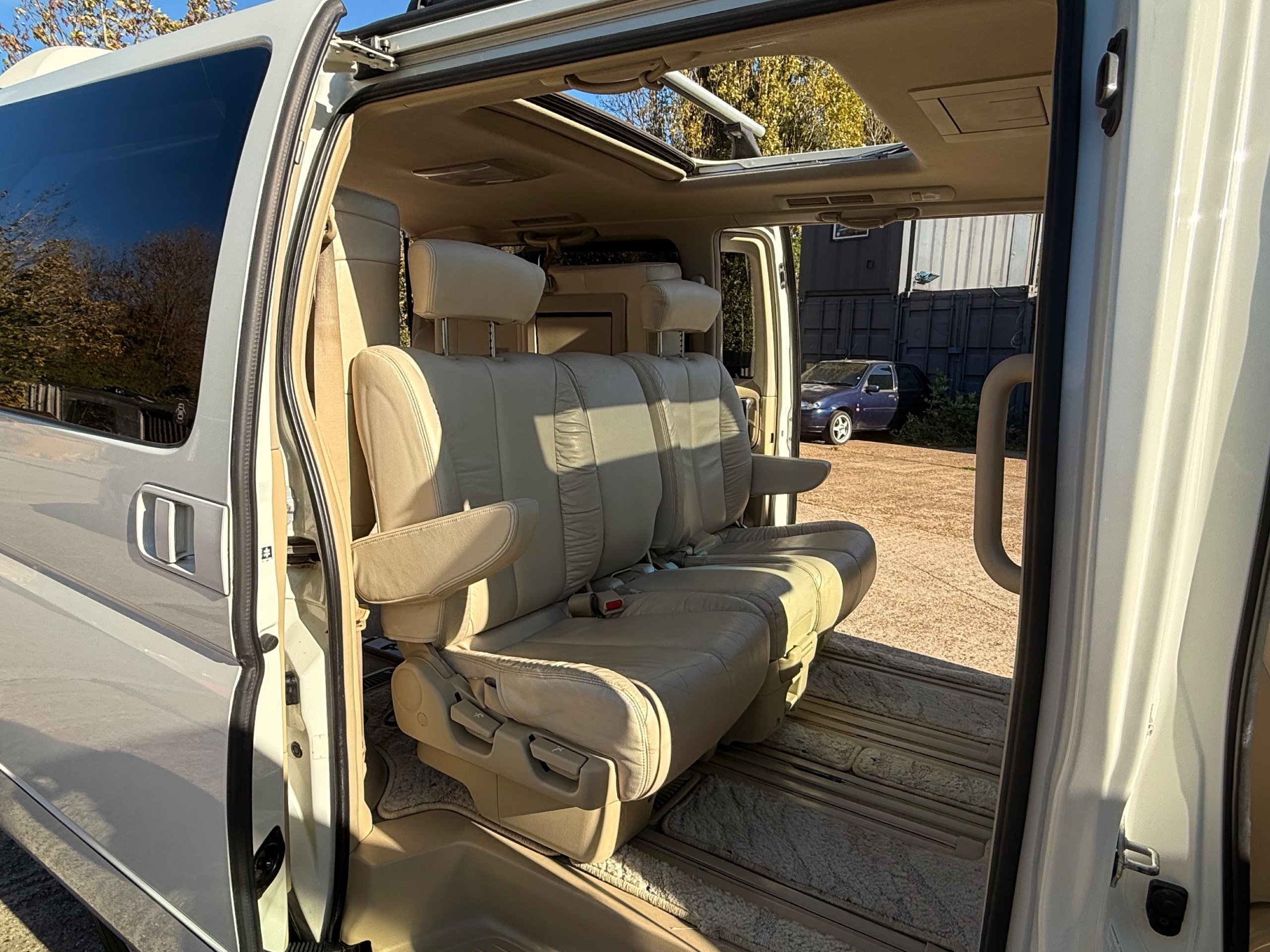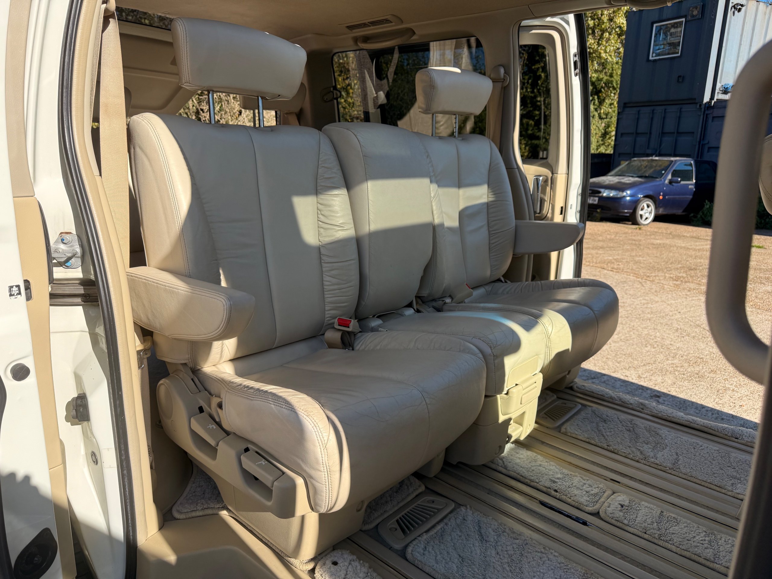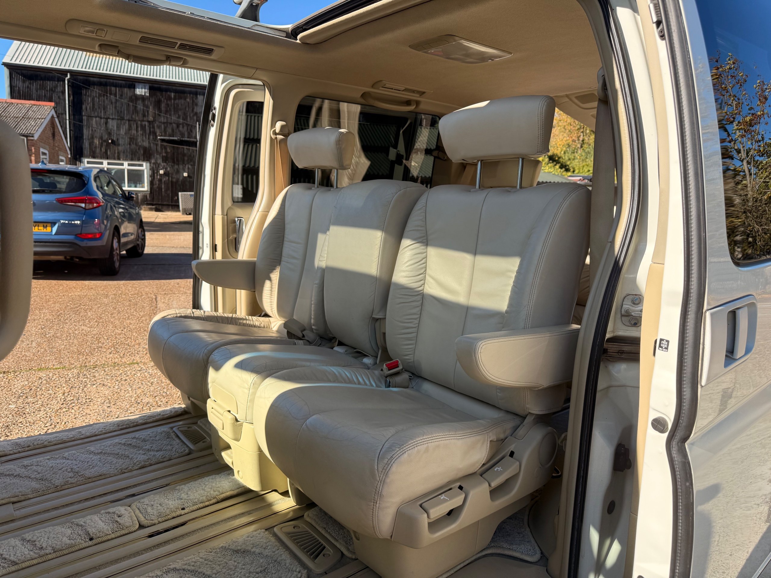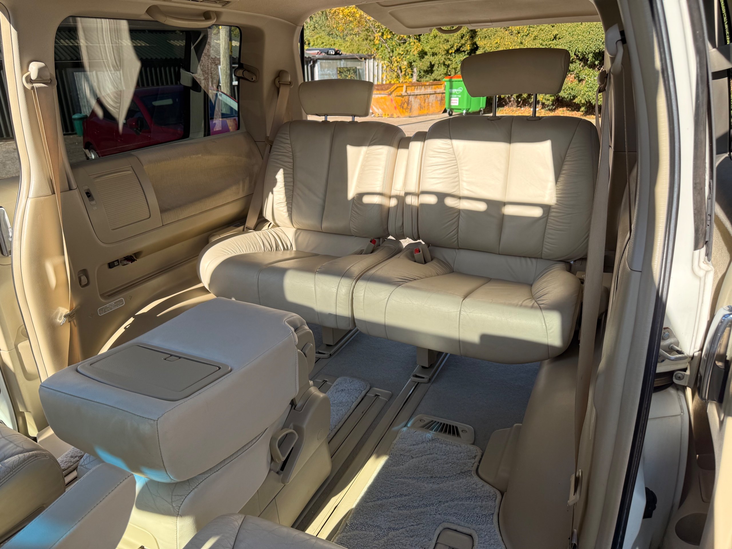 Nissan Elgrand Autech Rider 3.5 V6 Auto 2005-05-Reg, Pearlescent White Paintwork, 17” Chrome Rider Alloys, Autech pack, Full privacy glass, Twin Sunroofs. The rear sunroof is a electric moon roof, rear spoiler with built in brake light and colour reversing camera, front spots, Fold away wing mirrors with l.e.d indicators and chrome covers, Clear Rider back lights, Roof bars, 8 Seater, 8 Beige Leather seats, The front seats have armrests, The centre seats are fully rotational, The centre seat converts into a sliding table, The rear seats fold to the side to give way to a huge boot, Air-Con Climate Control, Rear Air con and climate, BOSE Sound System with UK stereo Rear Monitor to watch dvds, Imported by ourselves in 2020,