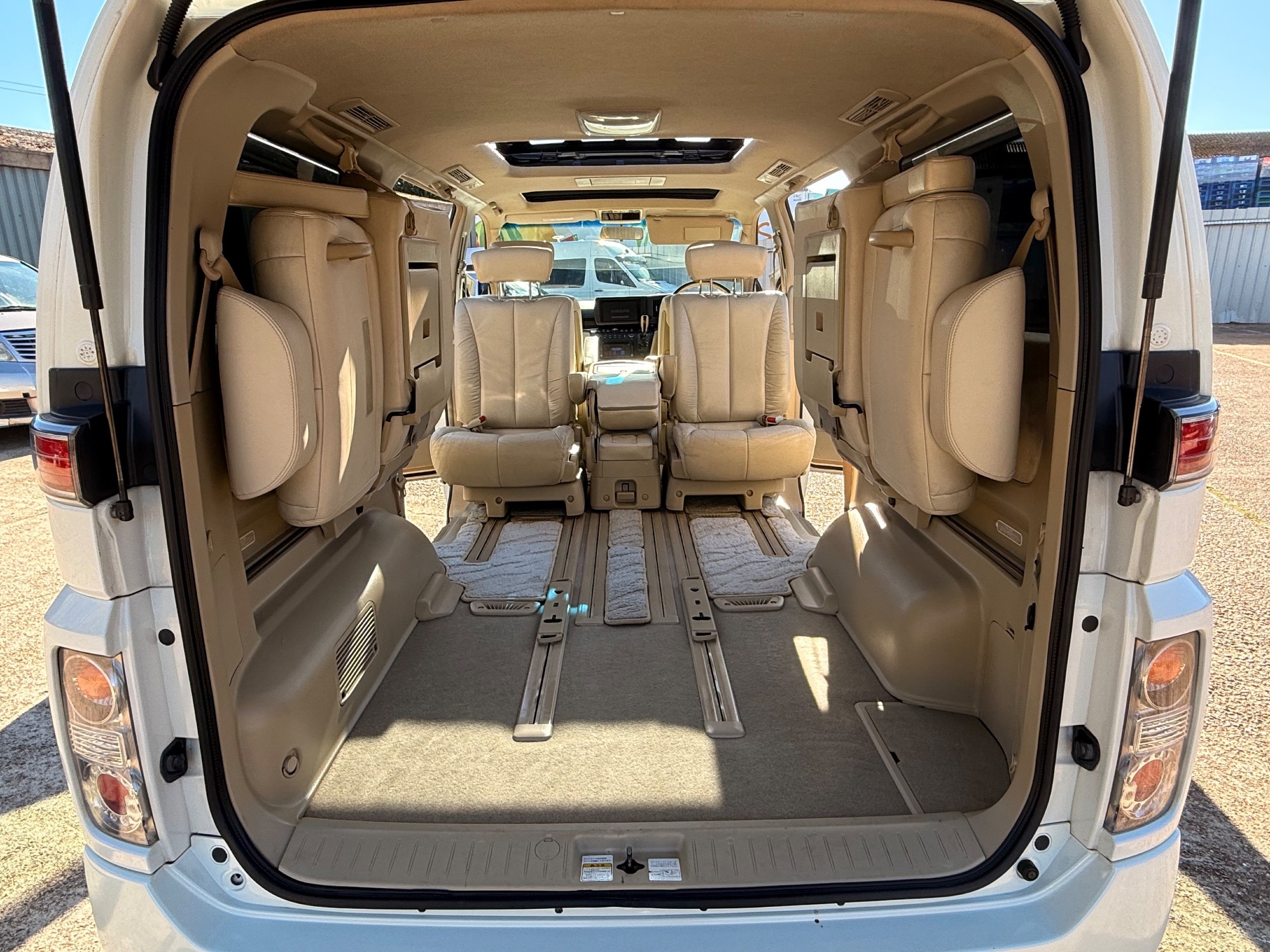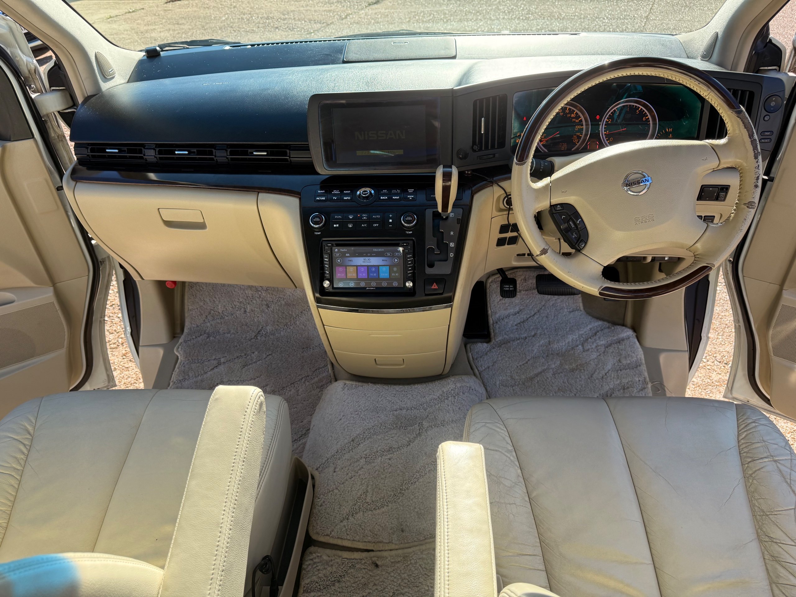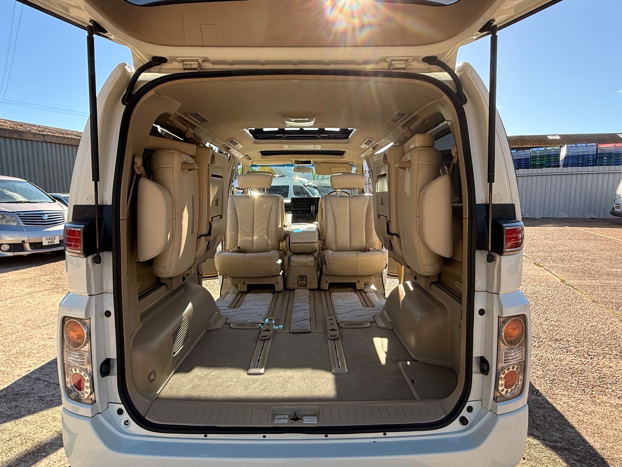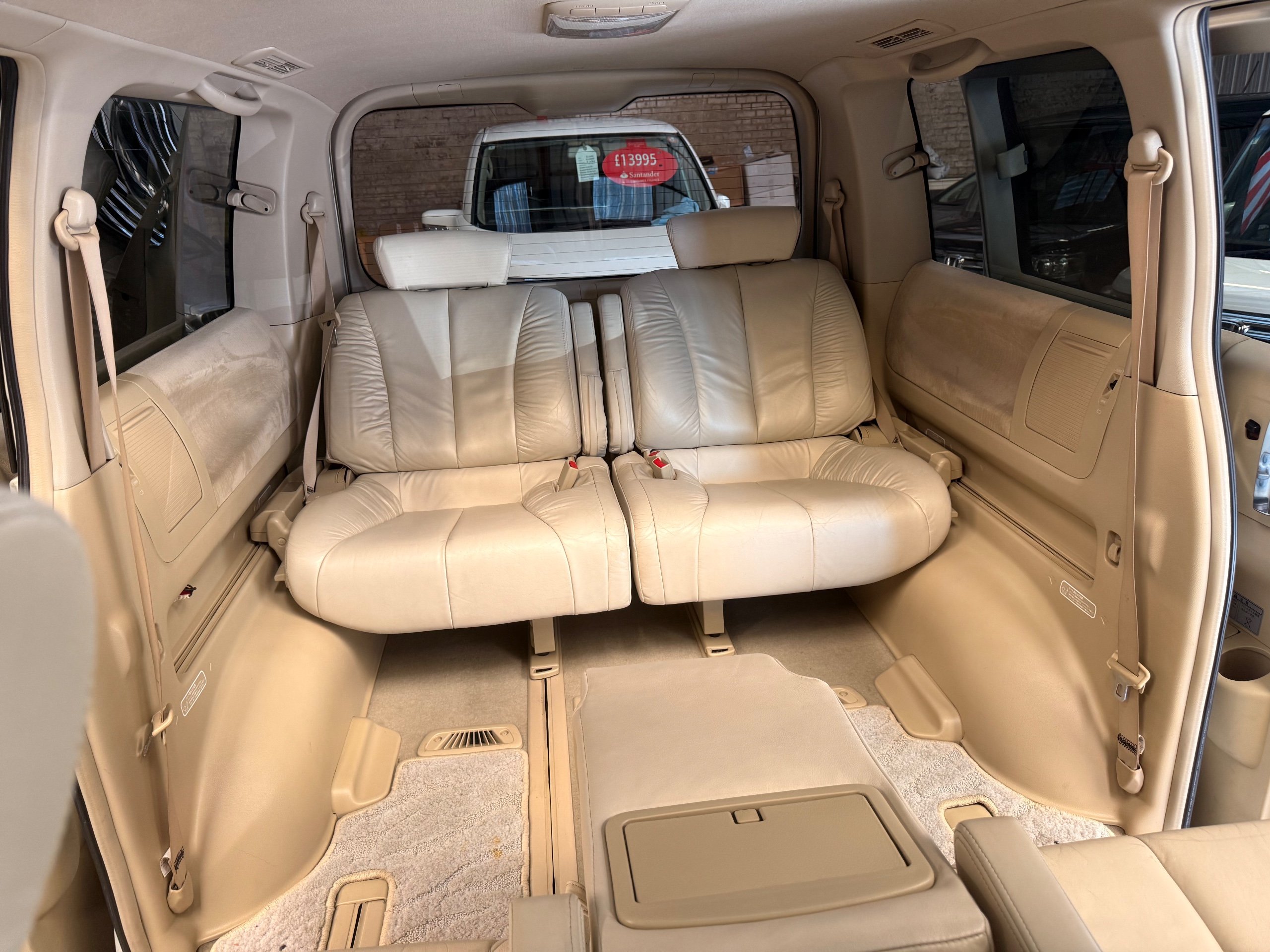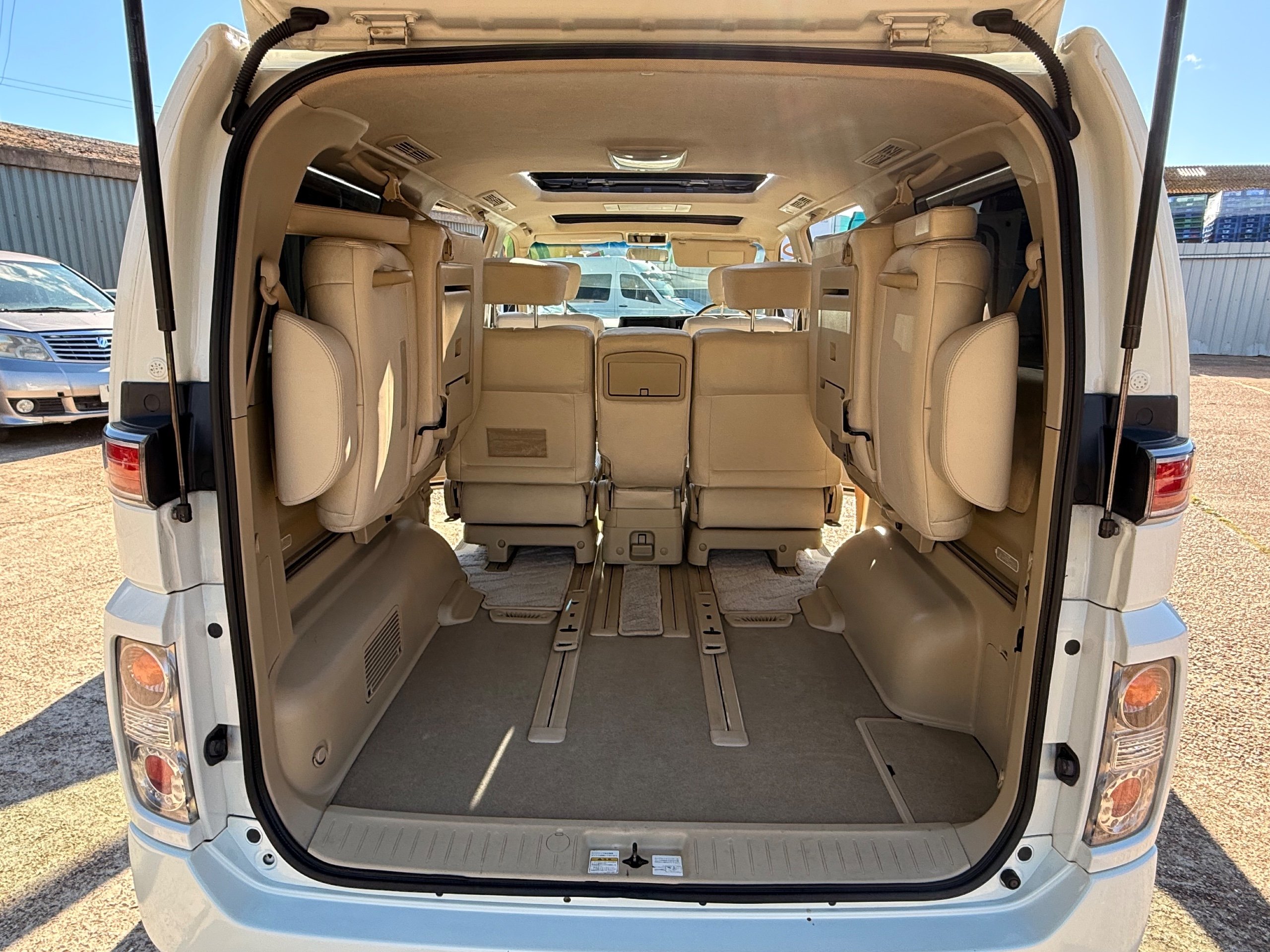 Nissan Elgrand Autech Rider 3.5 V6 Auto 2005-05-Reg, Pearlescent White Paintwork, 17” Chrome Rider Alloys, Autech pack, Full privacy glass, Twin Sunroofs. The rear sunroof is a electric moon roof, rear spoiler with built in brake light and colour reversing camera, front spots, Fold away wing mirrors with l.e.d indicators and chrome covers, Clear Rider back lights, Roof bars, 8 Seater, 8 Beige Leather seats, The front seats have armrests, The centre seats are fully rotational, The centre seat converts into a sliding table, The rear seats fold to the side to give way to a huge boot, Air-Con Climate Control, Rear Air con and climate, BOSE Sound System with UK stereo Rear Monitor to watch dvds, Imported by ourselves in 2020,