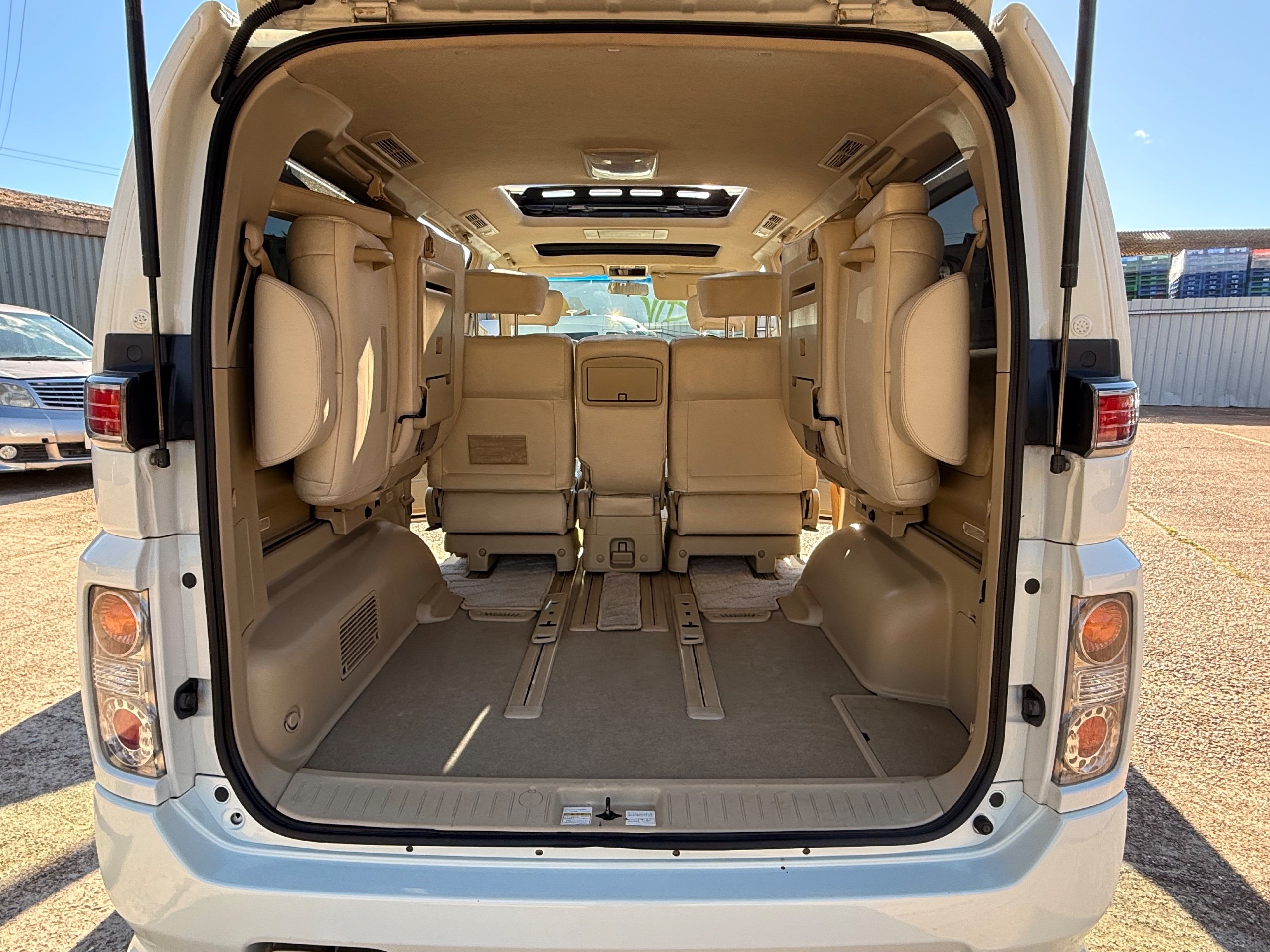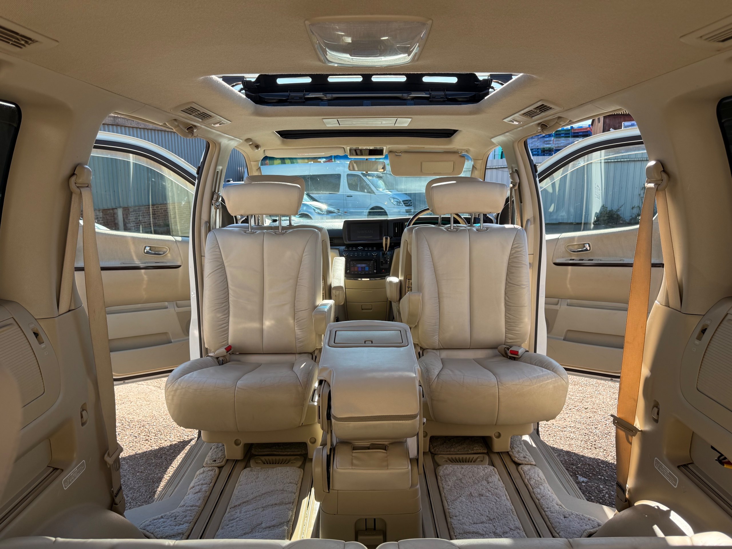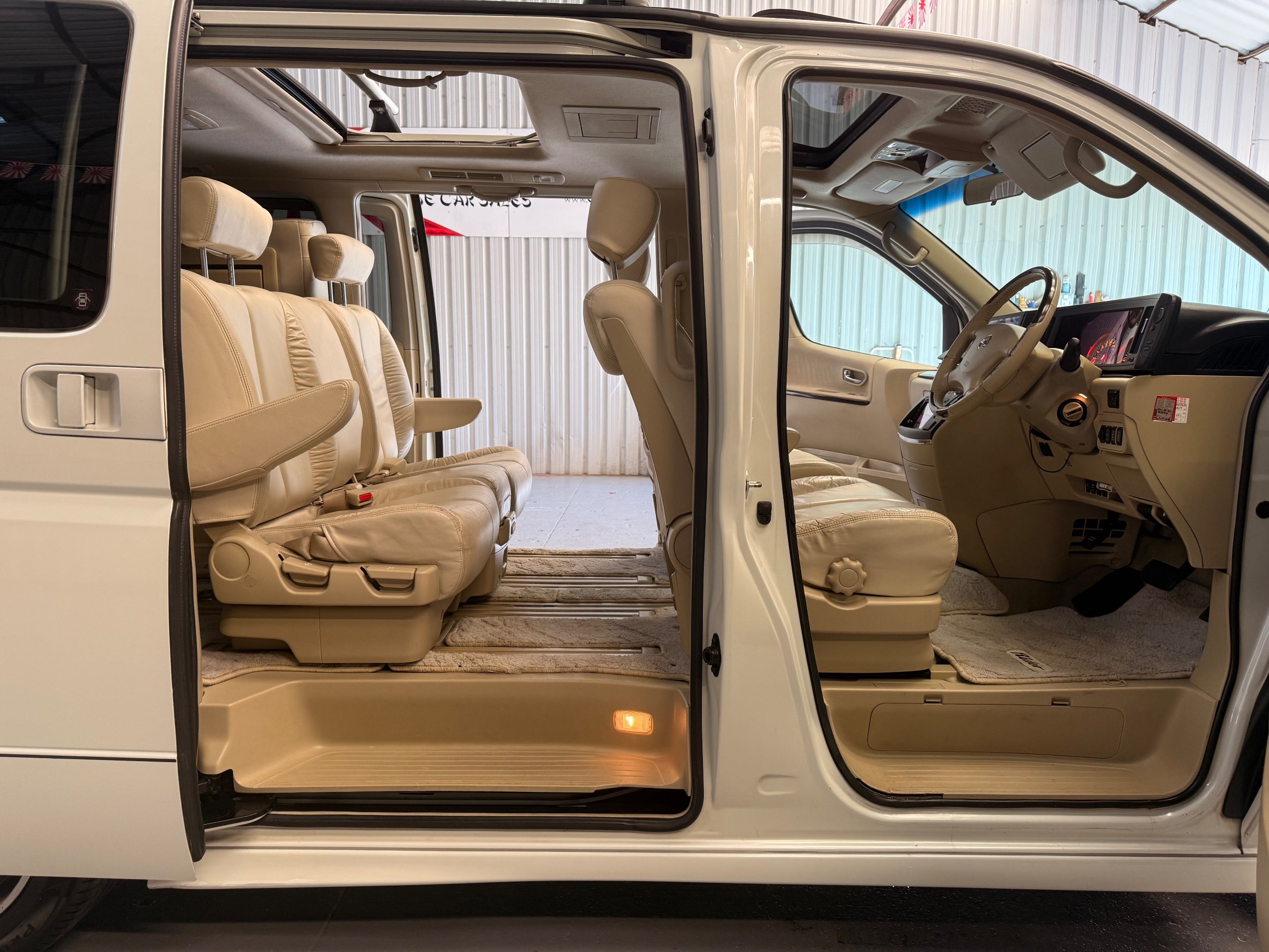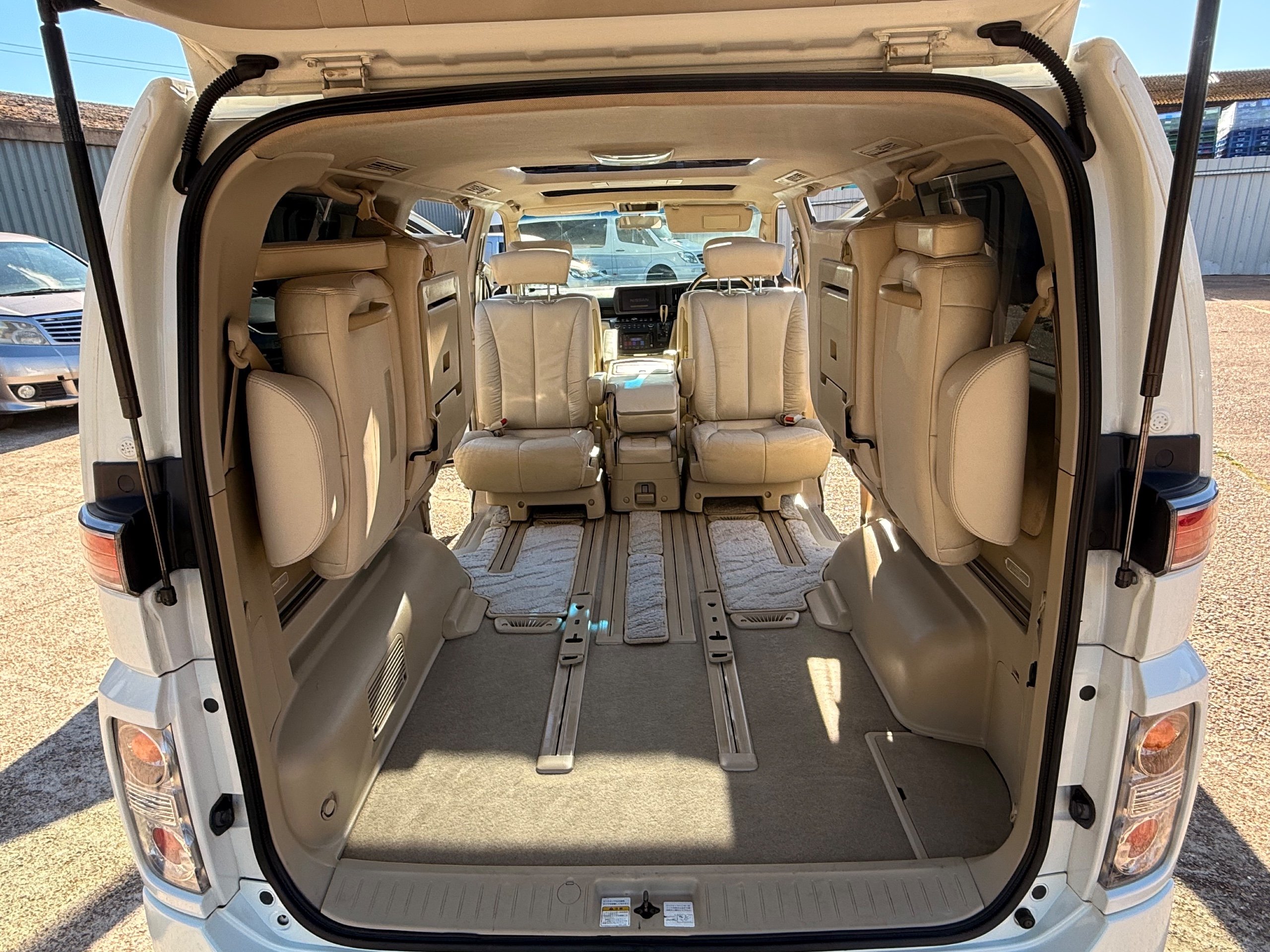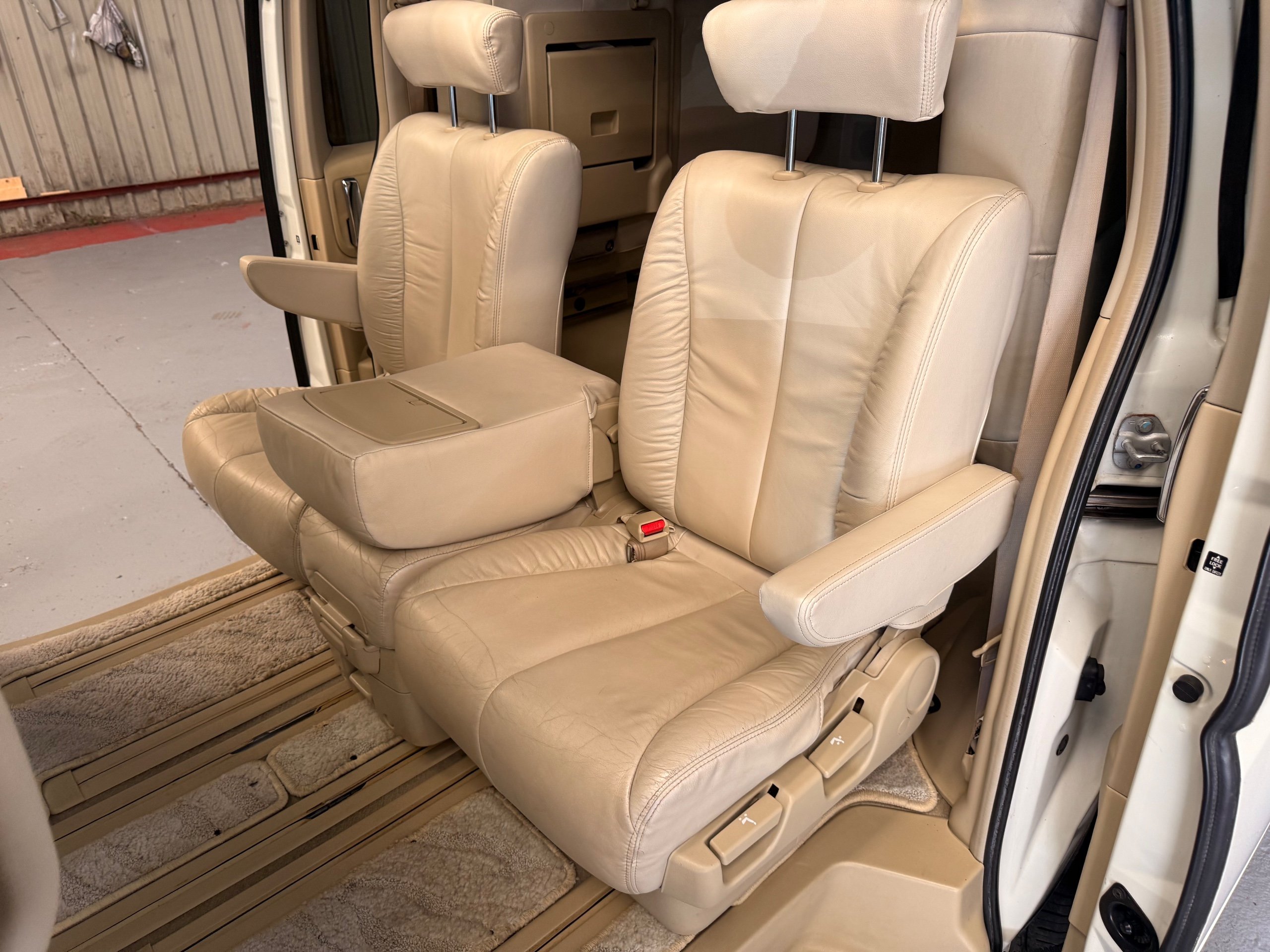 Nissan Elgrand Autech Rider 3.5 V6 Auto 2005-05-Reg, Pearlescent White Paintwork, 17” Chrome Rider Alloys, Autech pack, Full privacy glass, Twin Sunroofs. The rear sunroof is a electric moon roof, rear spoiler with built in brake light and colour reversing camera, front spots, Fold away wing mirrors with l.e.d indicators and chrome covers, Clear Rider back lights, Roof bars, 8 Seater, 8 Beige Leather seats, The front seats have armrests, The centre seats are fully rotational, The centre seat converts into a sliding table, The rear seats fold to the side to give way to a huge boot, Air-Con Climate Control, Rear Air con and climate, BOSE Sound System with UK stereo Rear Monitor to watch dvds, Imported by ourselves in 2020,