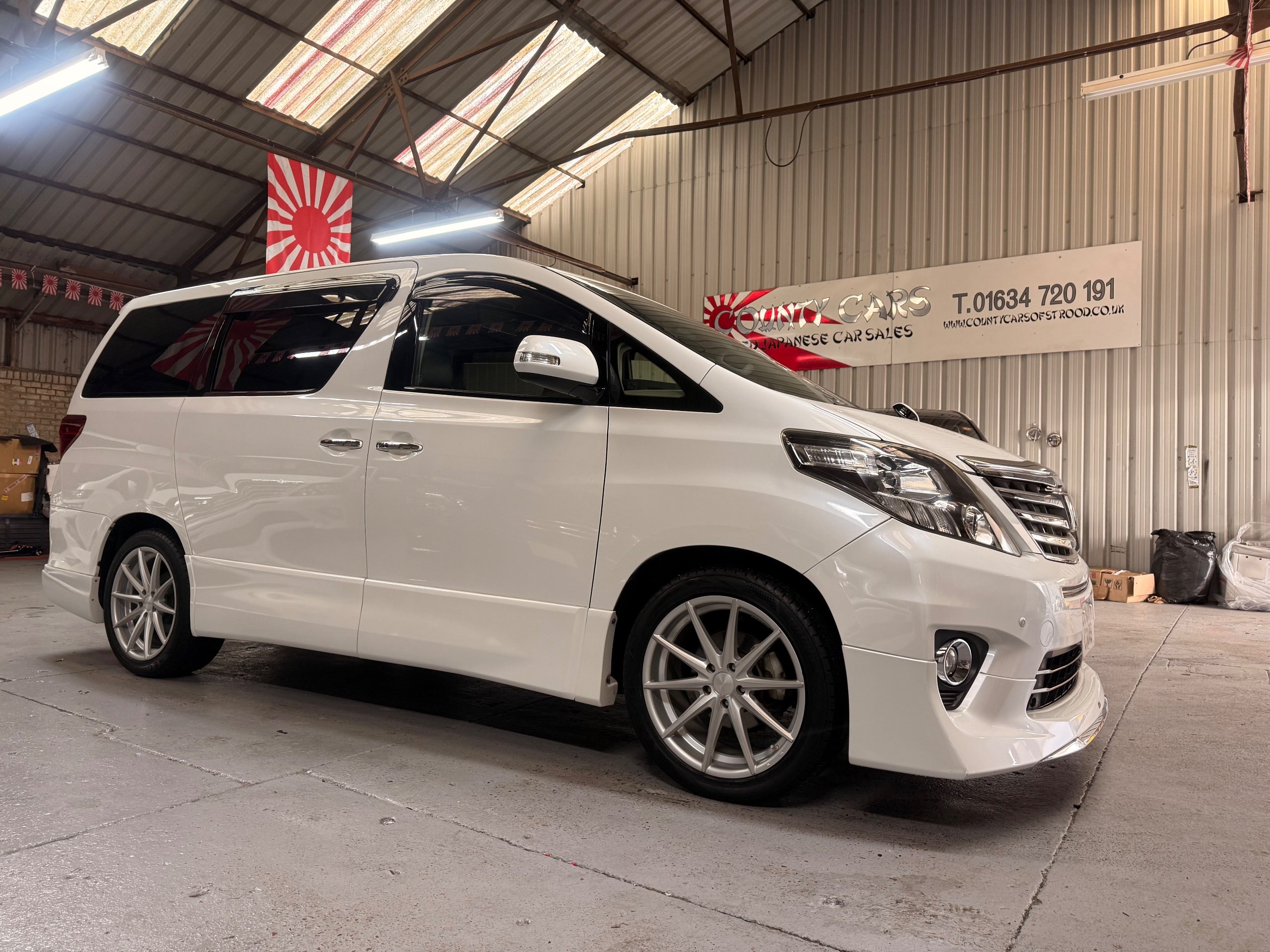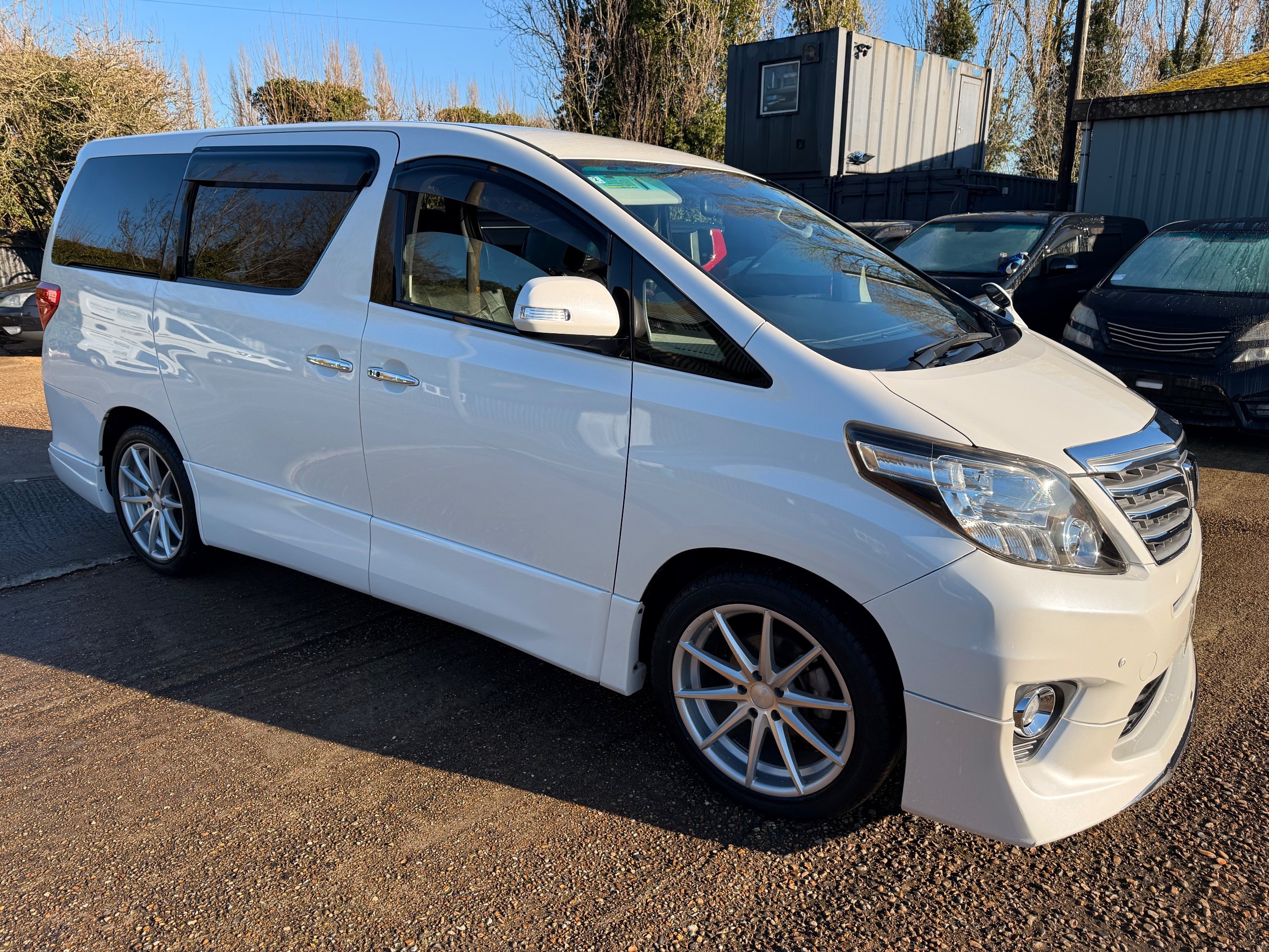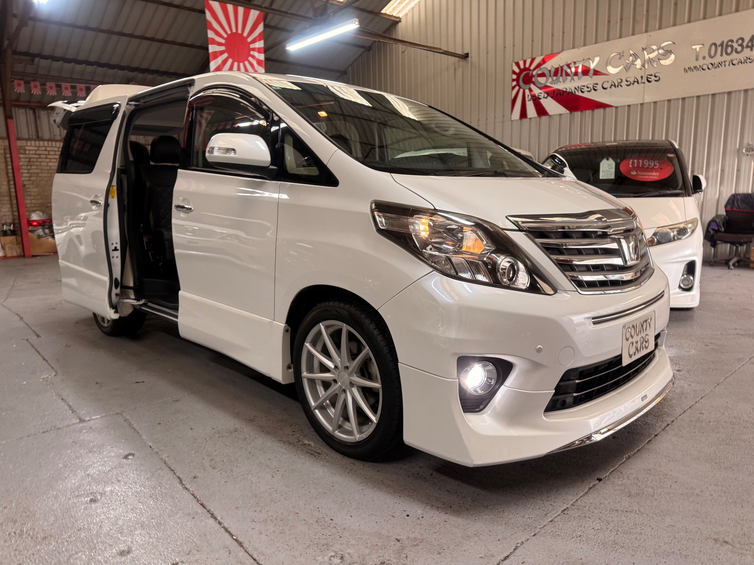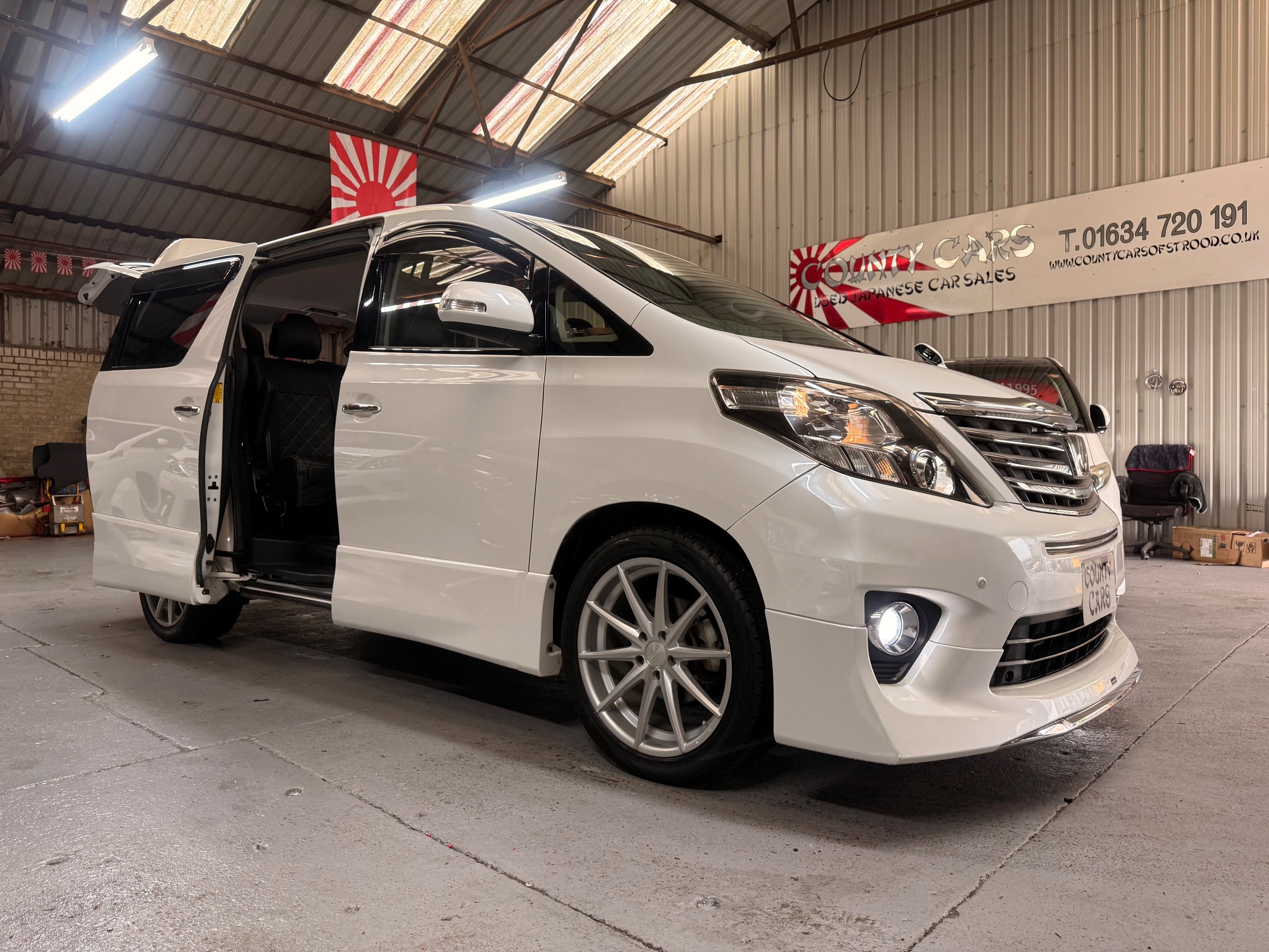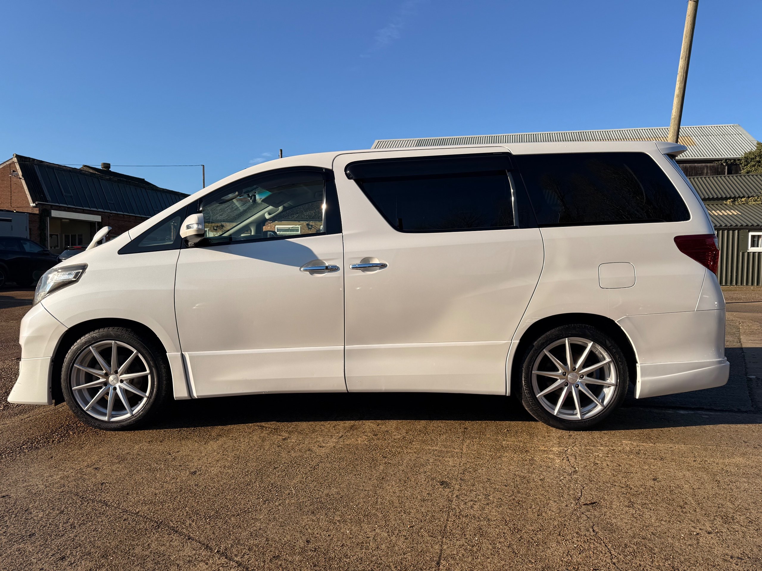 Toyota Alphard 240 S 2.4 Automatic, 8 Seater, 2014-63-Reg, Finished in Beautiful Pearlescent White Paintwork, 19” Deep Dish Alloys, Full Privacy Glass, Electric Soft Closing Sliding Passenger Door, Rear Spoiler with built in brake light, Front and Rear Parking Sensors, Colour Reversing Camera, Front spots with chrome surrounds, Front and Rear Bumper Spoilers ,8 Seater, 8 Unblemished Leather Look Crossed Stitch Seat Covers, The front seats have armrests, Centre Console with flip up cup-holders, The centre seat have twin armrests and centre armrest. The centre seat folds up and slides forward and has Isofix points, The Rear seats fold up to give way to a huge boot, Front and Rear Air-Con and climate control, 65,000 Miles, Apple CarPlay Android Auto uk Stereo, MPH Speedo conversion, Push button Start, Keyless Entry, Isofix Anchor points, ULEZ compliant, Eco mode, 65,000 Genuine miles with all the Genuine paperwork from Japan, Auction Sheet, mileage certificate, CarVX Checked,