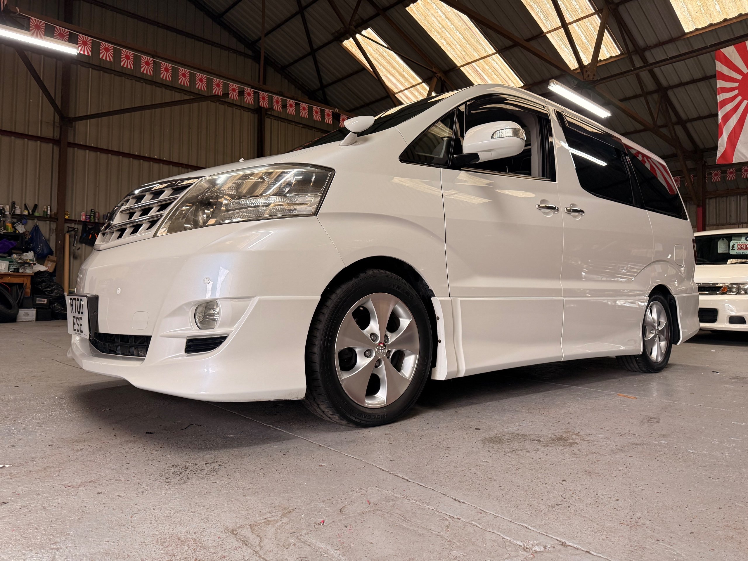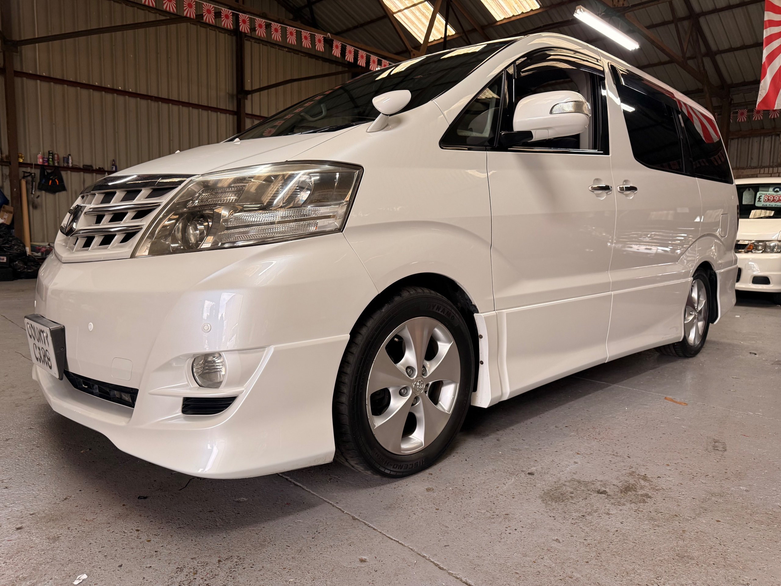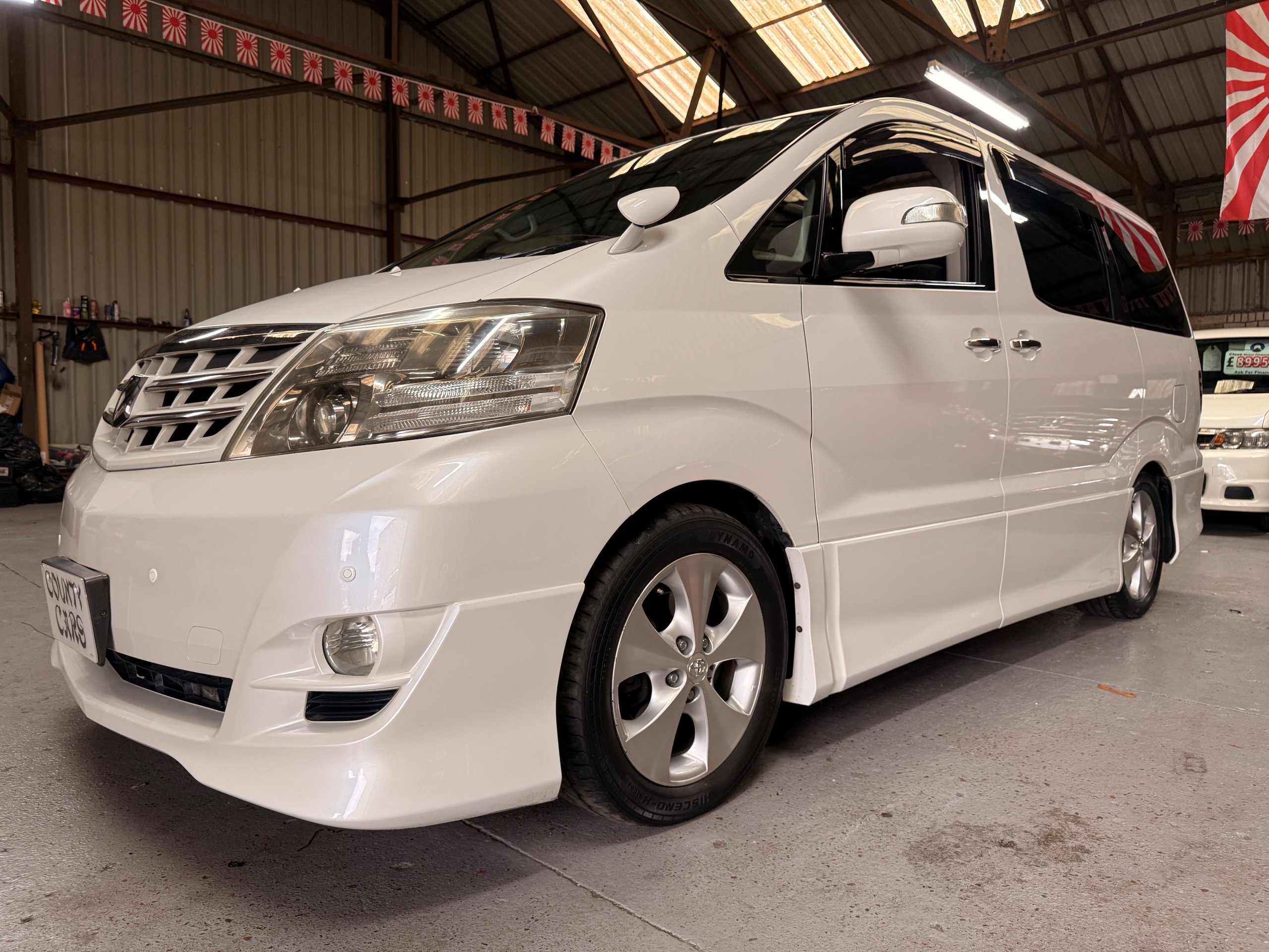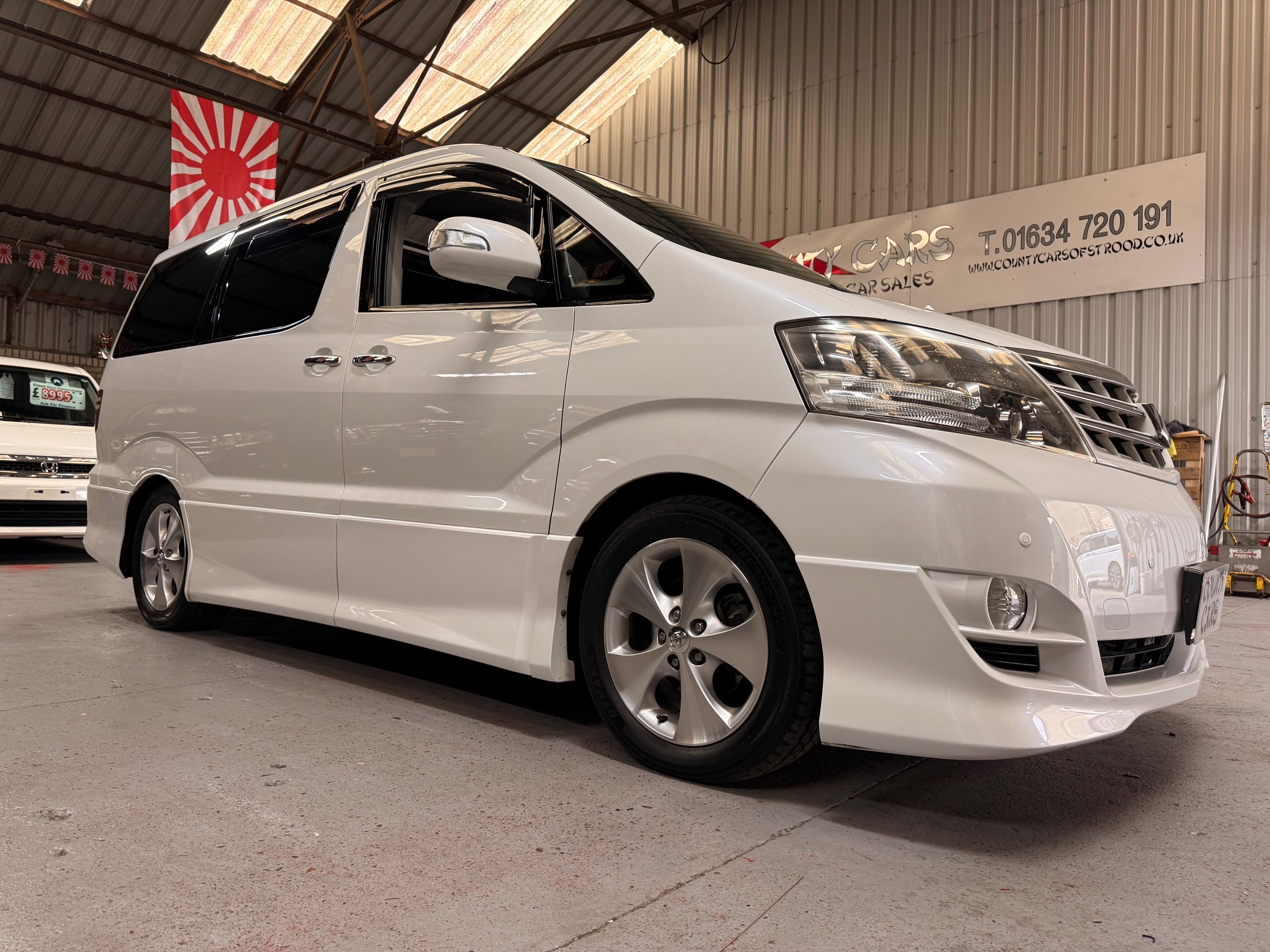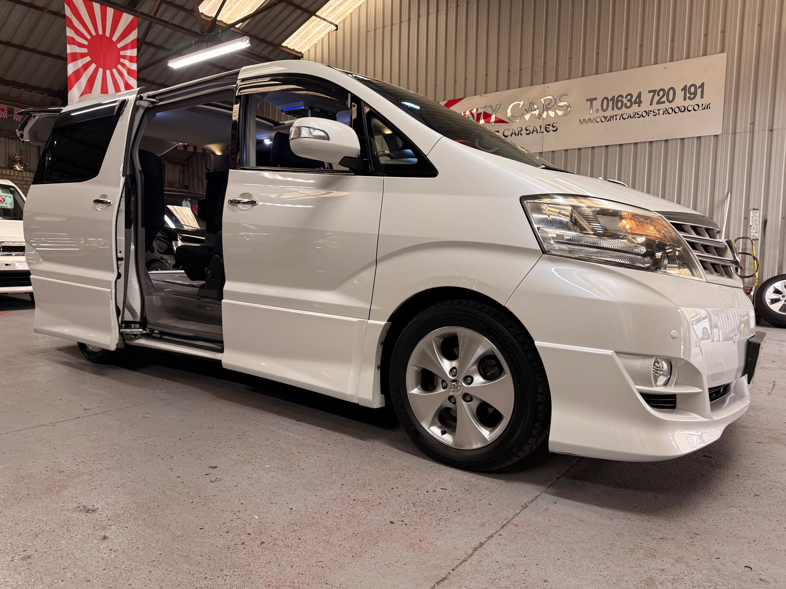 Toyota Alphard 3.0 V6 Platinum Selection ll Auto, 2008-08-Reg, Finished in Pearlescent White Paintwork, Unmarked Genuine 17" Polished Toyota Alloys, Front spots Fold away wing mirrors, Full privacy glass, Twin Sunroofs, Rear Electric Sunroof, Twin Electric soft closing sliding doors, Electric Tailgate, Front and Rear Parking Sensors, 8 Seater, 8 Unblemished Black Alcantara Seats, The front seats have armrests, centre console with a flip up tray, The centre seats have armrests/centre armrest with cup holders, The centre seats also folds down to display two tables with cup holders, The seats are also fully rotational, The rear seats fold to the side to give way to a huge loading space, Front and Rear Parking Sensors, front and rear Air-Con and climate control, Front and rear Electric windows, Ambient Lighting, Isofix Points, U.K Stereo with colour reversing camera, Rear monitor linked to the front DVD. UK Speedo conversion, Only covered a Genuine 68,000 with all the Genuine paperwork from Japan including the Export certificate and Auction sheet to prove the mileage and condition before it left Japan Nationwide Delivery Service Available