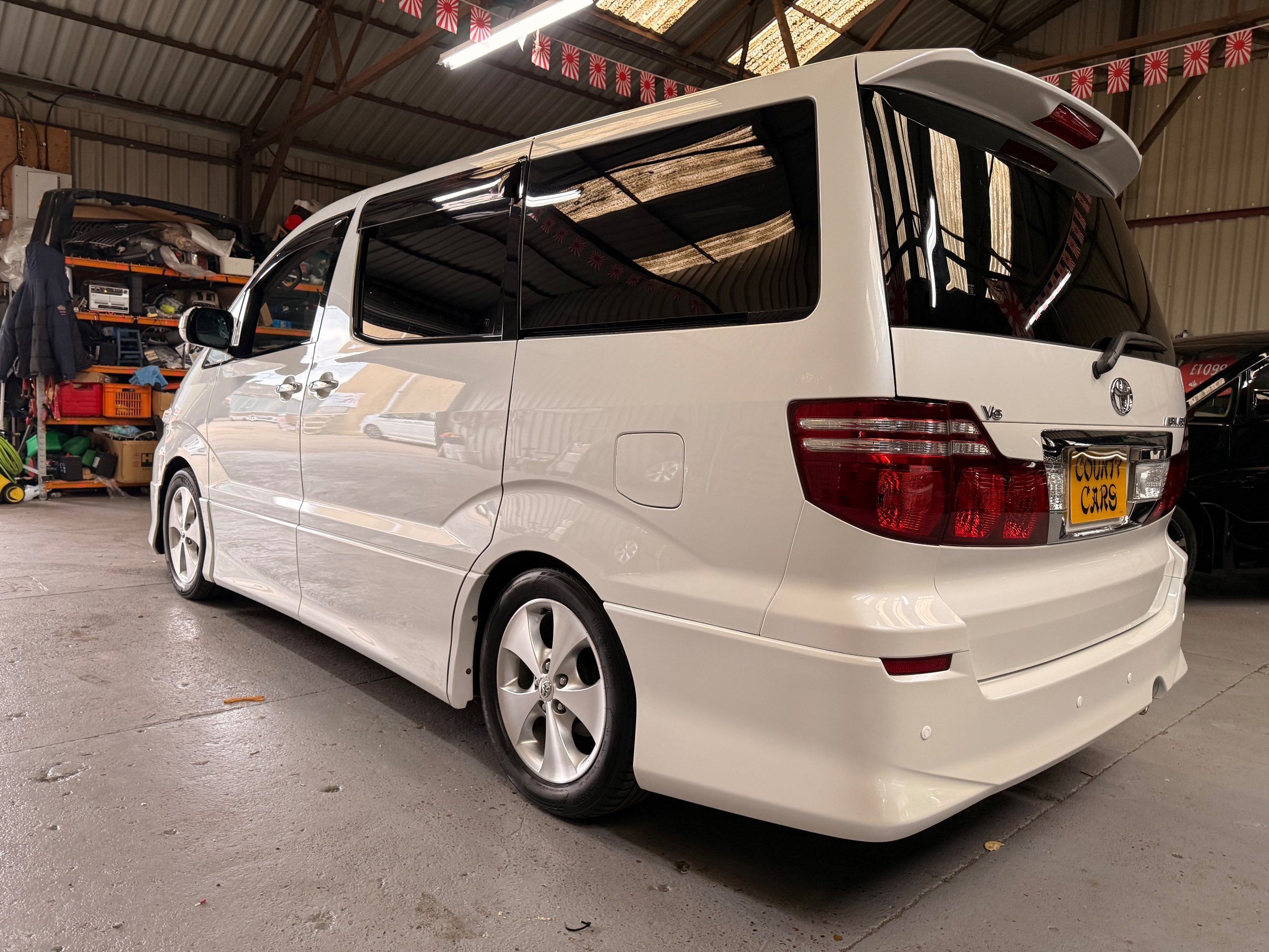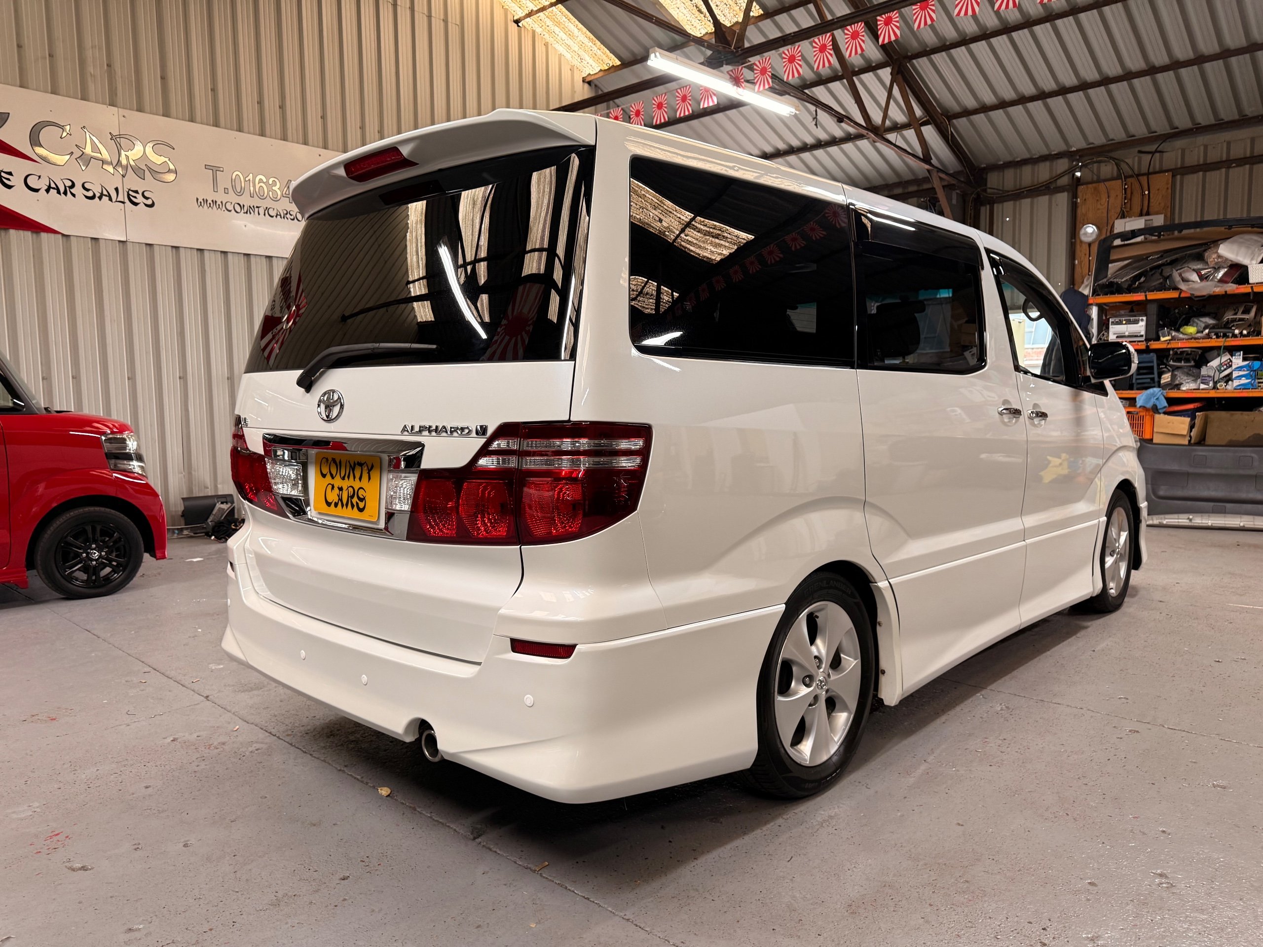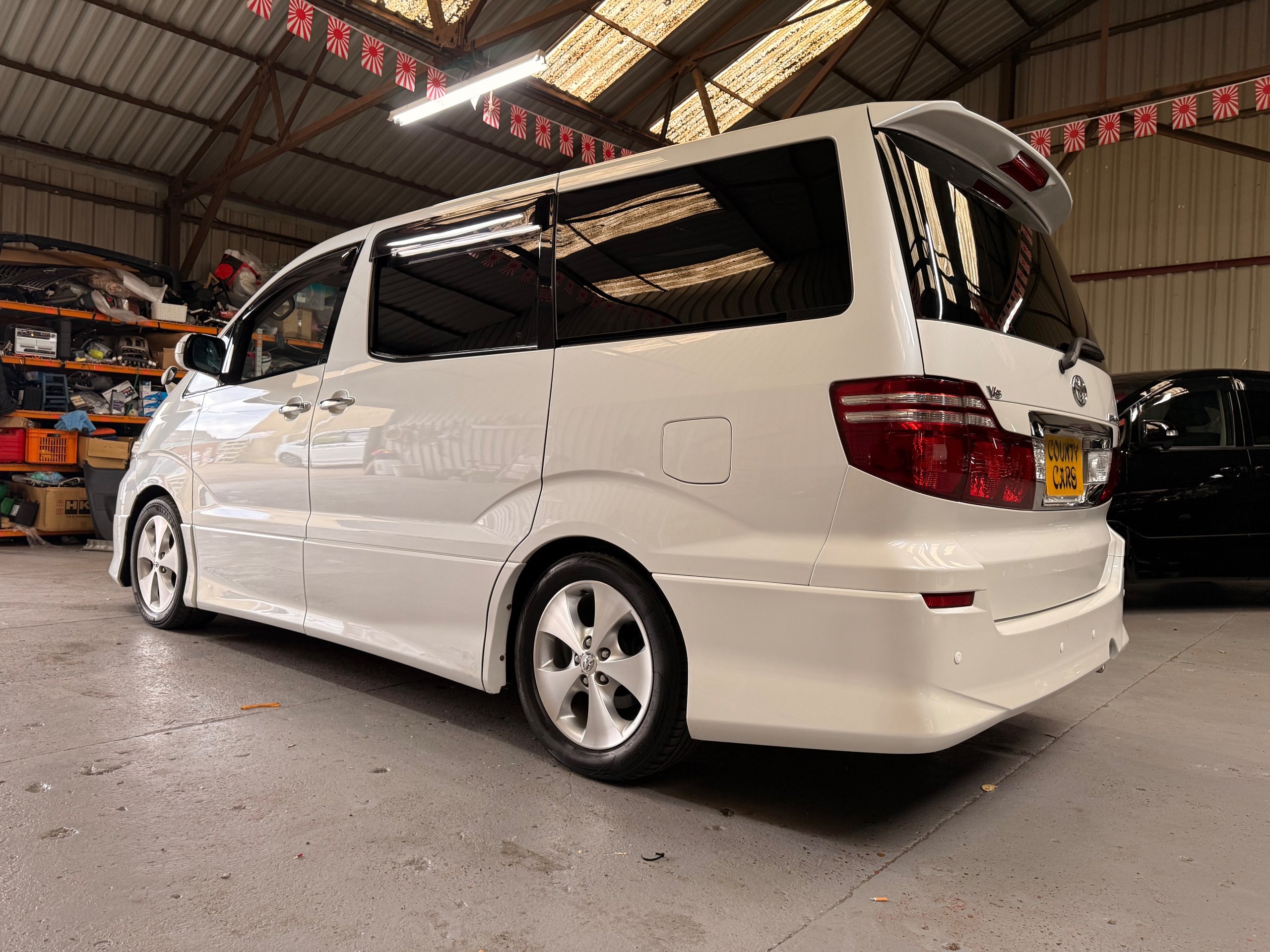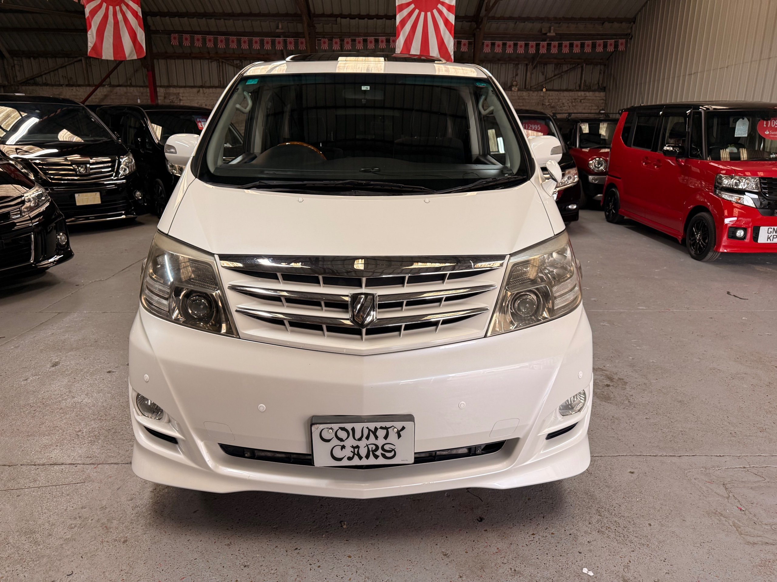 Toyota Alphard 3.0 V6 Platinum Selection ll Auto, 2008-08-Reg, Finished in Pearlescent White Paintwork, Unmarked Genuine 17" Polished Toyota Alloys, Front spots Fold away wing mirrors, Full privacy glass, Twin Sunroofs, Rear Electric Sunroof, Twin Electric soft closing sliding doors, Electric Tailgate, Front and Rear Parking Sensors, 8 Seater, 8 Unblemished Black Alcantara Seats, The front seats have armrests, centre console with a flip up tray, The centre seats have armrests/centre armrest with cup holders, The centre seats also folds down to display two tables with cup holders, The seats are also fully rotational, The rear seats fold to the side to give way to a huge loading space, Front and Rear Parking Sensors, front and rear Air-Con and climate control, Front and rear Electric windows, Ambient Lighting, Isofix Points, U.K Stereo with colour reversing camera, Rear monitor linked to the front DVD. UK Speedo conversion, Only covered a Genuine 68,000 with all the Genuine paperwork from Japan including the Export certificate and Auction sheet to prove the mileage and condition before it left Japan Nationwide Delivery Service Available