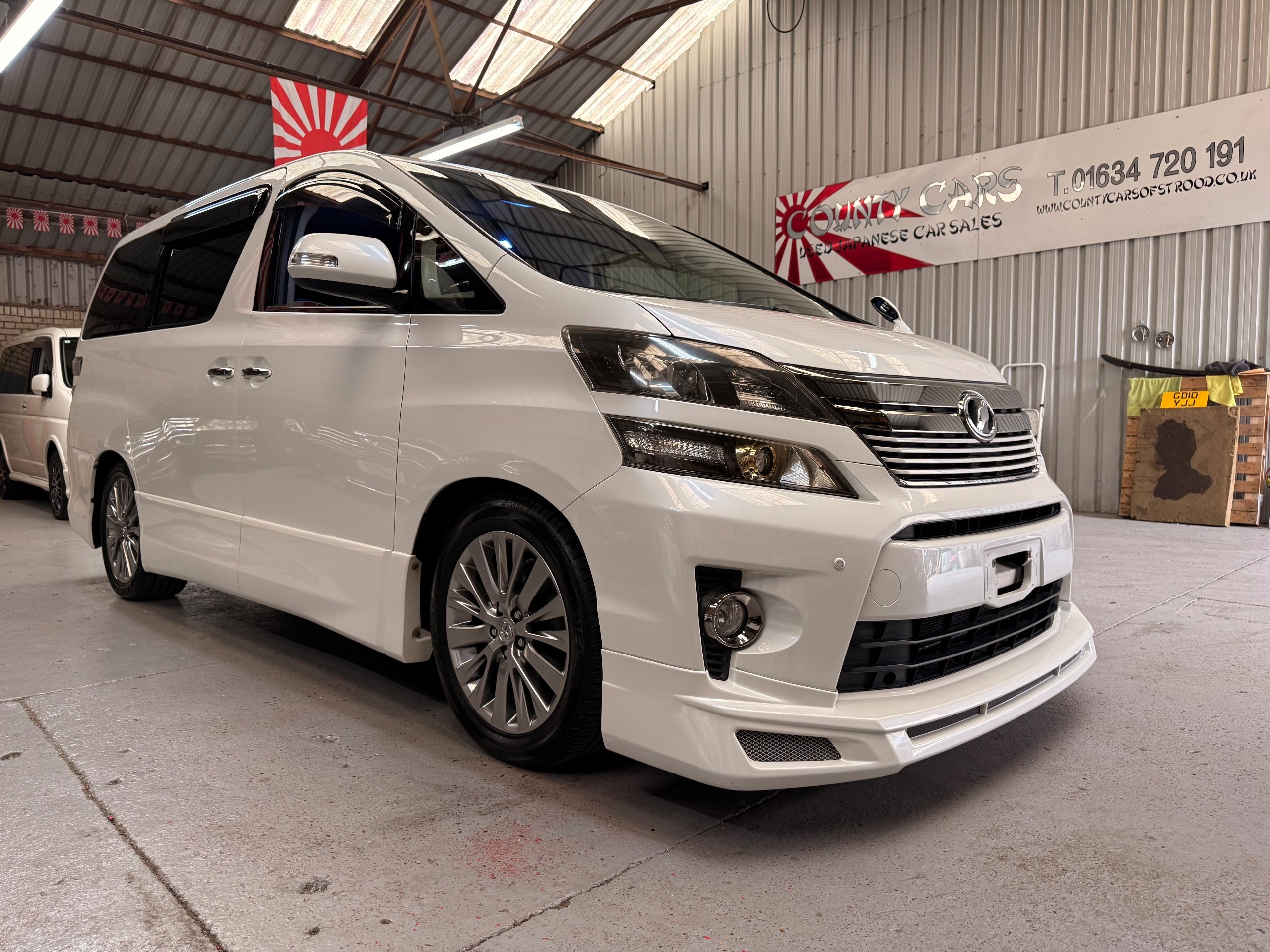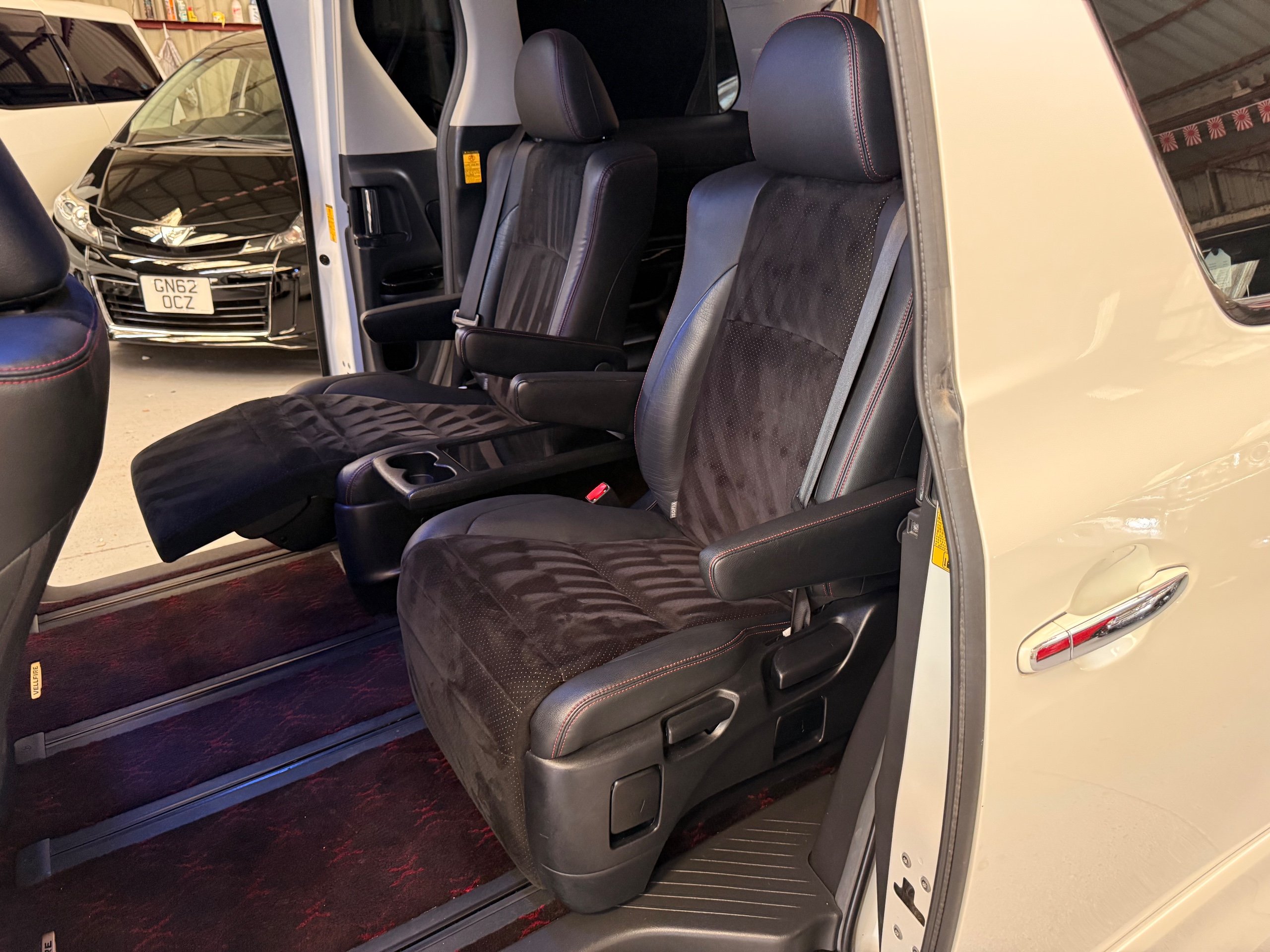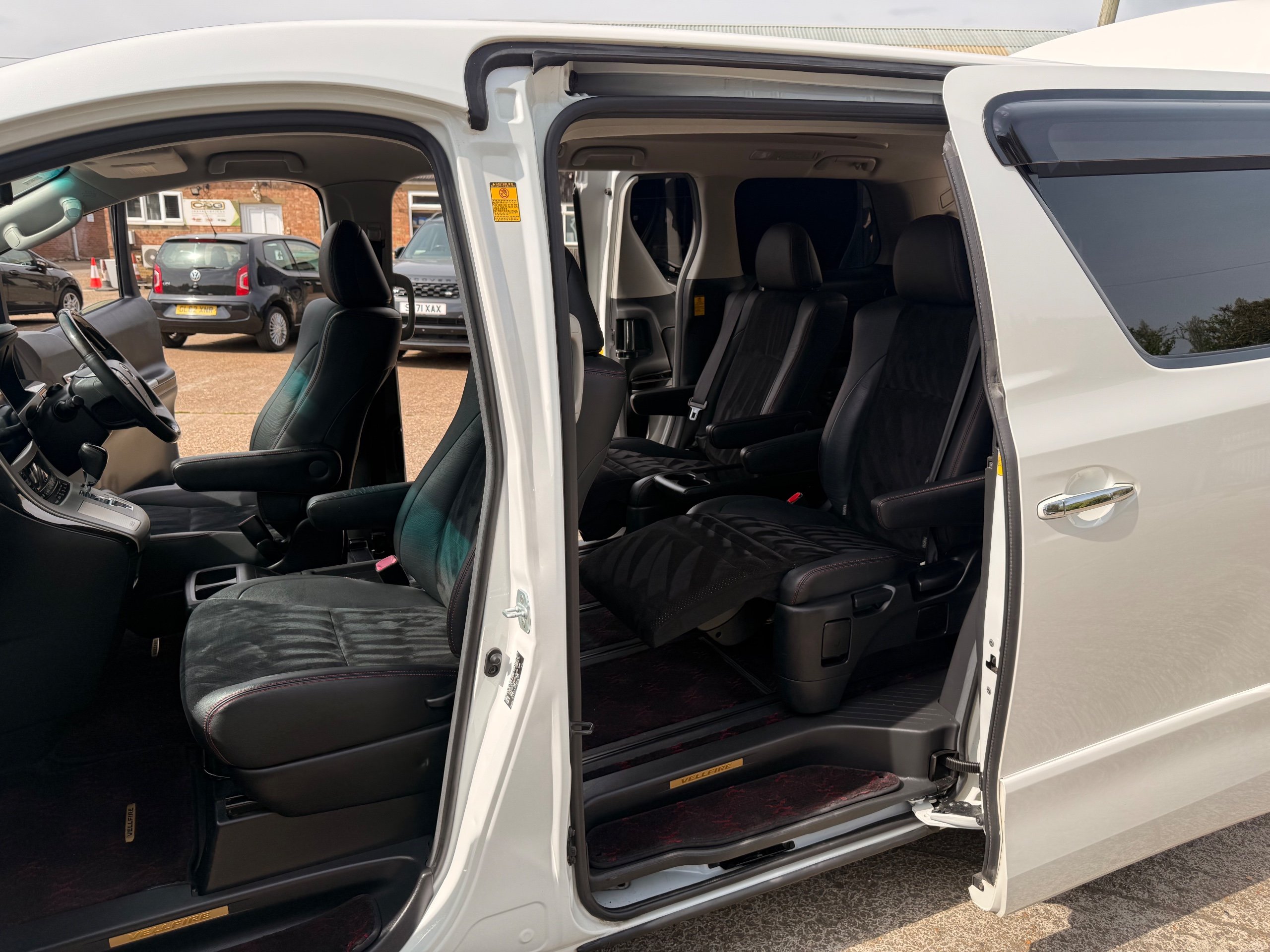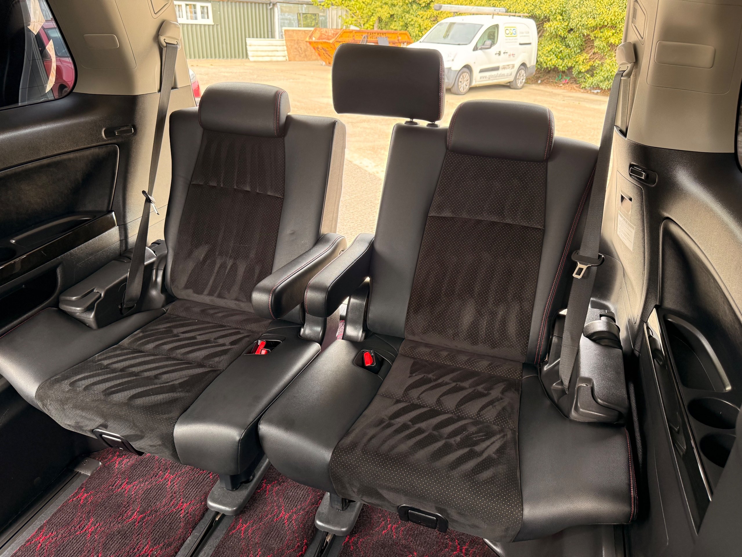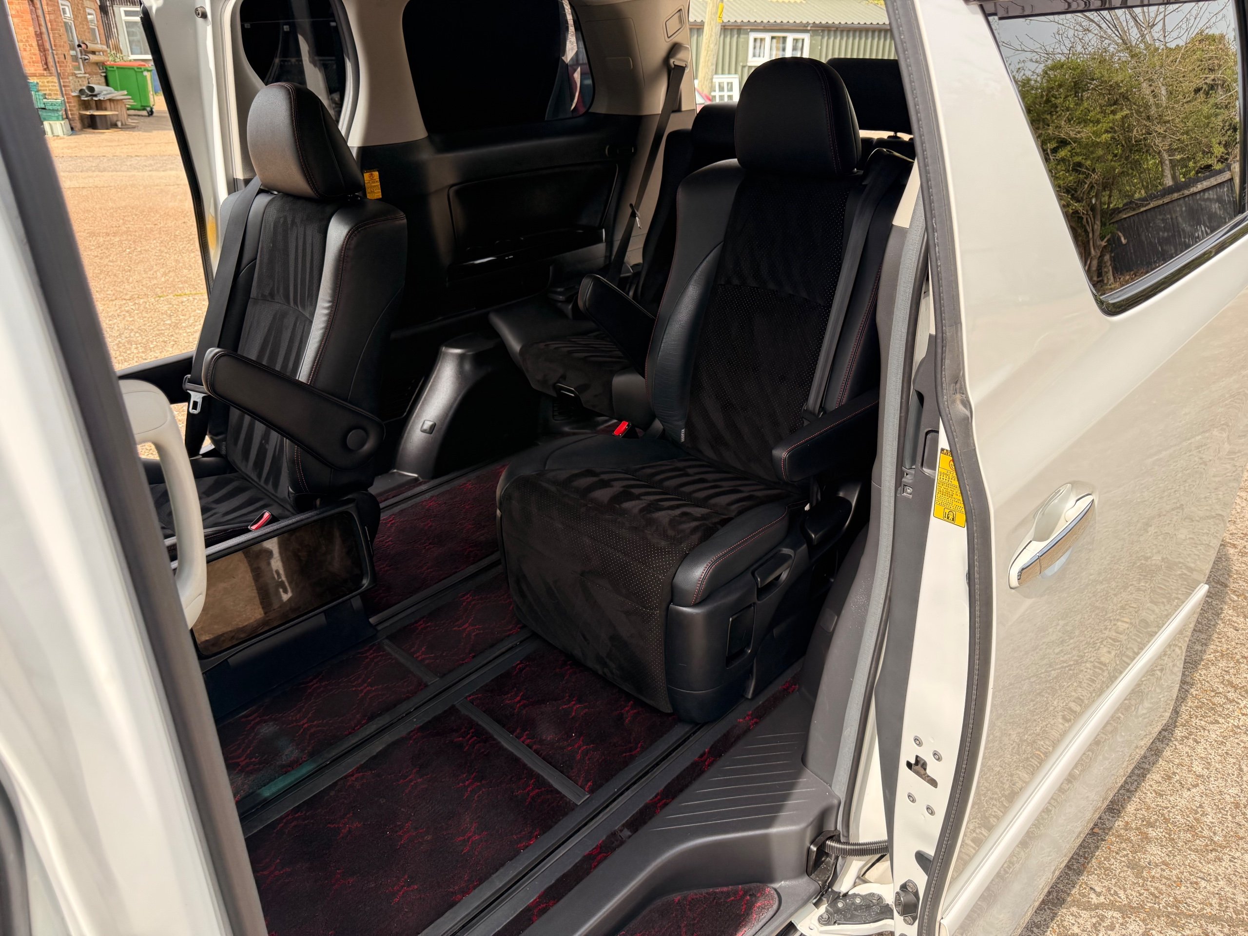 2012 Toyota Vellfire 2.4Z GOLDEN EYES EDITION 2012-62-Reg, Face-lift Edition, Finished in Stunning Pearlescent White paintwork, Twin Electric Soft Closing Sliding Doors, Electric Soft closing Tailgate, Front spots With chrome surrounds, Front Lip, Full Privacy Glass, Rear Spoiler with built in brake light, Unmarked Genuine 18” Golden Eyes dark silver Alloys, Key-less Entry, Key-less start, Golden headlight surround, 7 Seater 7 Unblemished Half leather seats with red stitching, The Front Seats have armrests, Centre console with flip up cup holders, The centre seats are Lounge style seats with extra leg rests and twin armrests on each seat, The seats also slide forwards and backwards and side to side with a folding centre table with built in cup holders, easy access to the rear seats, Isofix centre seats, The rear seats fold away to give way to a large boot, Strip L.E.D lighting, Ambient lighting, Push button Start, Front and Rear parking sensors, Traction Control, Front and Rear Electric windows, Colour reversing camera, Isofix points, Stereo System with Apple CarPlay, Red and Black Golden eyes floor mats, Cruise Control, Only covered a Genuine 68,000 Miles With All the Genuine paperwork from Japan including the auction sheet and D-Reg form which both prove the mileage and condition before it left Japan