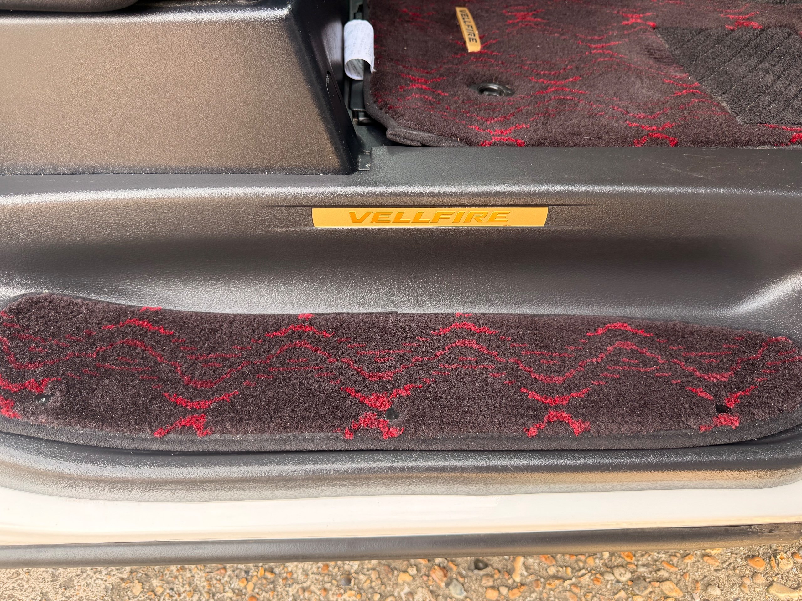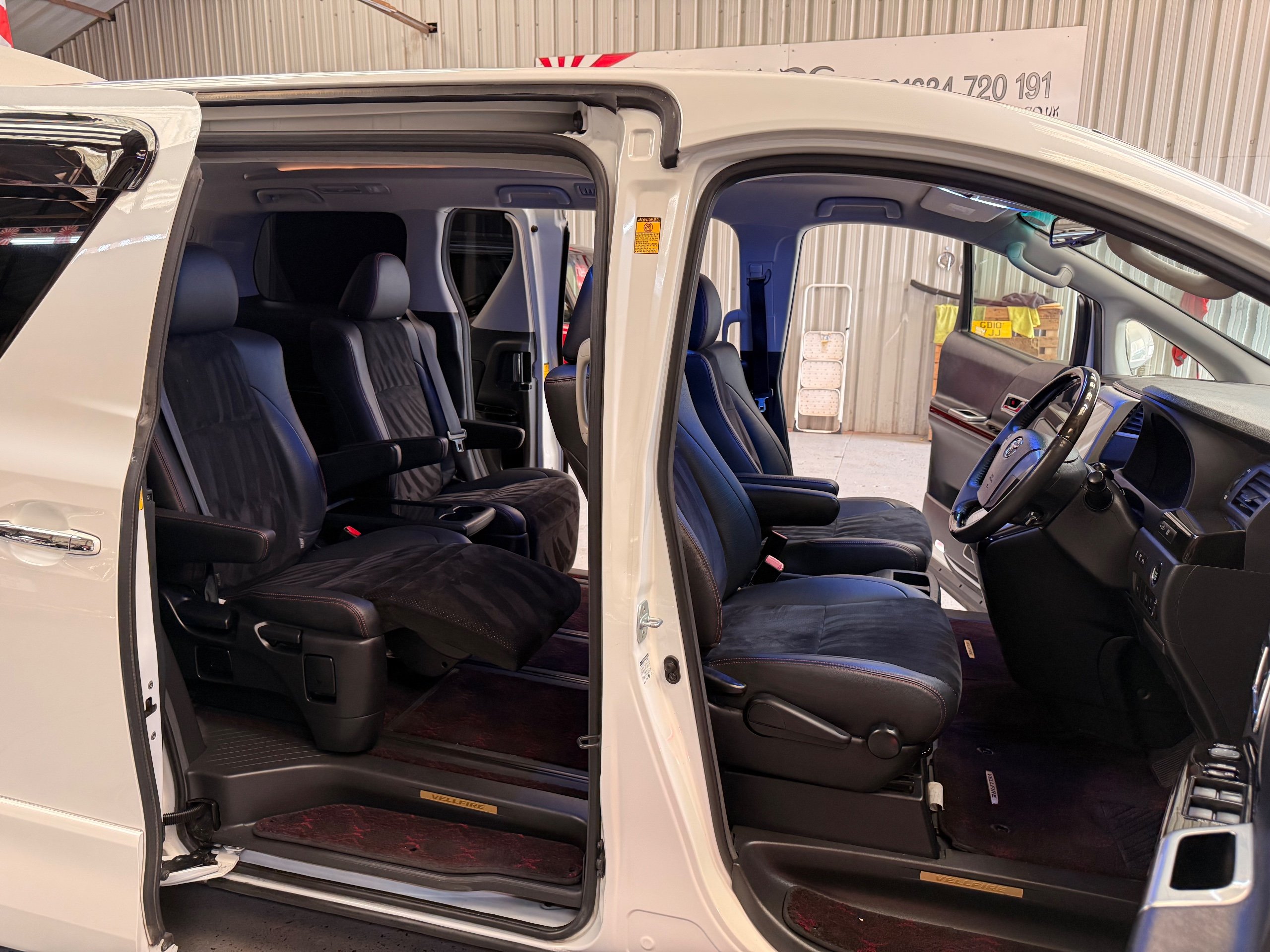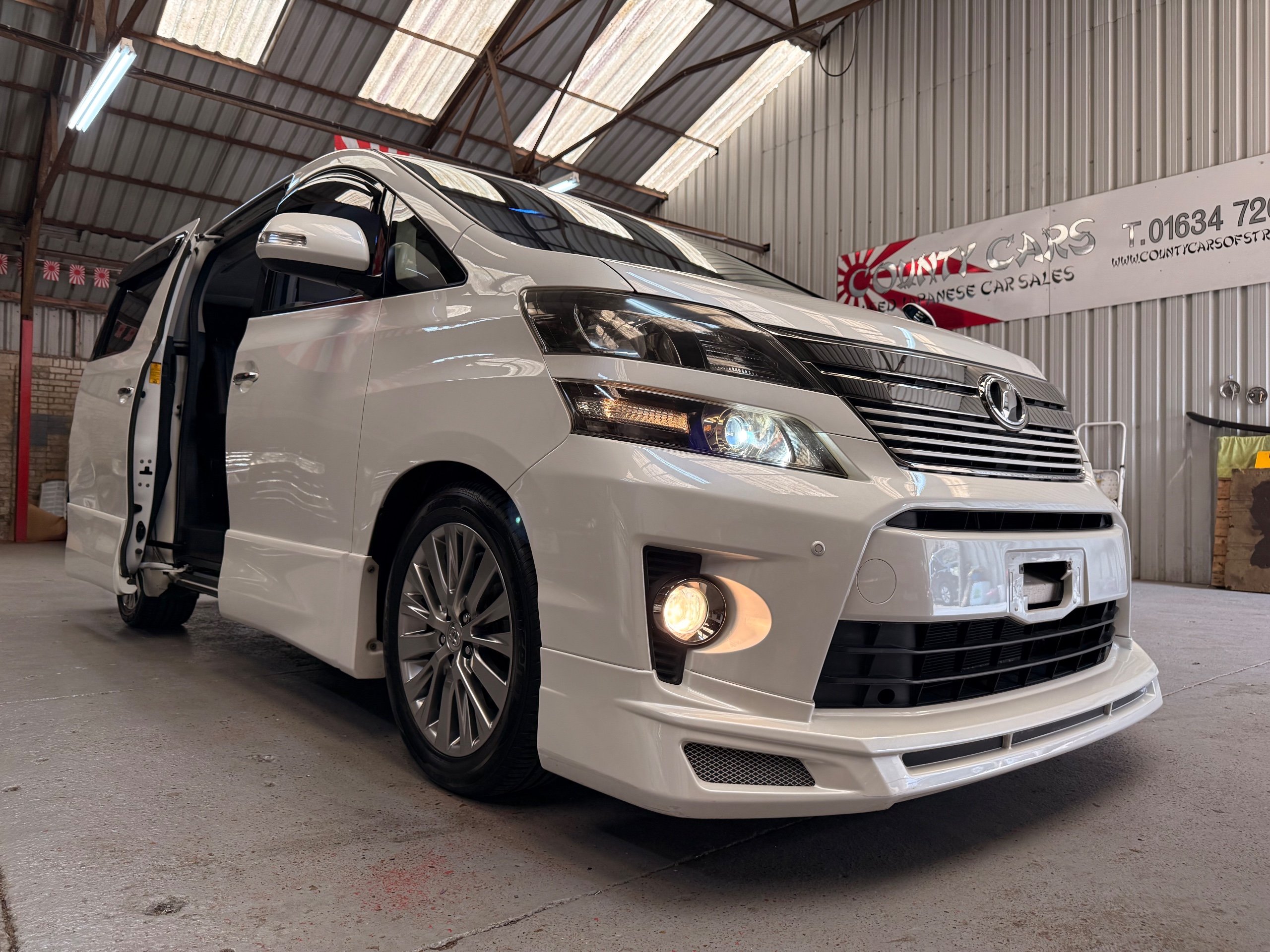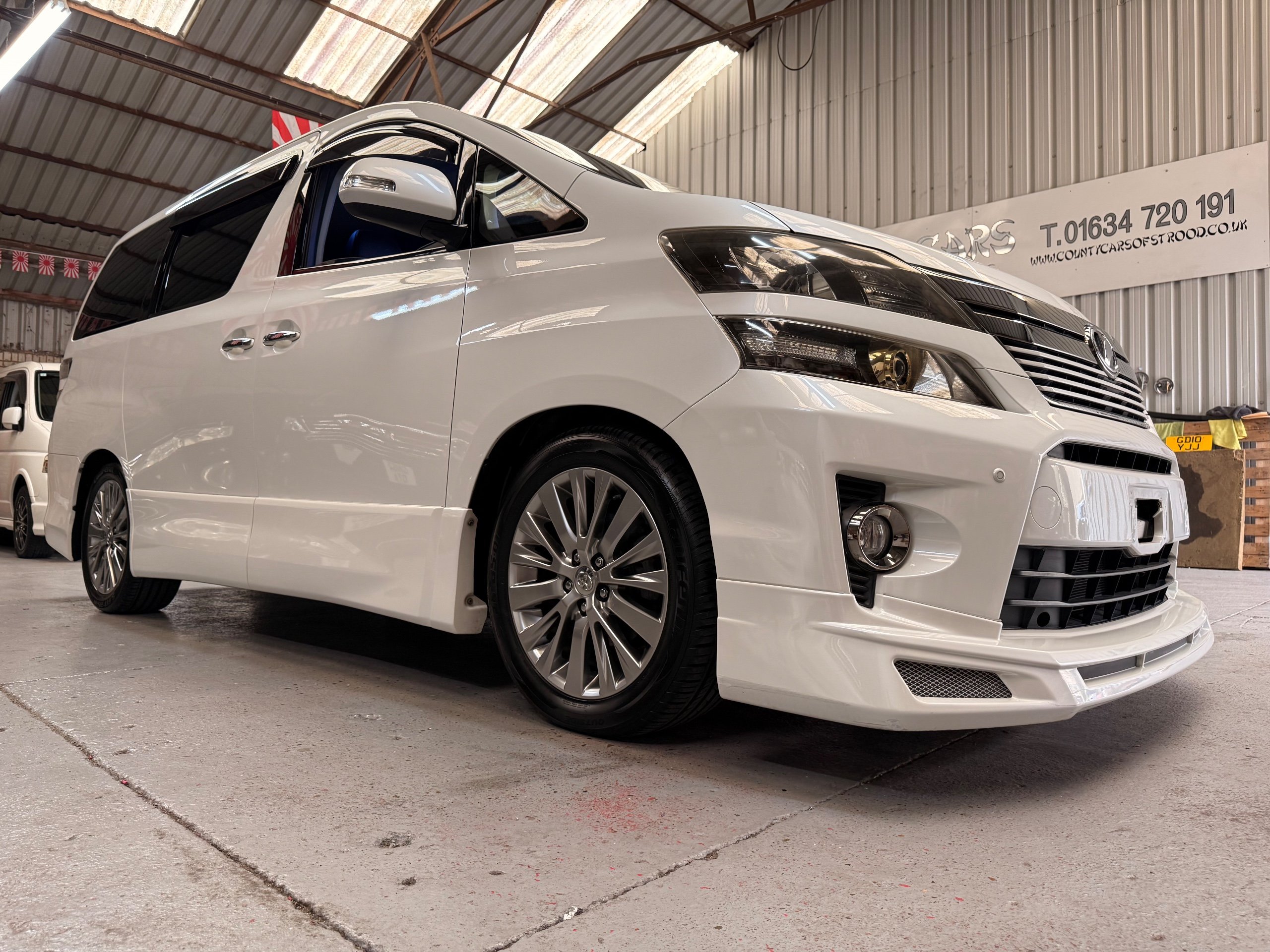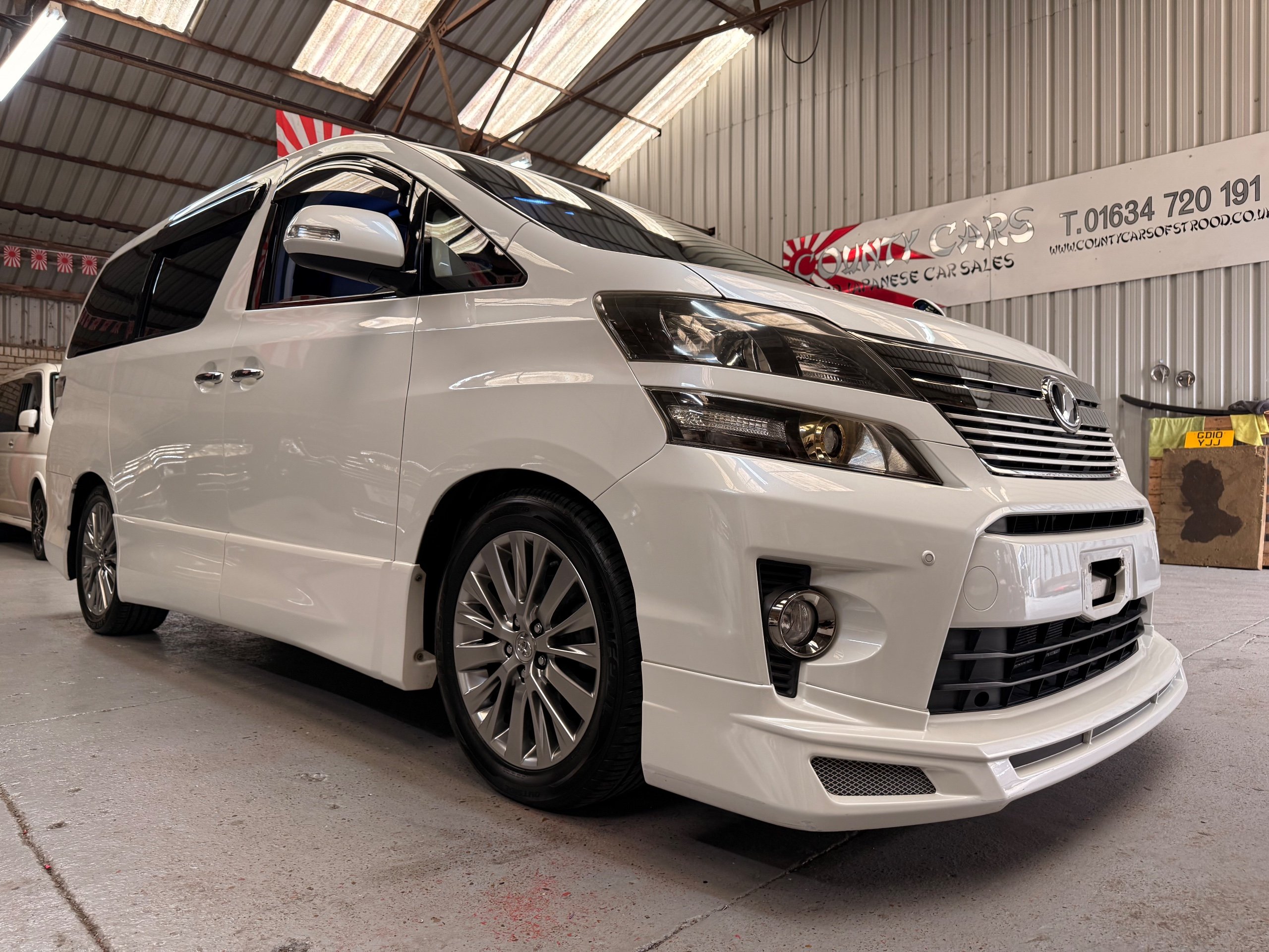 2012 Toyota Vellfire 2.4Z GOLDEN EYES EDITION 2012-62-Reg, Face-lift Edition, Finished in Stunning Pearlescent White paintwork, Twin Electric Soft Closing Sliding Doors, Electric Soft closing Tailgate, Front spots With chrome surrounds, Front Lip, Full Privacy Glass, Rear Spoiler with built in brake light, Unmarked Genuine 18” Golden Eyes dark silver Alloys, Key-less Entry, Key-less start, Golden headlight surround, 7 Seater 7 Unblemished Half leather seats with red stitching, The Front Seats have armrests, Centre console with flip up cup holders, The centre seats are Lounge style seats with extra leg rests and twin armrests on each seat, The seats also slide forwards and backwards and side to side with a folding centre table with built in cup holders, easy access to the rear seats, Isofix centre seats, The rear seats fold away to give way to a large boot, Strip L.E.D lighting, Ambient lighting, Push button Start, Front and Rear parking sensors, Traction Control, Front and Rear Electric windows, Colour reversing camera, Isofix points, Stereo System with Apple CarPlay, Red and Black Golden eyes floor mats, Cruise Control, Only covered a Genuine 68,000 Miles With All the Genuine paperwork from Japan including the auction sheet and D-Reg form which both prove the mileage and condition before it left Japan