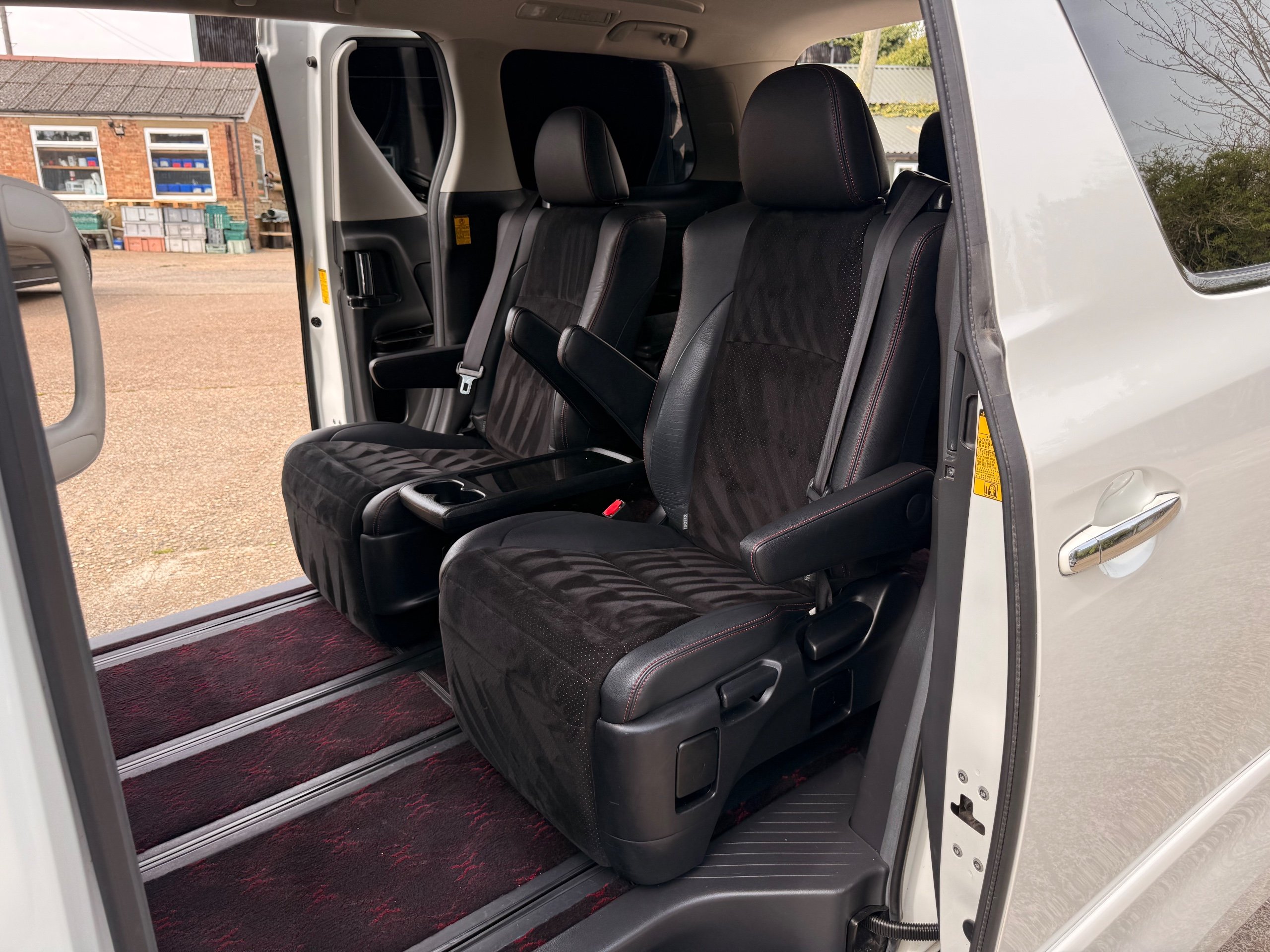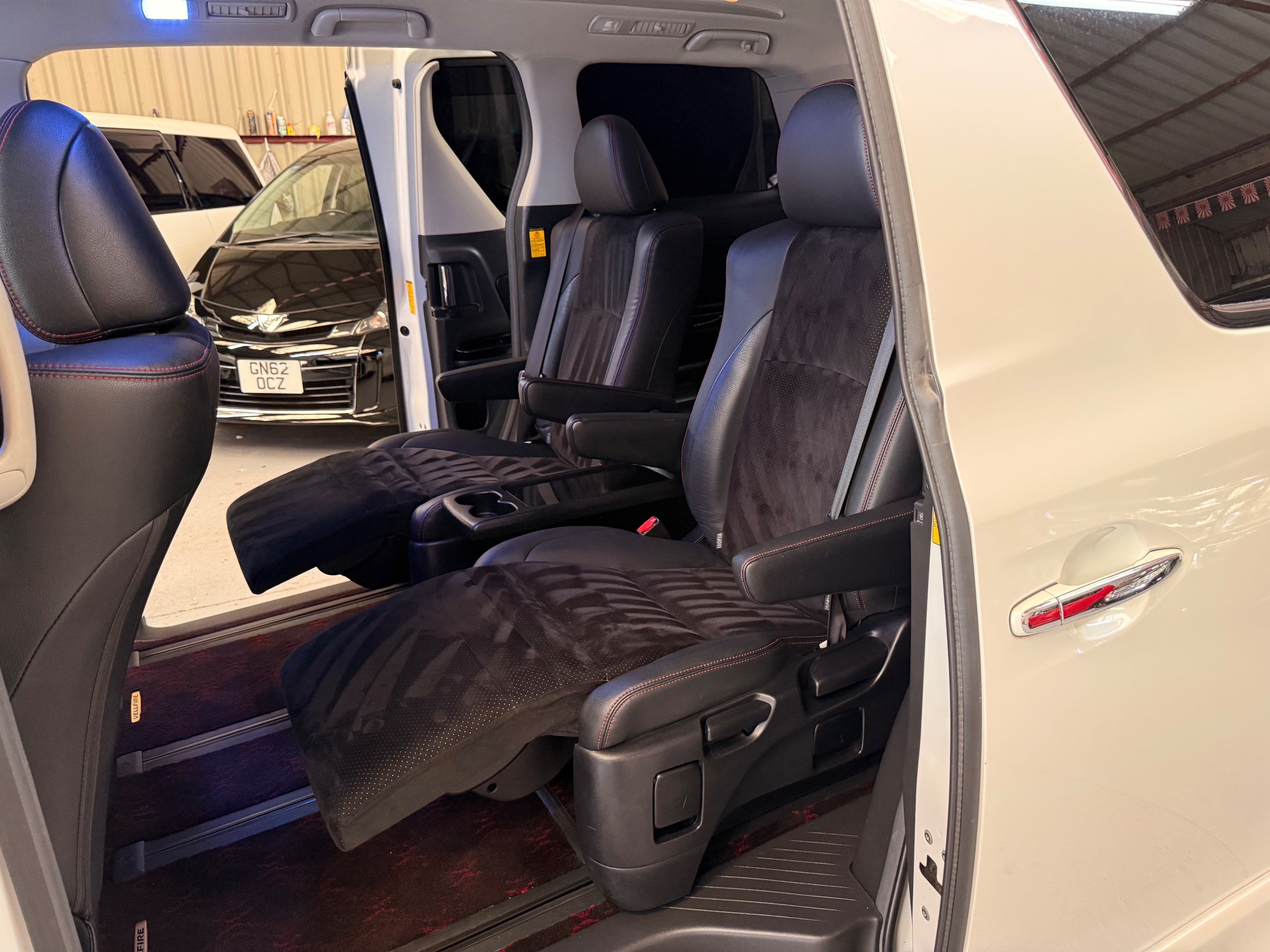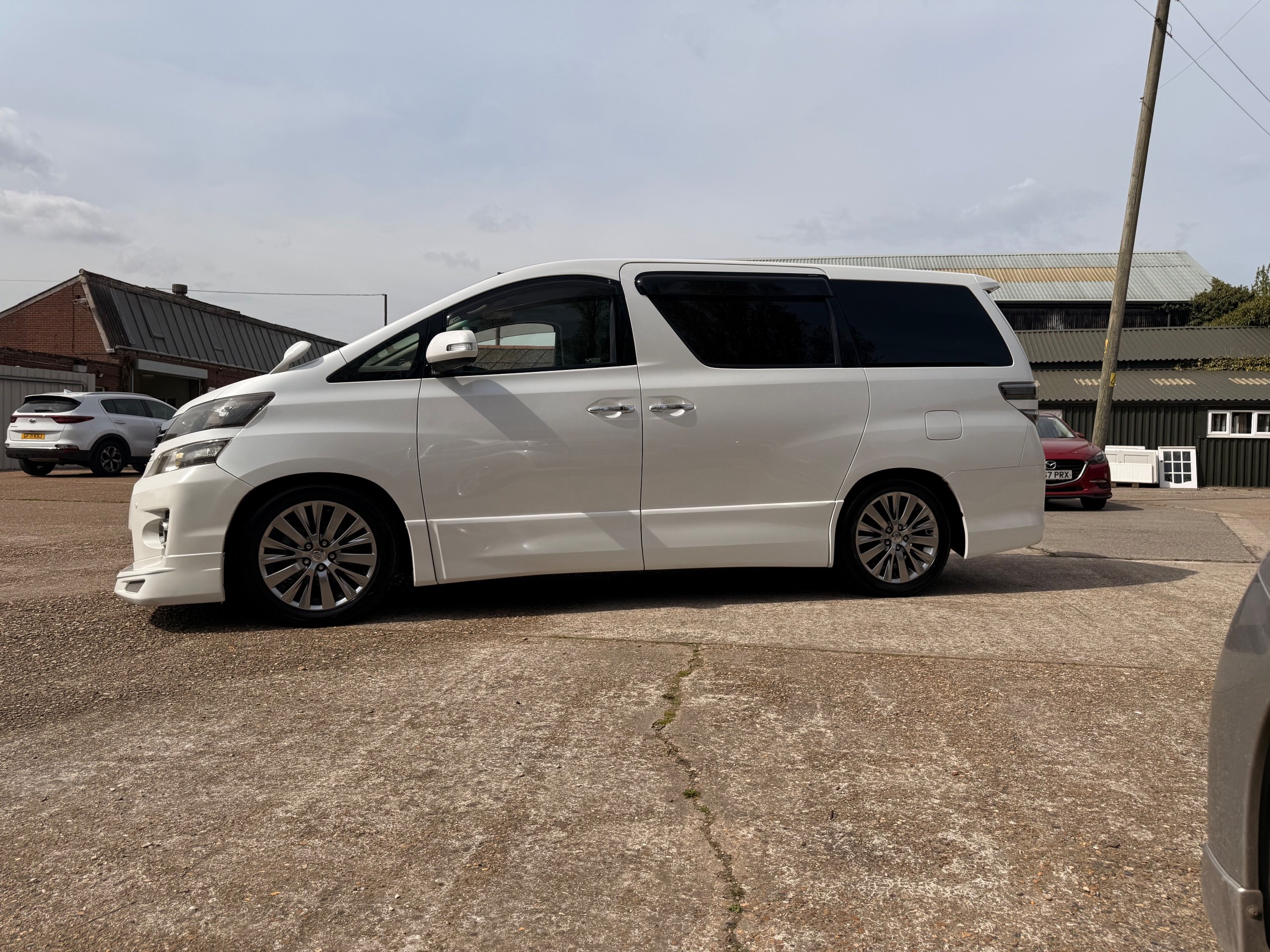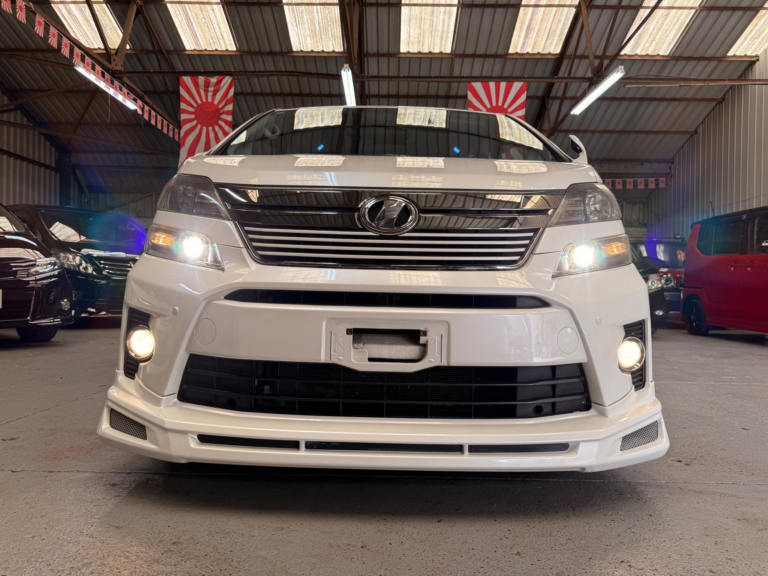 2012 Toyota Vellfire 2.4Z GOLDEN EYES EDITION 2012-62-Reg, Face-lift Edition, Finished in Stunning Pearlescent White paintwork, Twin Electric Soft Closing Sliding Doors, Electric Soft closing Tailgate, Front spots With chrome surrounds, Front Lip, Full Privacy Glass, Rear Spoiler with built in brake light, Unmarked Genuine 18” Golden Eyes dark silver Alloys, Key-less Entry, Key-less start, Golden headlight surround, 7 Seater 7 Unblemished Half leather seats with red stitching, The Front Seats have armrests, Centre console with flip up cup holders, The centre seats are Lounge style seats with extra leg rests and twin armrests on each seat, The seats also slide forwards and backwards and side to side with a folding centre table with built in cup holders, easy access to the rear seats, Isofix centre seats, The rear seats fold away to give way to a large boot, Strip L.E.D lighting, Ambient lighting, Push button Start, Front and Rear parking sensors, Traction Control, Front and Rear Electric windows, Colour reversing camera, Isofix points, Stereo System with Apple CarPlay, Red and Black Golden eyes floor mats, Cruise Control, Only covered a Genuine 68,000 Miles With All the Genuine paperwork from Japan including the auction sheet and D-Reg form which both prove the mileage and condition before it left Japan