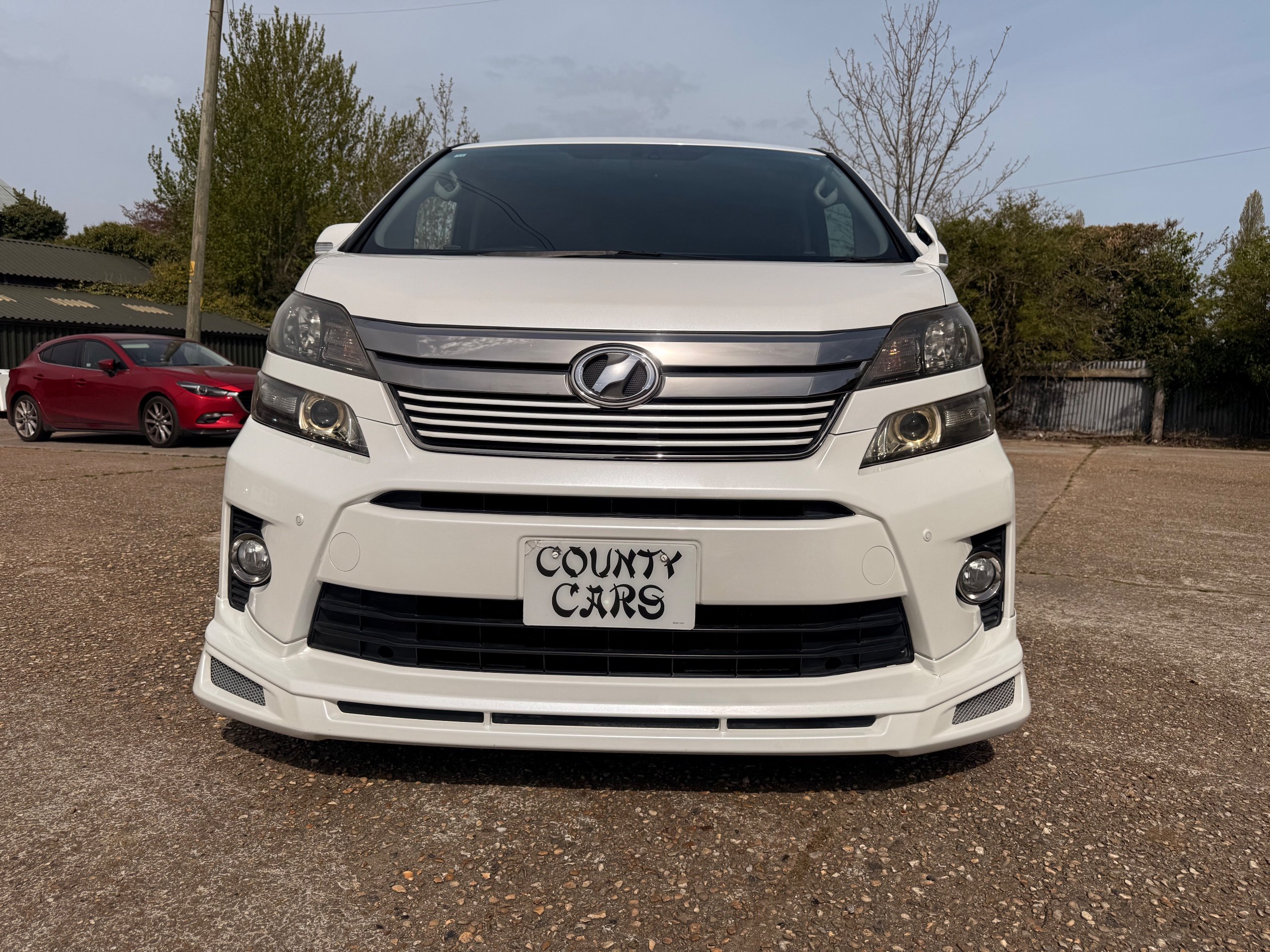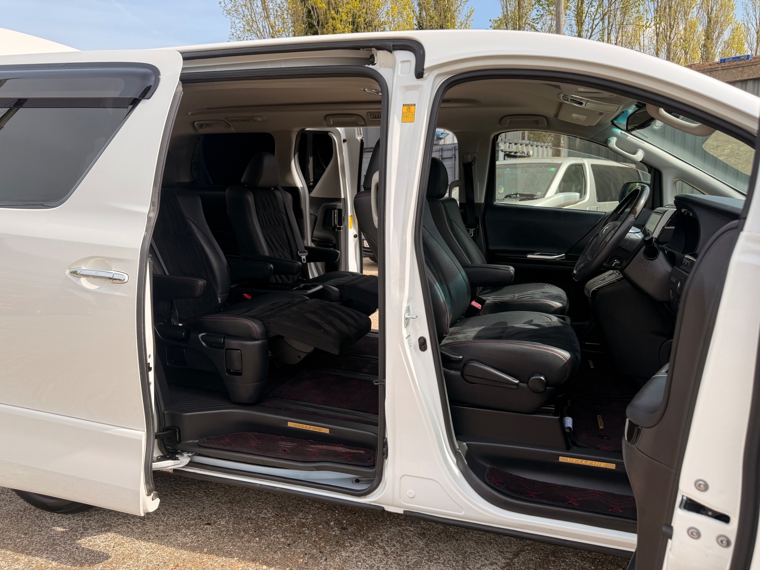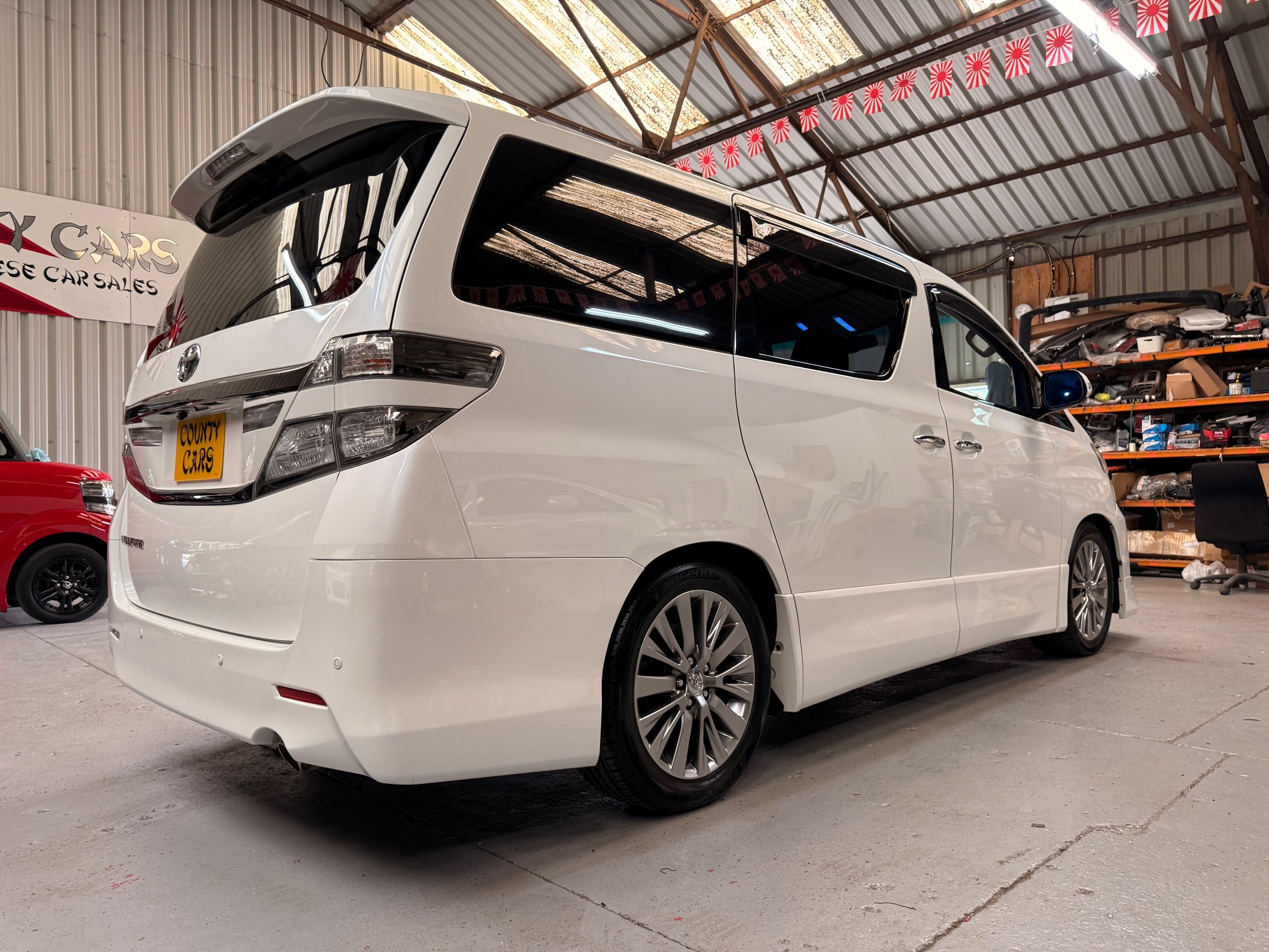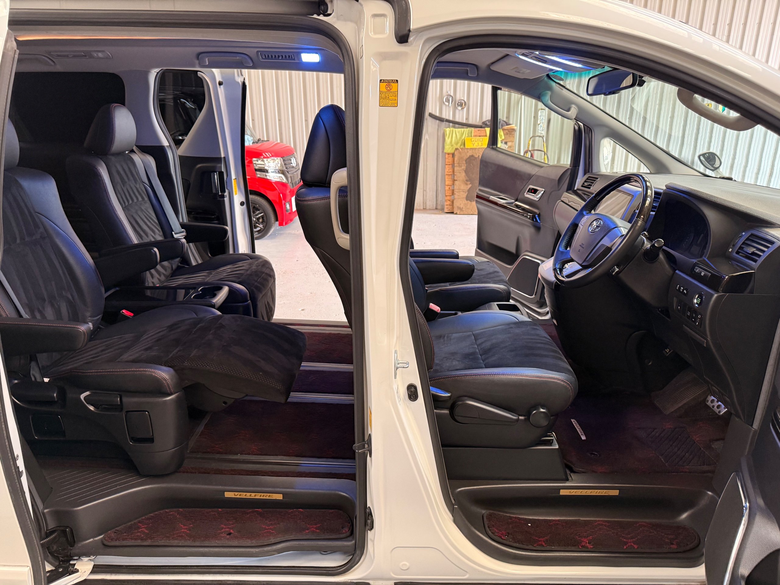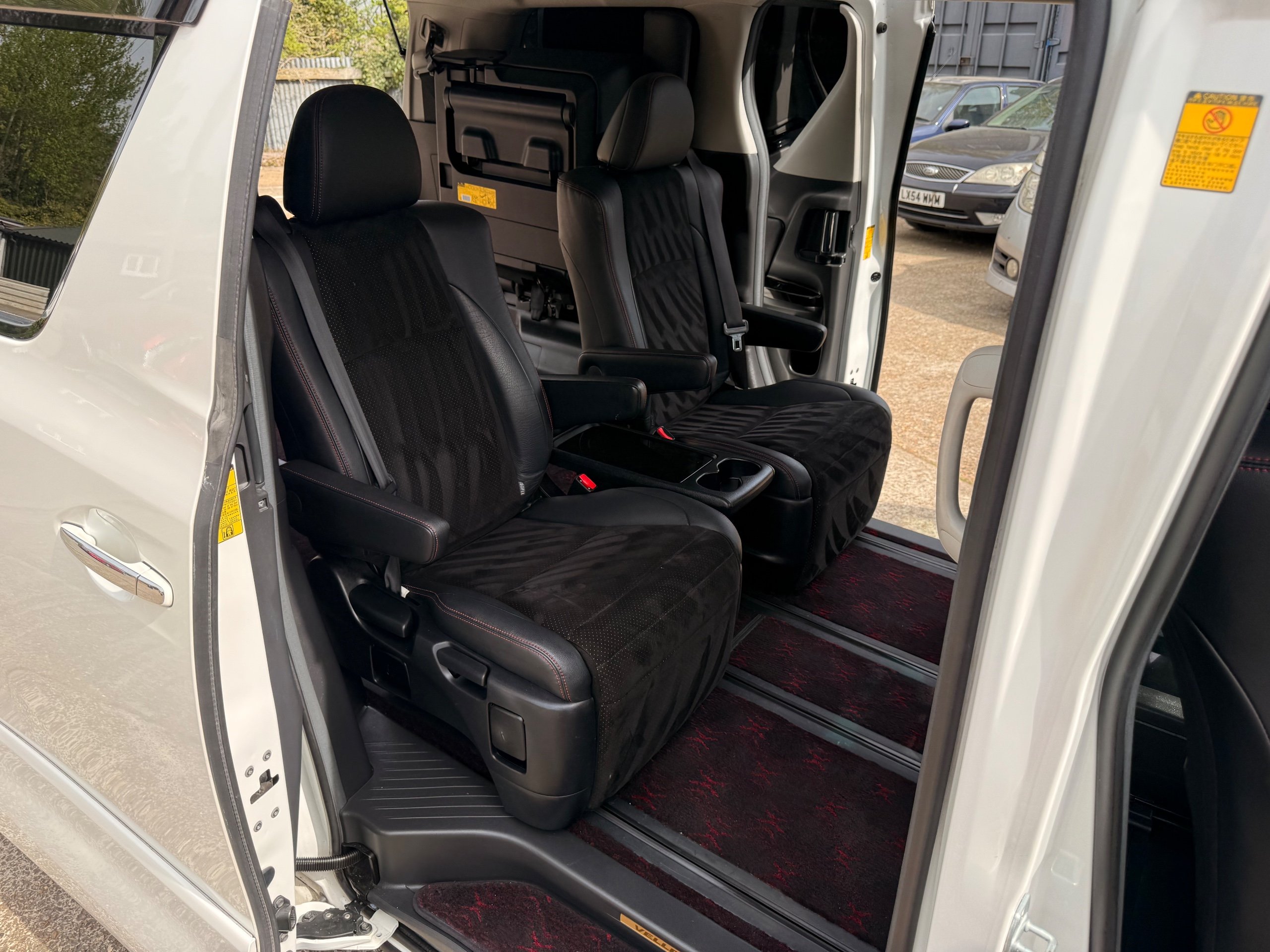 2012 Toyota Vellfire 2.4Z GOLDEN EYES EDITION 2012-62-Reg, Face-lift Edition, Finished in Stunning Pearlescent White paintwork, Twin Electric Soft Closing Sliding Doors, Electric Soft closing Tailgate, Front spots With chrome surrounds, Front Lip, Full Privacy Glass, Rear Spoiler with built in brake light, Unmarked Genuine 18” Golden Eyes dark silver Alloys, Key-less Entry, Key-less start, Golden headlight surround, 7 Seater 7 Unblemished Half leather seats with red stitching, The Front Seats have armrests, Centre console with flip up cup holders, The centre seats are Lounge style seats with extra leg rests and twin armrests on each seat, The seats also slide forwards and backwards and side to side with a folding centre table with built in cup holders, easy access to the rear seats, Isofix centre seats, The rear seats fold away to give way to a large boot, Strip L.E.D lighting, Ambient lighting, Push button Start, Front and Rear parking sensors, Traction Control, Front and Rear Electric windows, Colour reversing camera, Isofix points, Stereo System with Apple CarPlay, Red and Black Golden eyes floor mats, Cruise Control, Only covered a Genuine 68,000 Miles With All the Genuine paperwork from Japan including the auction sheet and D-Reg form which both prove the mileage and condition before it left Japan