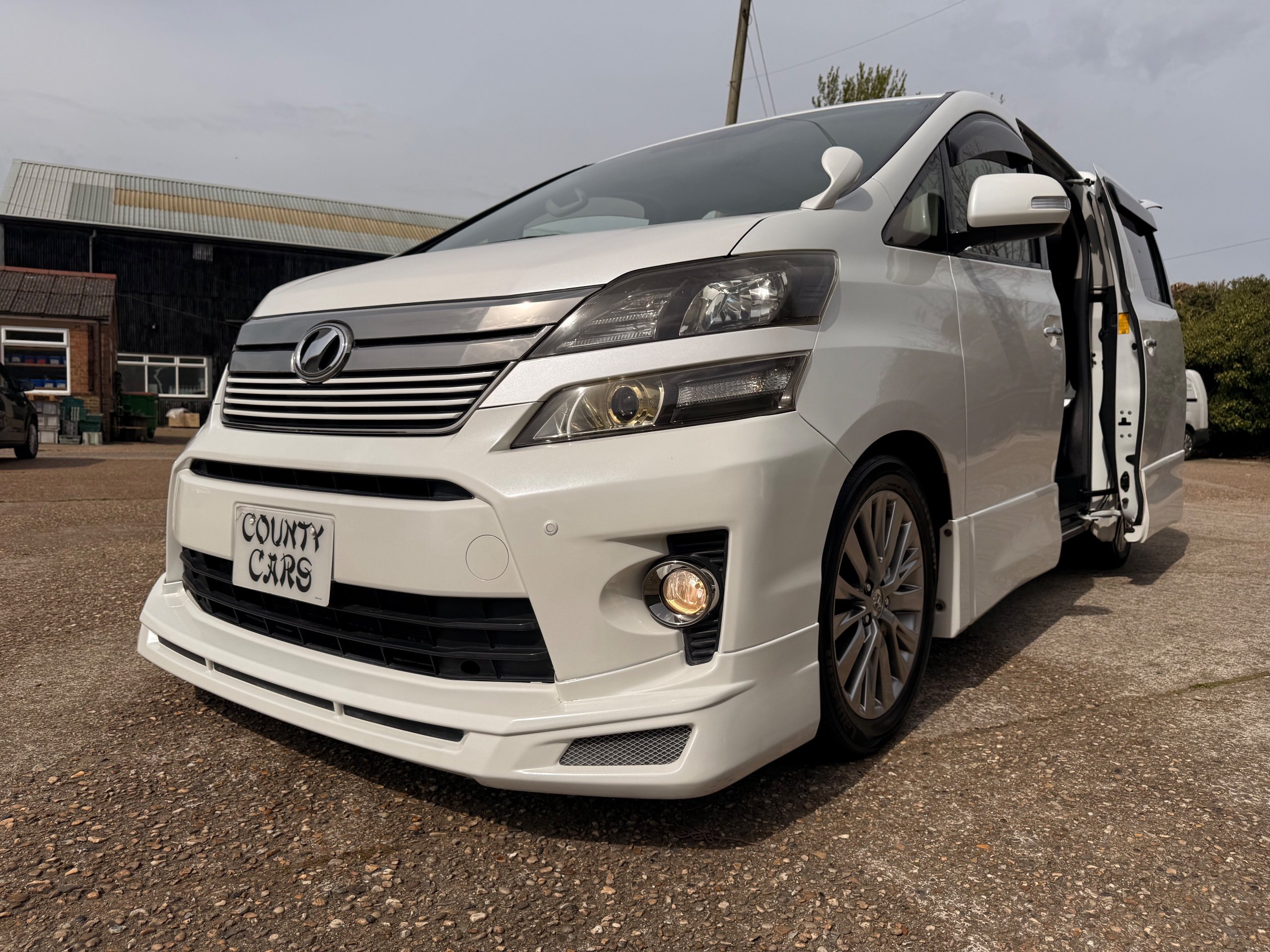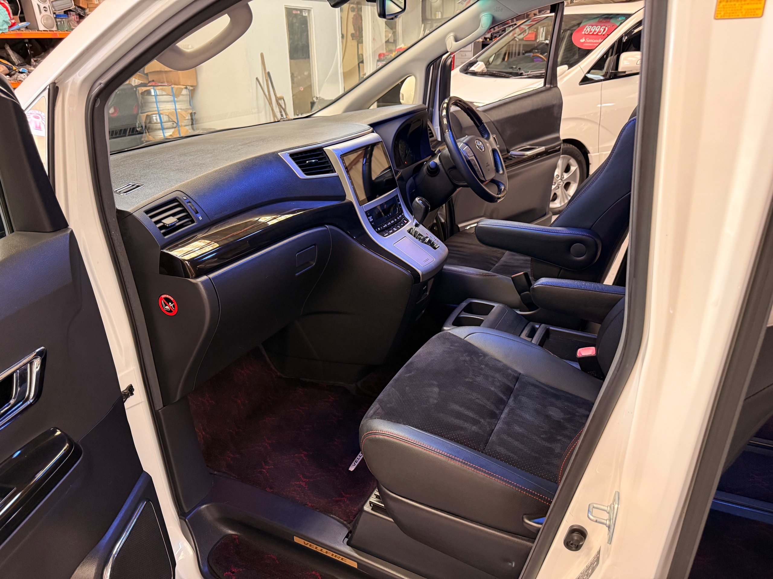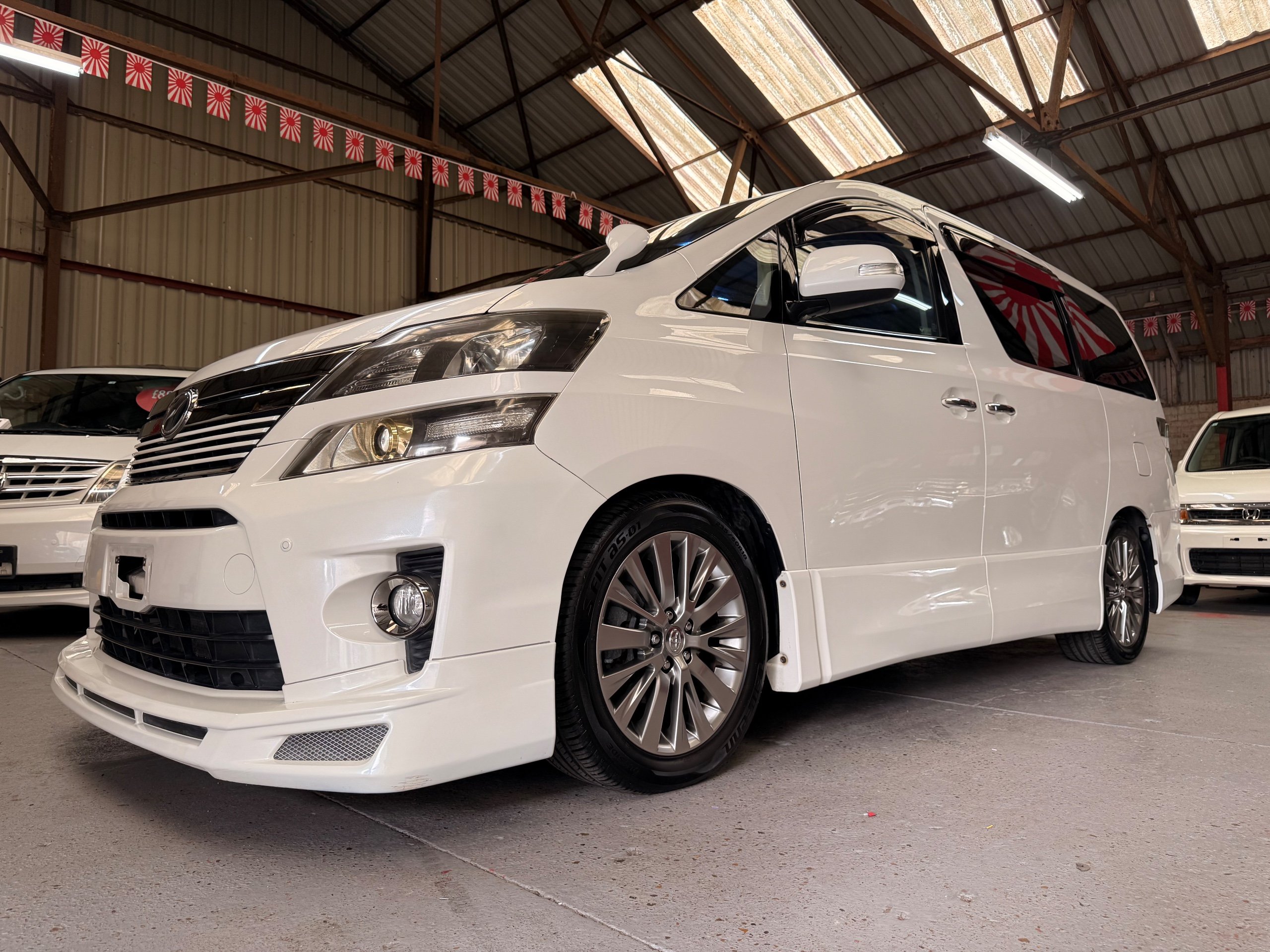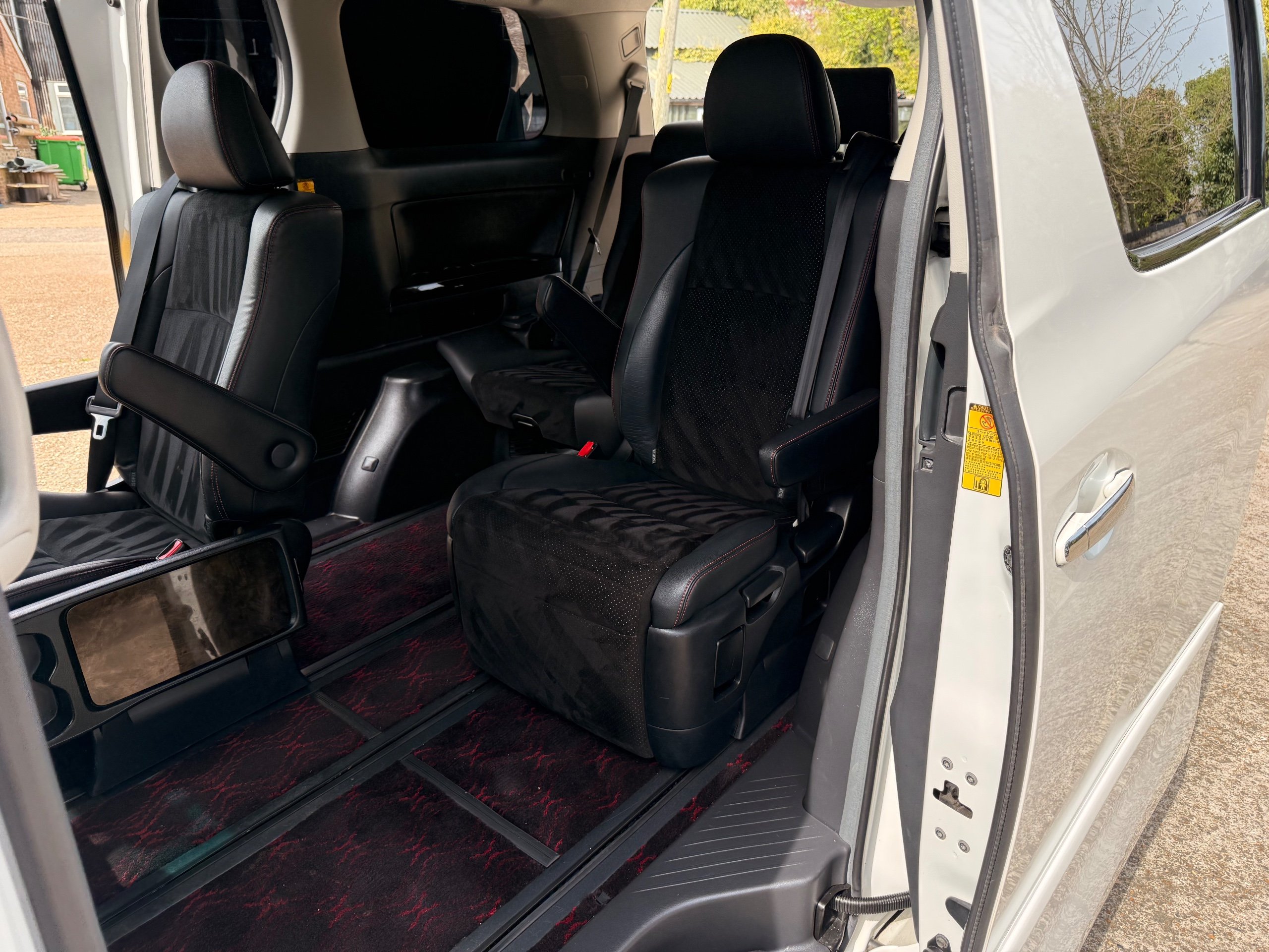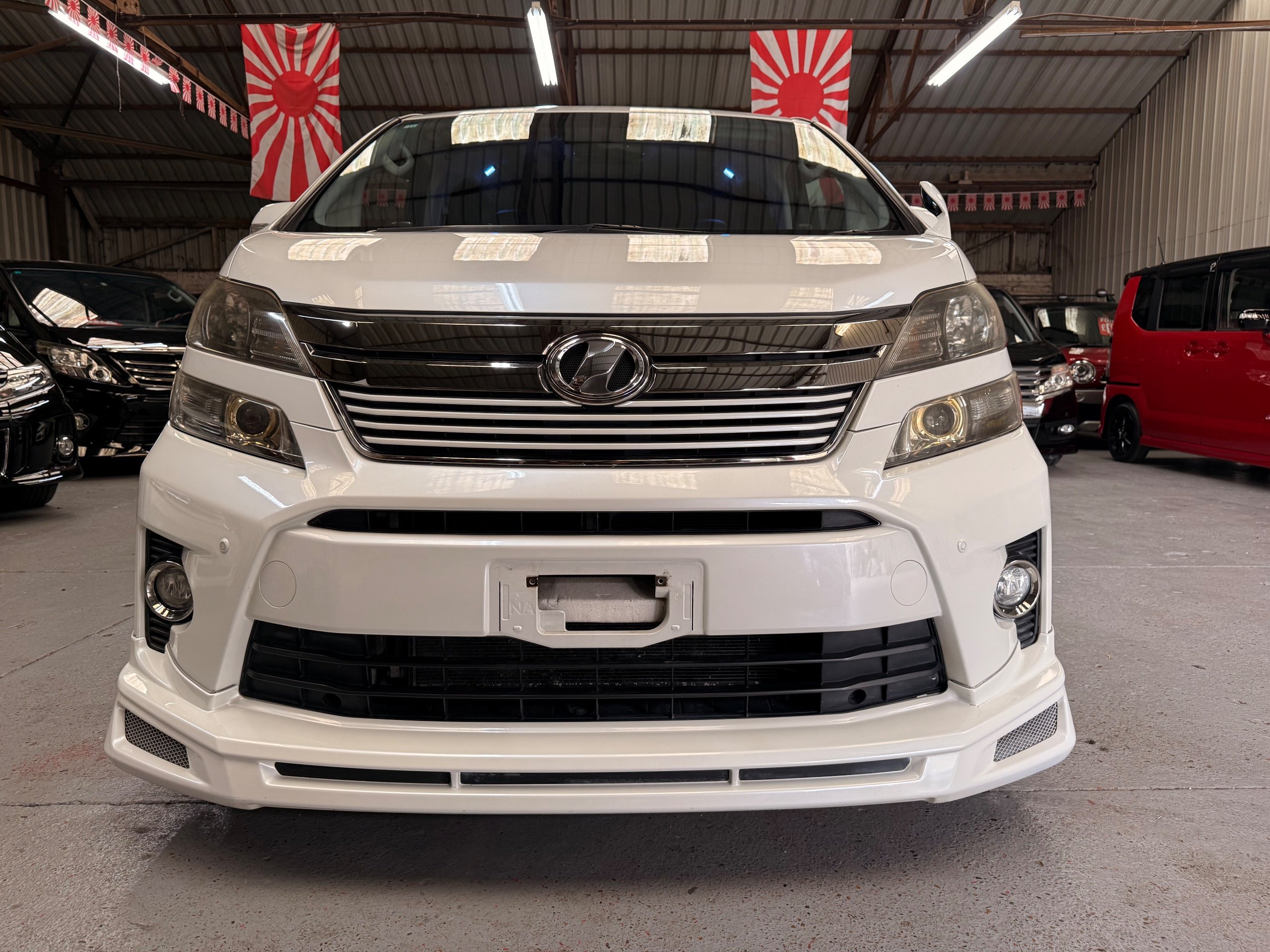 2012 Toyota Vellfire 2.4Z GOLDEN EYES EDITION 2012-62-Reg, Face-lift Edition, Finished in Stunning Pearlescent White paintwork, Twin Electric Soft Closing Sliding Doors, Electric Soft closing Tailgate, Front spots With chrome surrounds, Front Lip, Full Privacy Glass, Rear Spoiler with built in brake light, Unmarked Genuine 18” Golden Eyes dark silver Alloys, Key-less Entry, Key-less start, Golden headlight surround, 7 Seater 7 Unblemished Half leather seats with red stitching, The Front Seats have armrests, Centre console with flip up cup holders, The centre seats are Lounge style seats with extra leg rests and twin armrests on each seat, The seats also slide forwards and backwards and side to side with a folding centre table with built in cup holders, easy access to the rear seats, Isofix centre seats, The rear seats fold away to give way to a large boot, Strip L.E.D lighting, Ambient lighting, Push button Start, Front and Rear parking sensors, Traction Control, Front and Rear Electric windows, Colour reversing camera, Isofix points, Stereo System with Apple CarPlay, Red and Black Golden eyes floor mats, Cruise Control, Only covered a Genuine 68,000 Miles With All the Genuine paperwork from Japan including the auction sheet and D-Reg form which both prove the mileage and condition before it left Japan