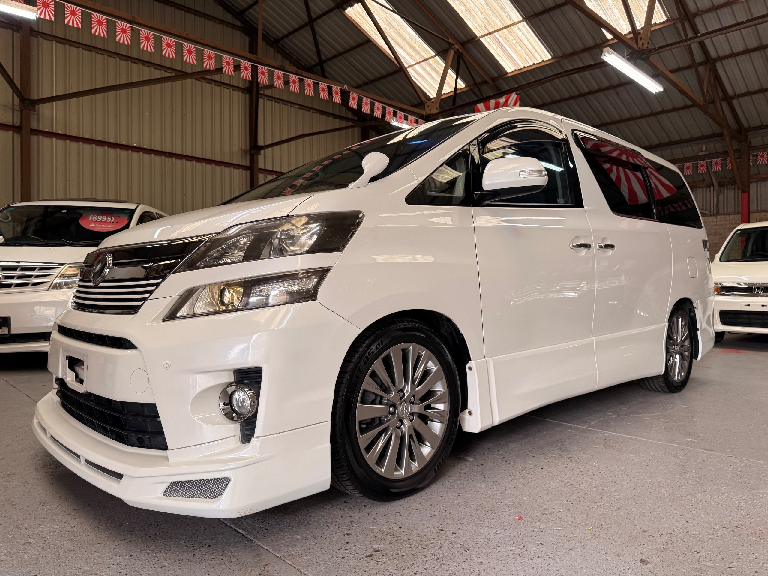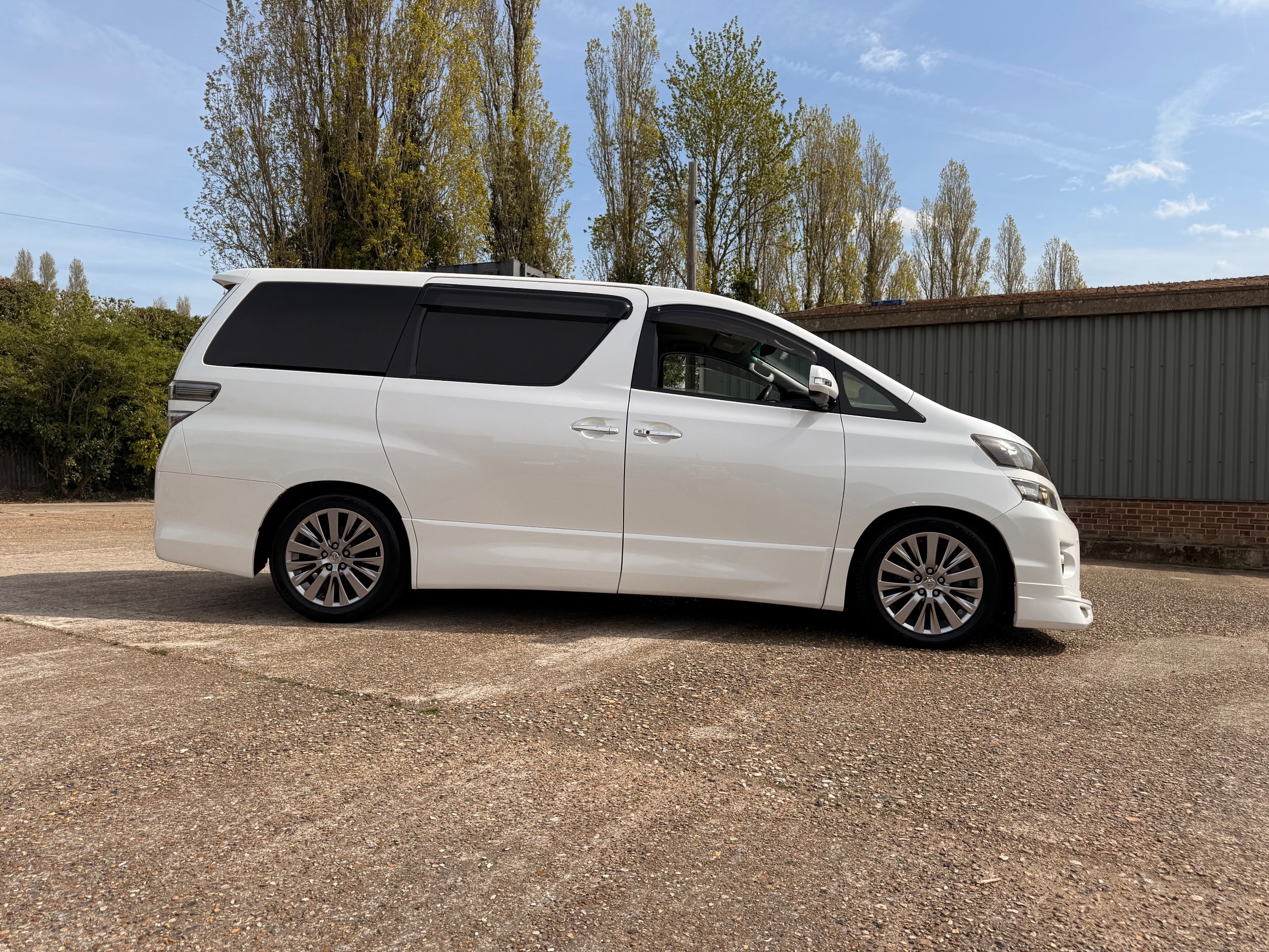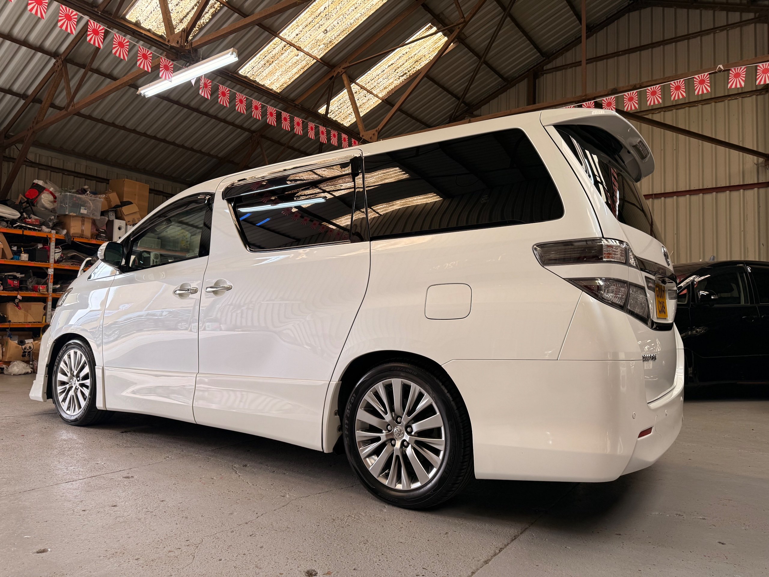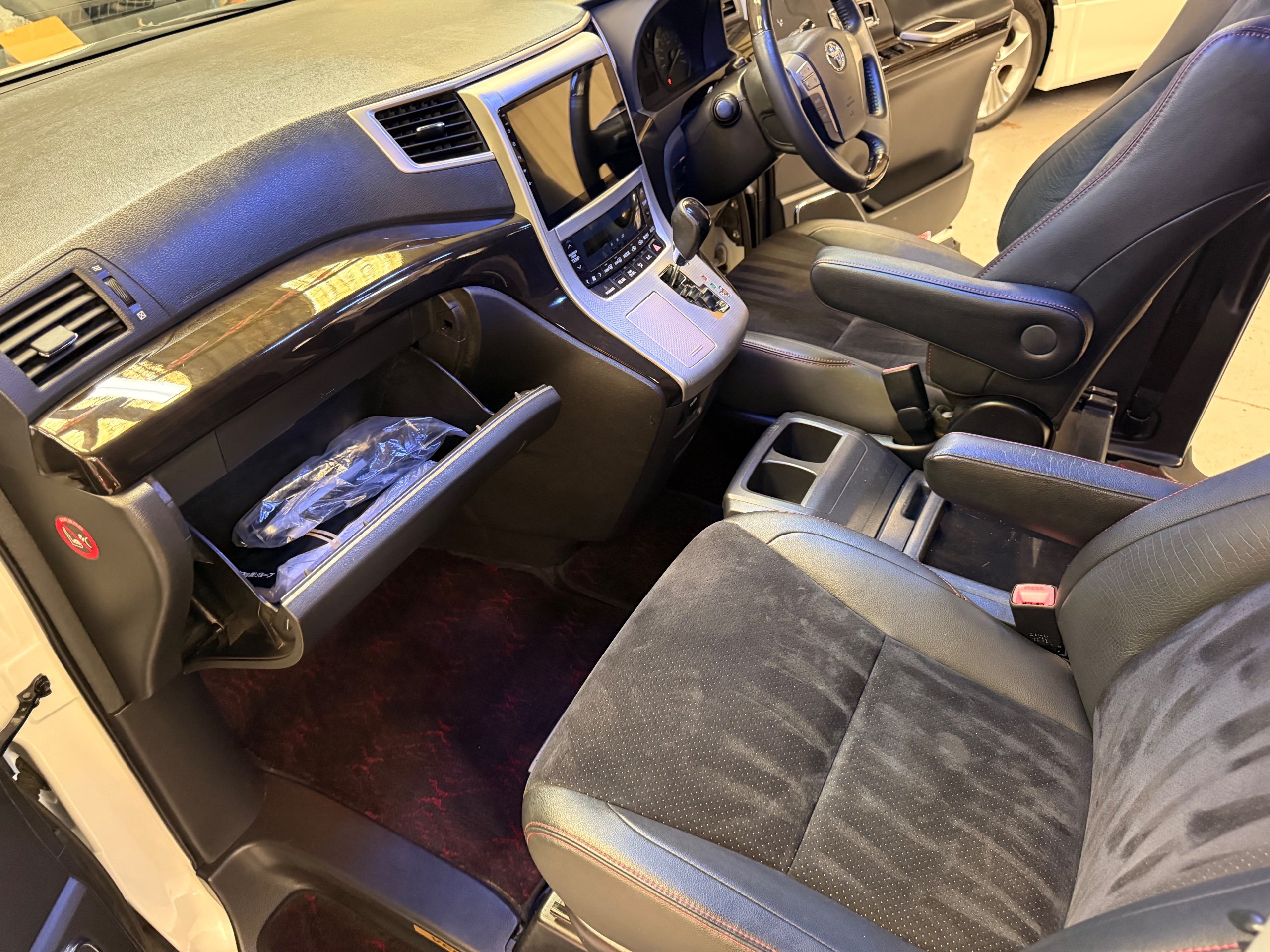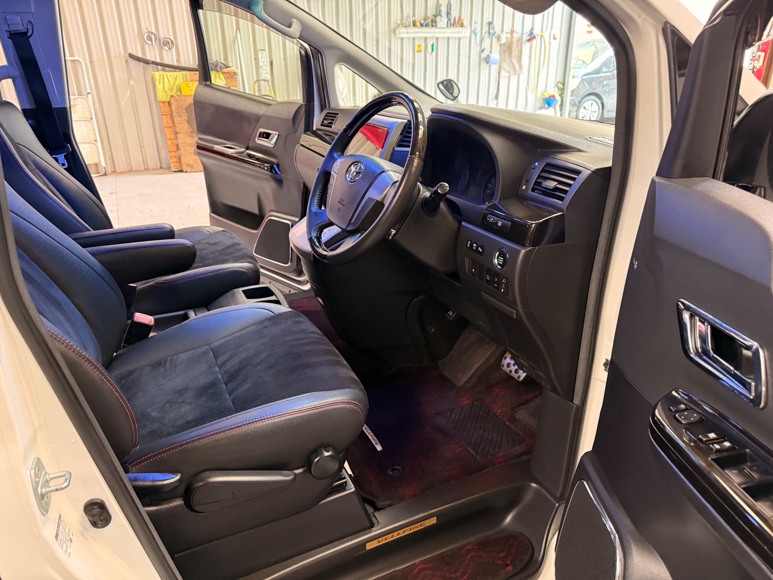 2012 Toyota Vellfire 2.4Z GOLDEN EYES EDITION 2012-62-Reg, Face-lift Edition, Finished in Stunning Pearlescent White paintwork, Twin Electric Soft Closing Sliding Doors, Electric Soft closing Tailgate, Front spots With chrome surrounds, Front Lip, Full Privacy Glass, Rear Spoiler with built in brake light, Unmarked Genuine 18” Golden Eyes dark silver Alloys, Key-less Entry, Key-less start, Golden headlight surround, 7 Seater 7 Unblemished Half leather seats with red stitching, The Front Seats have armrests, Centre console with flip up cup holders, The centre seats are Lounge style seats with extra leg rests and twin armrests on each seat, The seats also slide forwards and backwards and side to side with a folding centre table with built in cup holders, easy access to the rear seats, Isofix centre seats, The rear seats fold away to give way to a large boot, Strip L.E.D lighting, Ambient lighting, Push button Start, Front and Rear parking sensors, Traction Control, Front and Rear Electric windows, Colour reversing camera, Isofix points, Stereo System with Apple CarPlay, Red and Black Golden eyes floor mats, Cruise Control, Only covered a Genuine 68,000 Miles With All the Genuine paperwork from Japan including the auction sheet and D-Reg form which both prove the mileage and condition before it left Japan