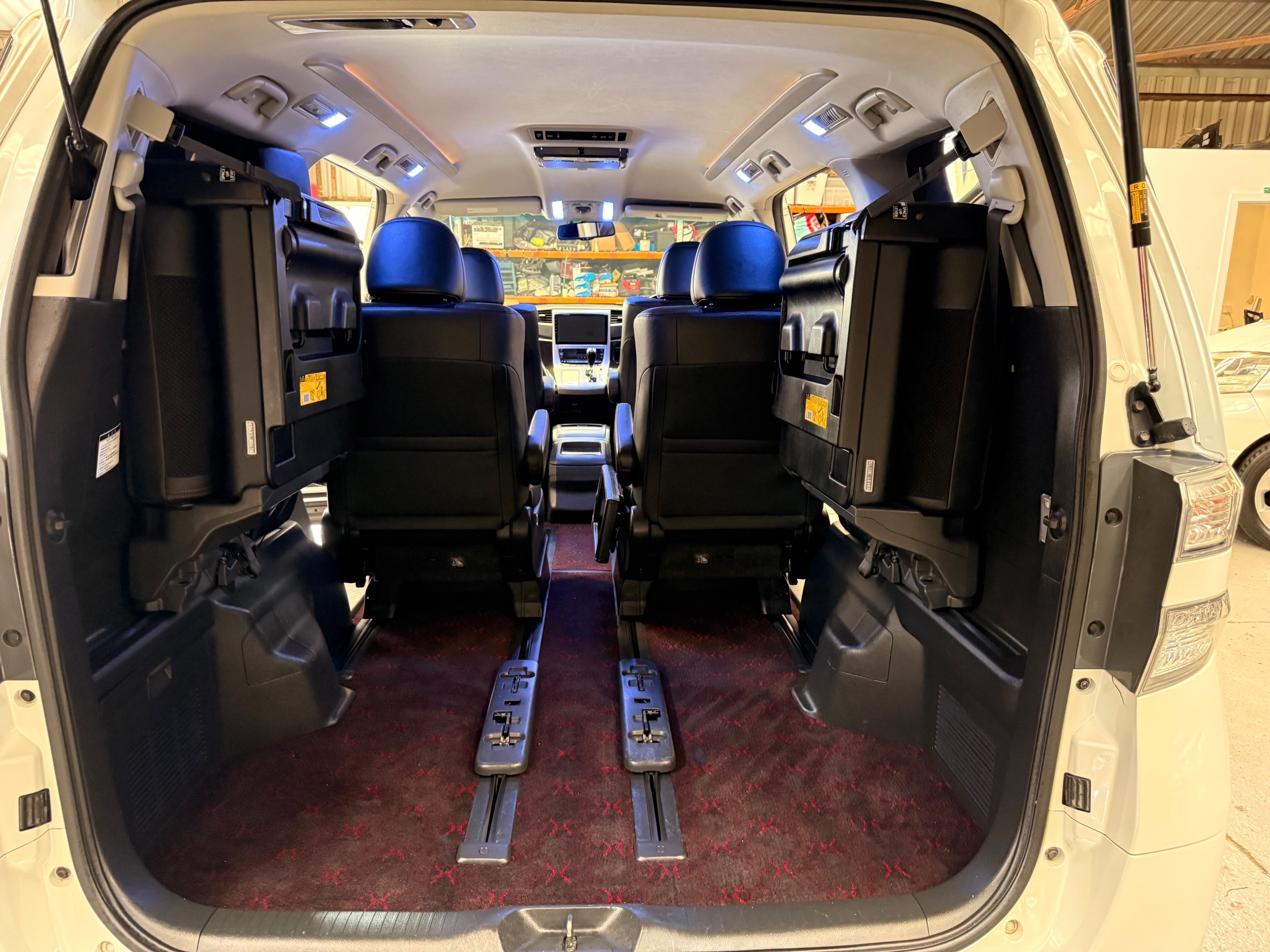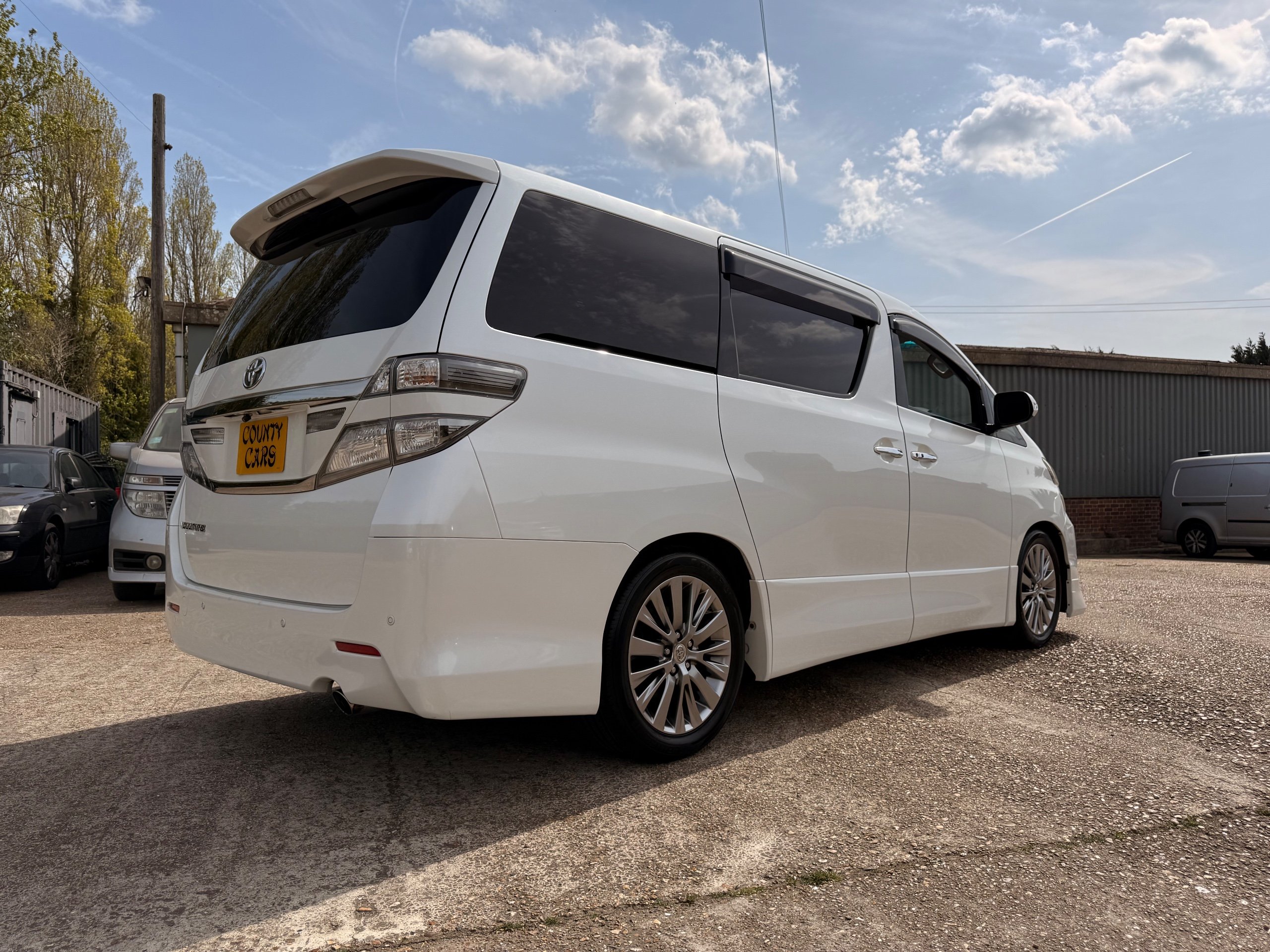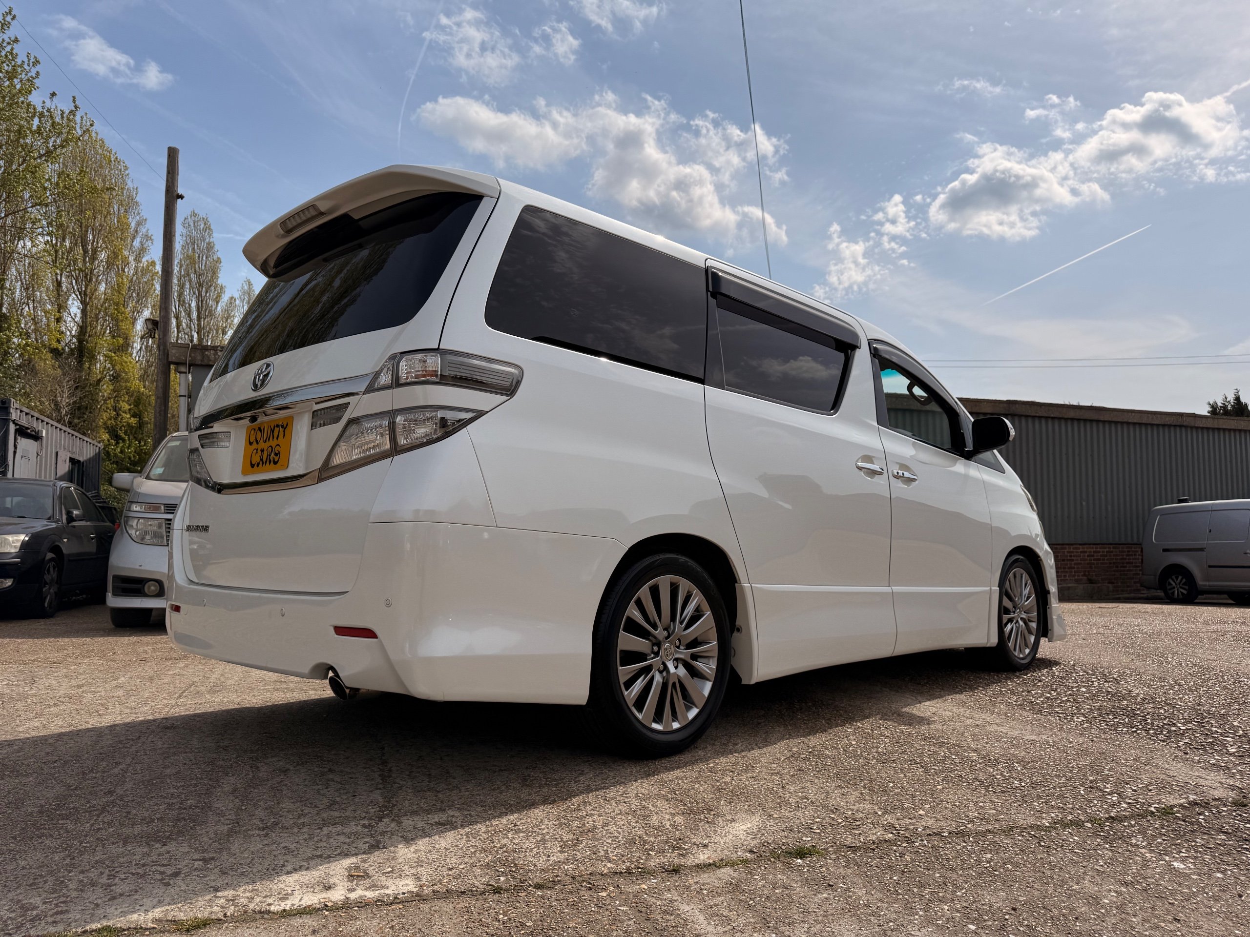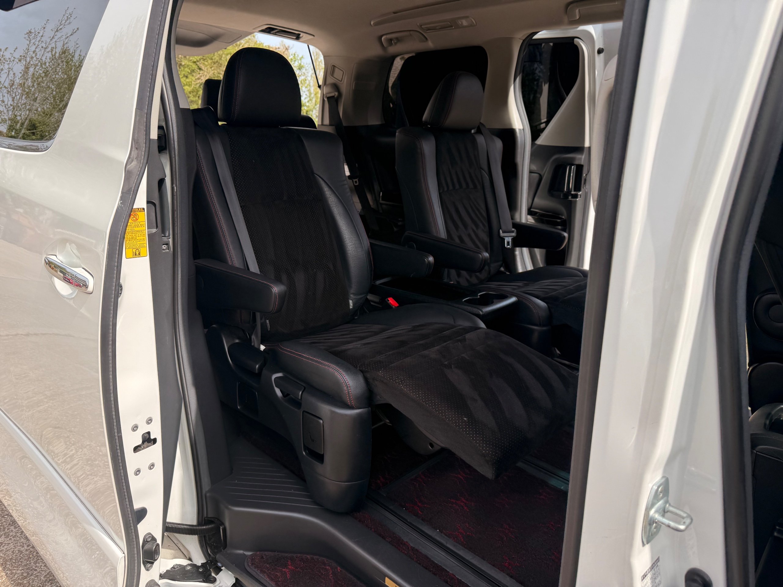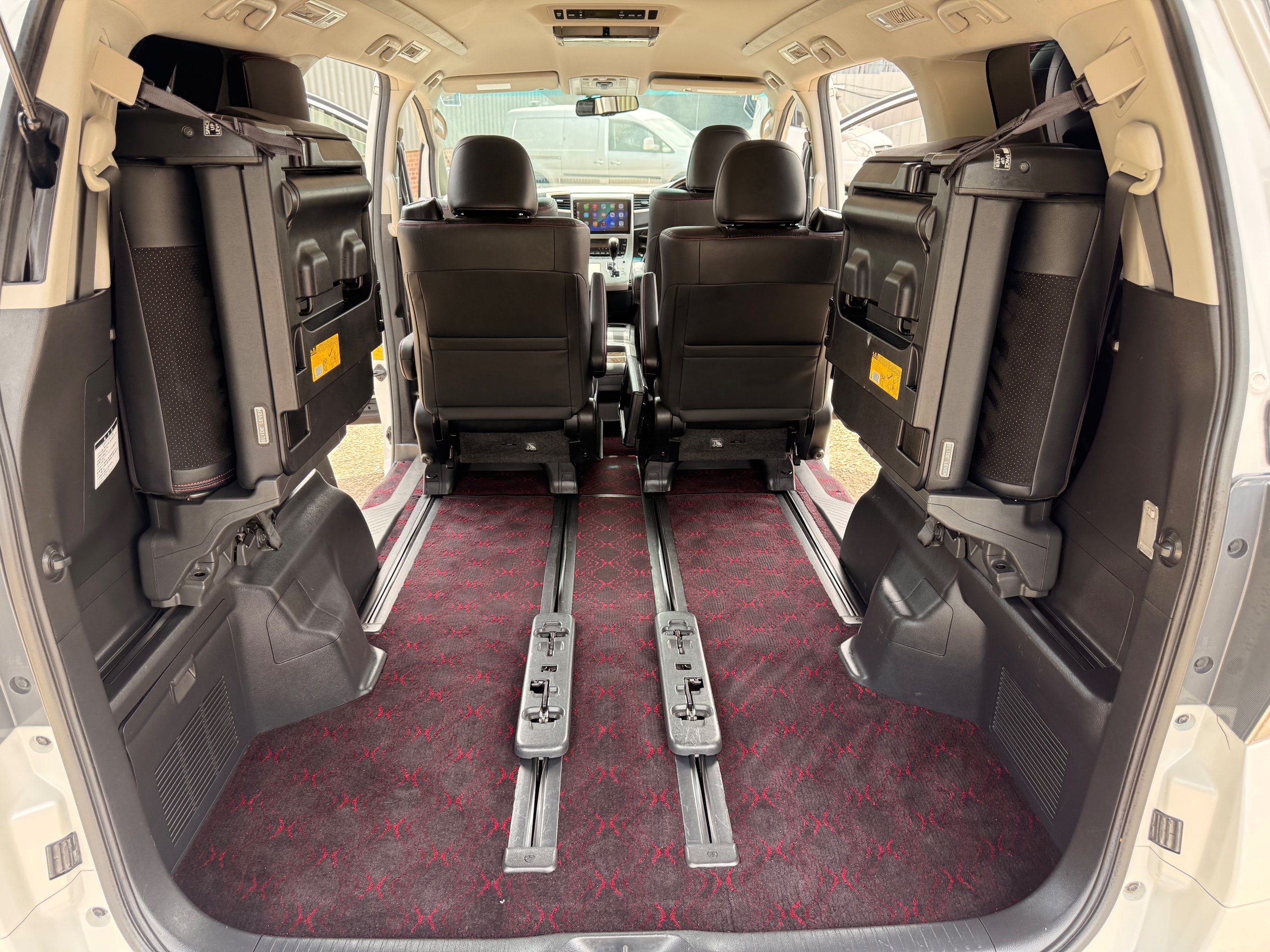 2012 Toyota Vellfire 2.4Z GOLDEN EYES EDITION 2012-62-Reg, Face-lift Edition, Finished in Stunning Pearlescent White paintwork, Twin Electric Soft Closing Sliding Doors, Electric Soft closing Tailgate, Front spots With chrome surrounds, Front Lip, Full Privacy Glass, Rear Spoiler with built in brake light, Unmarked Genuine 18” Golden Eyes dark silver Alloys, Key-less Entry, Key-less start, Golden headlight surround, 7 Seater 7 Unblemished Half leather seats with red stitching, The Front Seats have armrests, Centre console with flip up cup holders, The centre seats are Lounge style seats with extra leg rests and twin armrests on each seat, The seats also slide forwards and backwards and side to side with a folding centre table with built in cup holders, easy access to the rear seats, Isofix centre seats, The rear seats fold away to give way to a large boot, Strip L.E.D lighting, Ambient lighting, Push button Start, Front and Rear parking sensors, Traction Control, Front and Rear Electric windows, Colour reversing camera, Isofix points, Stereo System with Apple CarPlay, Red and Black Golden eyes floor mats, Cruise Control, Only covered a Genuine 68,000 Miles With All the Genuine paperwork from Japan including the auction sheet and D-Reg form which both prove the mileage and condition before it left Japan