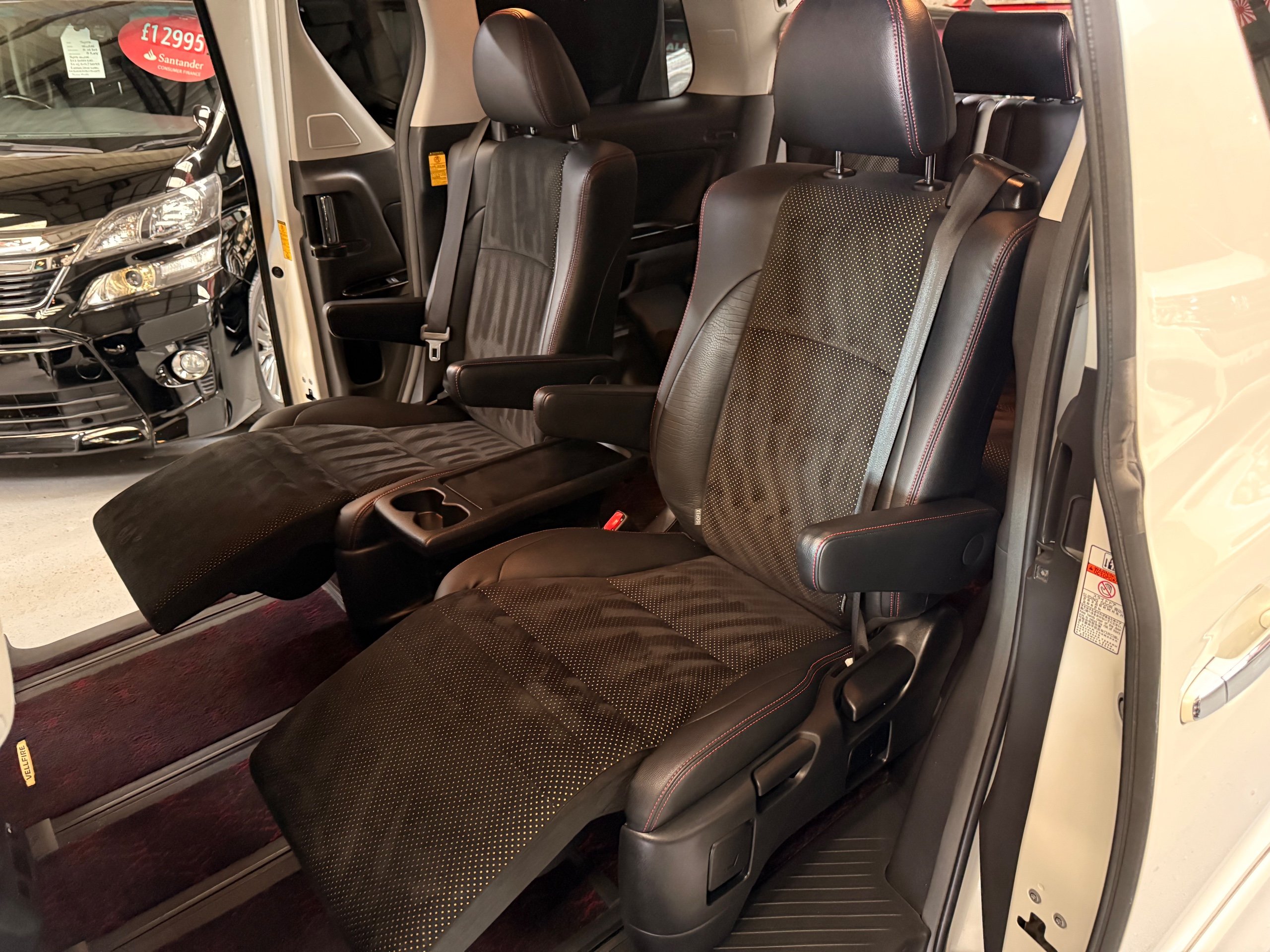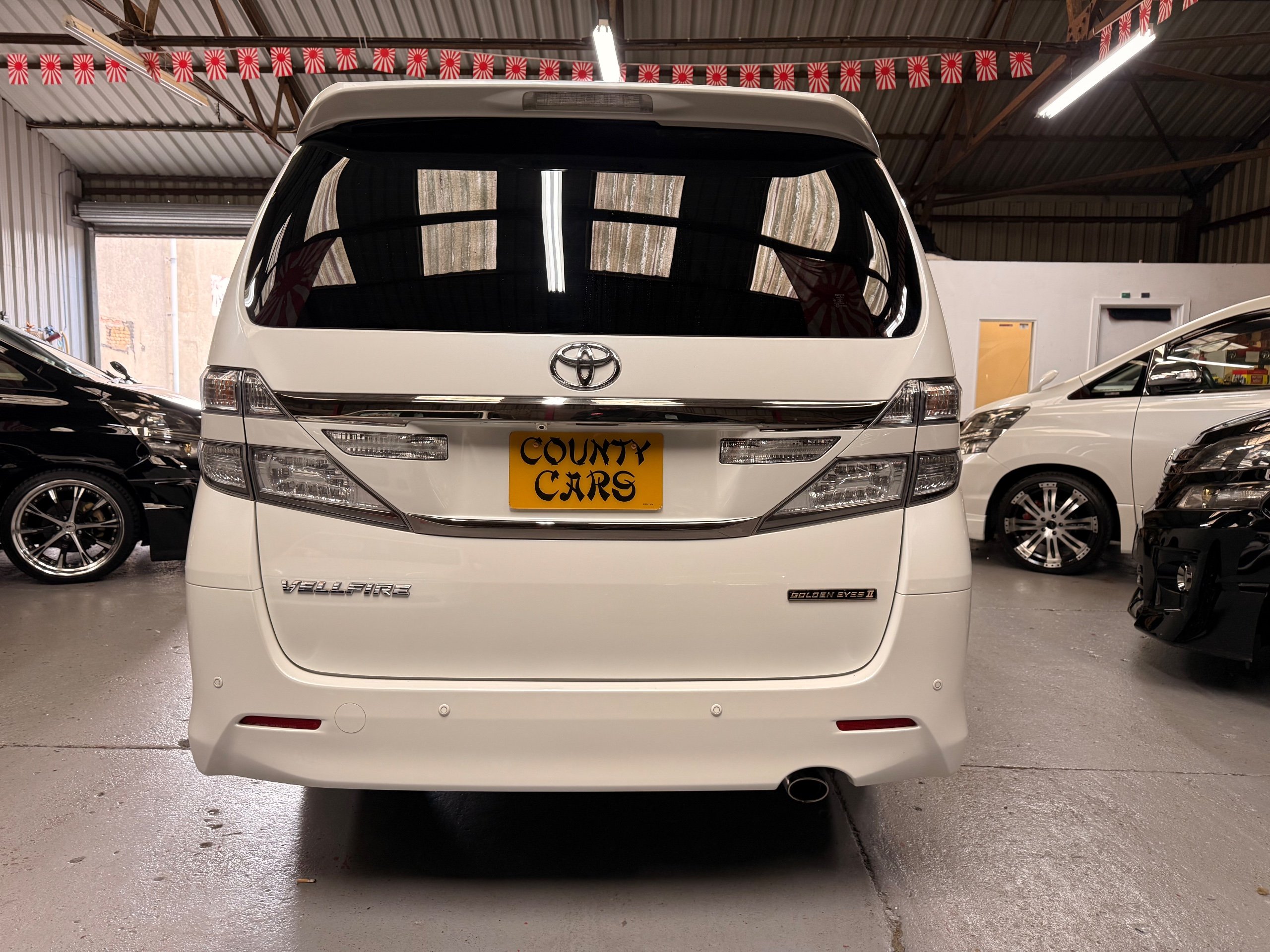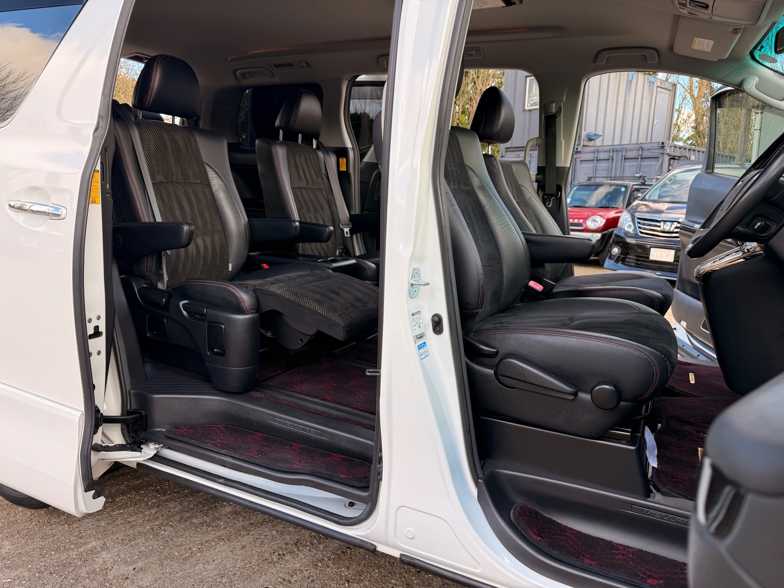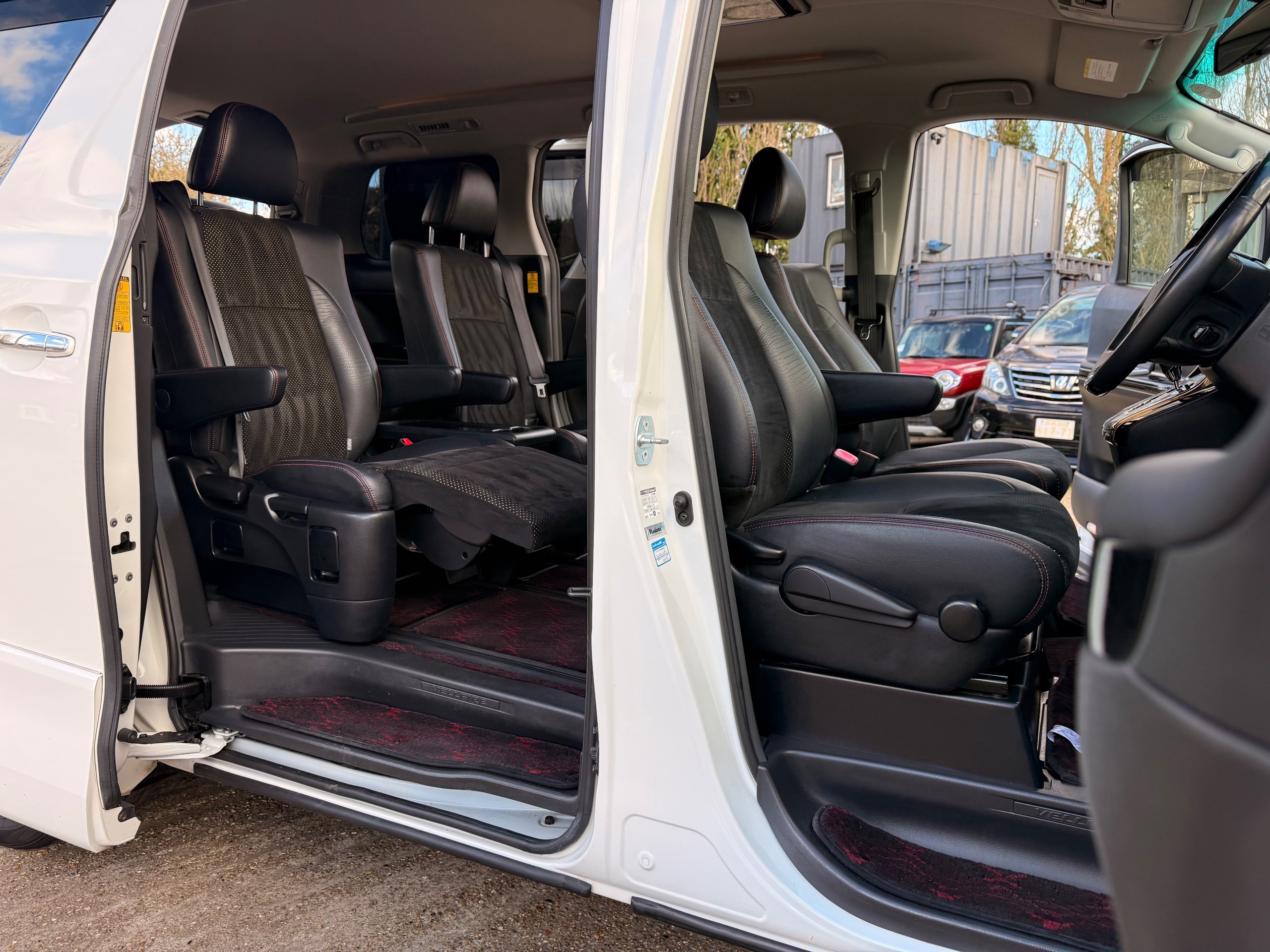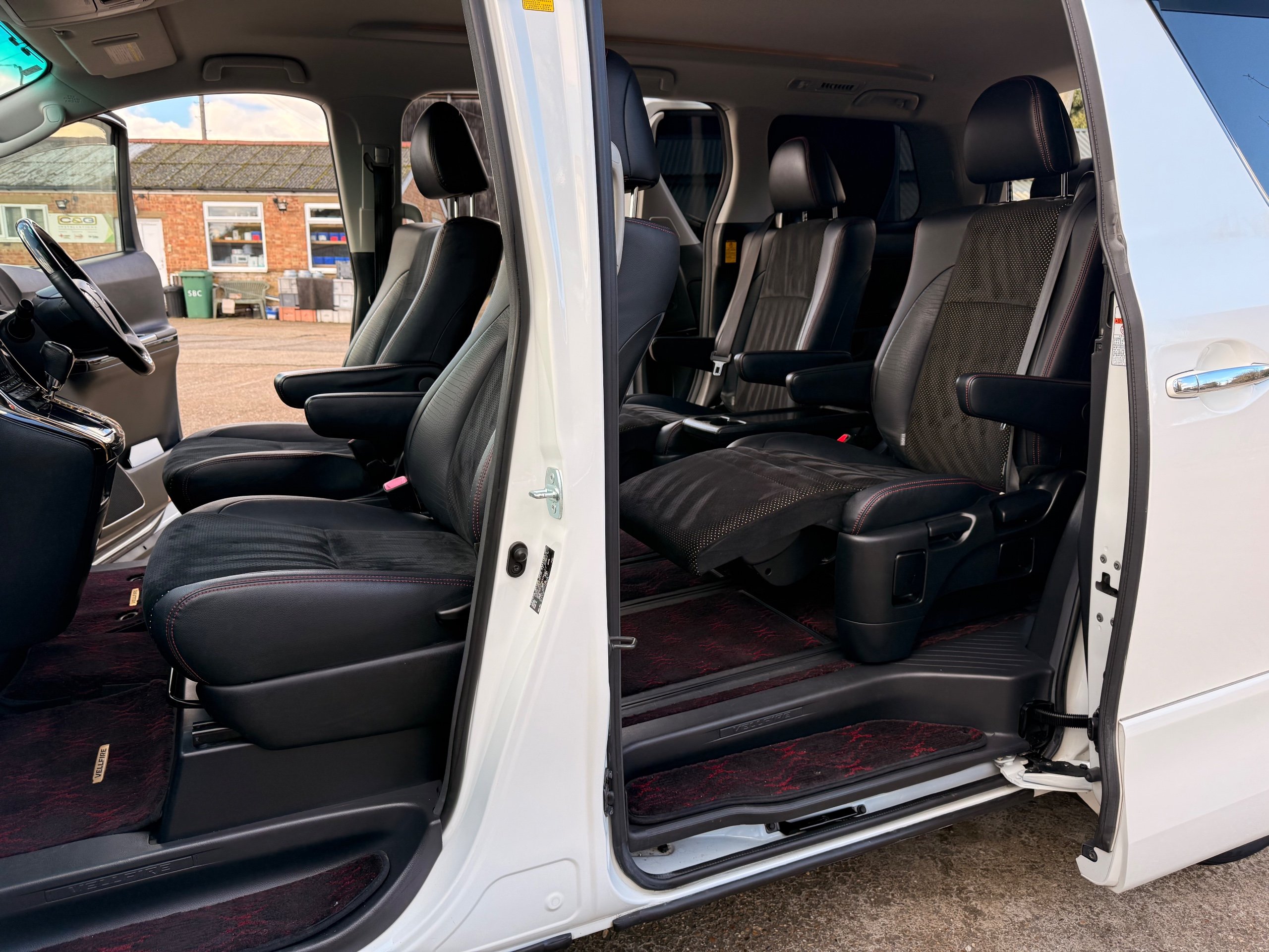 2014 Toyota Vellfire 2.4Z GOLDEN EYES EDITION 2 2014-64Reg, Face-lift edition, Finished in Stunning Unmarked Pearlescent White paintwork, Twin Electric Soft Closing Sliding Doors, Electric Soft closing Tailgate, Front spots With chrome surrounds, Full Privacy Glass, Rear Spoiler with built in brake light, Unmarked Genuine 18” Golden Eyes dark silver Alloys, Key-less Entry, Key-less start, Twin Golden Light elements, 7 Seater 7 Unblemished Half leather seats with red stitching and Golden Spots, The Front Seats have armrests, Centre console with flip up cup holders, The centre seats are Lounge style seats with extra leg rests and twin armrests on each seat, The seats also slide forwards and backwards and side to side with a folding centre table with built in cup holders, easy access to the rear seats, Isofix centre seats, The rear seats fold away to give way to a large boot, Strip L.E.D lighting, Ambient lighting, Push button Start, Front and Rear parking sensors, Traction Control, Front and Rear Electric windows, Colour reversing camera, Isofix points, Stereo System with Apple CarPlay, Red and Black Golden eyes floor mats, Cruise Control, Only covered a Genuine 66,000 Miles With All the Genuine paperwork from Japan including the auction sheet and D-Reg form which both prove the mileage and condition before it left Japan