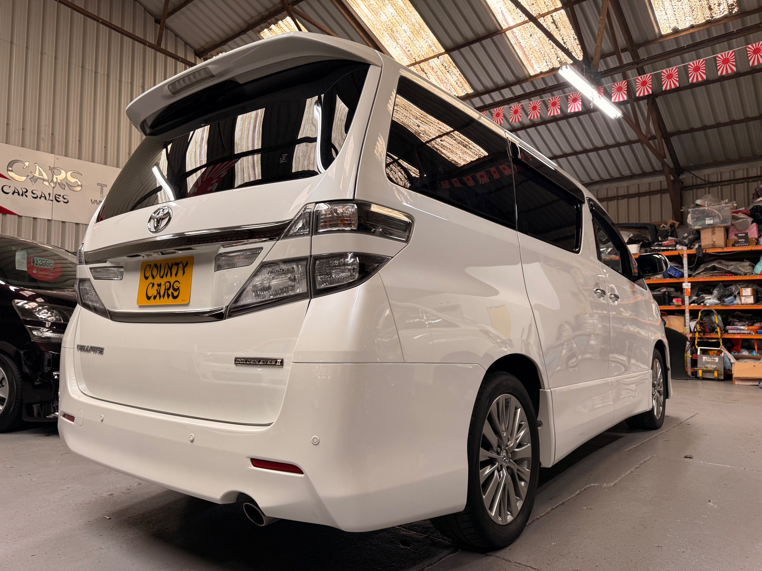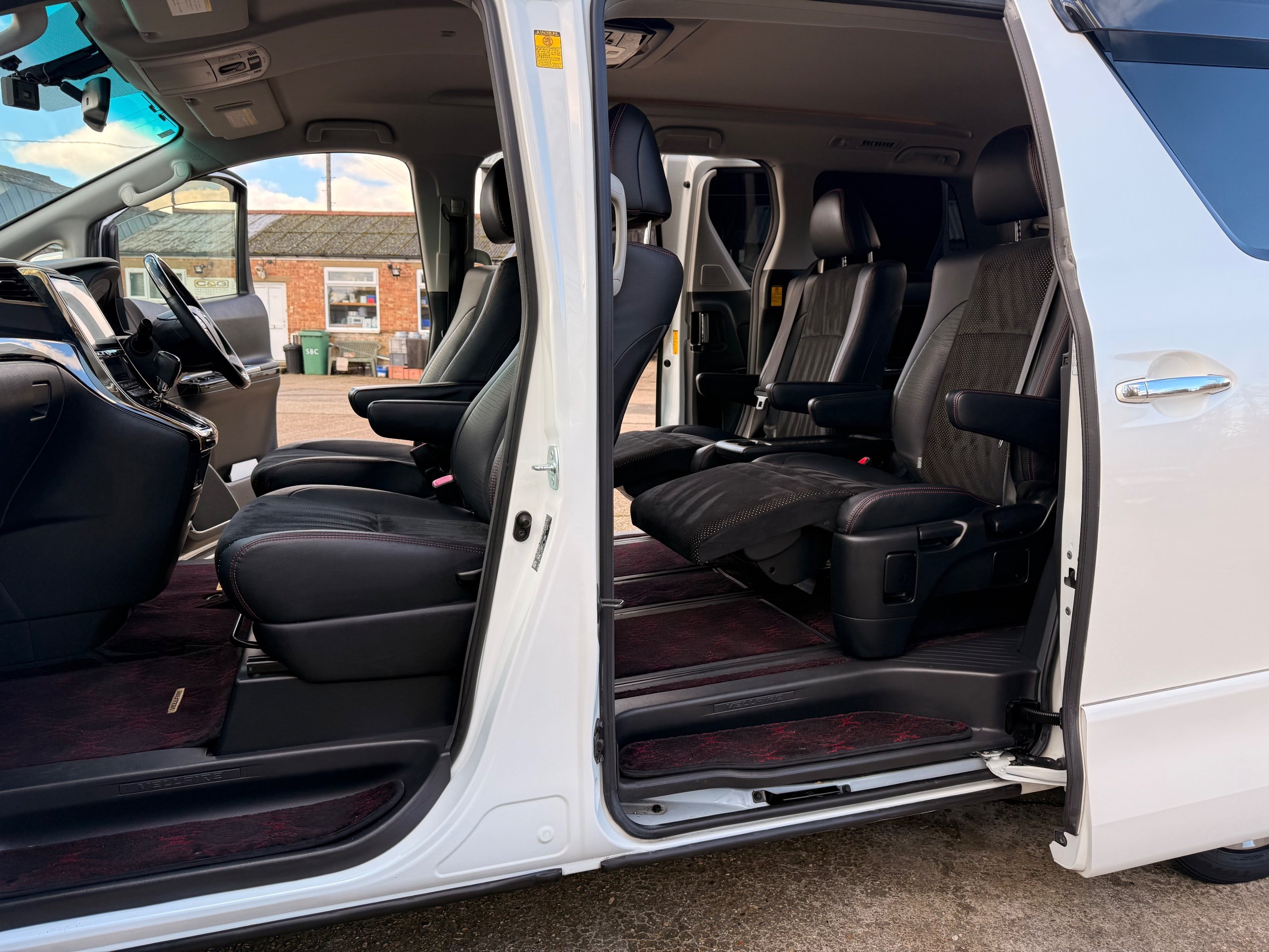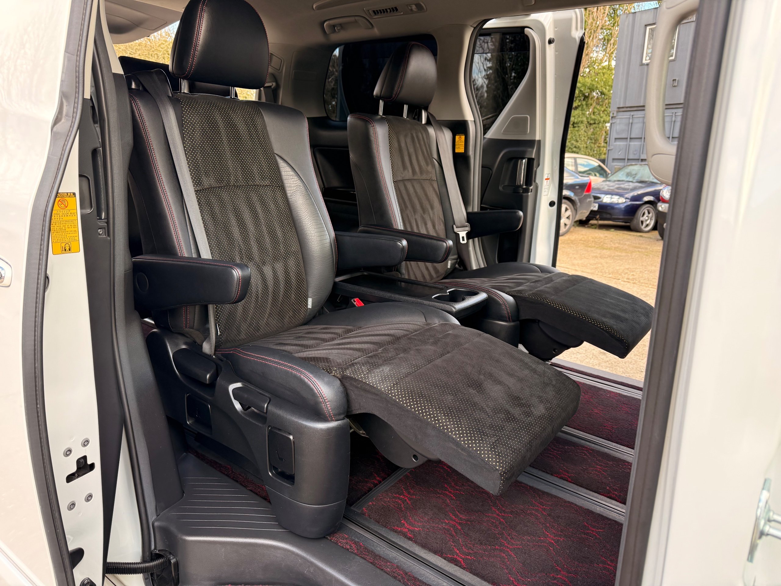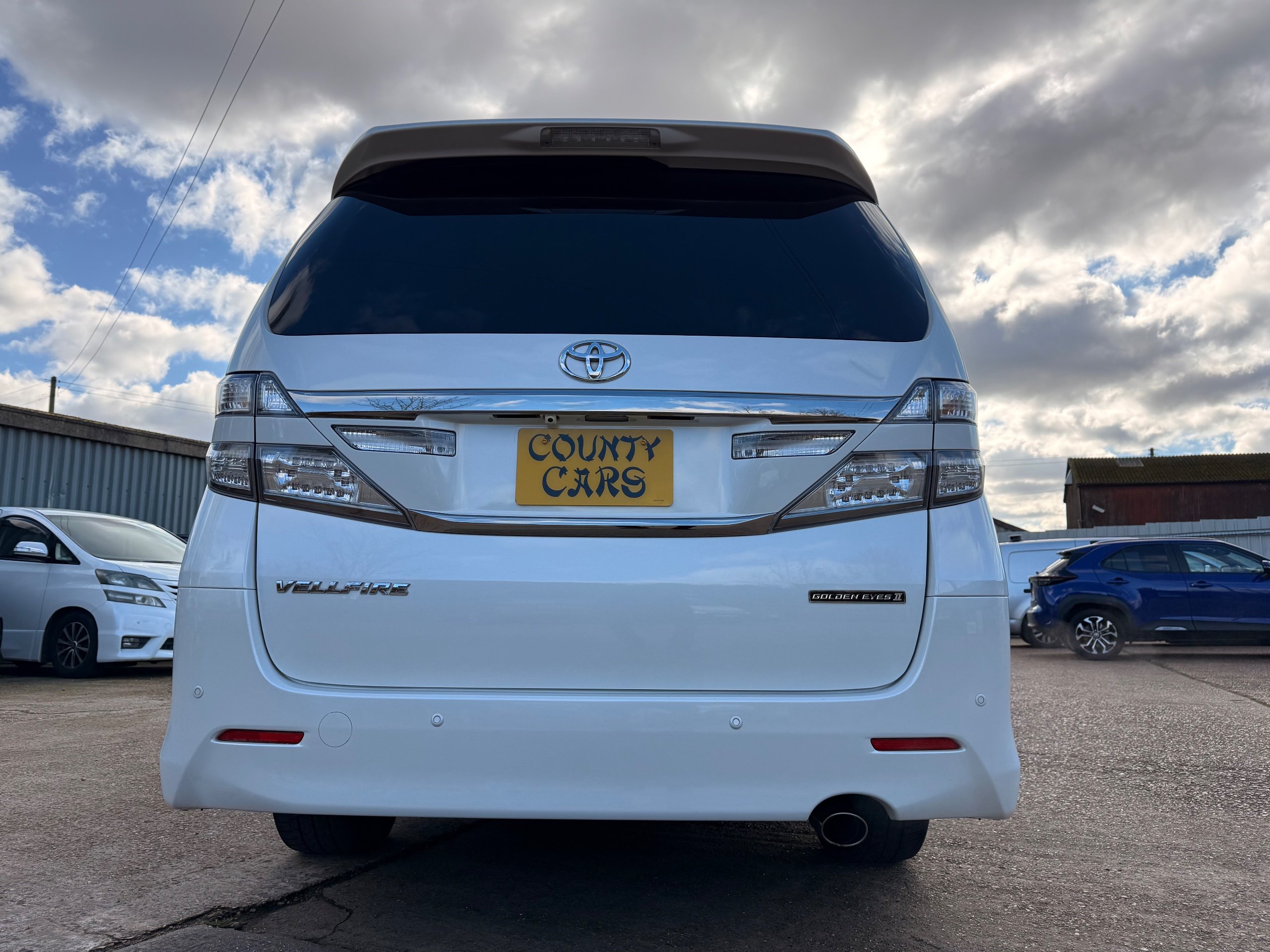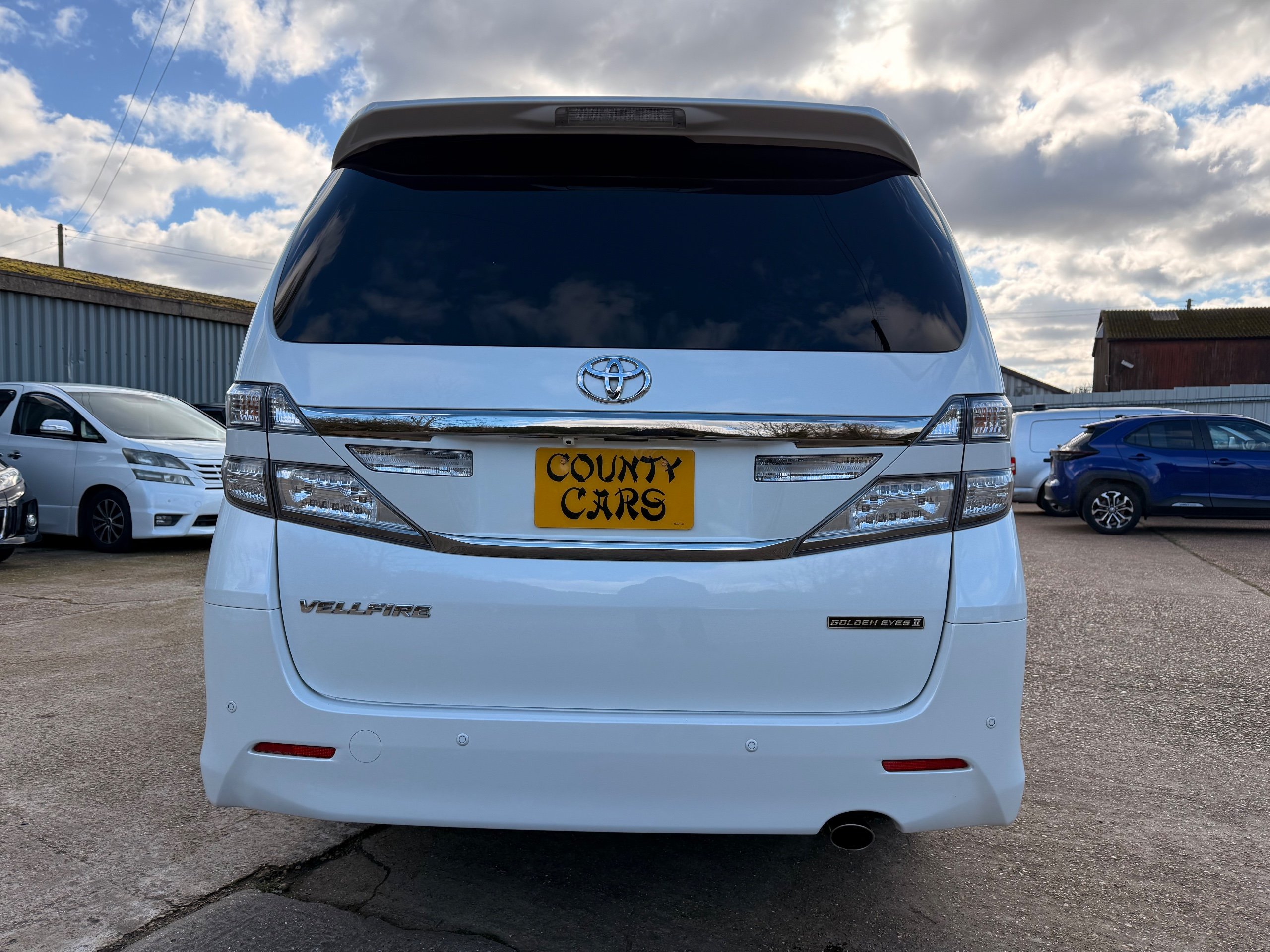 2014 Toyota Vellfire 2.4Z GOLDEN EYES EDITION 2 2014-64Reg, Face-lift edition, Finished in Stunning Unmarked Pearlescent White paintwork, Twin Electric Soft Closing Sliding Doors, Electric Soft closing Tailgate, Front spots With chrome surrounds, Full Privacy Glass, Rear Spoiler with built in brake light, Unmarked Genuine 18” Golden Eyes dark silver Alloys, Key-less Entry, Key-less start, Twin Golden Light elements, 7 Seater 7 Unblemished Half leather seats with red stitching and Golden Spots, The Front Seats have armrests, Centre console with flip up cup holders, The centre seats are Lounge style seats with extra leg rests and twin armrests on each seat, The seats also slide forwards and backwards and side to side with a folding centre table with built in cup holders, easy access to the rear seats, Isofix centre seats, The rear seats fold away to give way to a large boot, Strip L.E.D lighting, Ambient lighting, Push button Start, Front and Rear parking sensors, Traction Control, Front and Rear Electric windows, Colour reversing camera, Isofix points, Stereo System with Apple CarPlay, Red and Black Golden eyes floor mats, Cruise Control, Only covered a Genuine 66,000 Miles With All the Genuine paperwork from Japan including the auction sheet and D-Reg form which both prove the mileage and condition before it left Japan