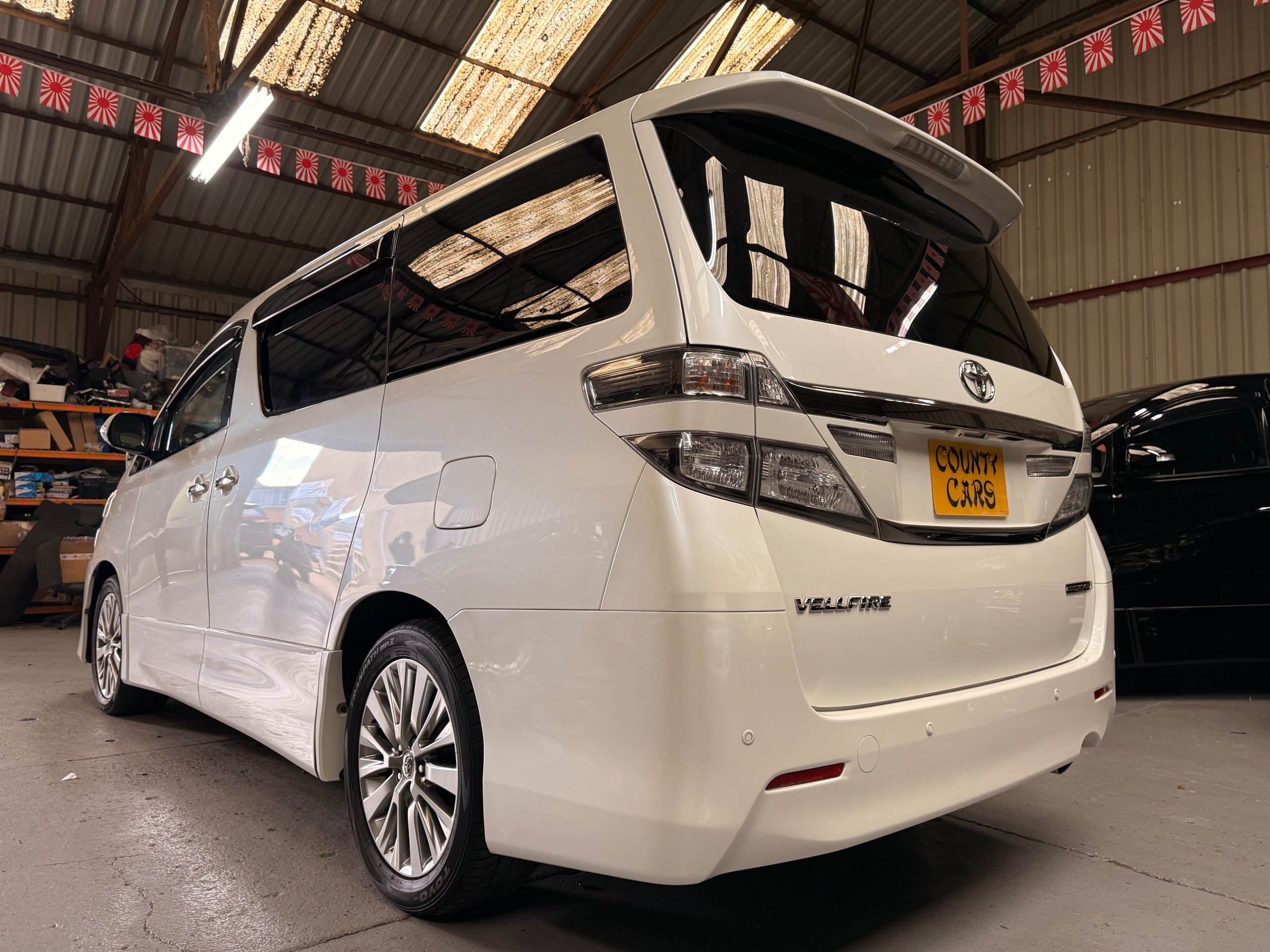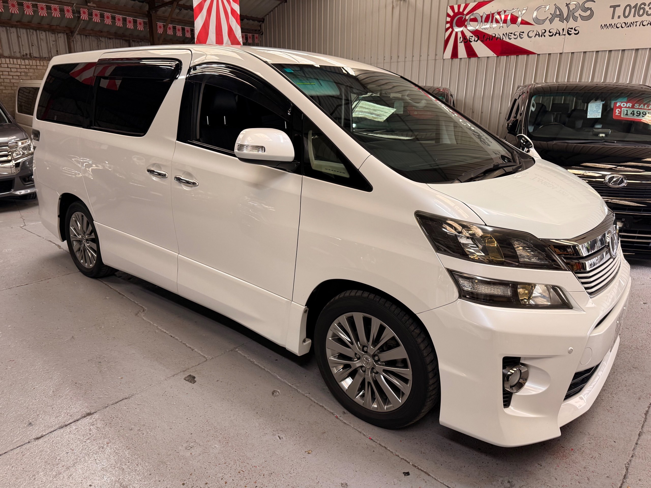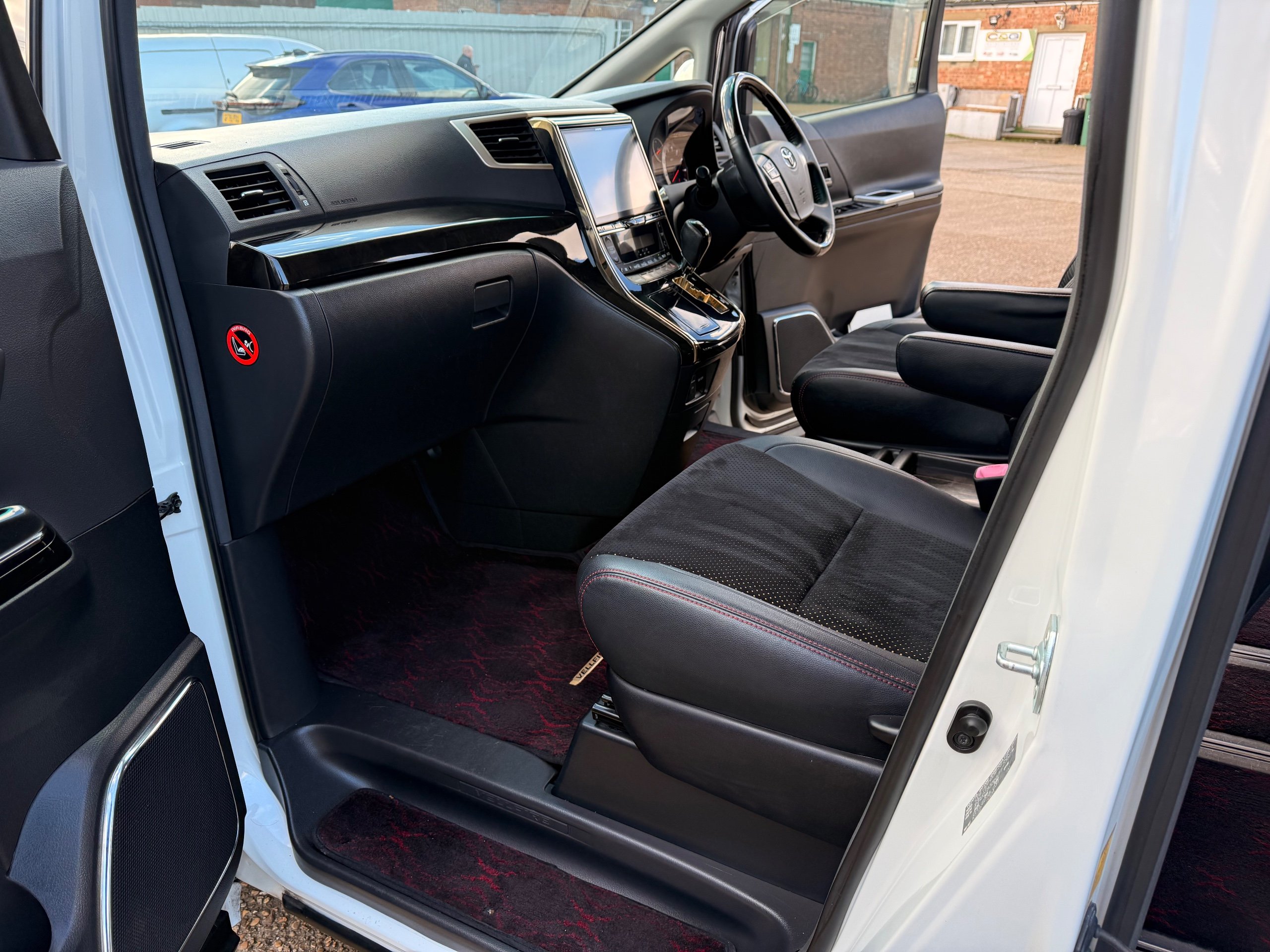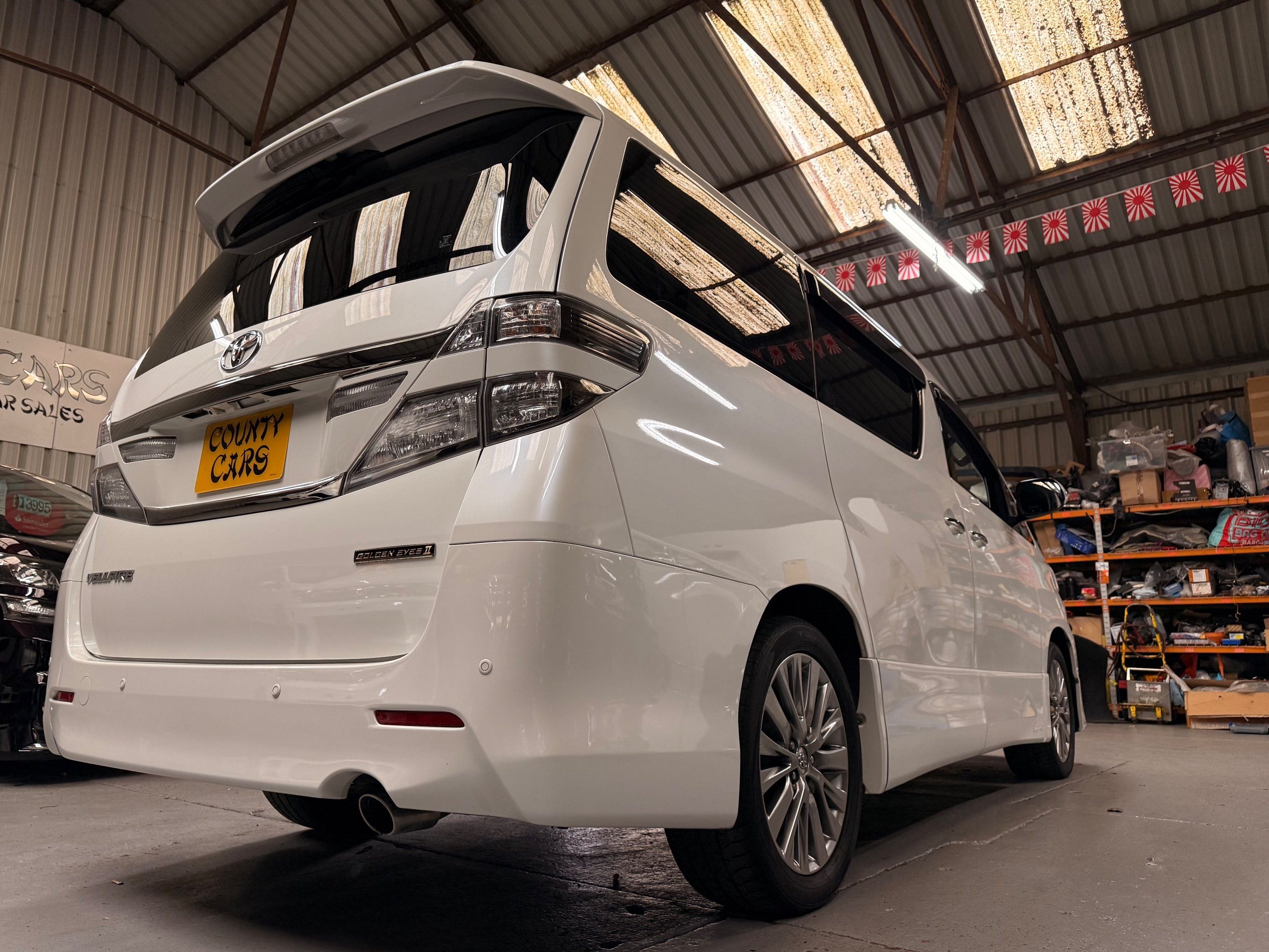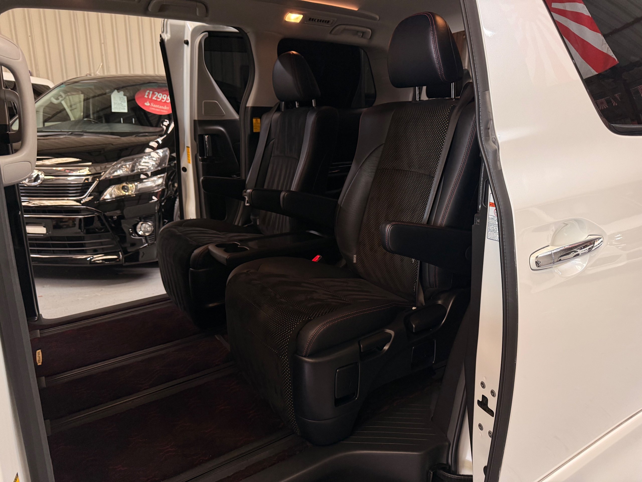 2014 Toyota Vellfire 2.4Z GOLDEN EYES EDITION 2 2014-64Reg, Face-lift edition, Finished in Stunning Unmarked Pearlescent White paintwork, Twin Electric Soft Closing Sliding Doors, Electric Soft closing Tailgate, Front spots With chrome surrounds, Full Privacy Glass, Rear Spoiler with built in brake light, Unmarked Genuine 18” Golden Eyes dark silver Alloys, Key-less Entry, Key-less start, Twin Golden Light elements, 7 Seater 7 Unblemished Half leather seats with red stitching and Golden Spots, The Front Seats have armrests, Centre console with flip up cup holders, The centre seats are Lounge style seats with extra leg rests and twin armrests on each seat, The seats also slide forwards and backwards and side to side with a folding centre table with built in cup holders, easy access to the rear seats, Isofix centre seats, The rear seats fold away to give way to a large boot, Strip L.E.D lighting, Ambient lighting, Push button Start, Front and Rear parking sensors, Traction Control, Front and Rear Electric windows, Colour reversing camera, Isofix points, Stereo System with Apple CarPlay, Red and Black Golden eyes floor mats, Cruise Control, Only covered a Genuine 66,000 Miles With All the Genuine paperwork from Japan including the auction sheet and D-Reg form which both prove the mileage and condition before it left Japan