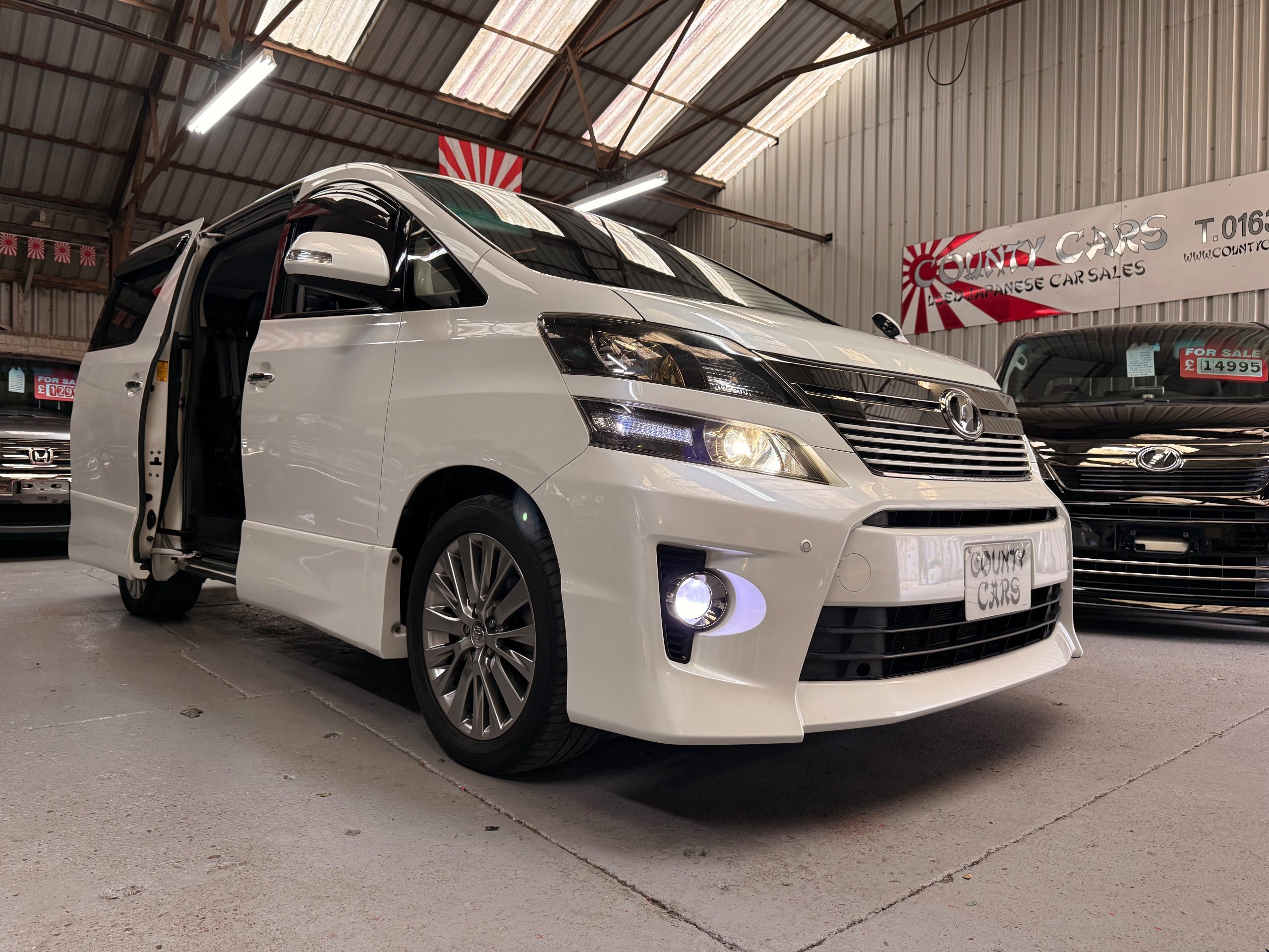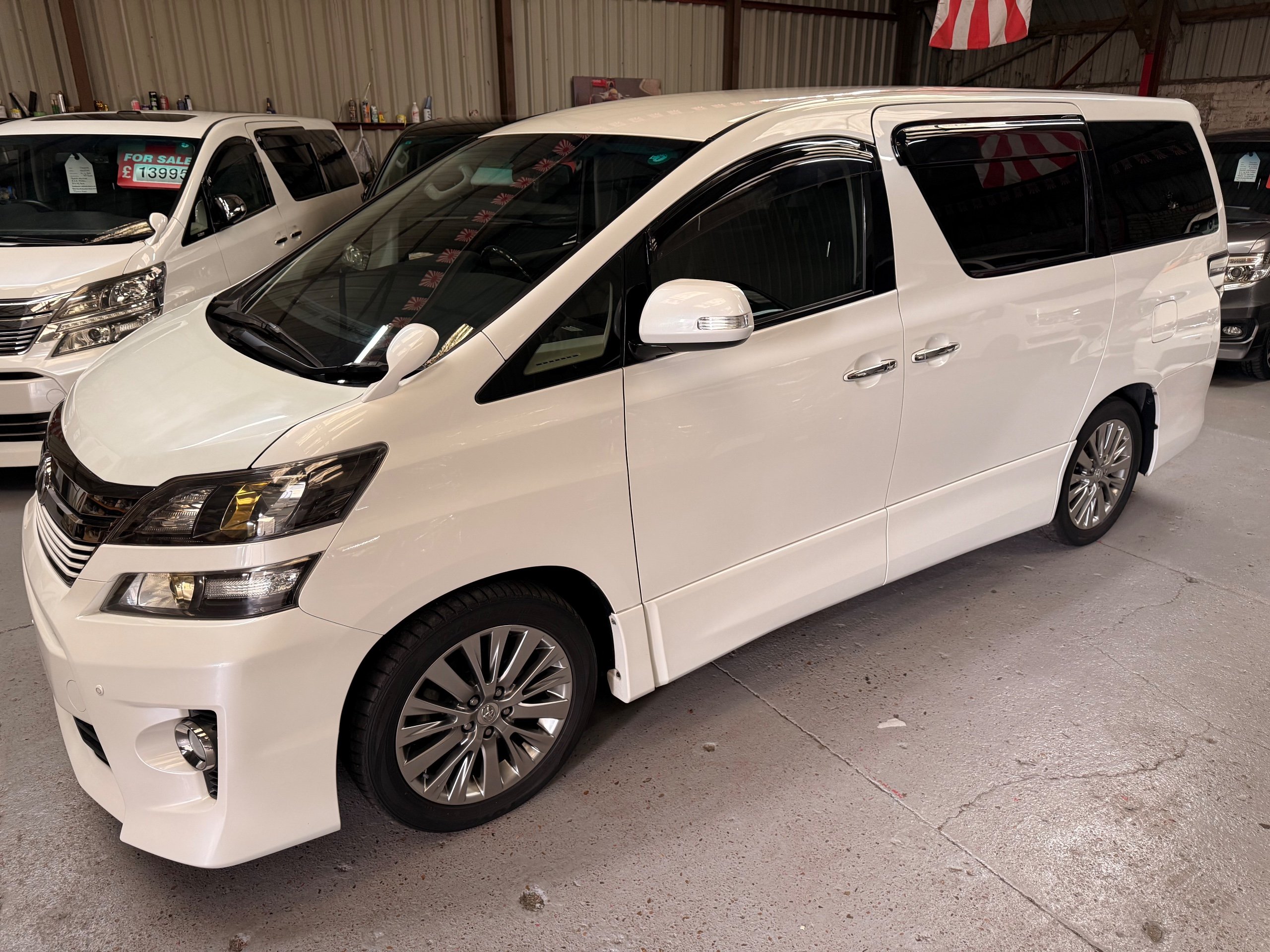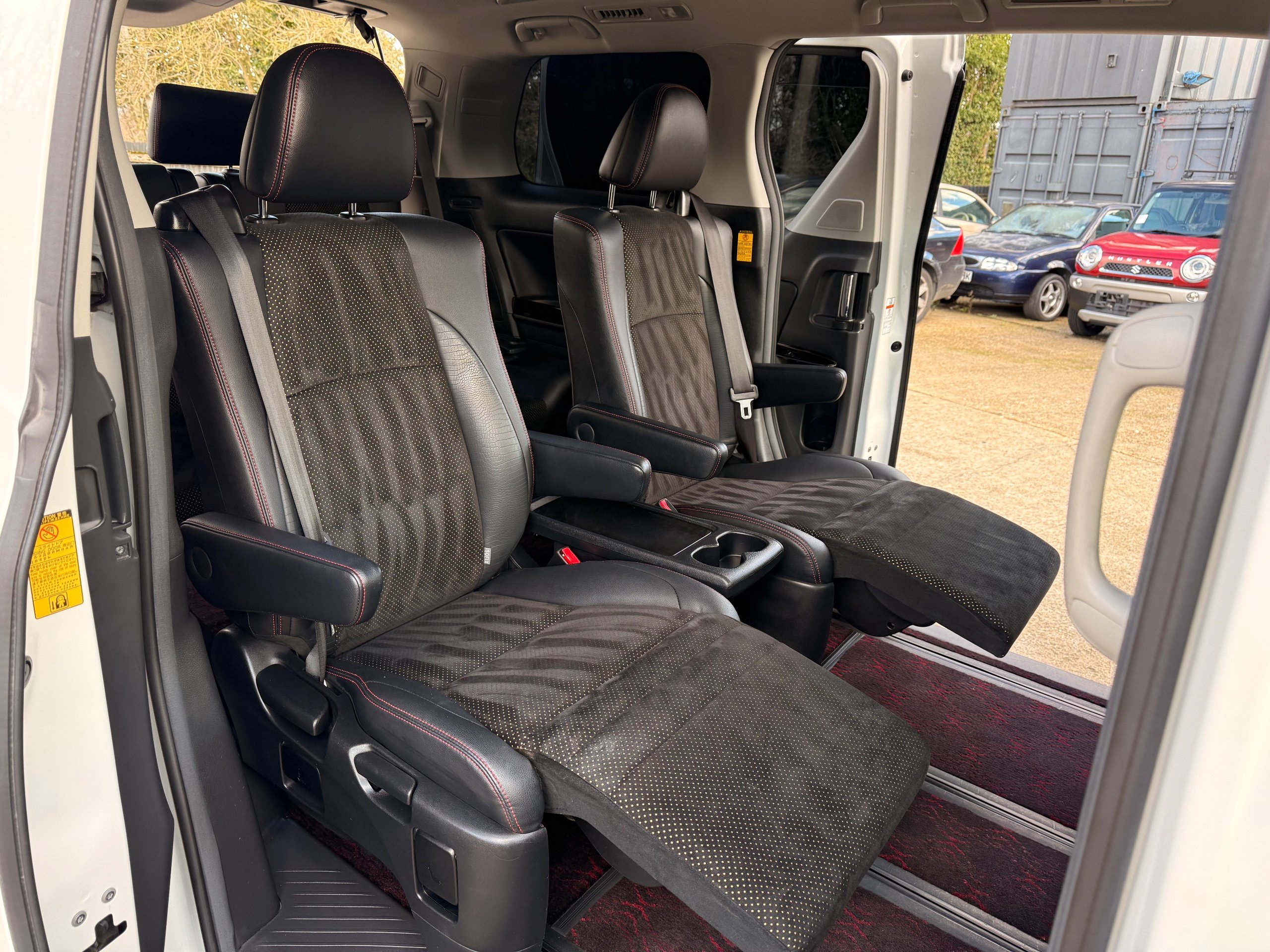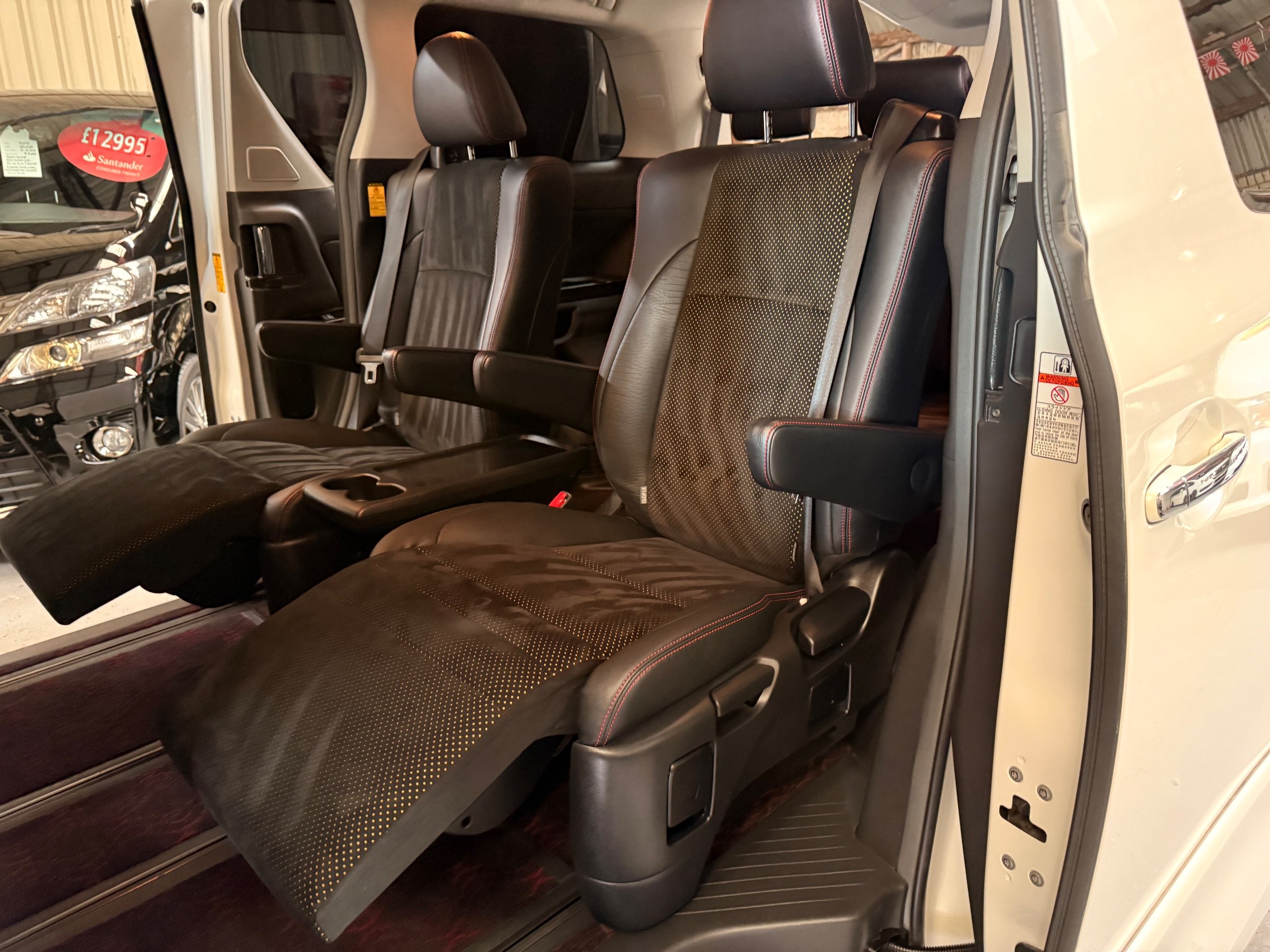 2014 Toyota Vellfire 2.4Z GOLDEN EYES EDITION 2 2014-64Reg, Face-lift edition, Finished in Stunning Unmarked Pearlescent White paintwork, Twin Electric Soft Closing Sliding Doors, Electric Soft closing Tailgate, Front spots With chrome surrounds, Full Privacy Glass, Rear Spoiler with built in brake light, Unmarked Genuine 18” Golden Eyes dark silver Alloys, Key-less Entry, Key-less start, Twin Golden Light elements, 7 Seater 7 Unblemished Half leather seats with red stitching and Golden Spots, The Front Seats have armrests, Centre console with flip up cup holders, The centre seats are Lounge style seats with extra leg rests and twin armrests on each seat, The seats also slide forwards and backwards and side to side with a folding centre table with built in cup holders, easy access to the rear seats, Isofix centre seats, The rear seats fold away to give way to a large boot, Strip L.E.D lighting, Ambient lighting, Push button Start, Front and Rear parking sensors, Traction Control, Front and Rear Electric windows, Colour reversing camera, Isofix points, Stereo System with Apple CarPlay, Red and Black Golden eyes floor mats, Cruise Control, Only covered a Genuine 66,000 Miles With All the Genuine paperwork from Japan including the auction sheet and D-Reg form which both prove the mileage and condition before it left Japan