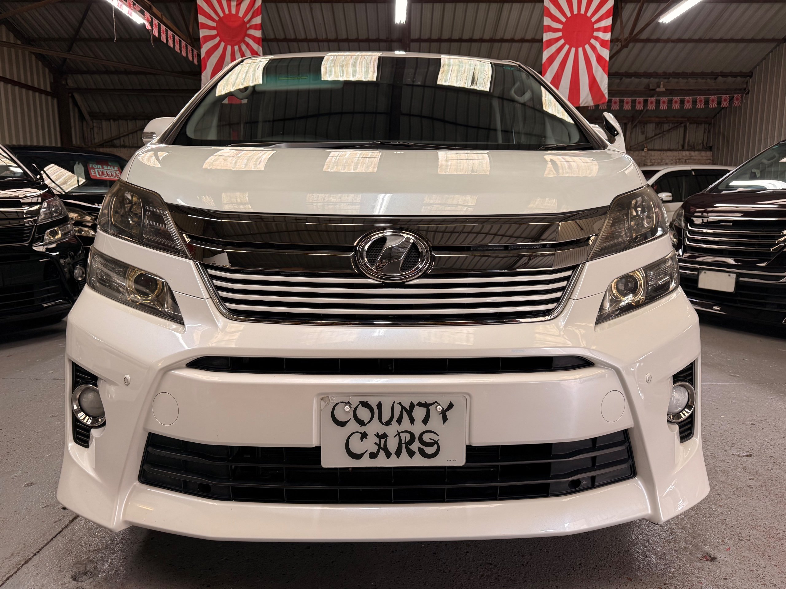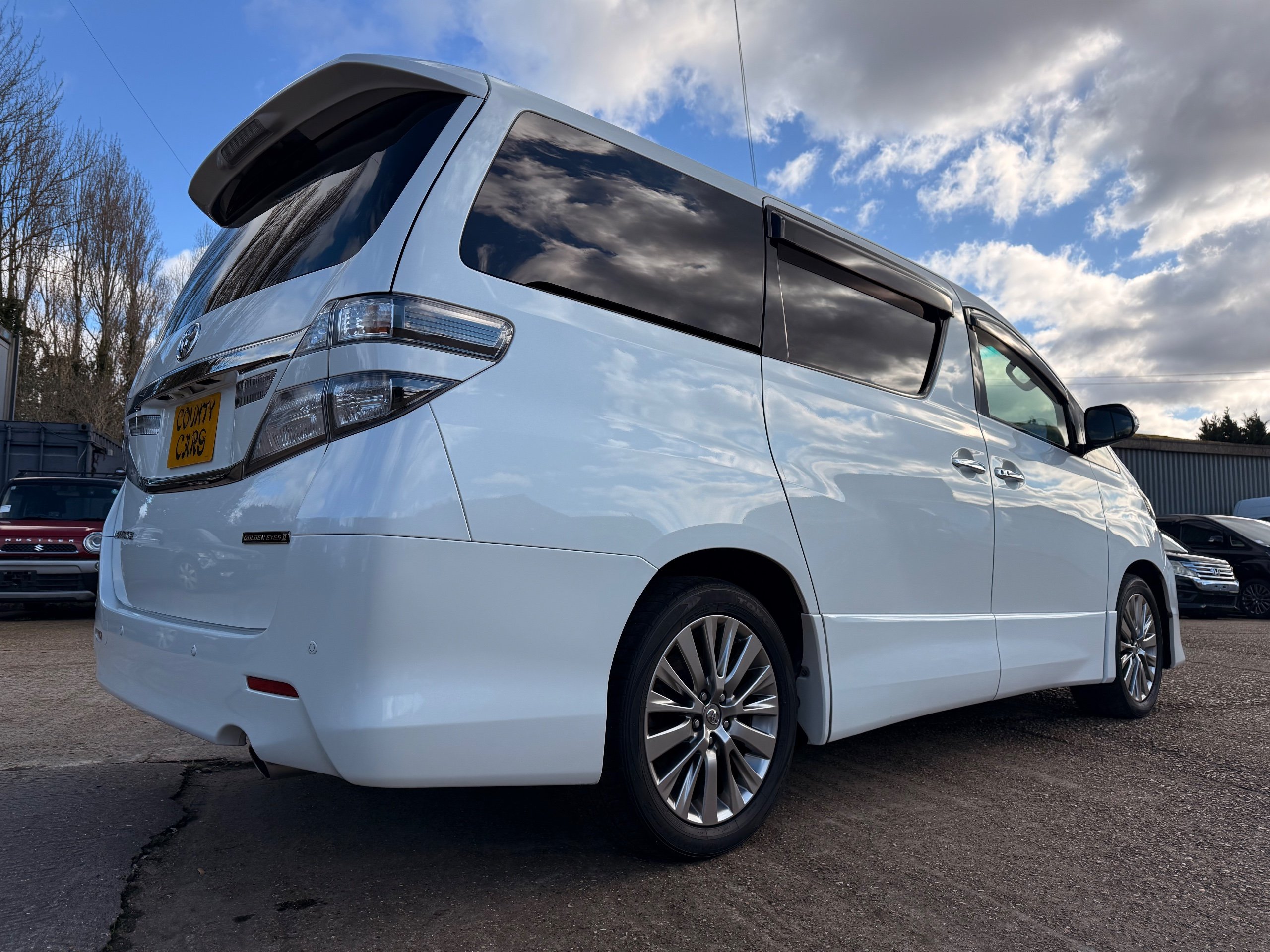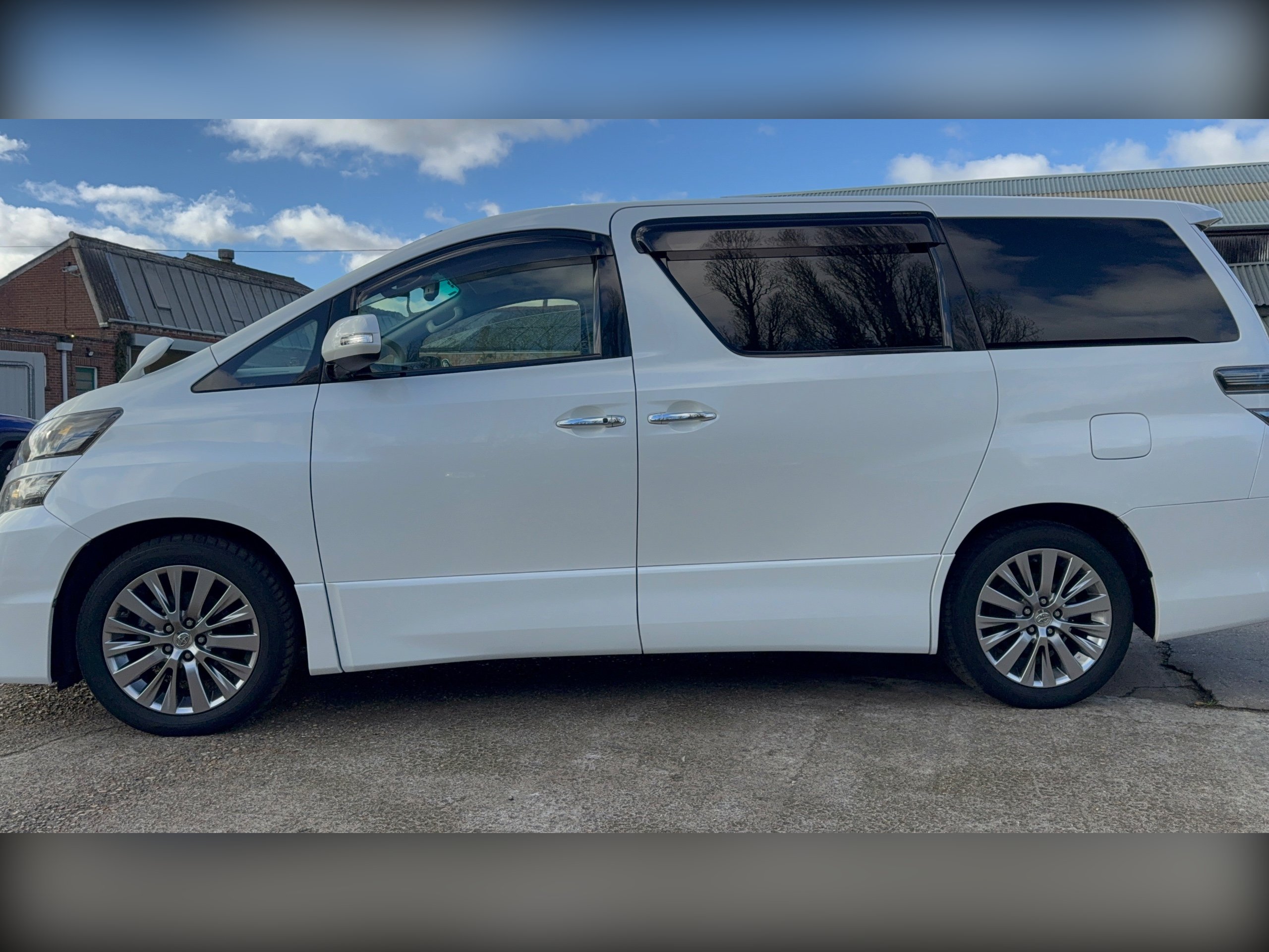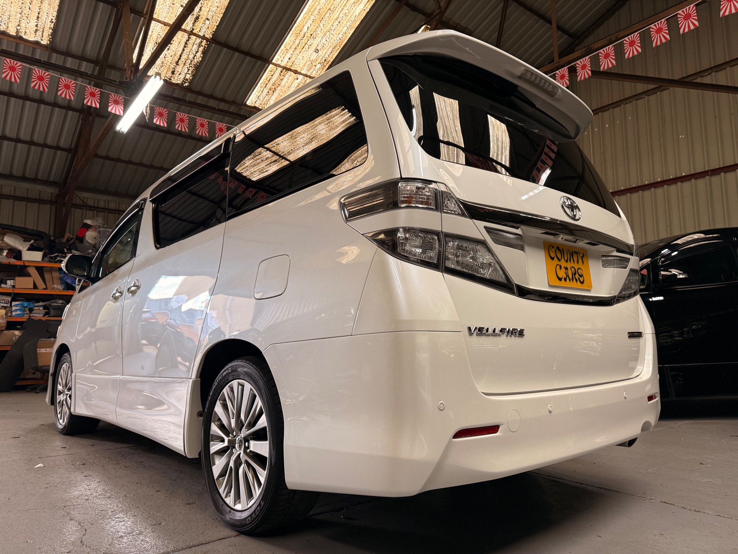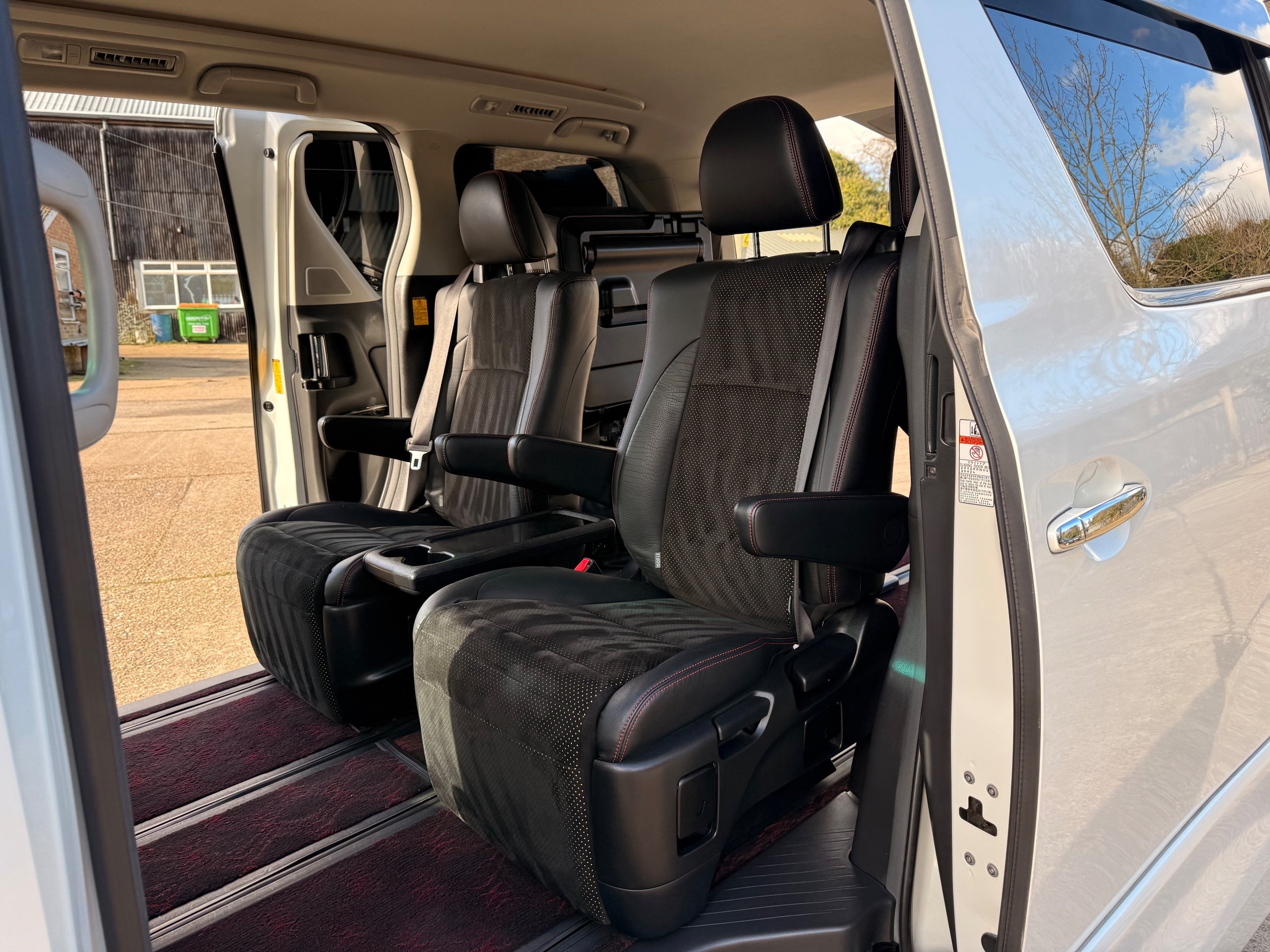 2014 Toyota Vellfire 2.4Z GOLDEN EYES EDITION 2 2014-64Reg, Face-lift edition, Finished in Stunning Unmarked Pearlescent White paintwork, Twin Electric Soft Closing Sliding Doors, Electric Soft closing Tailgate, Front spots With chrome surrounds, Full Privacy Glass, Rear Spoiler with built in brake light, Unmarked Genuine 18” Golden Eyes dark silver Alloys, Key-less Entry, Key-less start, Twin Golden Light elements, 7 Seater 7 Unblemished Half leather seats with red stitching and Golden Spots, The Front Seats have armrests, Centre console with flip up cup holders, The centre seats are Lounge style seats with extra leg rests and twin armrests on each seat, The seats also slide forwards and backwards and side to side with a folding centre table with built in cup holders, easy access to the rear seats, Isofix centre seats, The rear seats fold away to give way to a large boot, Strip L.E.D lighting, Ambient lighting, Push button Start, Front and Rear parking sensors, Traction Control, Front and Rear Electric windows, Colour reversing camera, Isofix points, Stereo System with Apple CarPlay, Red and Black Golden eyes floor mats, Cruise Control, Only covered a Genuine 66,000 Miles With All the Genuine paperwork from Japan including the auction sheet and D-Reg form which both prove the mileage and condition before it left Japan