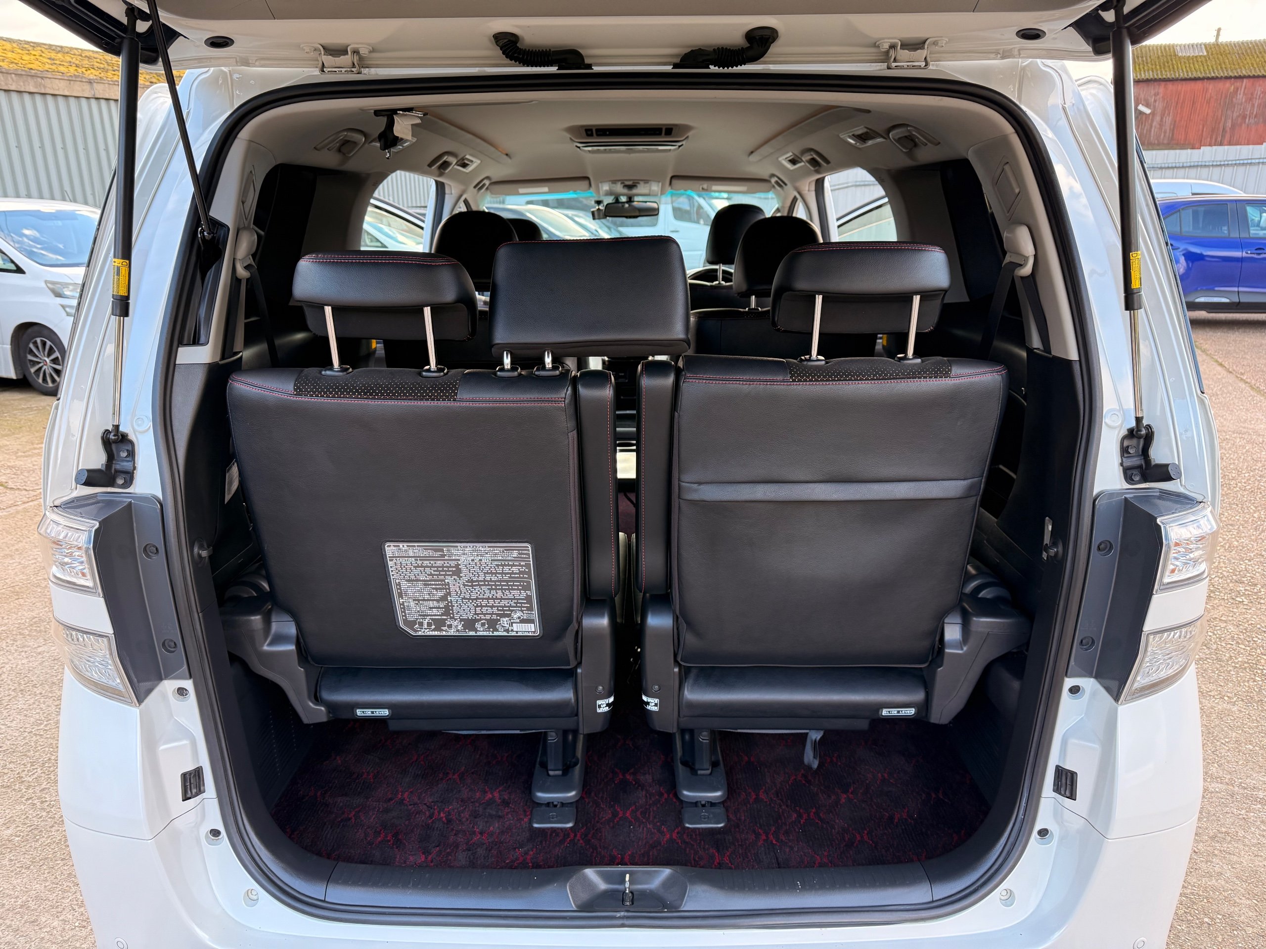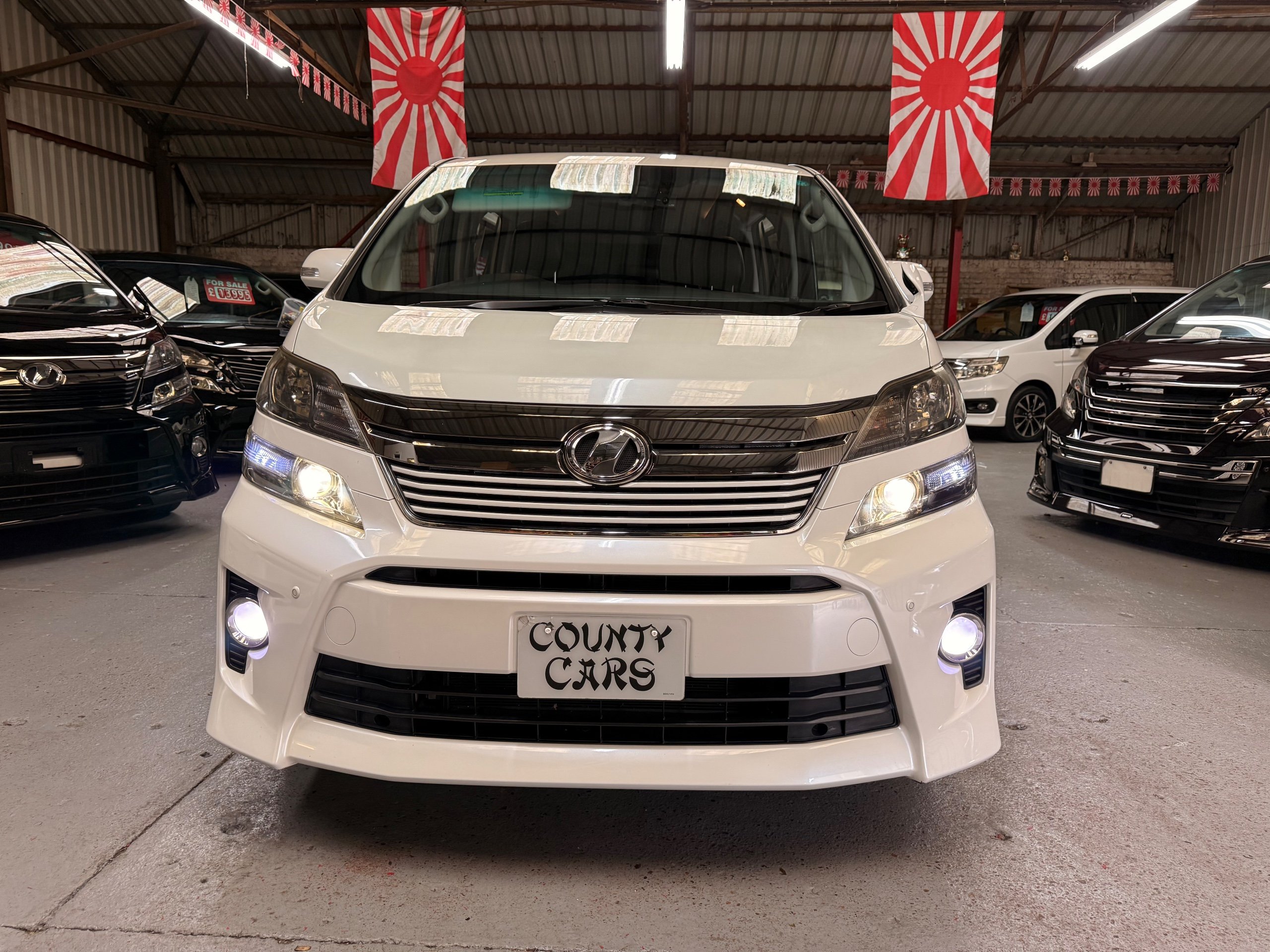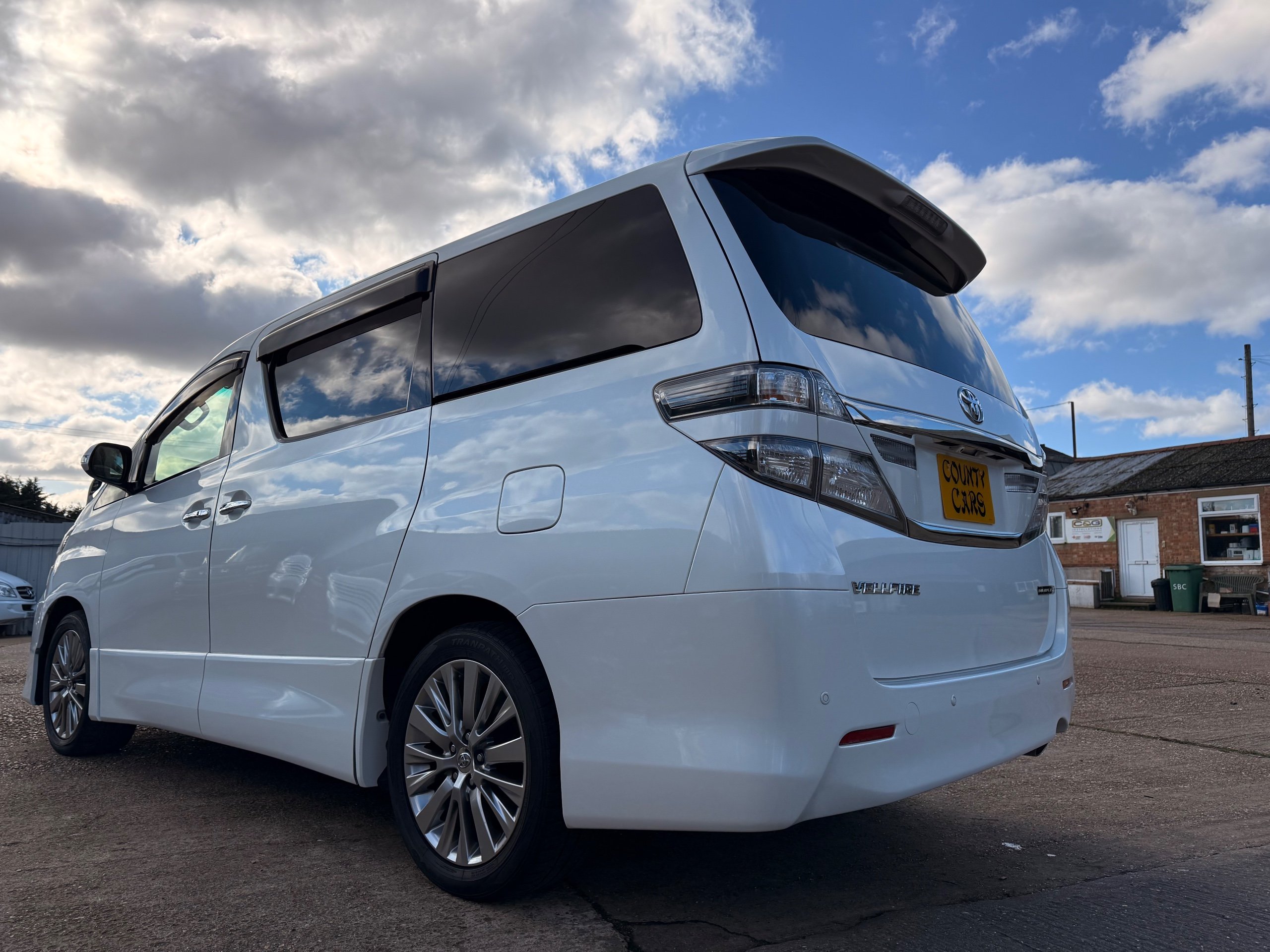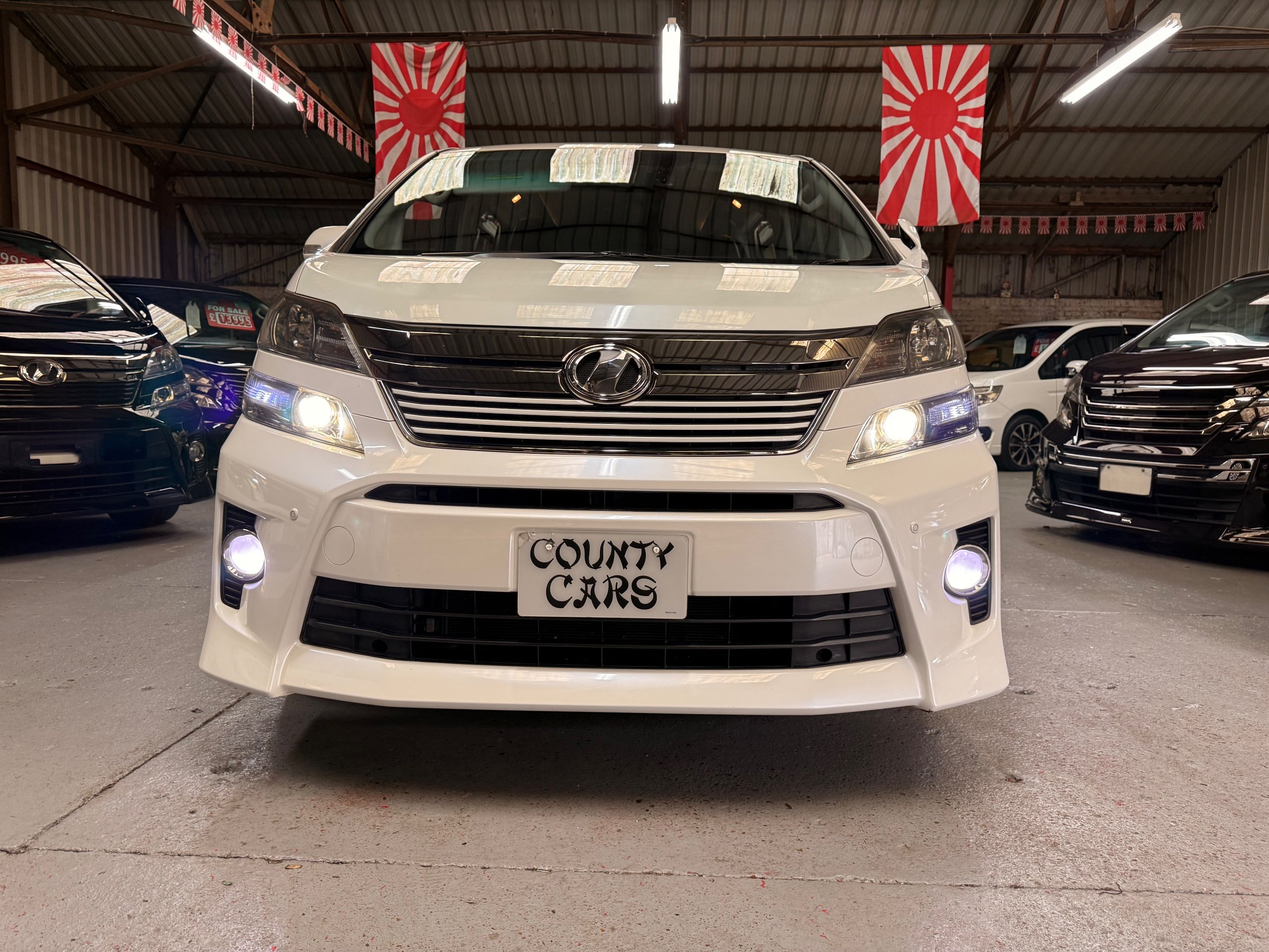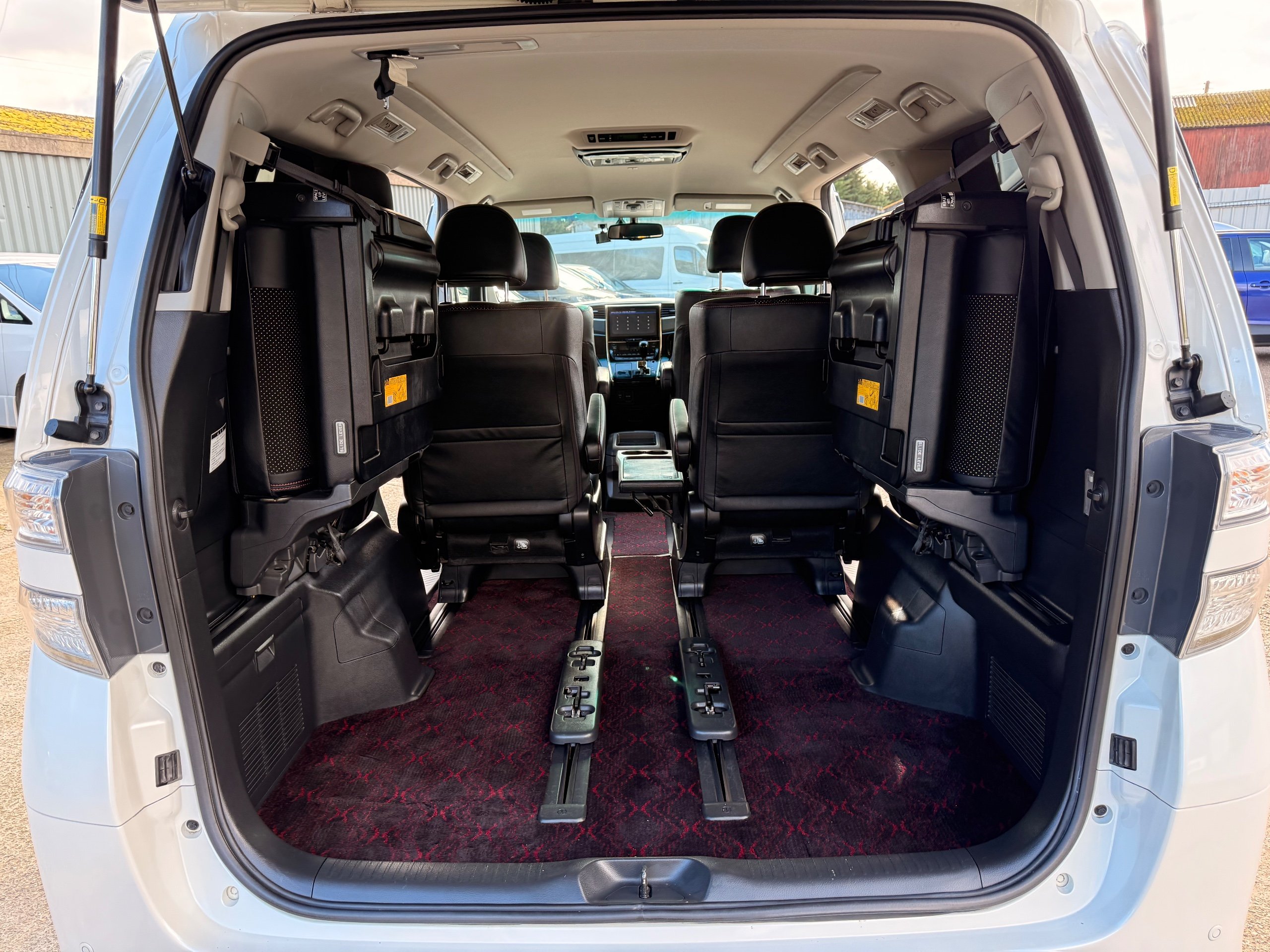 2014 Toyota Vellfire 2.4Z GOLDEN EYES EDITION 2 2014-64Reg, Face-lift edition, Finished in Stunning Unmarked Pearlescent White paintwork, Twin Electric Soft Closing Sliding Doors, Electric Soft closing Tailgate, Front spots With chrome surrounds, Full Privacy Glass, Rear Spoiler with built in brake light, Unmarked Genuine 18” Golden Eyes dark silver Alloys, Key-less Entry, Key-less start, Twin Golden Light elements, 7 Seater 7 Unblemished Half leather seats with red stitching and Golden Spots, The Front Seats have armrests, Centre console with flip up cup holders, The centre seats are Lounge style seats with extra leg rests and twin armrests on each seat, The seats also slide forwards and backwards and side to side with a folding centre table with built in cup holders, easy access to the rear seats, Isofix centre seats, The rear seats fold away to give way to a large boot, Strip L.E.D lighting, Ambient lighting, Push button Start, Front and Rear parking sensors, Traction Control, Front and Rear Electric windows, Colour reversing camera, Isofix points, Stereo System with Apple CarPlay, Red and Black Golden eyes floor mats, Cruise Control, Only covered a Genuine 66,000 Miles With All the Genuine paperwork from Japan including the auction sheet and D-Reg form which both prove the mileage and condition before it left Japan
