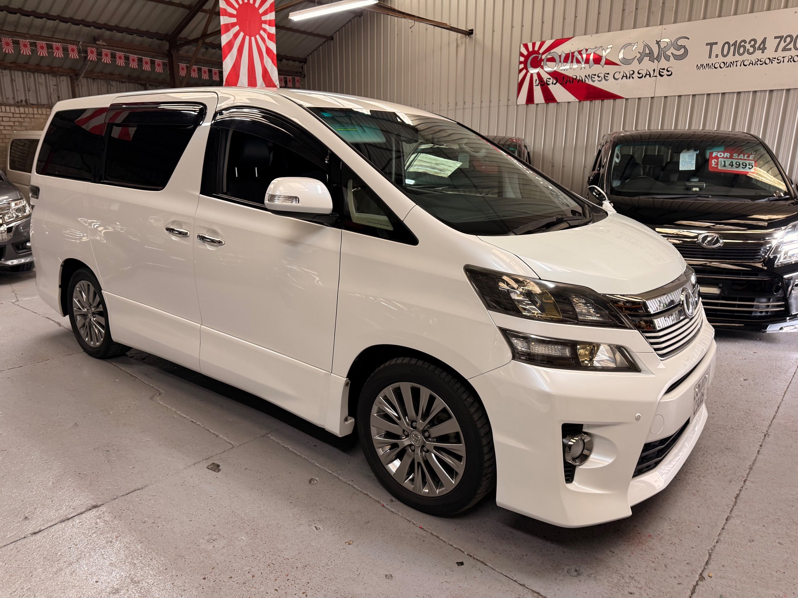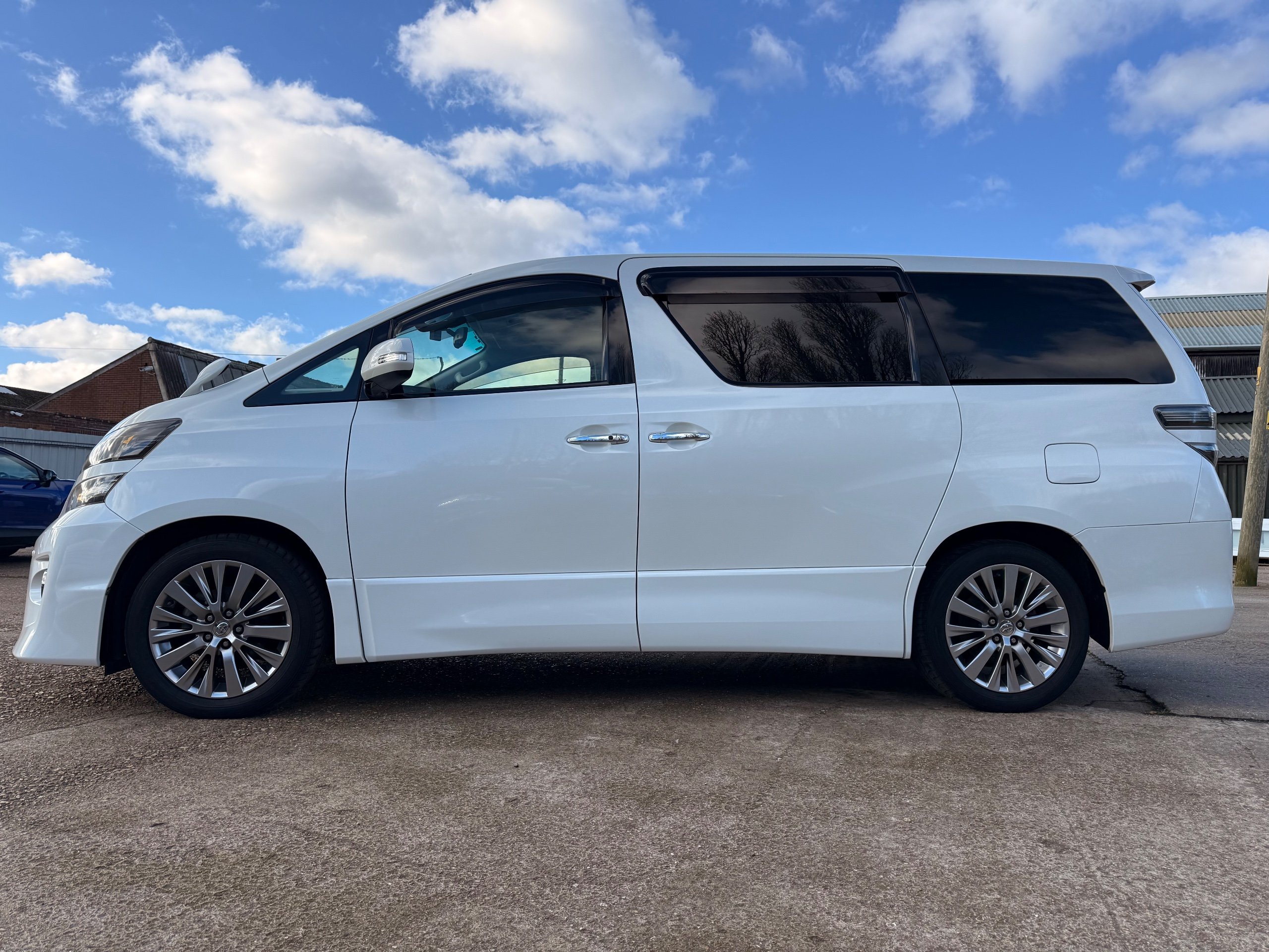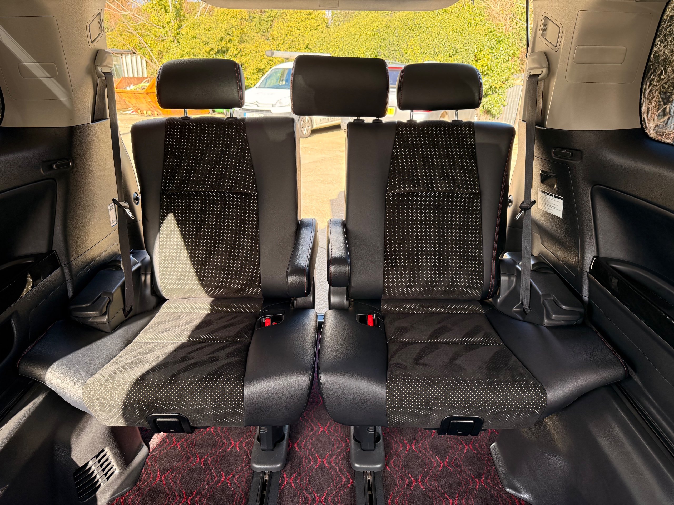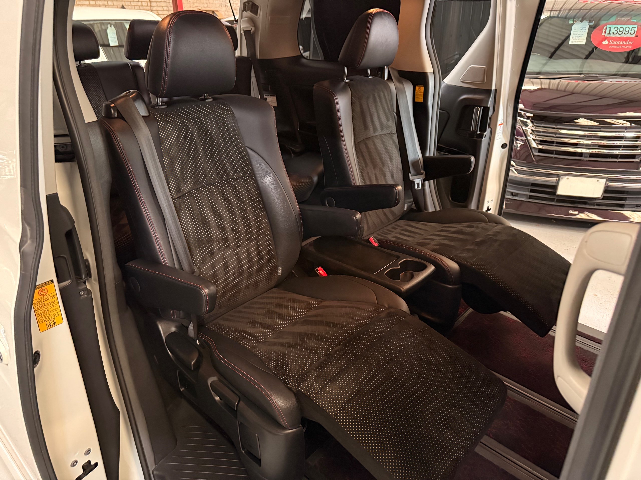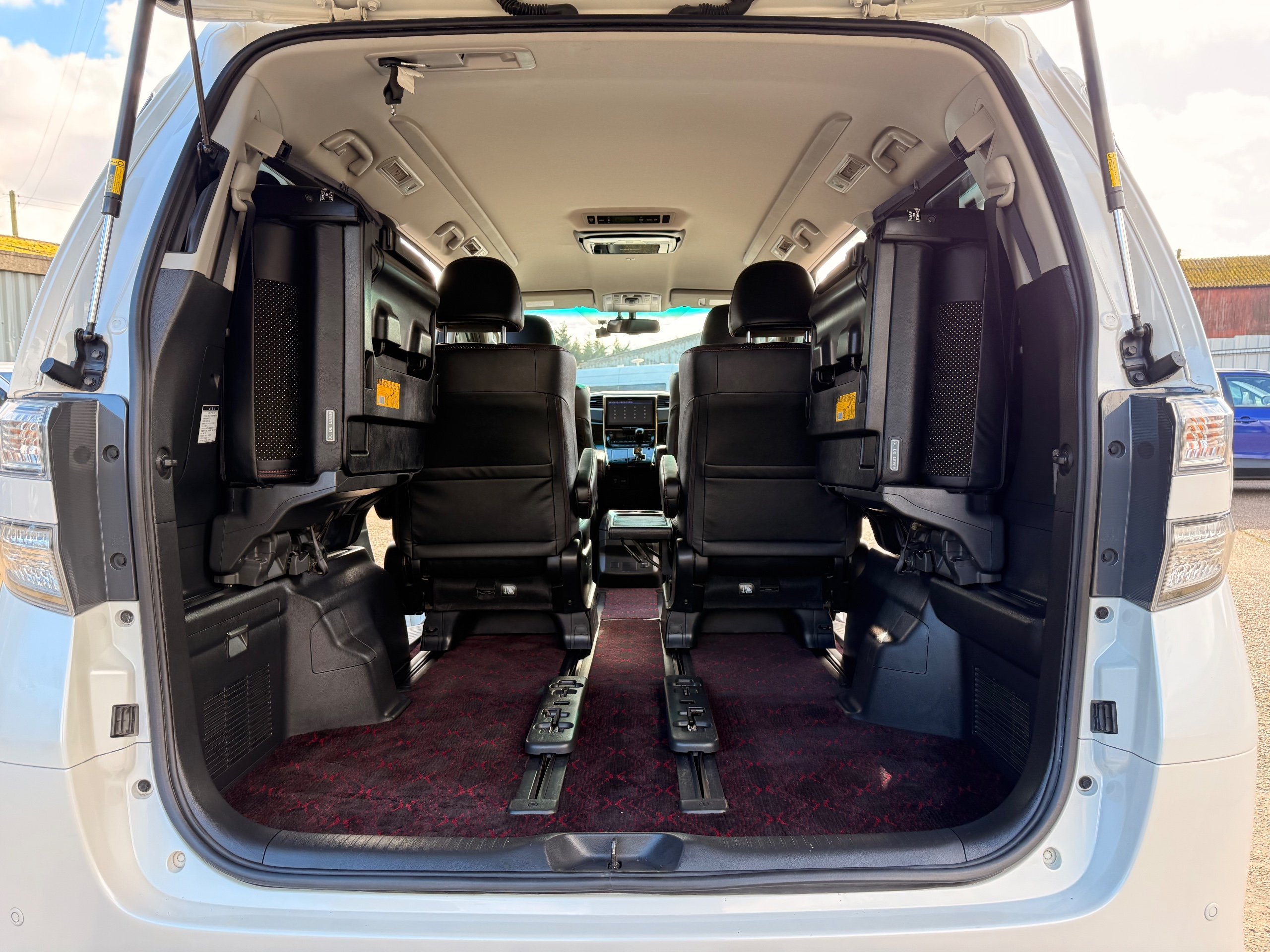 2014 Toyota Vellfire 2.4Z GOLDEN EYES EDITION 2 2014-64Reg, Face-lift edition, Finished in Stunning Unmarked Pearlescent White paintwork, Twin Electric Soft Closing Sliding Doors, Electric Soft closing Tailgate, Front spots With chrome surrounds, Full Privacy Glass, Rear Spoiler with built in brake light, Unmarked Genuine 18” Golden Eyes dark silver Alloys, Key-less Entry, Key-less start, Twin Golden Light elements, 7 Seater 7 Unblemished Half leather seats with red stitching and Golden Spots, The Front Seats have armrests, Centre console with flip up cup holders, The centre seats are Lounge style seats with extra leg rests and twin armrests on each seat, The seats also slide forwards and backwards and side to side with a folding centre table with built in cup holders, easy access to the rear seats, Isofix centre seats, The rear seats fold away to give way to a large boot, Strip L.E.D lighting, Ambient lighting, Push button Start, Front and Rear parking sensors, Traction Control, Front and Rear Electric windows, Colour reversing camera, Isofix points, Stereo System with Apple CarPlay, Red and Black Golden eyes floor mats, Cruise Control, Only covered a Genuine 66,000 Miles With All the Genuine paperwork from Japan including the auction sheet and D-Reg form which both prove the mileage and condition before it left Japan