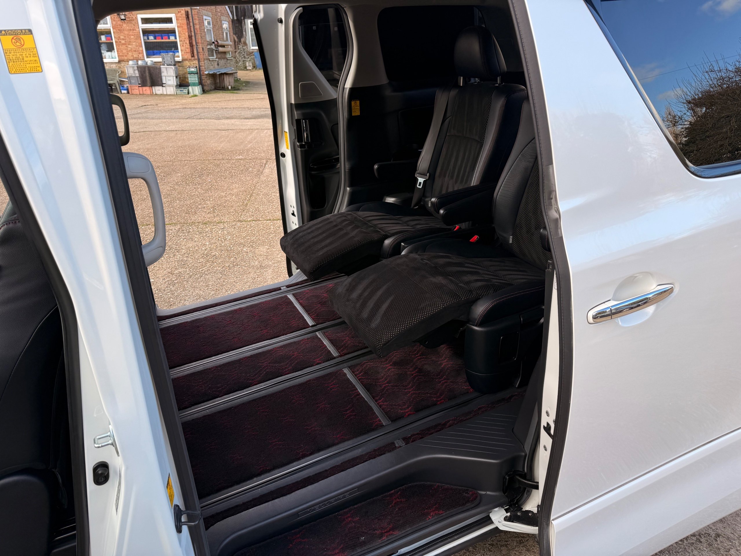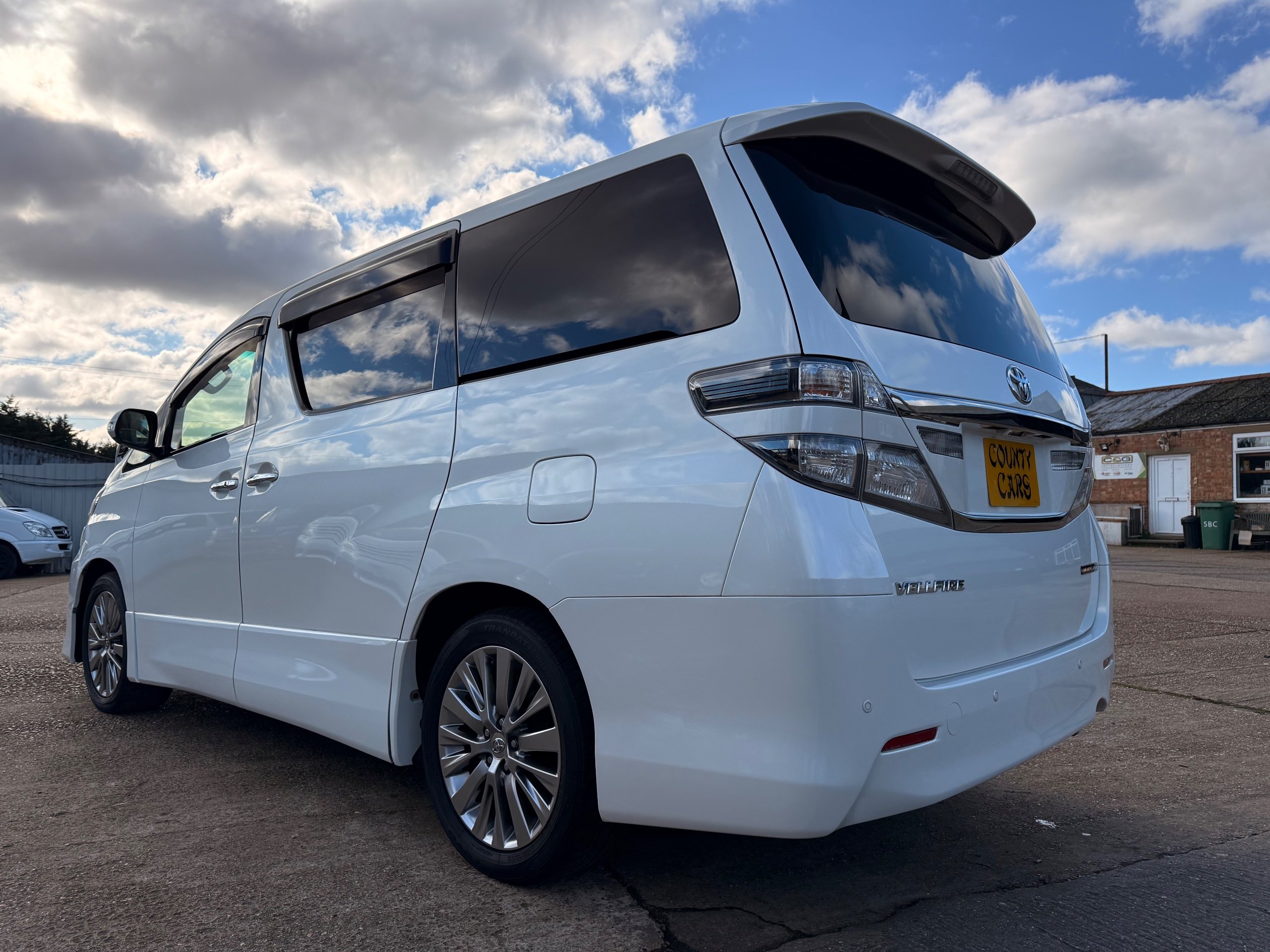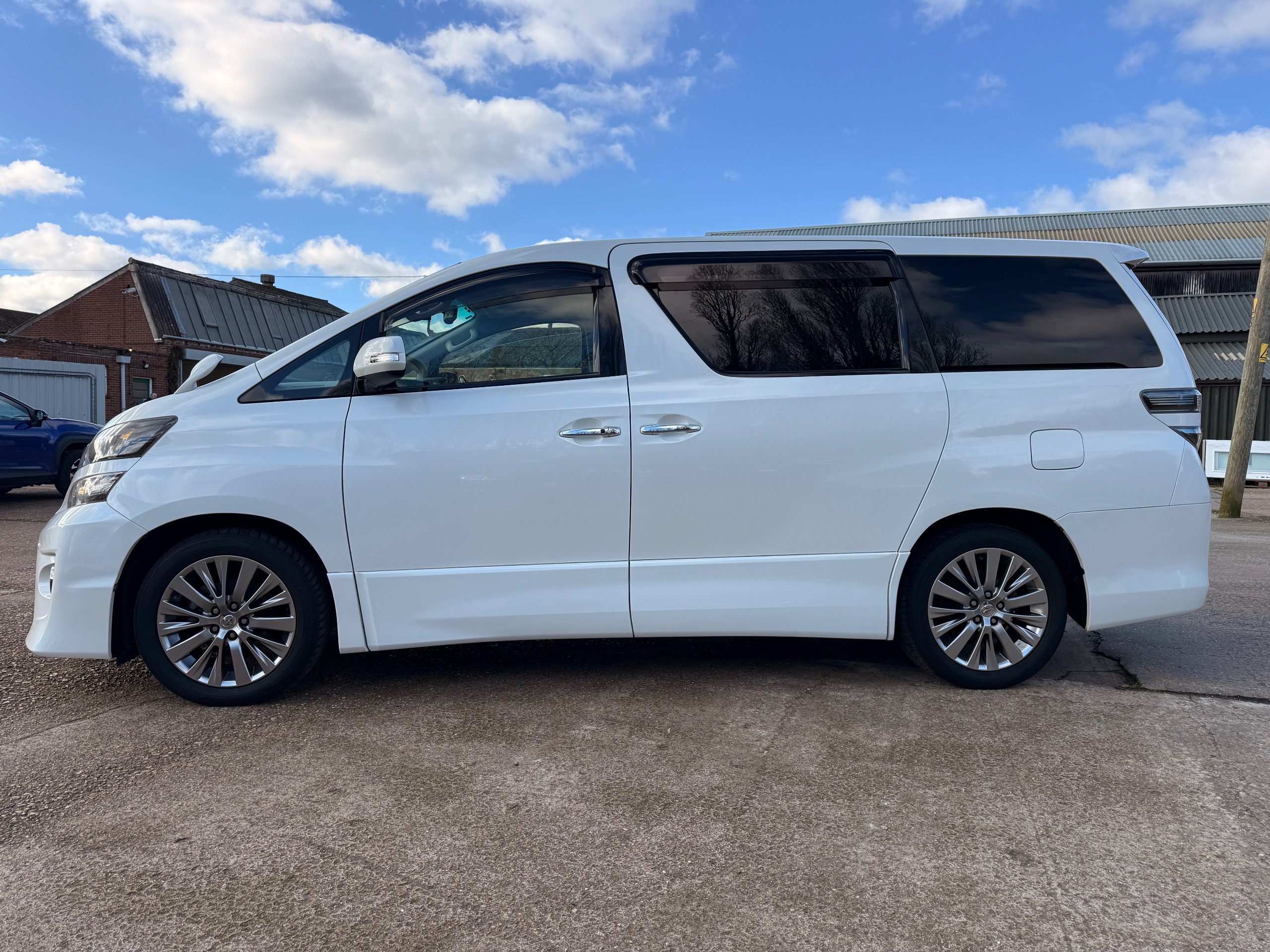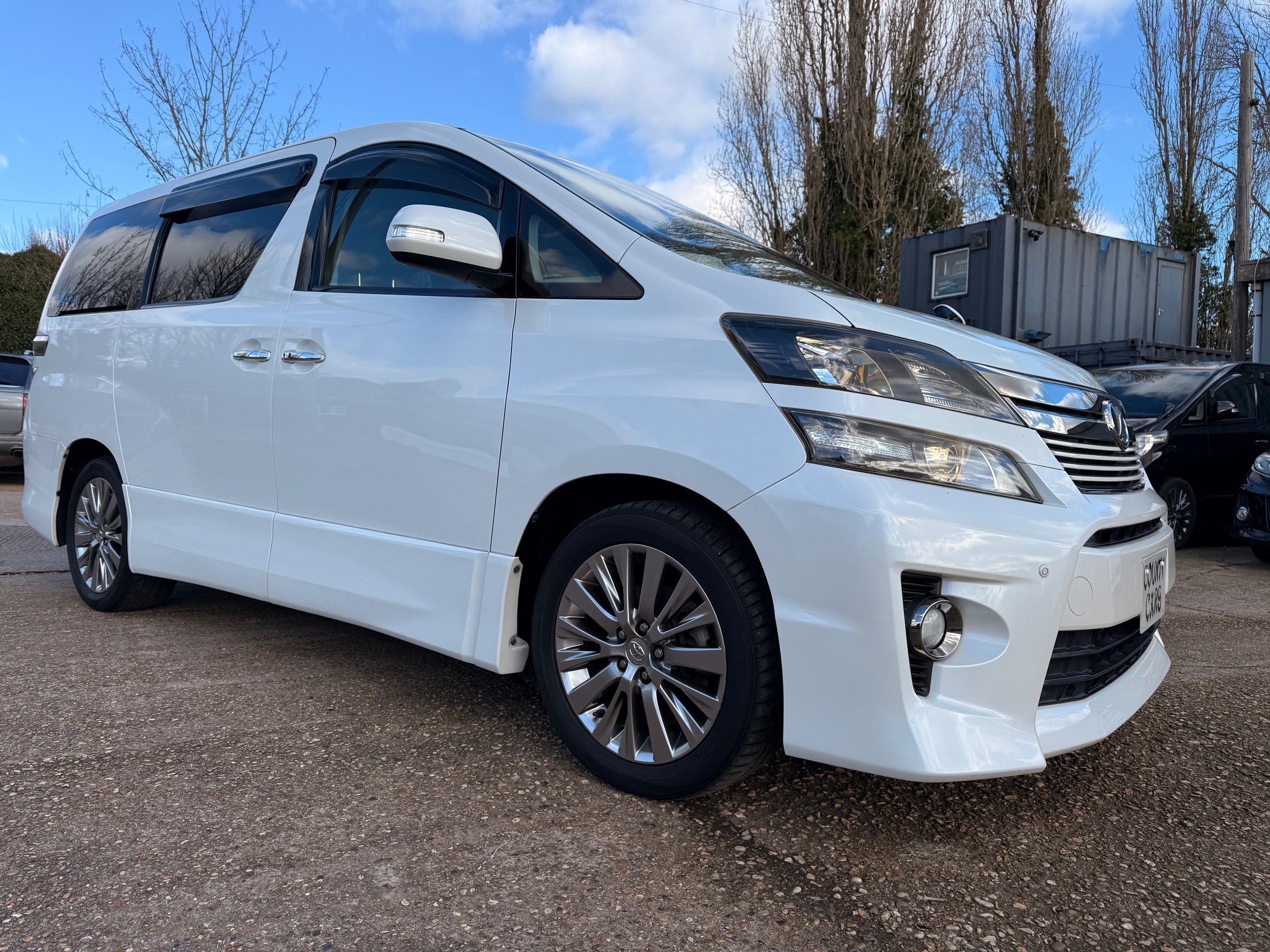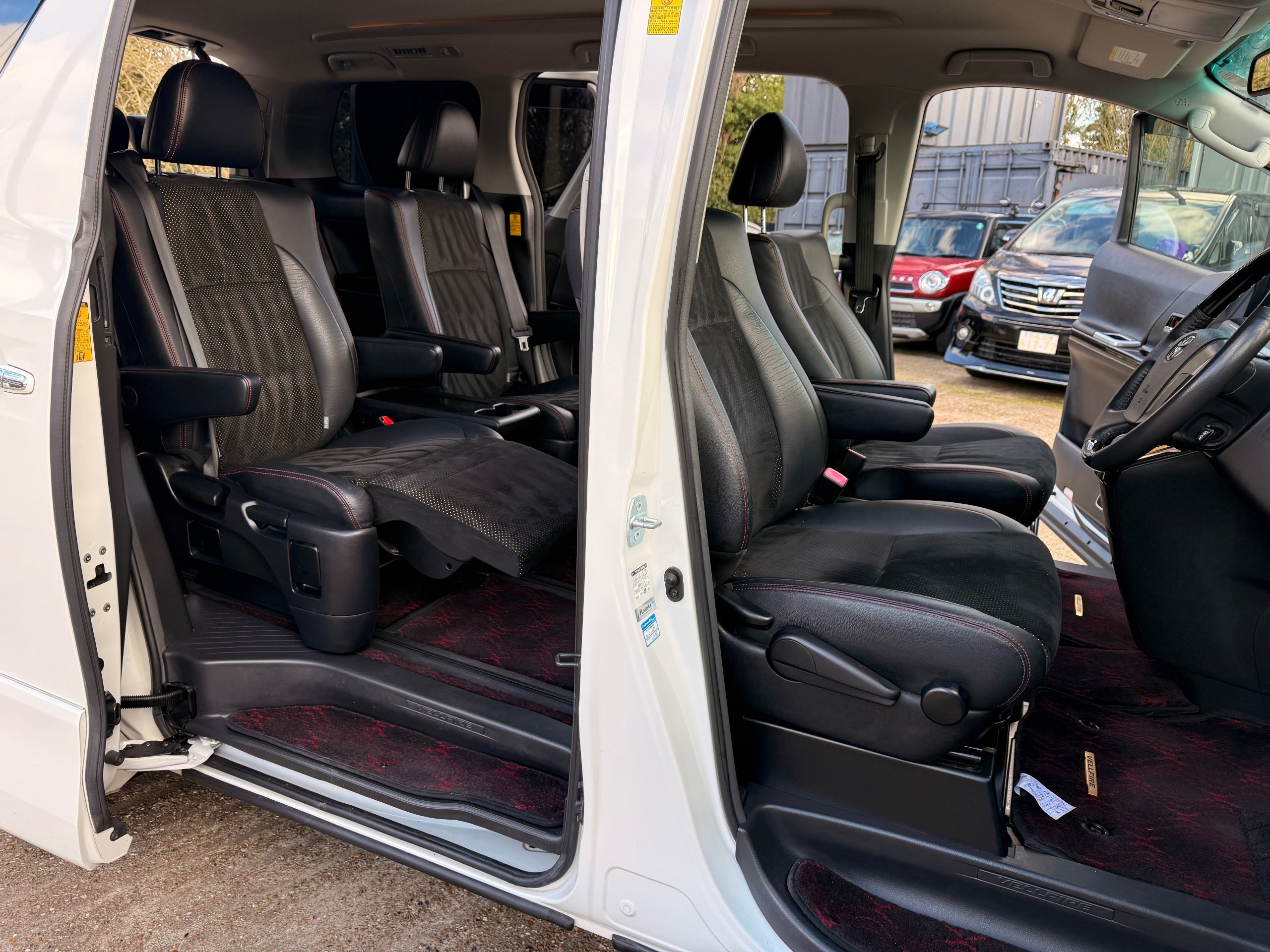 2014 Toyota Vellfire 2.4Z GOLDEN EYES EDITION 2 2014-64Reg, Face-lift edition, Finished in Stunning Unmarked Pearlescent White paintwork, Twin Electric Soft Closing Sliding Doors, Electric Soft closing Tailgate, Front spots With chrome surrounds, Full Privacy Glass, Rear Spoiler with built in brake light, Unmarked Genuine 18” Golden Eyes dark silver Alloys, Key-less Entry, Key-less start, Twin Golden Light elements, 7 Seater 7 Unblemished Half leather seats with red stitching and Golden Spots, The Front Seats have armrests, Centre console with flip up cup holders, The centre seats are Lounge style seats with extra leg rests and twin armrests on each seat, The seats also slide forwards and backwards and side to side with a folding centre table with built in cup holders, easy access to the rear seats, Isofix centre seats, The rear seats fold away to give way to a large boot, Strip L.E.D lighting, Ambient lighting, Push button Start, Front and Rear parking sensors, Traction Control, Front and Rear Electric windows, Colour reversing camera, Isofix points, Stereo System with Apple CarPlay, Red and Black Golden eyes floor mats, Cruise Control, Only covered a Genuine 66,000 Miles With All the Genuine paperwork from Japan including the auction sheet and D-Reg form which both prove the mileage and condition before it left Japan