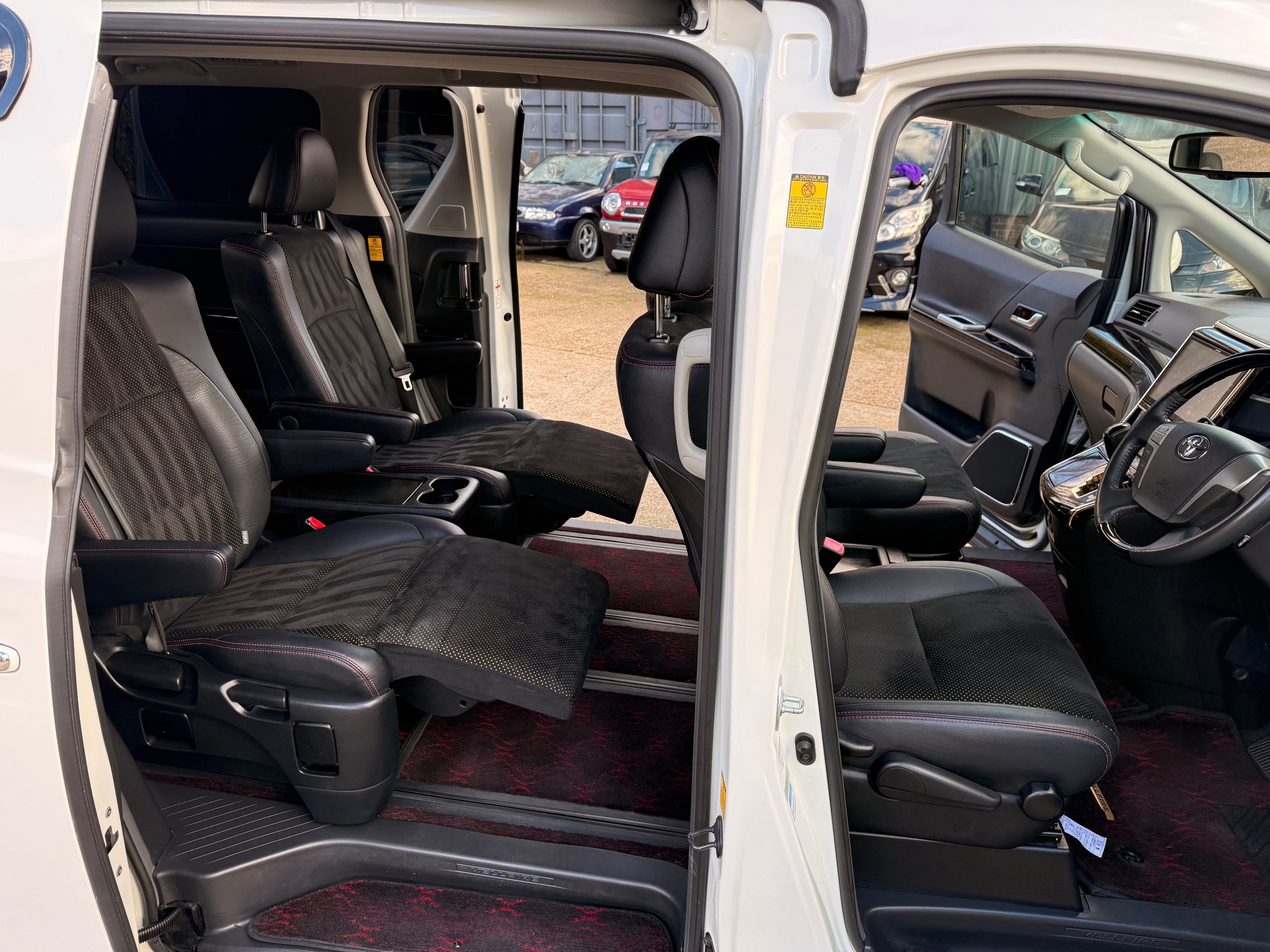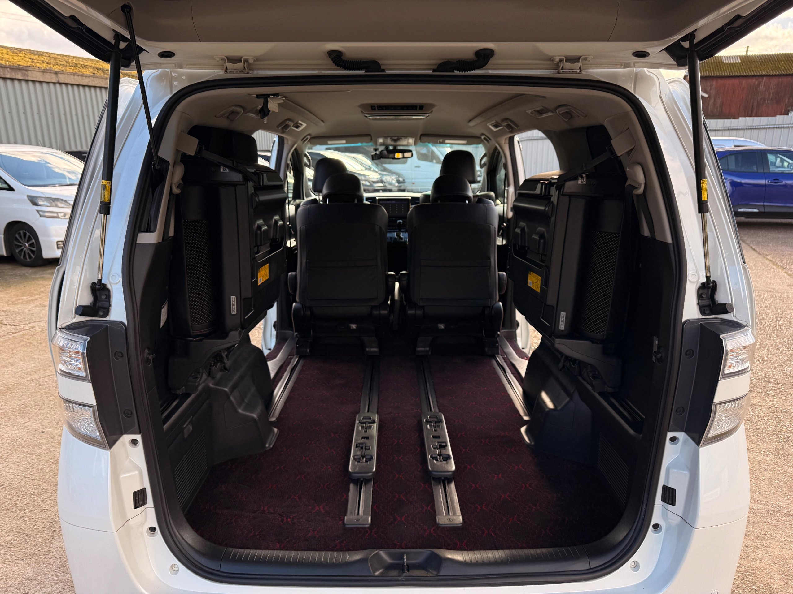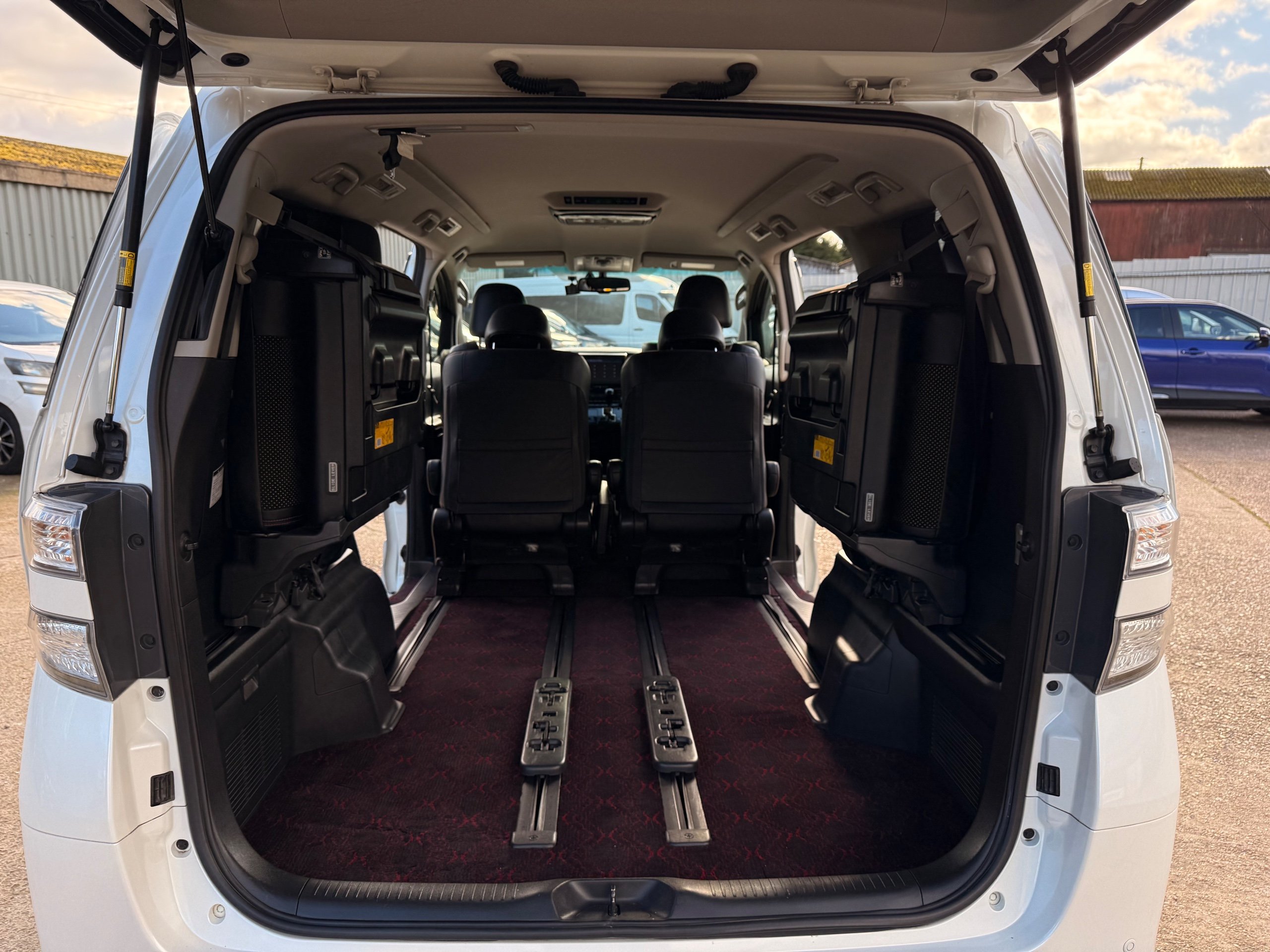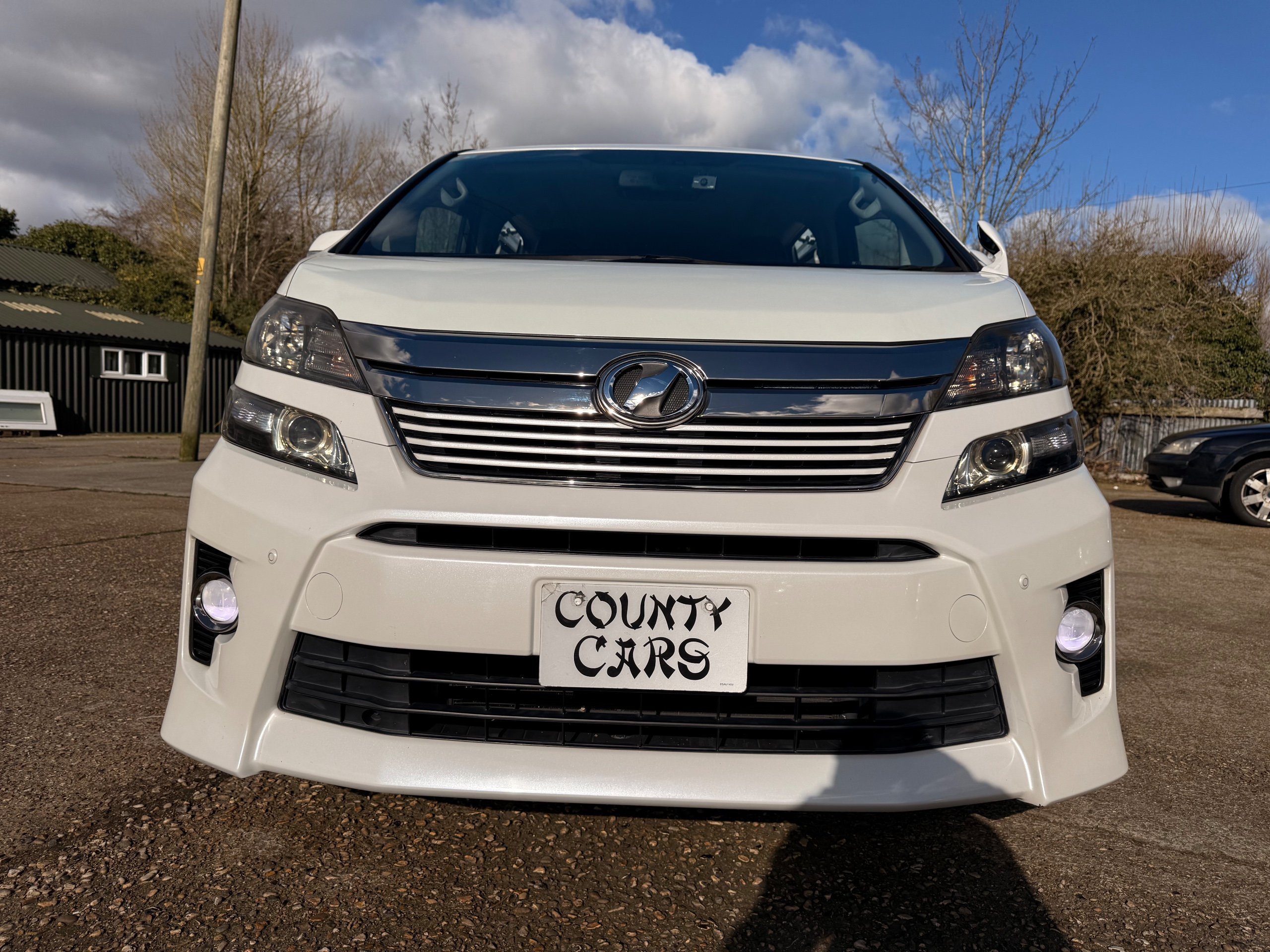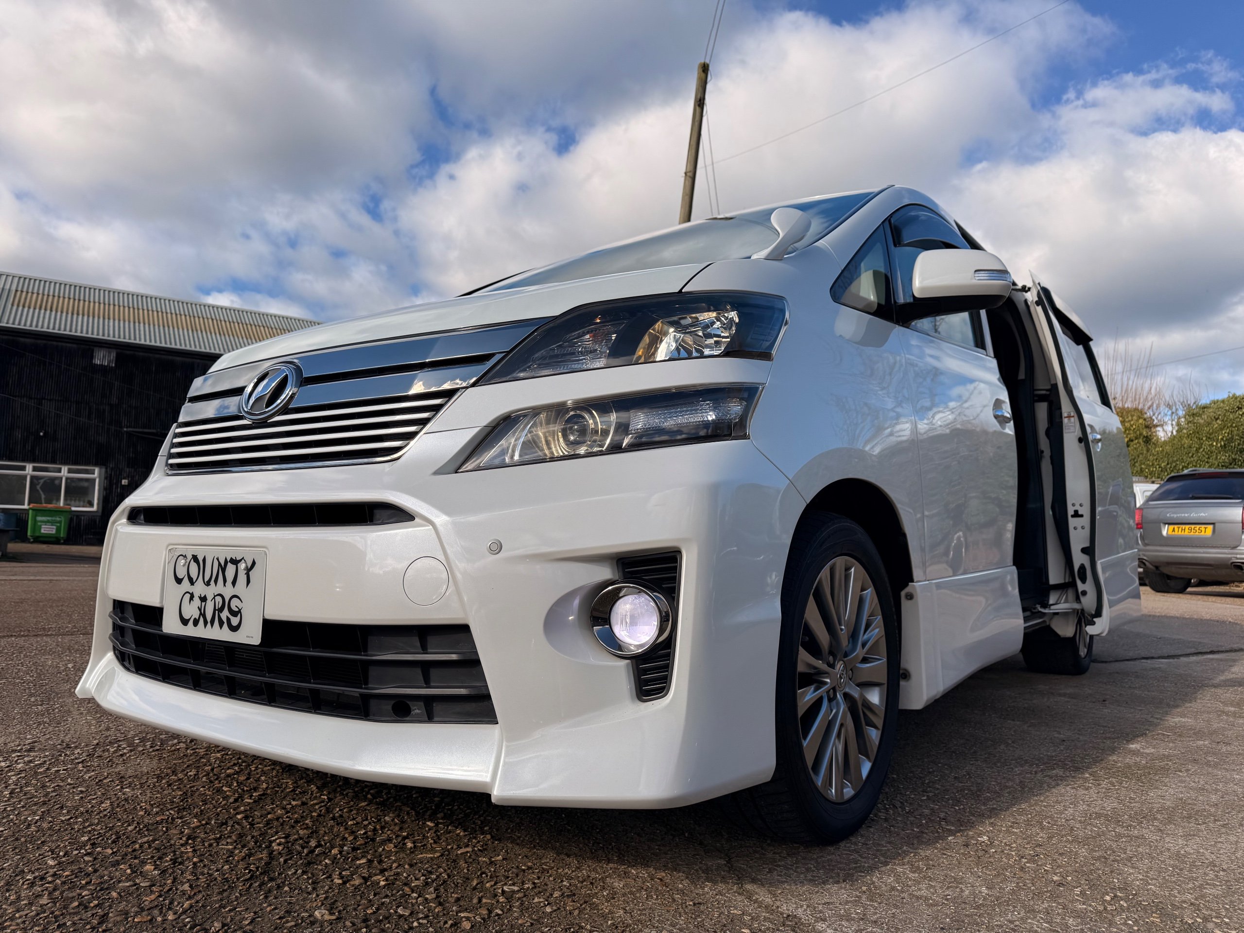 2014 Toyota Vellfire 2.4Z GOLDEN EYES EDITION 2 2014-64Reg, Face-lift edition, Finished in Stunning Unmarked Pearlescent White paintwork, Twin Electric Soft Closing Sliding Doors, Electric Soft closing Tailgate, Front spots With chrome surrounds, Full Privacy Glass, Rear Spoiler with built in brake light, Unmarked Genuine 18” Golden Eyes dark silver Alloys, Key-less Entry, Key-less start, Twin Golden Light elements, 7 Seater 7 Unblemished Half leather seats with red stitching and Golden Spots, The Front Seats have armrests, Centre console with flip up cup holders, The centre seats are Lounge style seats with extra leg rests and twin armrests on each seat, The seats also slide forwards and backwards and side to side with a folding centre table with built in cup holders, easy access to the rear seats, Isofix centre seats, The rear seats fold away to give way to a large boot, Strip L.E.D lighting, Ambient lighting, Push button Start, Front and Rear parking sensors, Traction Control, Front and Rear Electric windows, Colour reversing camera, Isofix points, Stereo System with Apple CarPlay, Red and Black Golden eyes floor mats, Cruise Control, Only covered a Genuine 66,000 Miles With All the Genuine paperwork from Japan including the auction sheet and D-Reg form which both prove the mileage and condition before it left Japan