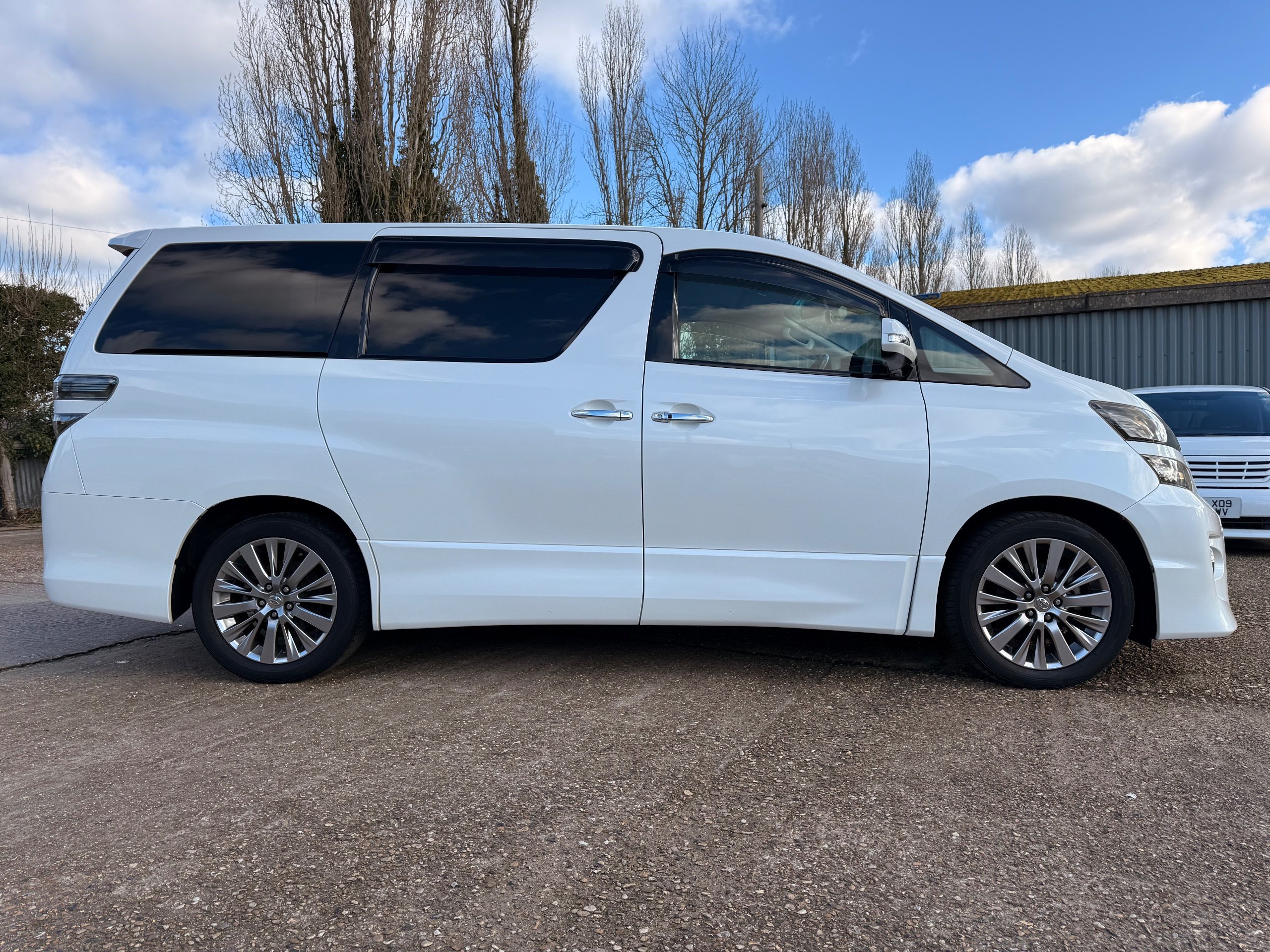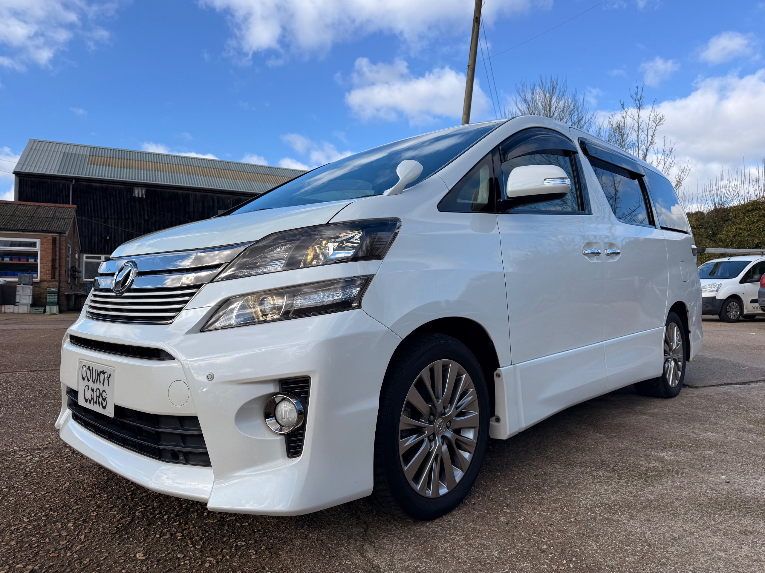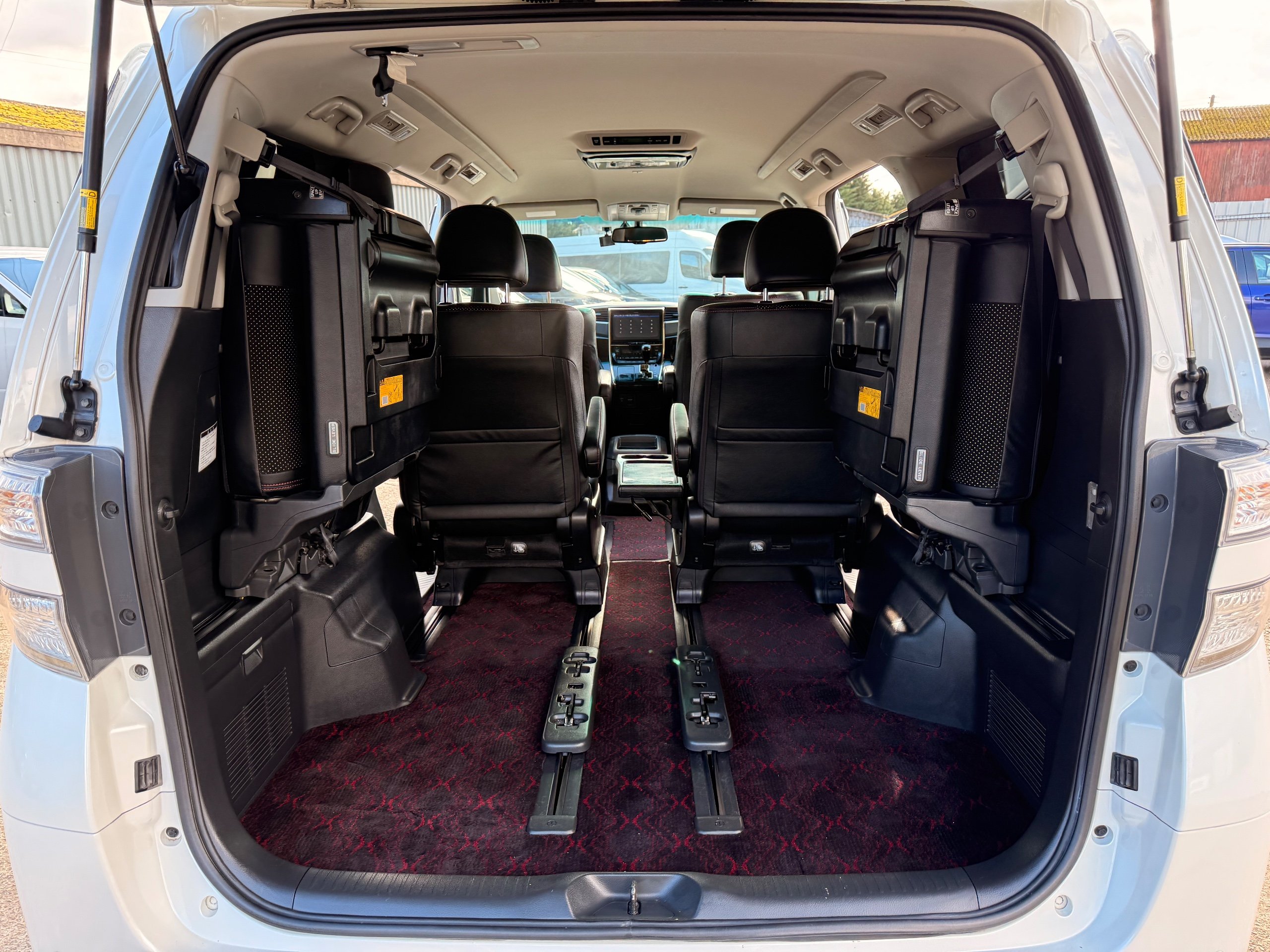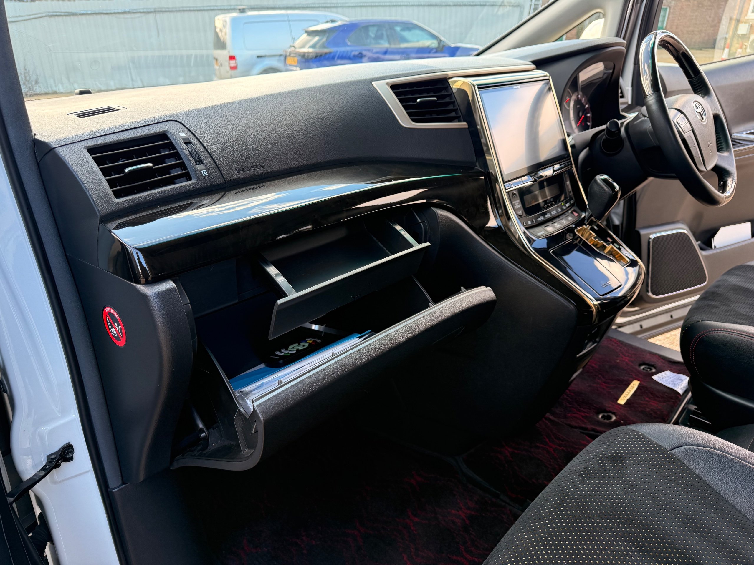 2014 Toyota Vellfire 2.4Z GOLDEN EYES EDITION 2 2014-64Reg, Face-lift edition, Finished in Stunning Unmarked Pearlescent White paintwork, Twin Electric Soft Closing Sliding Doors, Electric Soft closing Tailgate, Front spots With chrome surrounds, Full Privacy Glass, Rear Spoiler with built in brake light, Unmarked Genuine 18” Golden Eyes dark silver Alloys, Key-less Entry, Key-less start, Twin Golden Light elements, 7 Seater 7 Unblemished Half leather seats with red stitching and Golden Spots, The Front Seats have armrests, Centre console with flip up cup holders, The centre seats are Lounge style seats with extra leg rests and twin armrests on each seat, The seats also slide forwards and backwards and side to side with a folding centre table with built in cup holders, easy access to the rear seats, Isofix centre seats, The rear seats fold away to give way to a large boot, Strip L.E.D lighting, Ambient lighting, Push button Start, Front and Rear parking sensors, Traction Control, Front and Rear Electric windows, Colour reversing camera, Isofix points, Stereo System with Apple CarPlay, Red and Black Golden eyes floor mats, Cruise Control, Only covered a Genuine 66,000 Miles With All the Genuine paperwork from Japan including the auction sheet and D-Reg form which both prove the mileage and condition before it left Japan