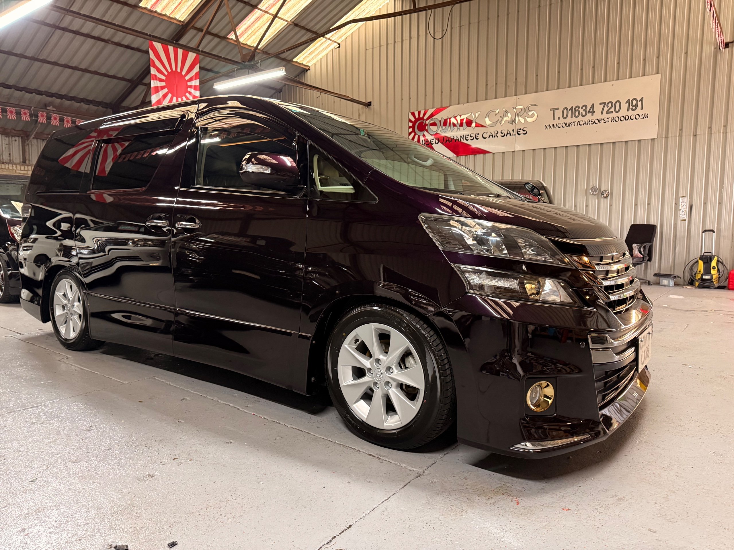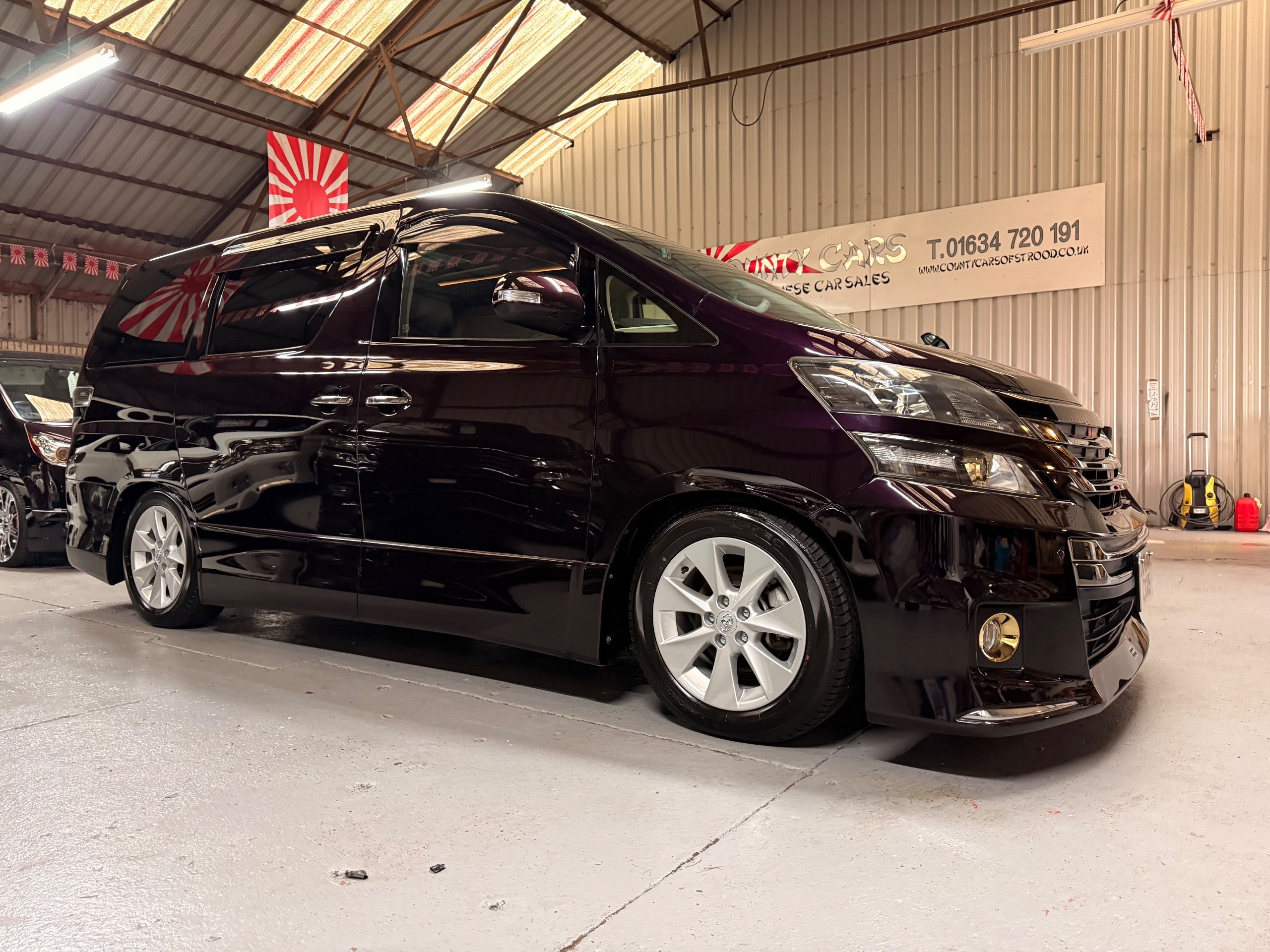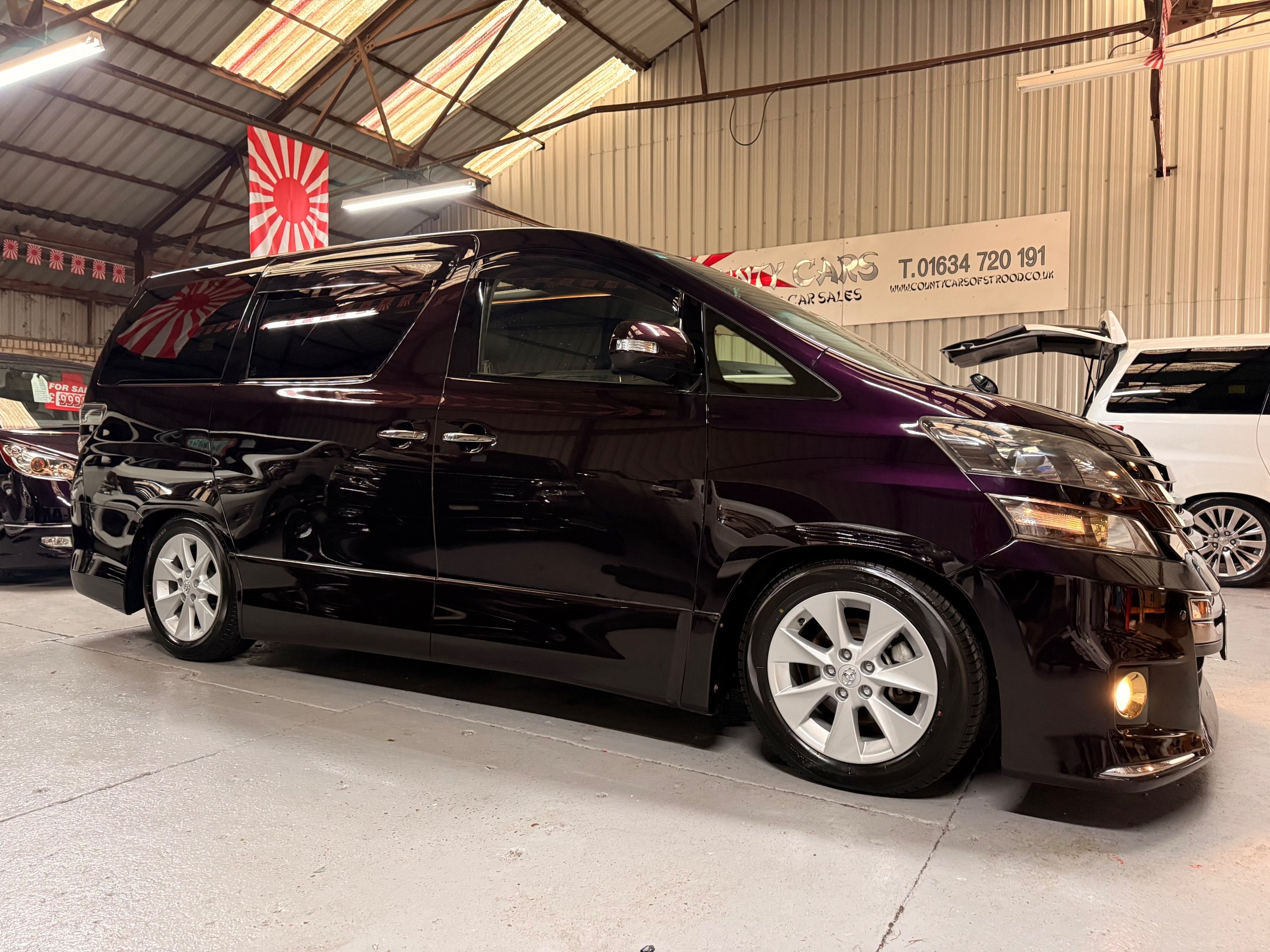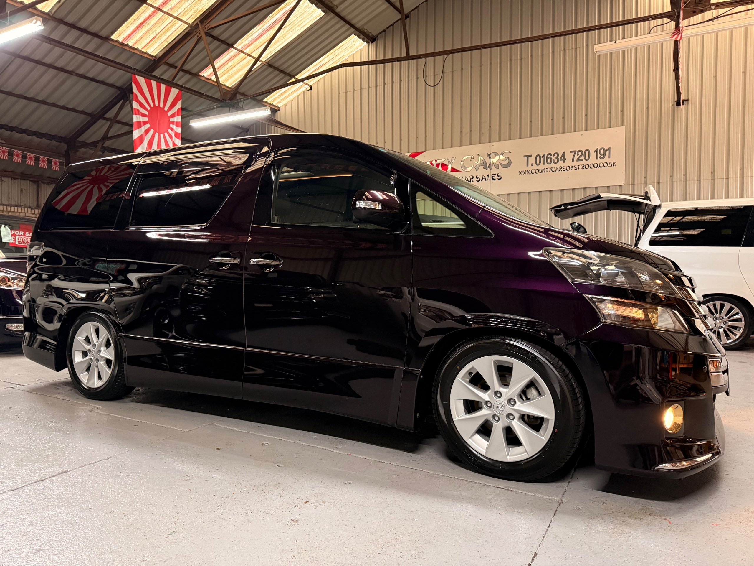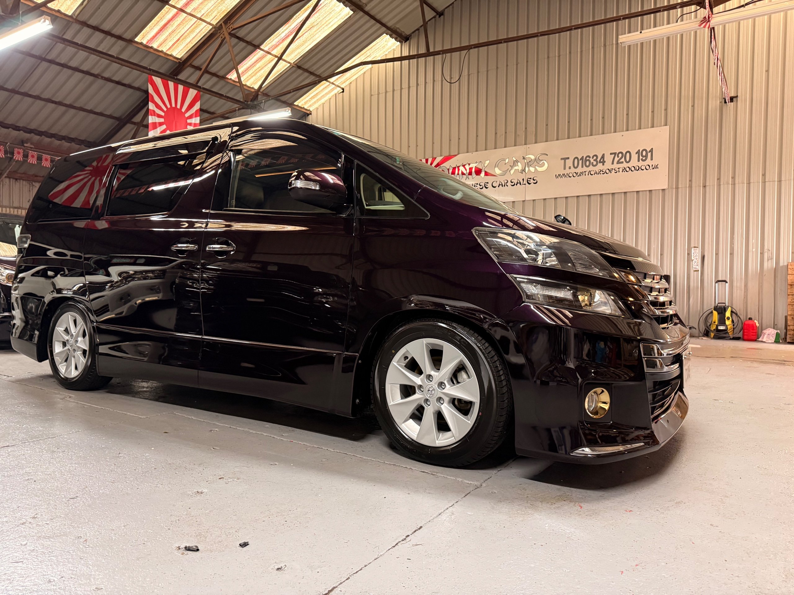 2013 Toyota Vellfire 2.4Z GOLDEN EYES EDITION 2013-63-Reg, Face-lift edition, Finished in Stunning Metallic Purple paintwork, Twin Electric Soft Closing Sliding Doors, Electric Soft closing Tailgate, Twin Sunroofs, Rear Electric Sunroof, Front spots with Gold Surrounds, Full Privacy Glass, Rear Spoiler with built in brake light, 18” Toyota dark silver Alloys, Hodellista Front grille and Front Splitter, Key-less Entry, Key-less start, 7 Seater 7 Unblemished Half Black leather seats with red stitching, The Front Seats have armrests, Centre console with flip up cup holders, The centre seats are Lounge style seats with extra leg rests and twin armrests on each seat, The seats also slide forwards and backwards and side to side with a folding centre table with built in cup holders, easy access to the rear seats, Isofix centre seats, The rear seats fold away to give way to a large boot, Strip L.E.D lighting, Ambient lighting, Push button Start, Front and Rear parking sensors, Traction Control, Front and Rear Electric windows, Twin Sunroofs, Colour reversing camera, Isofix points, Stereo System with Apple CarPlay,Red and Black Golden eyes floor mats, Cruise Control, Only covered a Genuine 73,000 Miles With All the Genuine paperwork from Japan including the auction sheet and Export Certificate which both prove the mileage and condition before it left Japan
