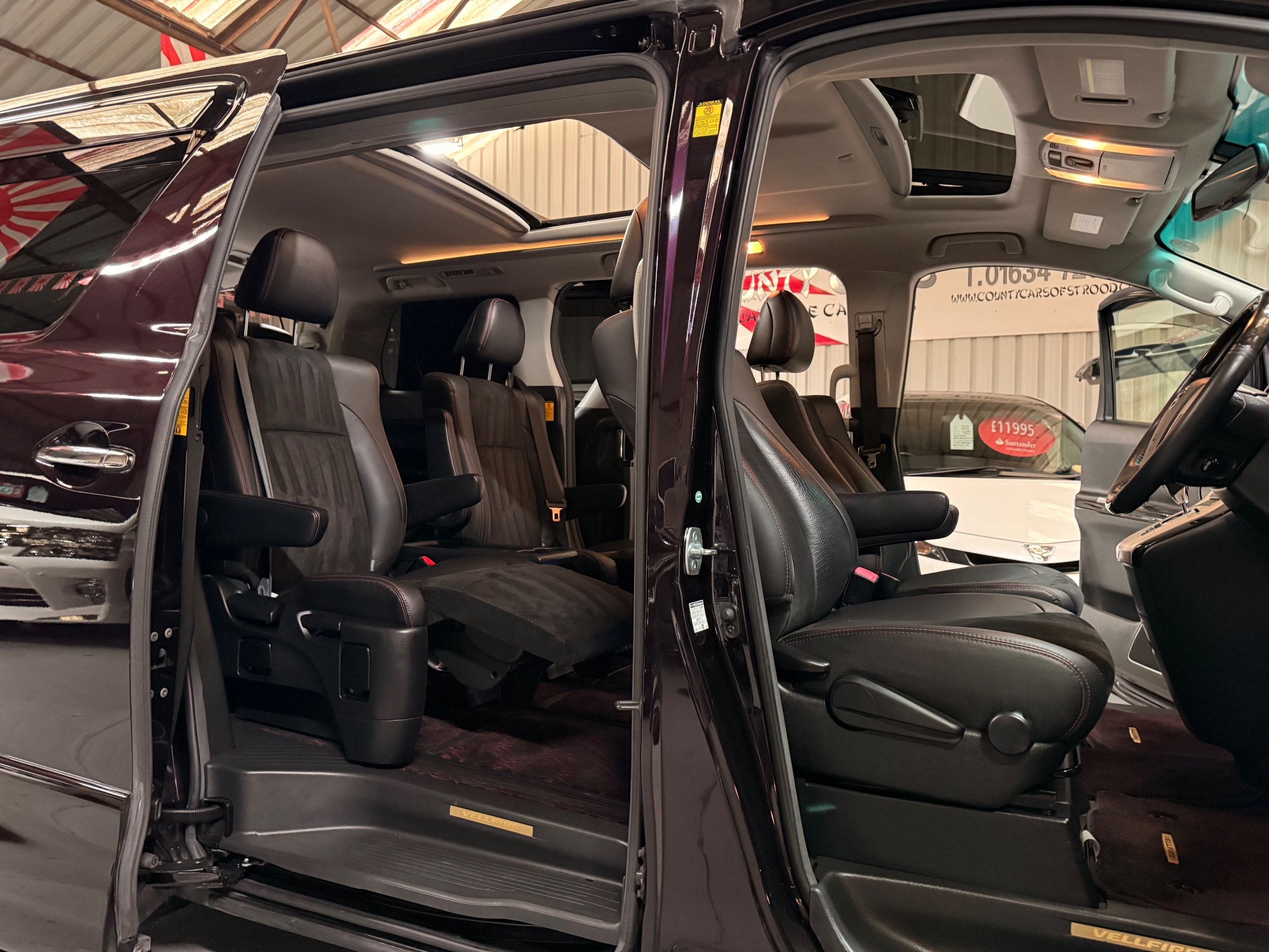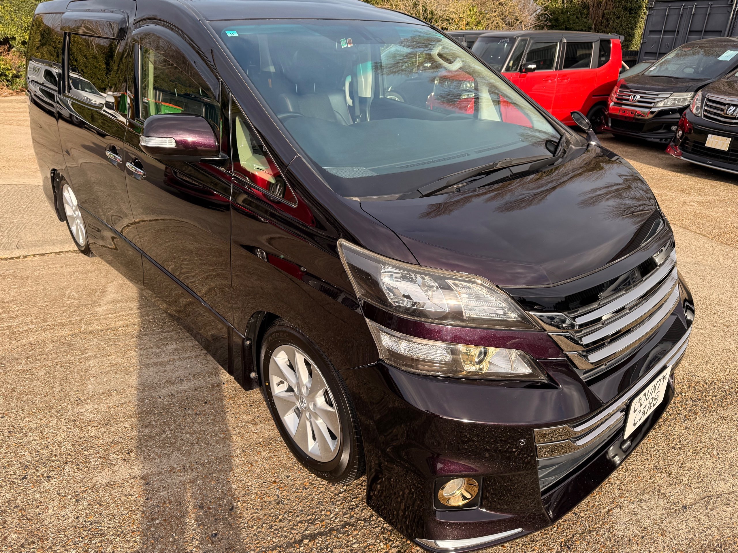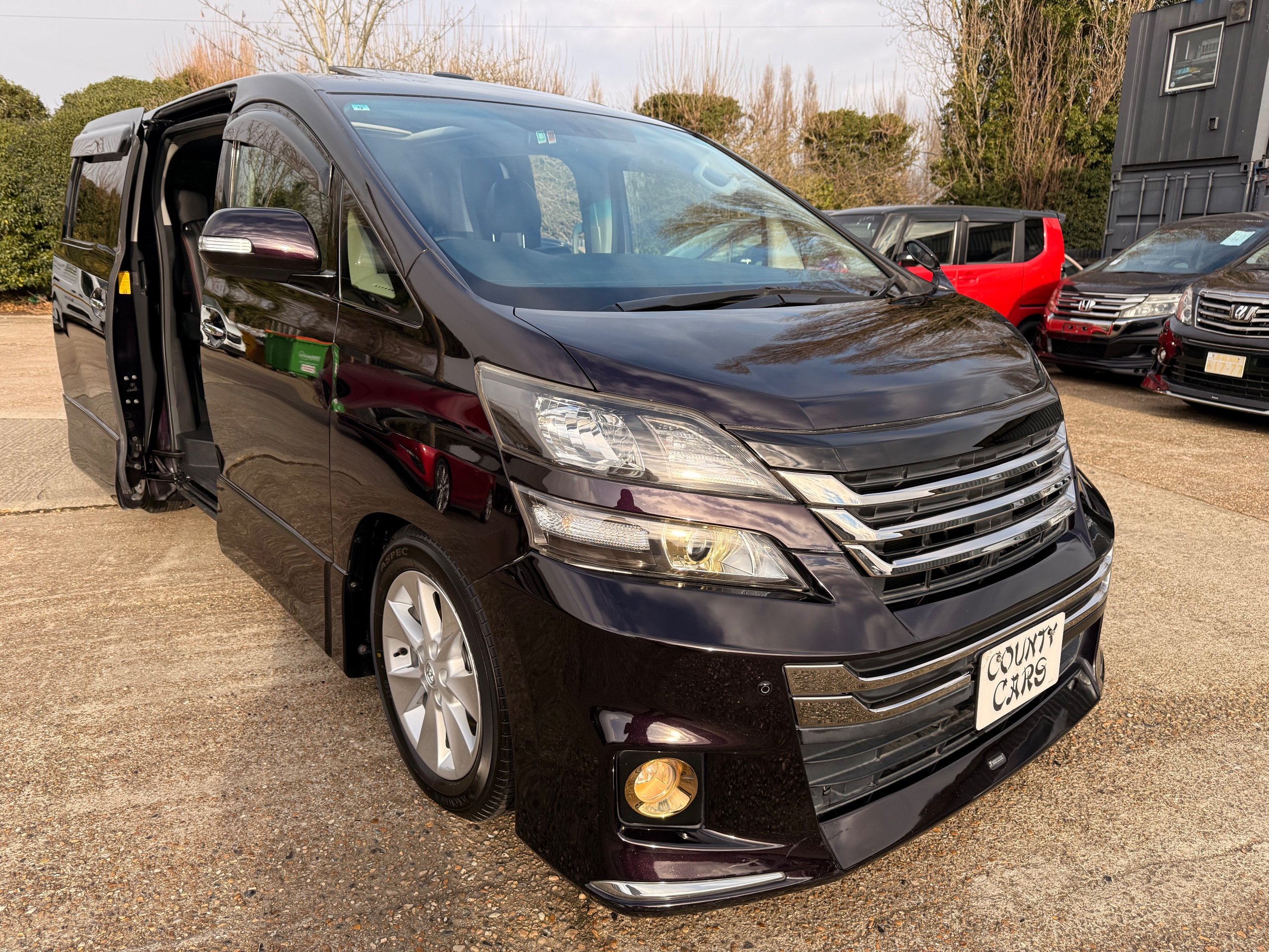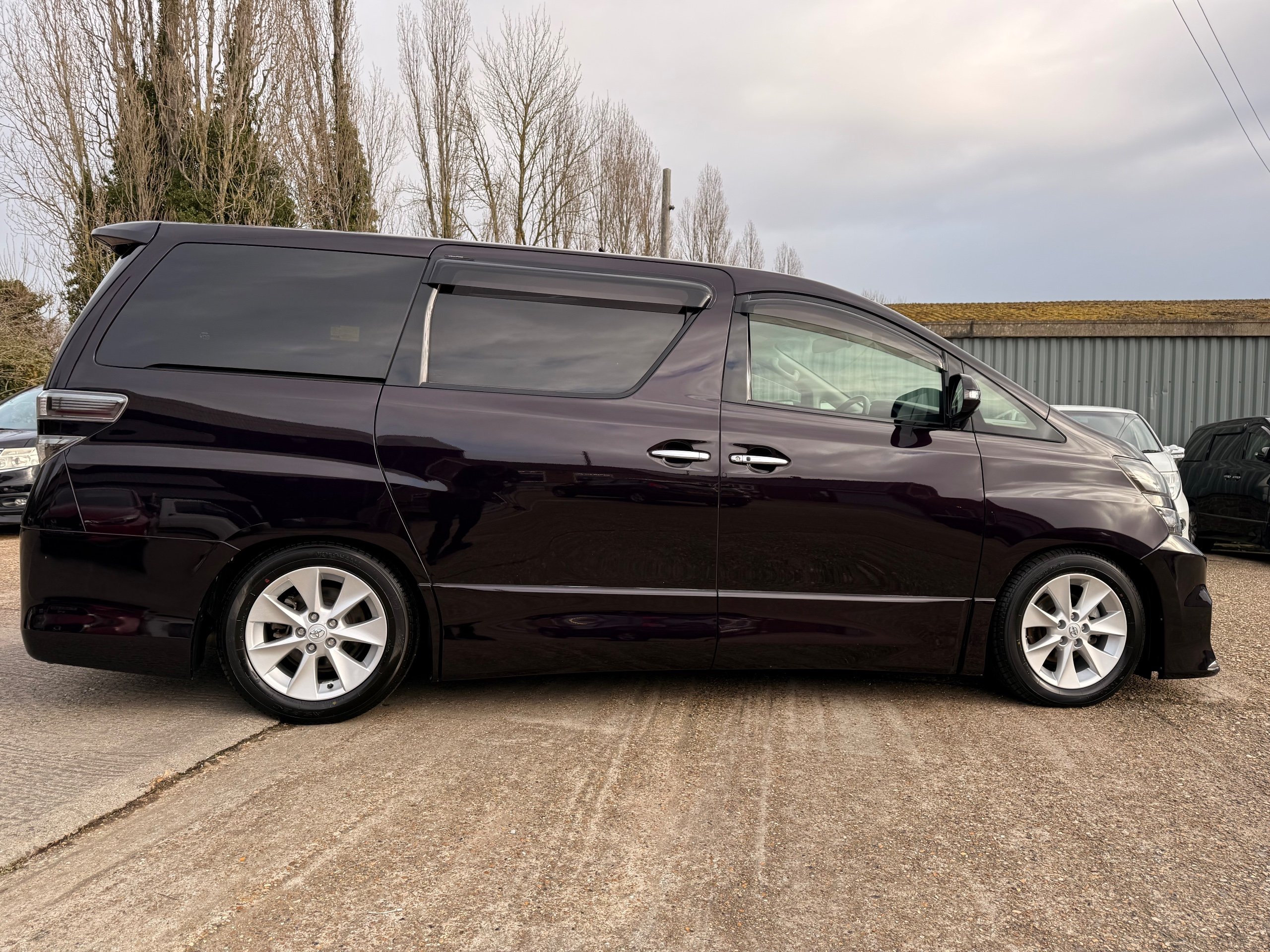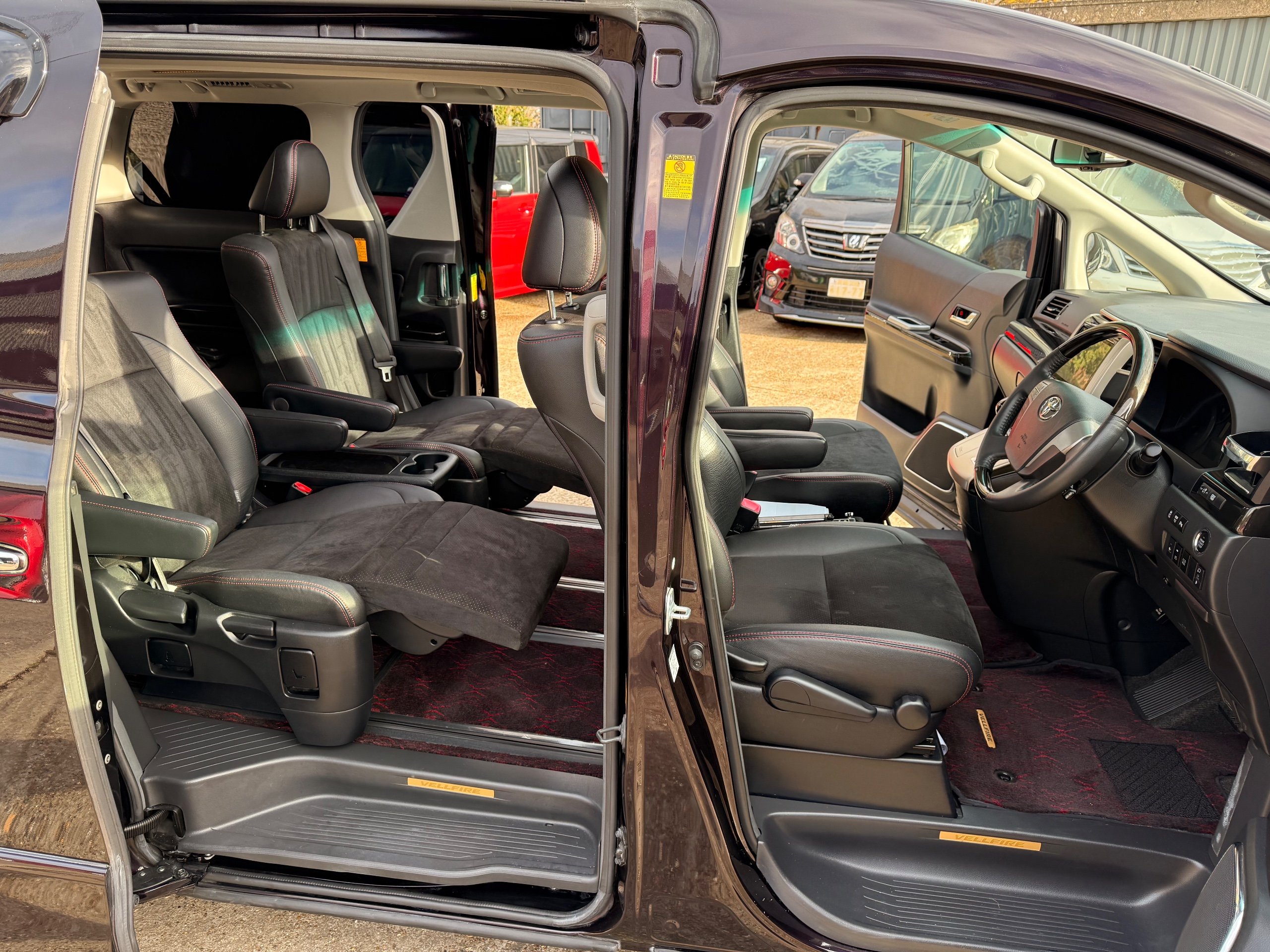 2013 Toyota Vellfire 2.4Z GOLDEN EYES EDITION 2013-63-Reg, Face-lift edition, Finished in Stunning Metallic Purple paintwork, Twin Electric Soft Closing Sliding Doors, Electric Soft closing Tailgate, Twin Sunroofs, Rear Electric Sunroof, Front spots with Gold Surrounds, Full Privacy Glass, Rear Spoiler with built in brake light, 18” Toyota dark silver Alloys, Hodellista Front grille and Front Splitter, Key-less Entry, Key-less start, 7 Seater 7 Unblemished Half Black leather seats with red stitching, The Front Seats have armrests, Centre console with flip up cup holders, The centre seats are Lounge style seats with extra leg rests and twin armrests on each seat, The seats also slide forwards and backwards and side to side with a folding centre table with built in cup holders, easy access to the rear seats, Isofix centre seats, The rear seats fold away to give way to a large boot, Strip L.E.D lighting, Ambient lighting, Push button Start, Front and Rear parking sensors, Traction Control, Front and Rear Electric windows, Twin Sunroofs, Colour reversing camera, Isofix points, Stereo System with Apple CarPlay,Red and Black Golden eyes floor mats, Cruise Control, Only covered a Genuine 73,000 Miles With All the Genuine paperwork from Japan including the auction sheet and Export Certificate which both prove the mileage and condition before it left Japan
