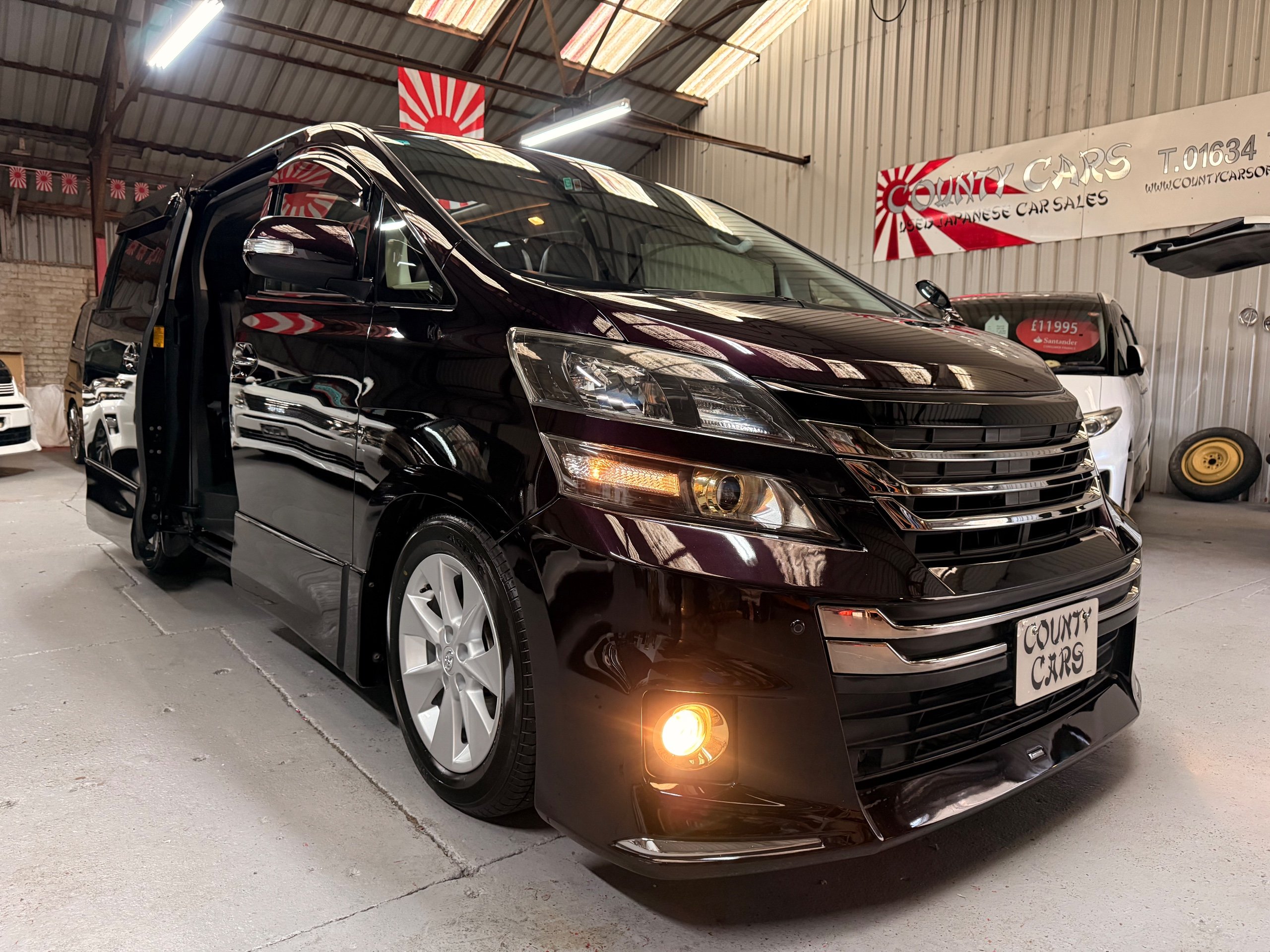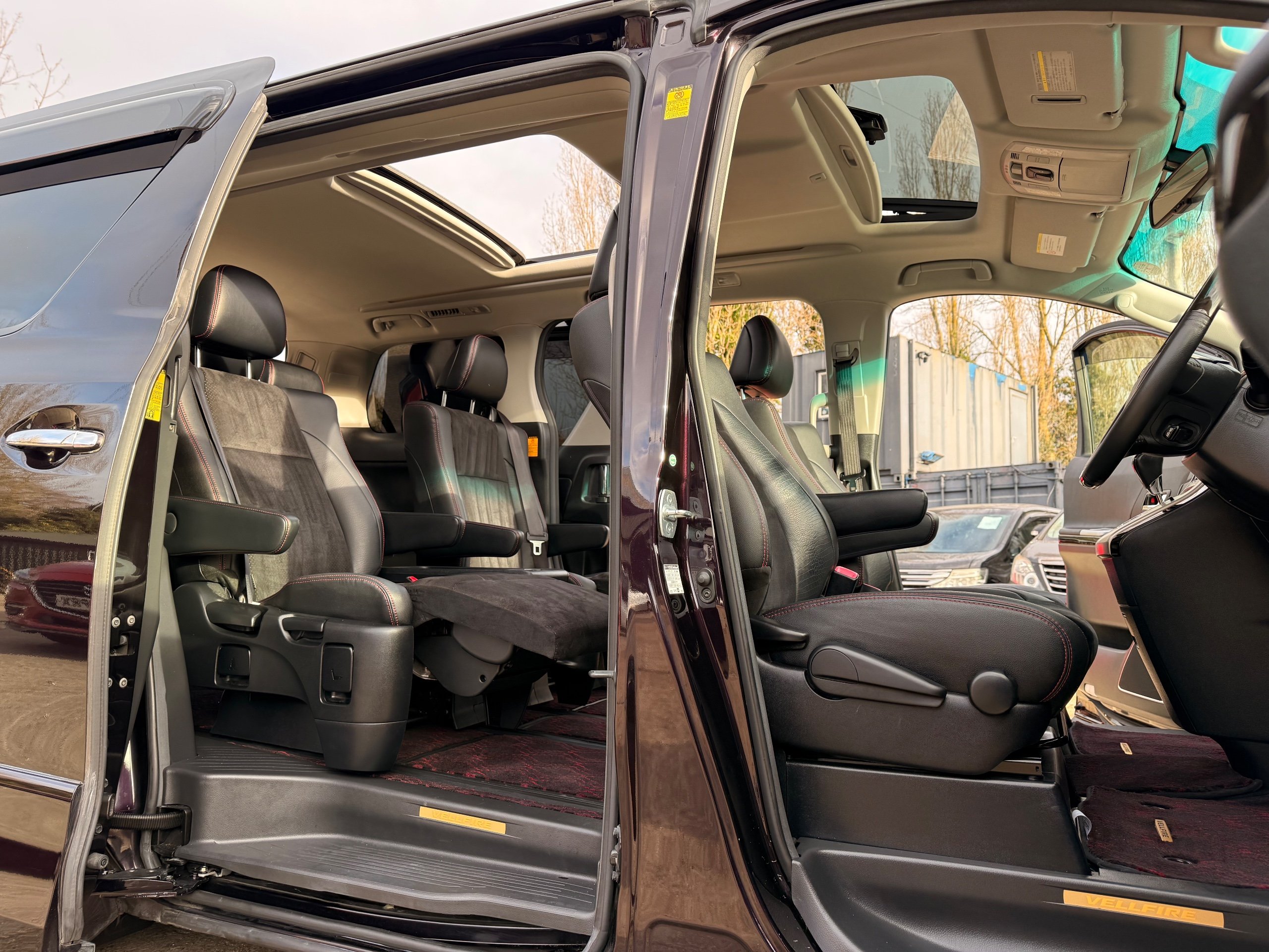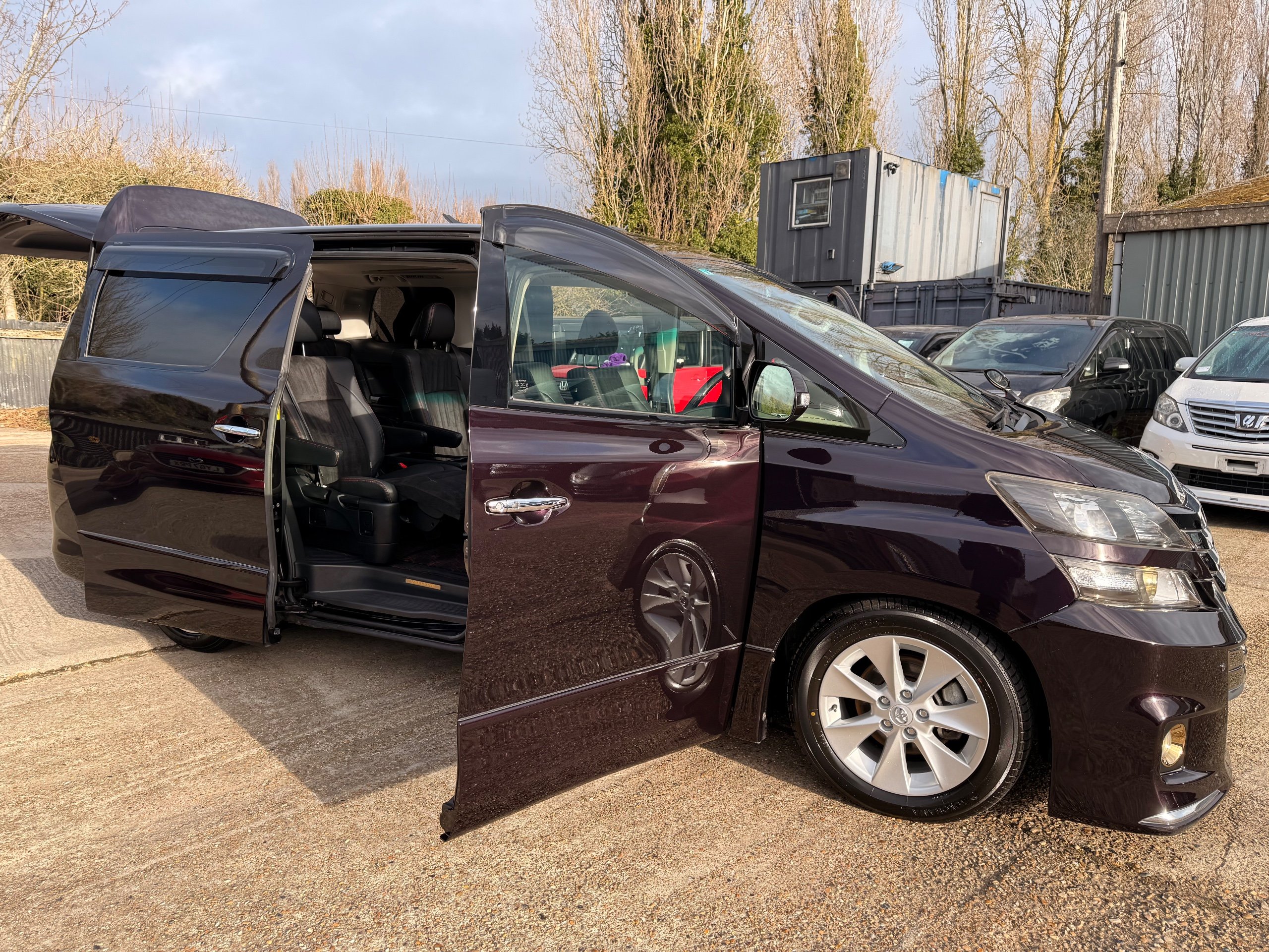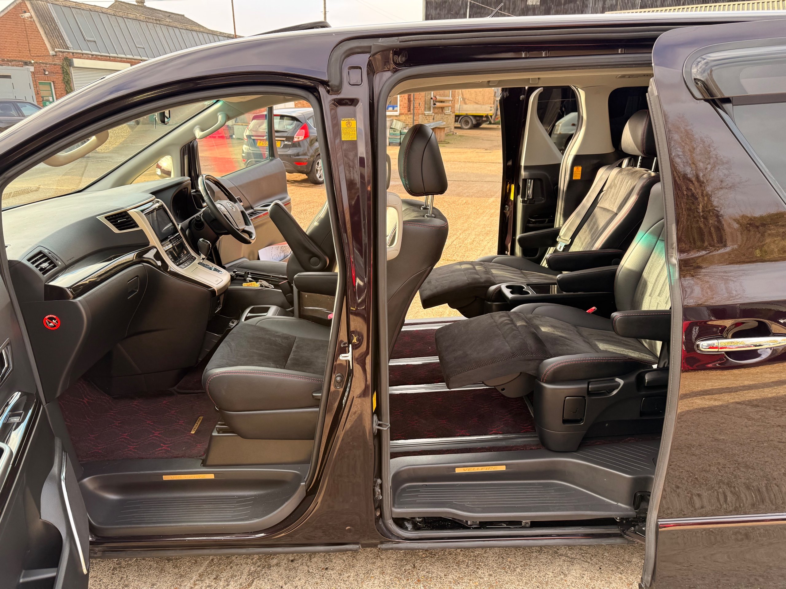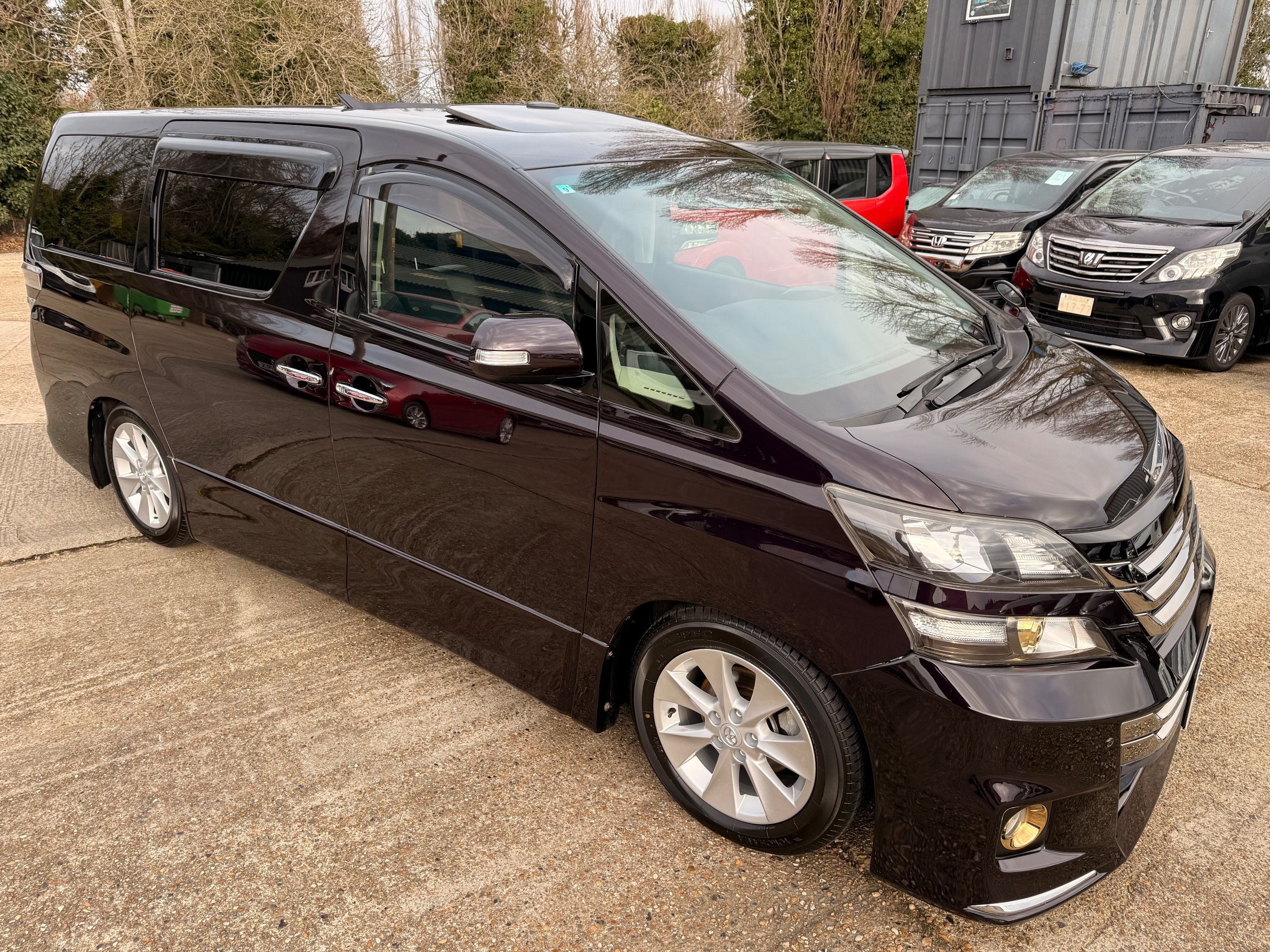 2013 Toyota Vellfire 2.4Z GOLDEN EYES EDITION 2013-63-Reg, Face-lift edition, Finished in Stunning Metallic Purple paintwork, Twin Electric Soft Closing Sliding Doors, Electric Soft closing Tailgate, Twin Sunroofs, Rear Electric Sunroof, Front spots with Gold Surrounds, Full Privacy Glass, Rear Spoiler with built in brake light, 18” Toyota dark silver Alloys, Hodellista Front grille and Front Splitter, Key-less Entry, Key-less start, 7 Seater 7 Unblemished Half Black leather seats with red stitching, The Front Seats have armrests, Centre console with flip up cup holders, The centre seats are Lounge style seats with extra leg rests and twin armrests on each seat, The seats also slide forwards and backwards and side to side with a folding centre table with built in cup holders, easy access to the rear seats, Isofix centre seats, The rear seats fold away to give way to a large boot, Strip L.E.D lighting, Ambient lighting, Push button Start, Front and Rear parking sensors, Traction Control, Front and Rear Electric windows, Twin Sunroofs, Colour reversing camera, Isofix points, Stereo System with Apple CarPlay,Red and Black Golden eyes floor mats, Cruise Control, Only covered a Genuine 73,000 Miles With All the Genuine paperwork from Japan including the auction sheet and Export Certificate which both prove the mileage and condition before it left Japan