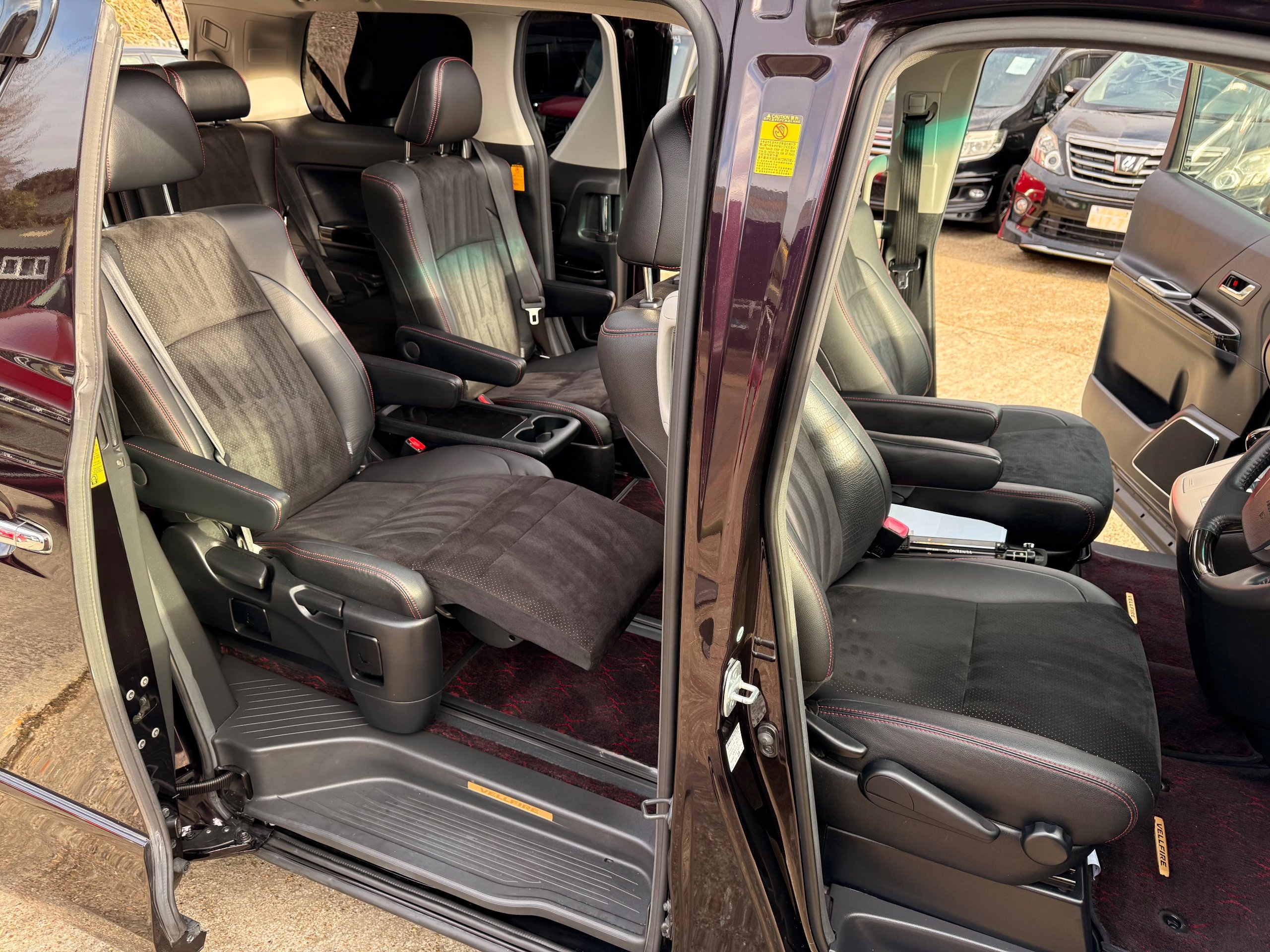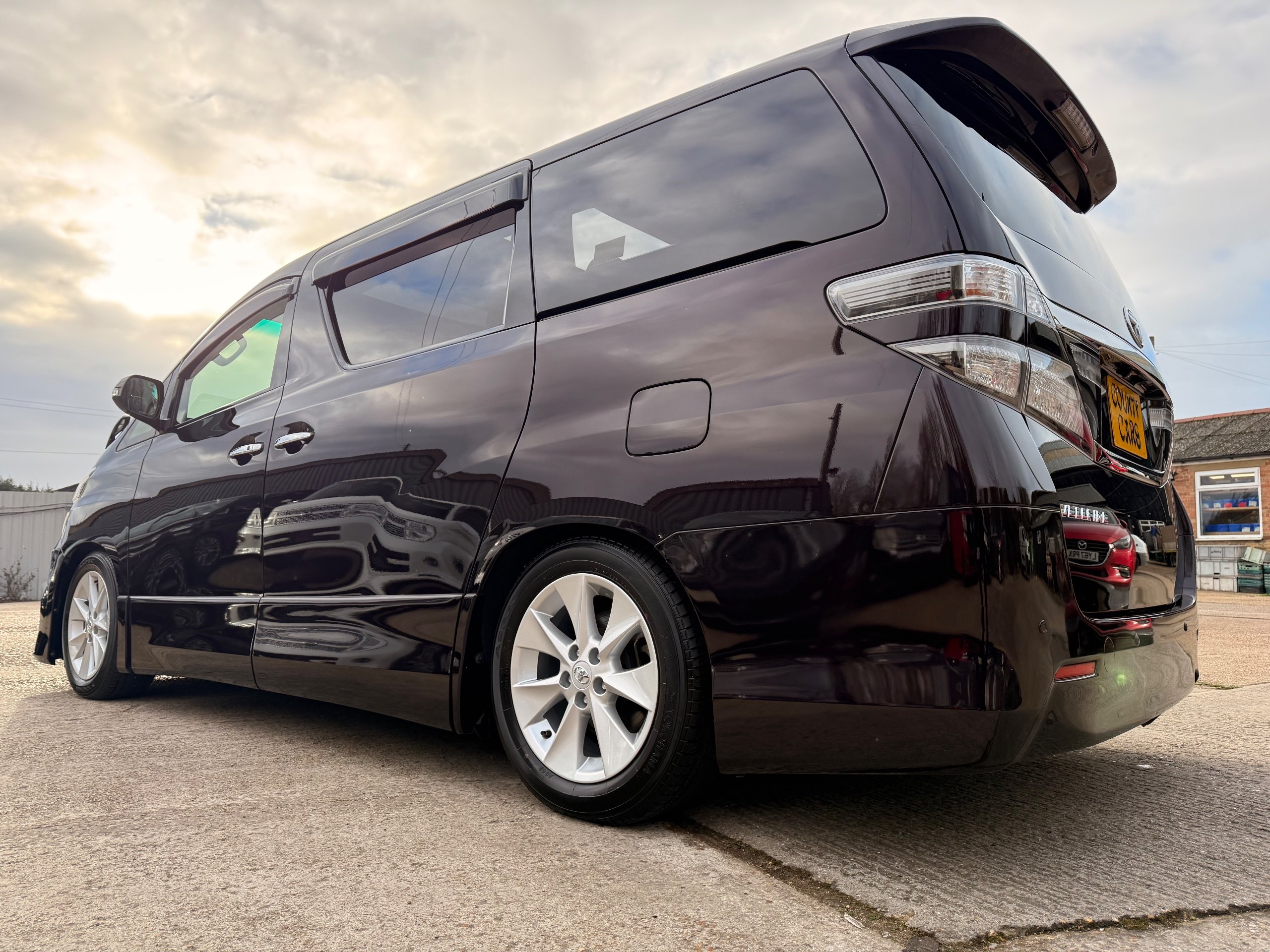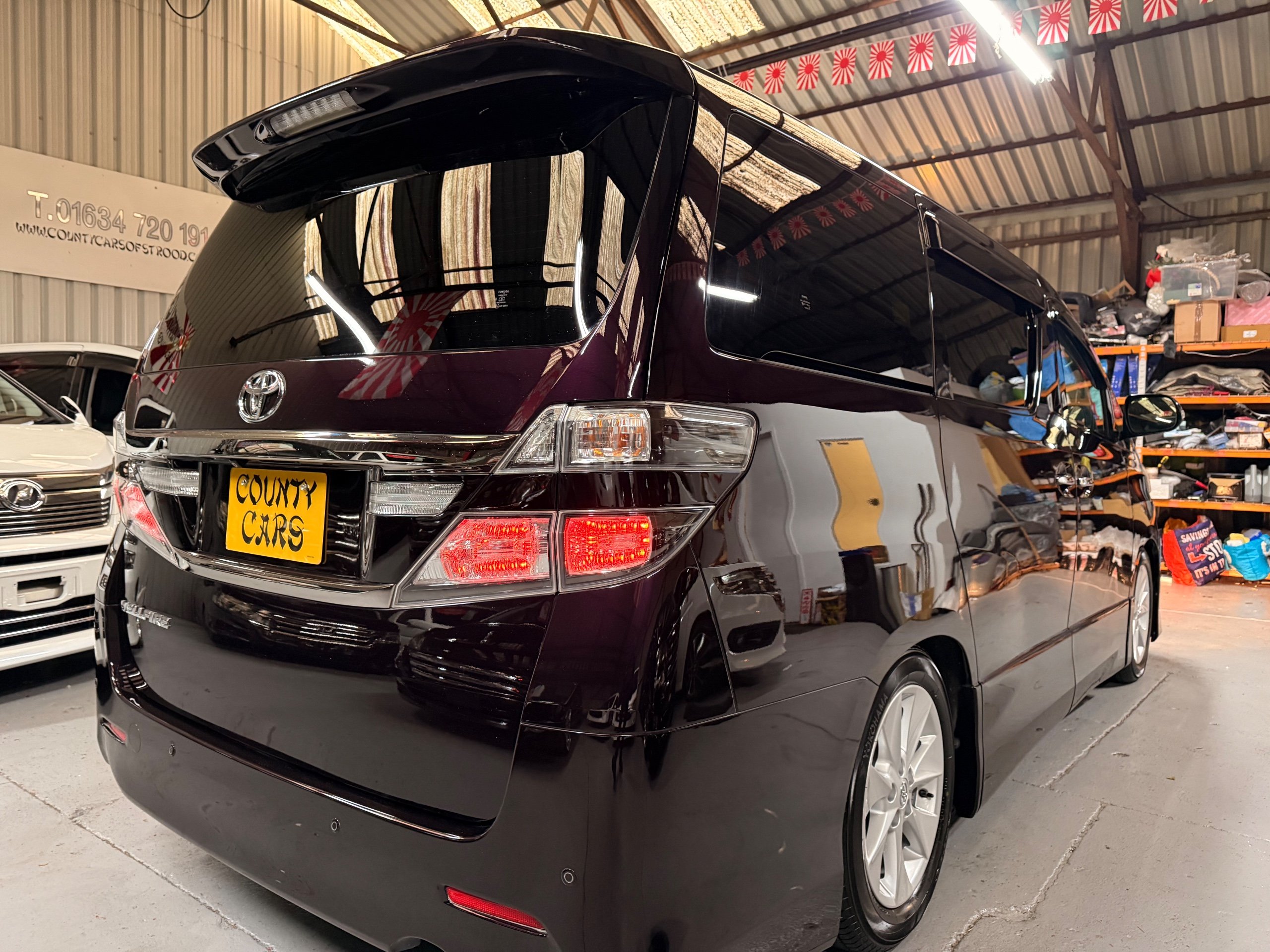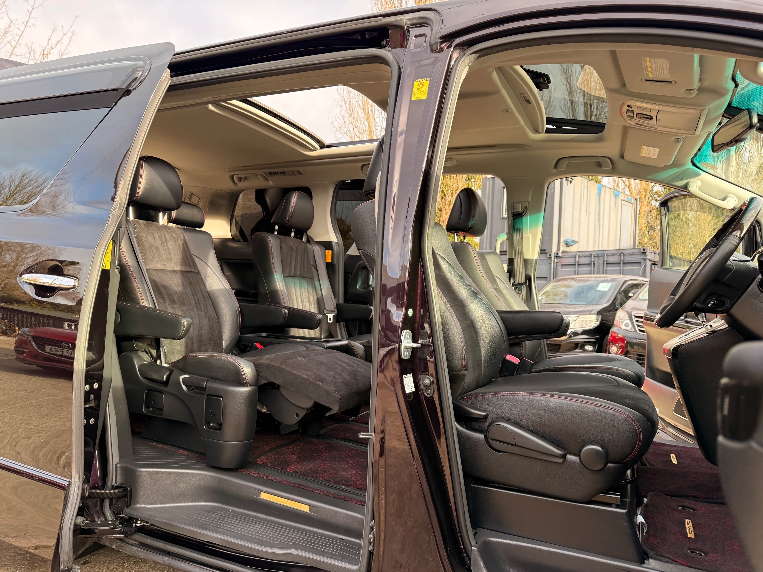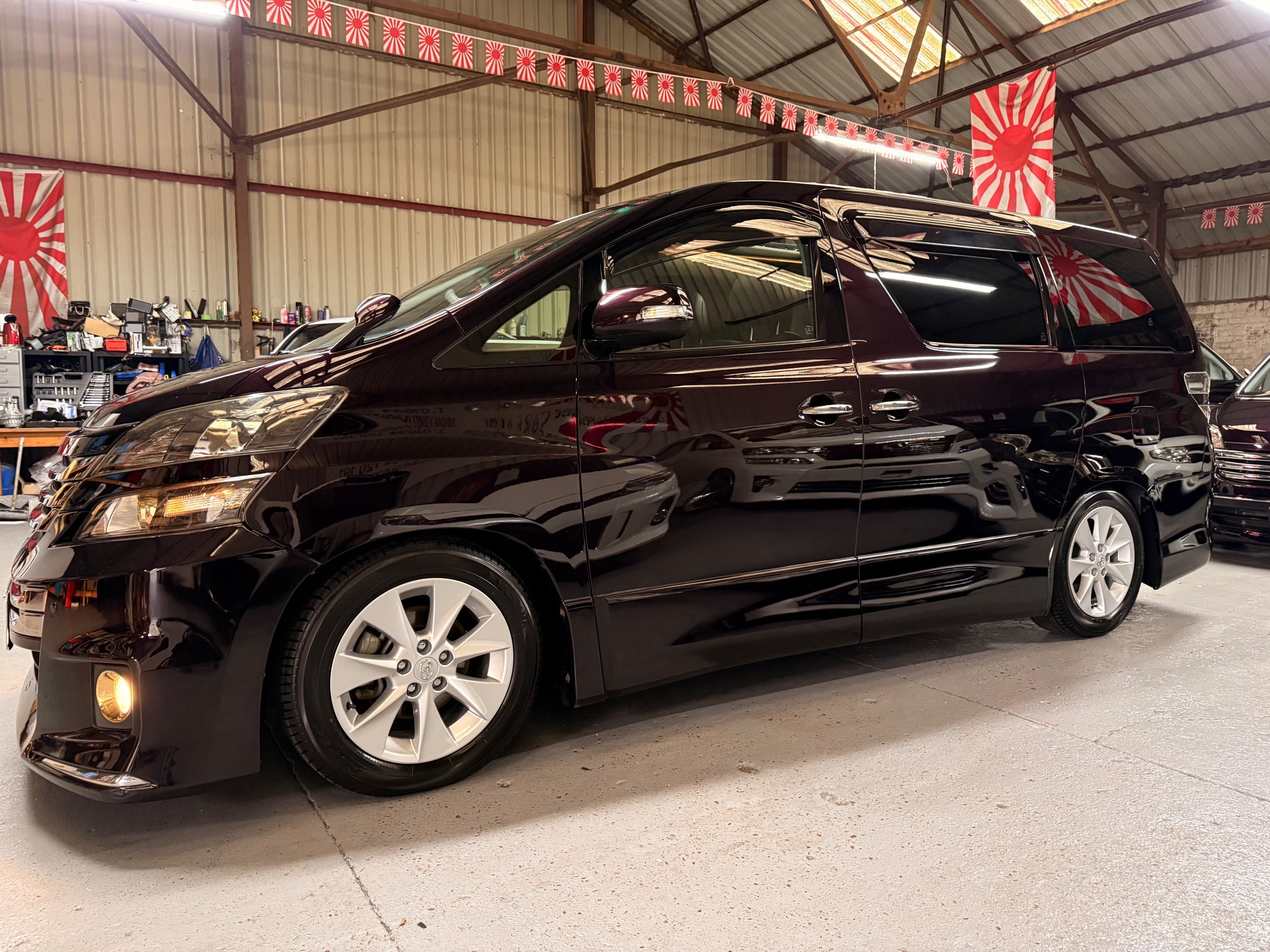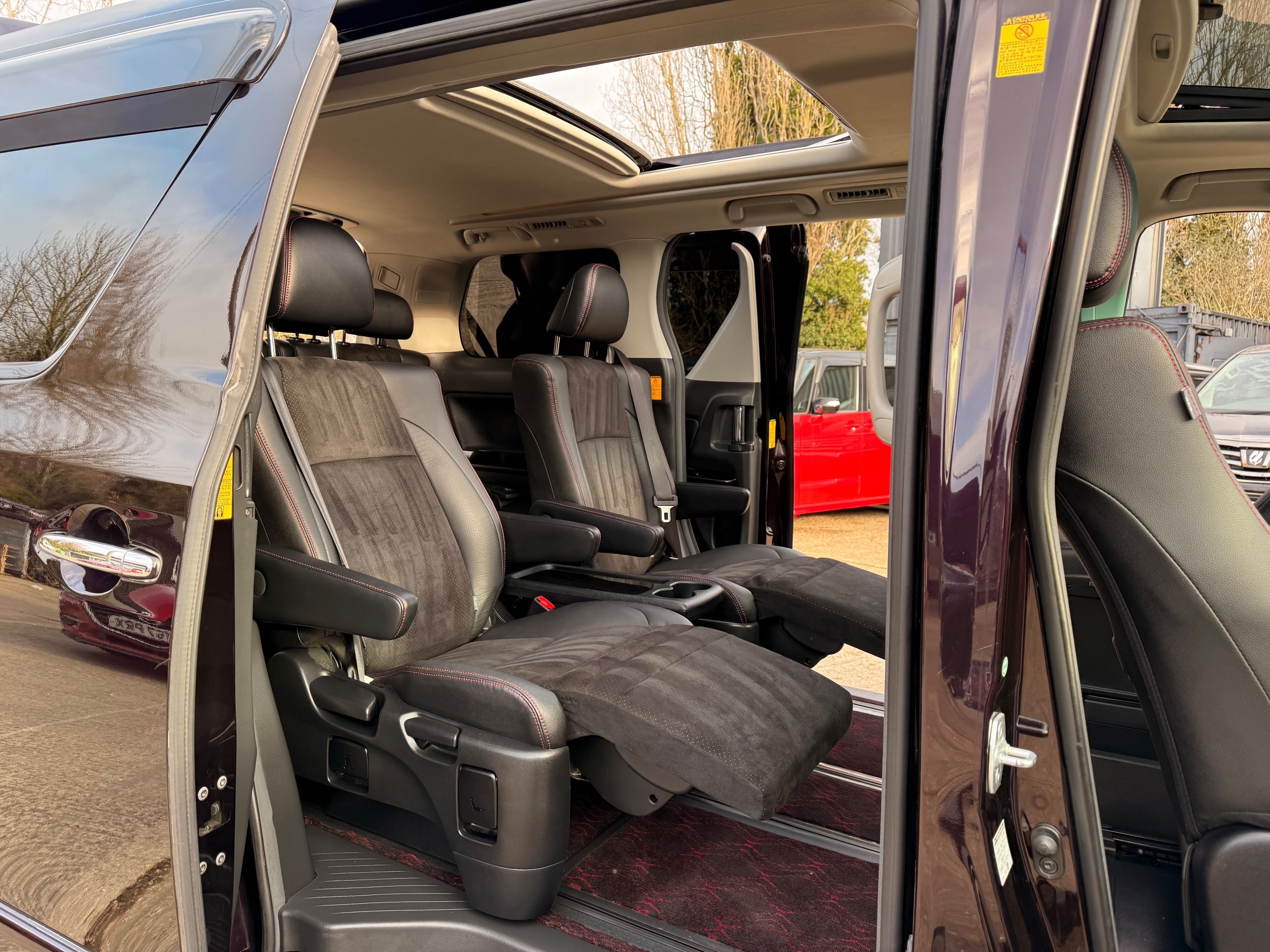 2013 Toyota Vellfire 2.4Z GOLDEN EYES EDITION 2013-63-Reg, Face-lift edition, Finished in Stunning Metallic Purple paintwork, Twin Electric Soft Closing Sliding Doors, Electric Soft closing Tailgate, Twin Sunroofs, Rear Electric Sunroof, Front spots with Gold Surrounds, Full Privacy Glass, Rear Spoiler with built in brake light, 18” Toyota dark silver Alloys, Hodellista Front grille and Front Splitter, Key-less Entry, Key-less start, 7 Seater 7 Unblemished Half Black leather seats with red stitching, The Front Seats have armrests, Centre console with flip up cup holders, The centre seats are Lounge style seats with extra leg rests and twin armrests on each seat, The seats also slide forwards and backwards and side to side with a folding centre table with built in cup holders, easy access to the rear seats, Isofix centre seats, The rear seats fold away to give way to a large boot, Strip L.E.D lighting, Ambient lighting, Push button Start, Front and Rear parking sensors, Traction Control, Front and Rear Electric windows, Twin Sunroofs, Colour reversing camera, Isofix points, Stereo System with Apple CarPlay,Red and Black Golden eyes floor mats, Cruise Control, Only covered a Genuine 73,000 Miles With All the Genuine paperwork from Japan including the auction sheet and Export Certificate which both prove the mileage and condition before it left Japan