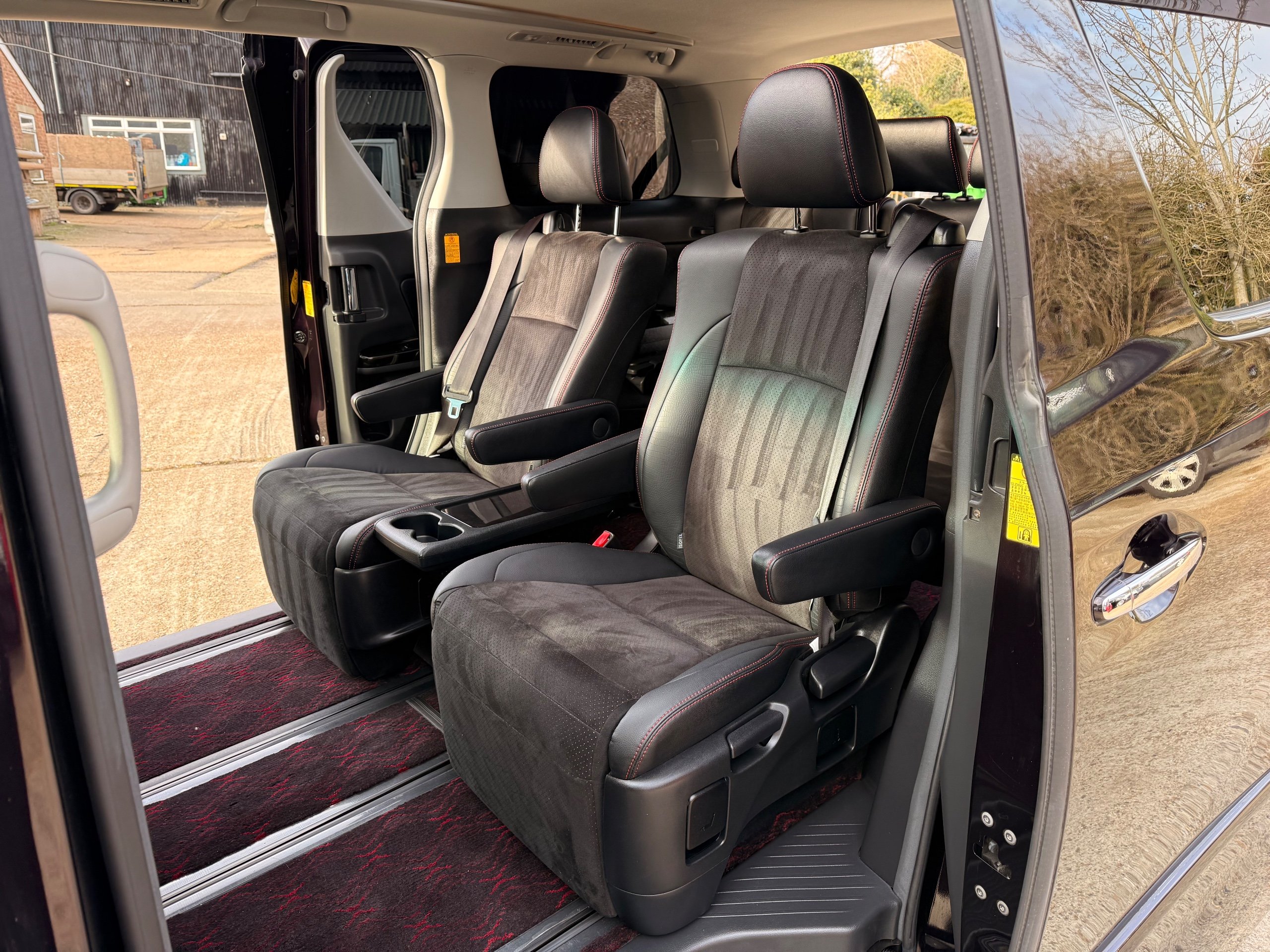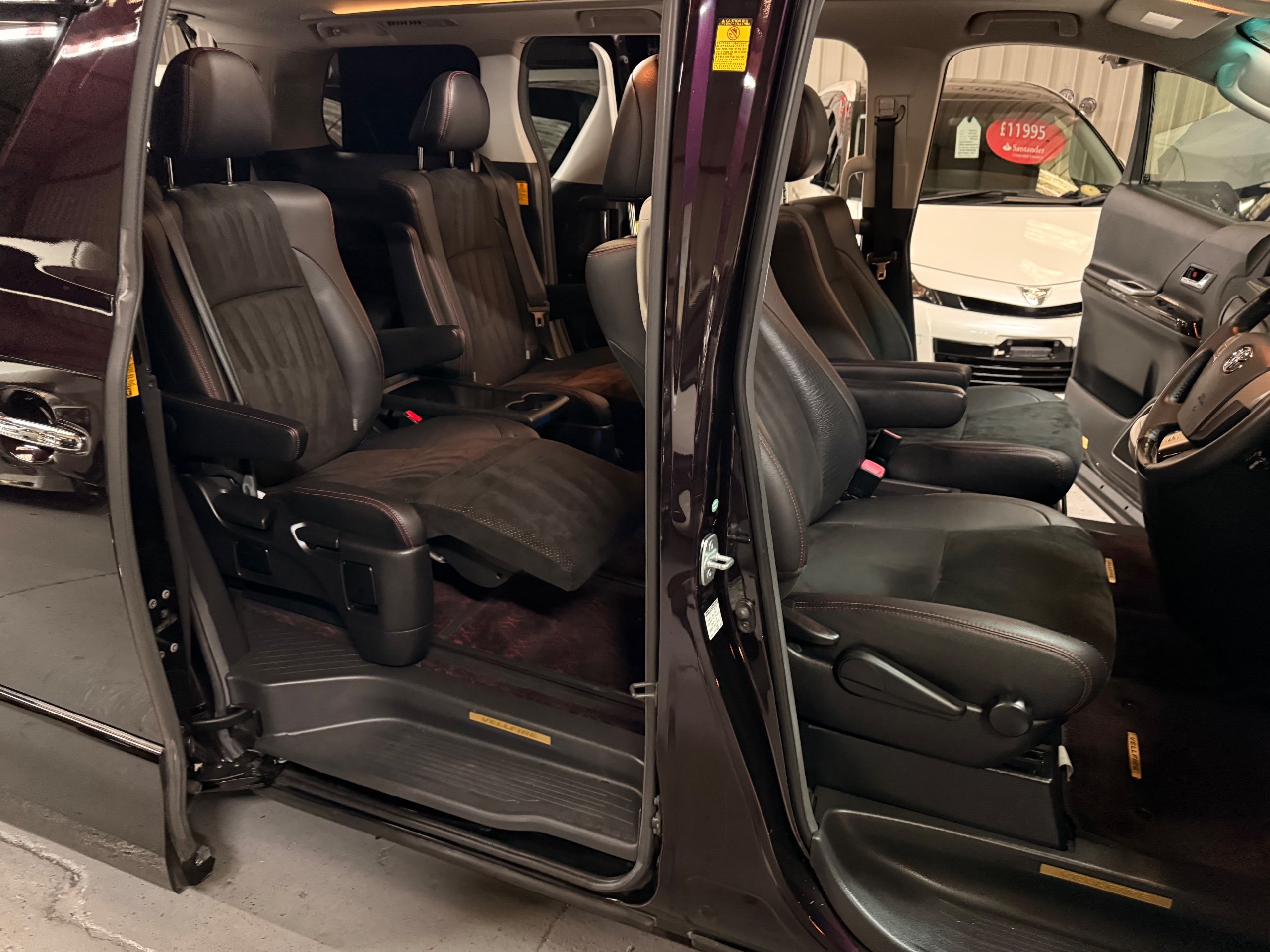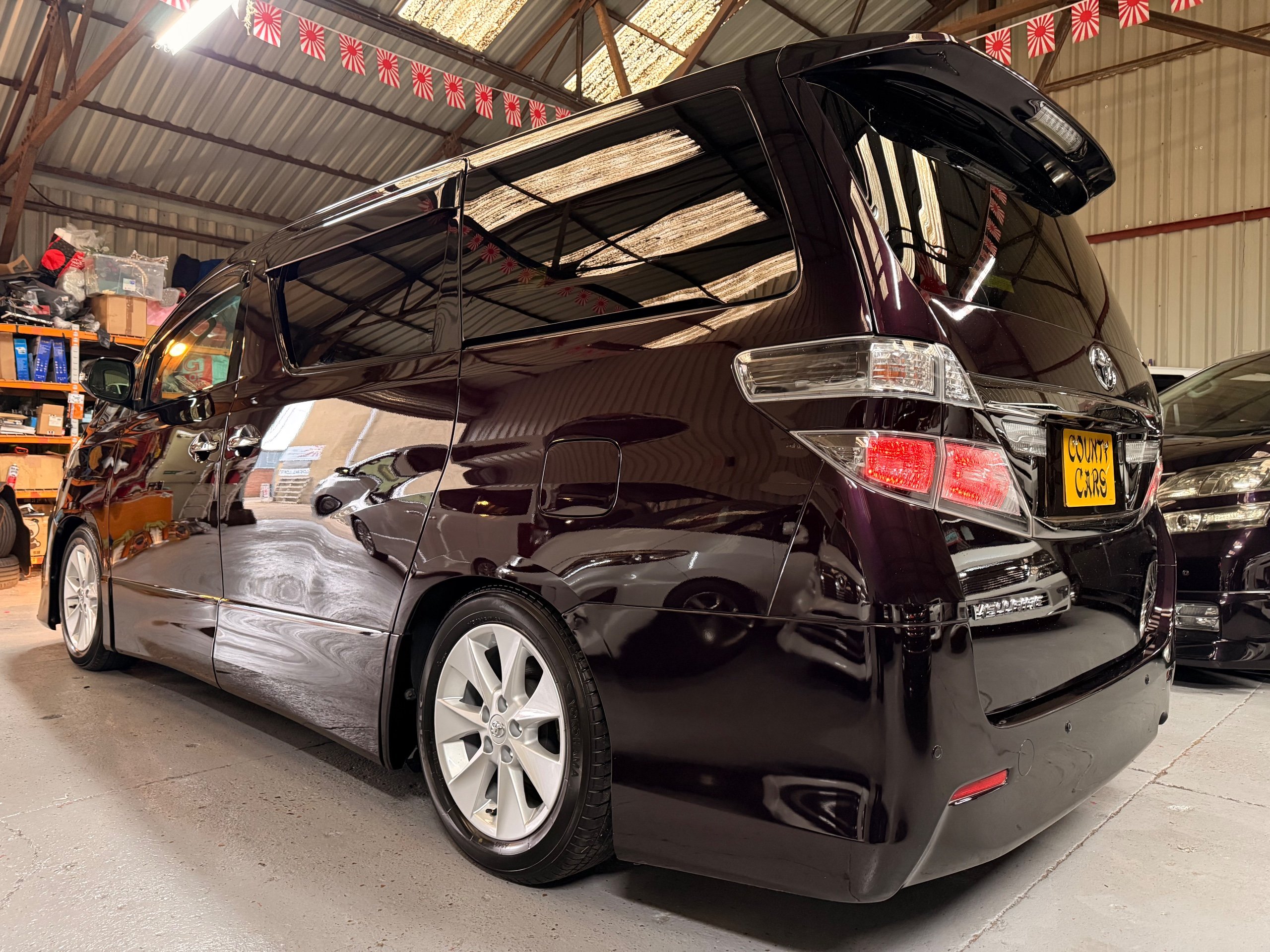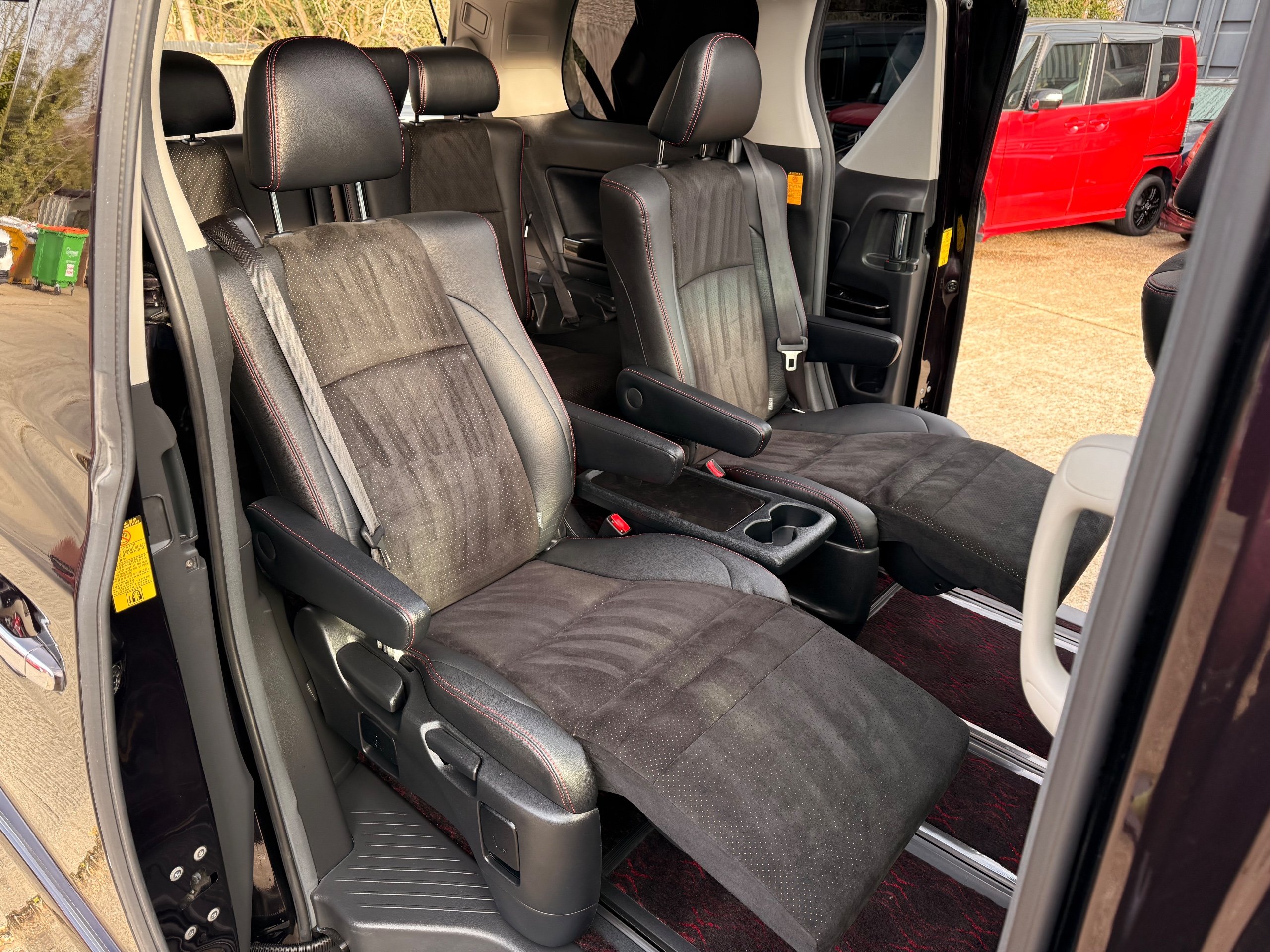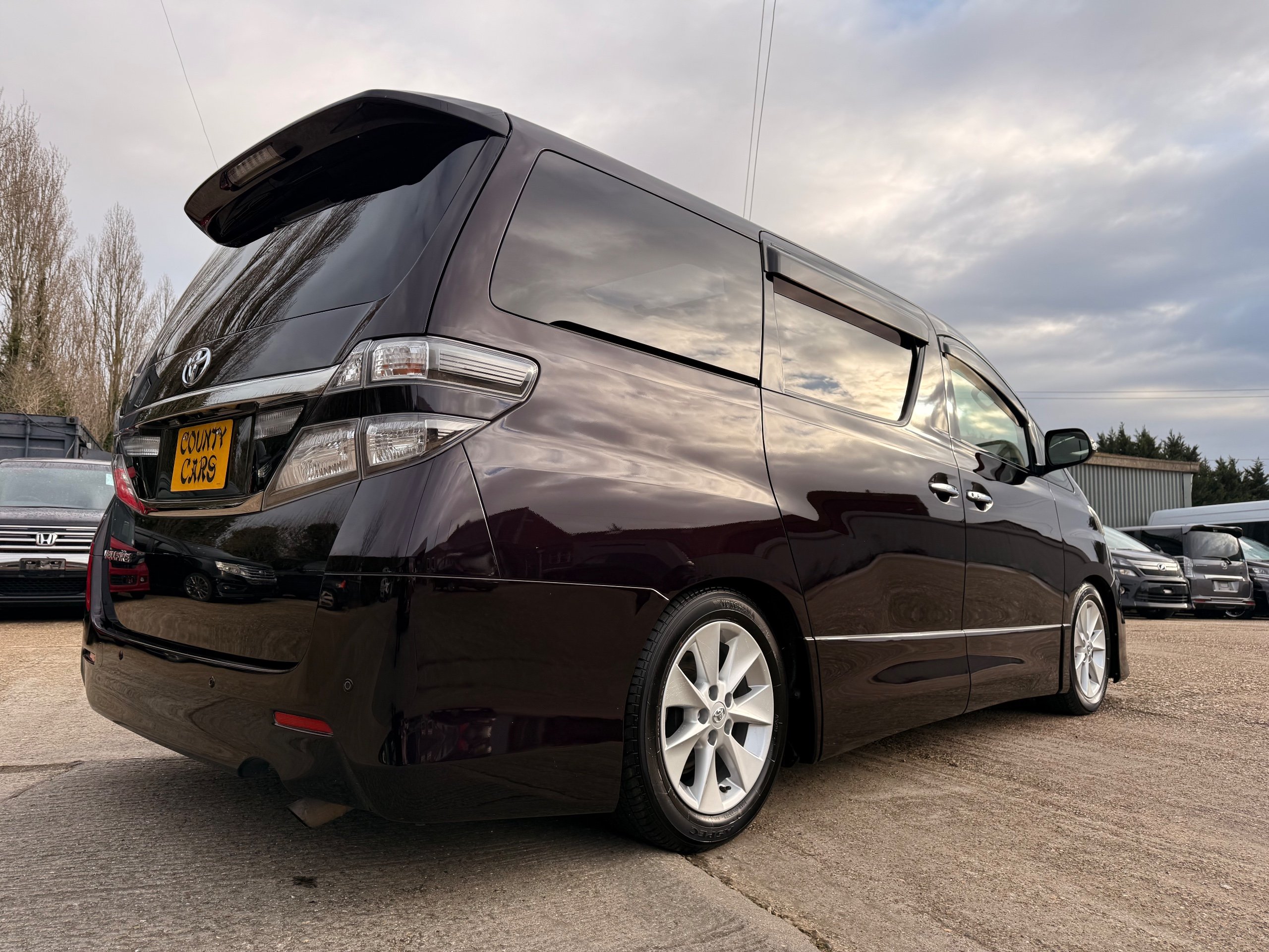 2013 Toyota Vellfire 2.4Z GOLDEN EYES EDITION 2013-63-Reg, Face-lift edition, Finished in Stunning Metallic Purple paintwork, Twin Electric Soft Closing Sliding Doors, Electric Soft closing Tailgate, Twin Sunroofs, Rear Electric Sunroof, Front spots with Gold Surrounds, Full Privacy Glass, Rear Spoiler with built in brake light, 18” Toyota dark silver Alloys, Hodellista Front grille and Front Splitter, Key-less Entry, Key-less start, 7 Seater 7 Unblemished Half Black leather seats with red stitching, The Front Seats have armrests, Centre console with flip up cup holders, The centre seats are Lounge style seats with extra leg rests and twin armrests on each seat, The seats also slide forwards and backwards and side to side with a folding centre table with built in cup holders, easy access to the rear seats, Isofix centre seats, The rear seats fold away to give way to a large boot, Strip L.E.D lighting, Ambient lighting, Push button Start, Front and Rear parking sensors, Traction Control, Front and Rear Electric windows, Twin Sunroofs, Colour reversing camera, Isofix points, Stereo System with Apple CarPlay,Red and Black Golden eyes floor mats, Cruise Control, Only covered a Genuine 73,000 Miles With All the Genuine paperwork from Japan including the auction sheet and Export Certificate which both prove the mileage and condition before it left Japan