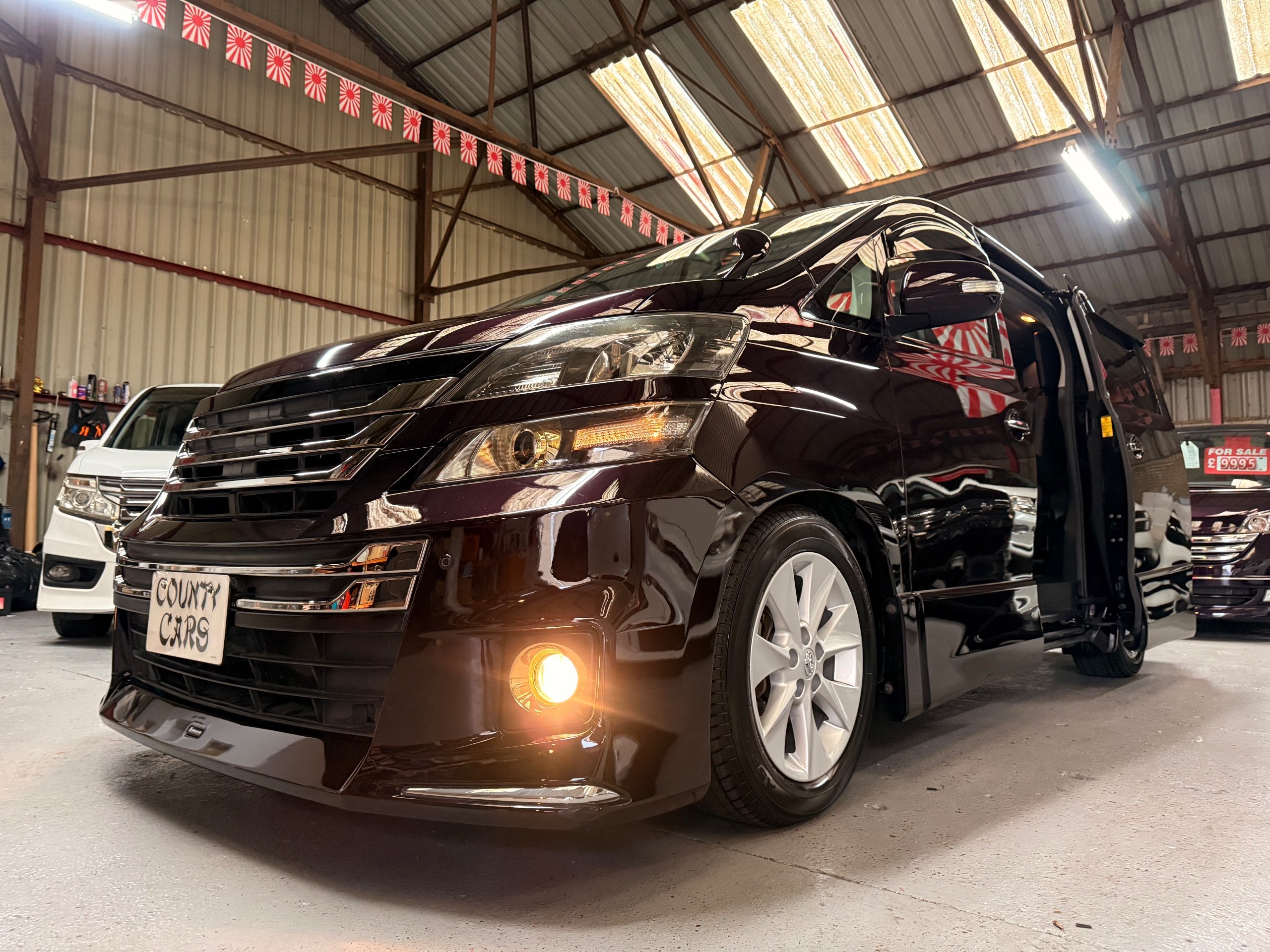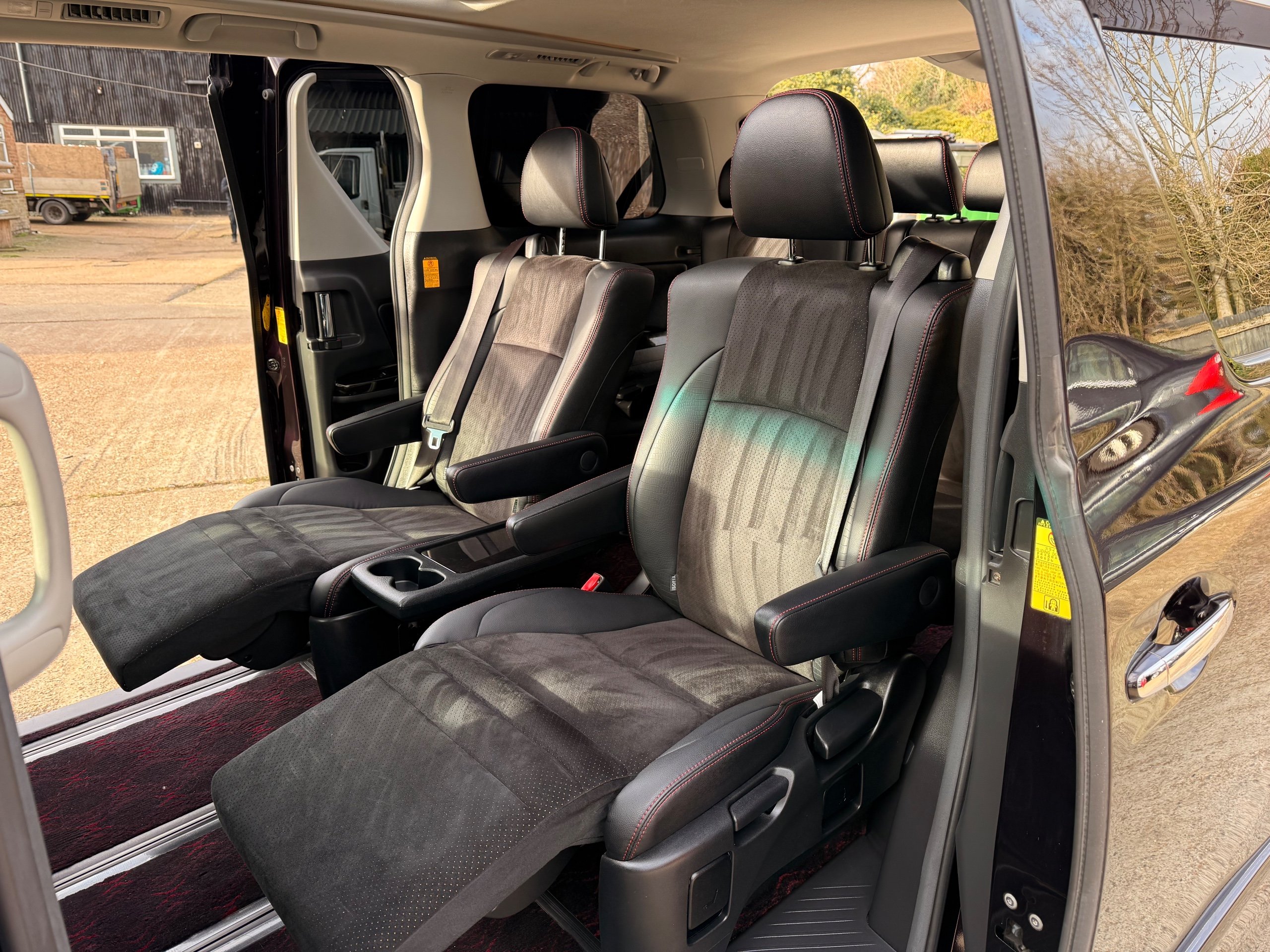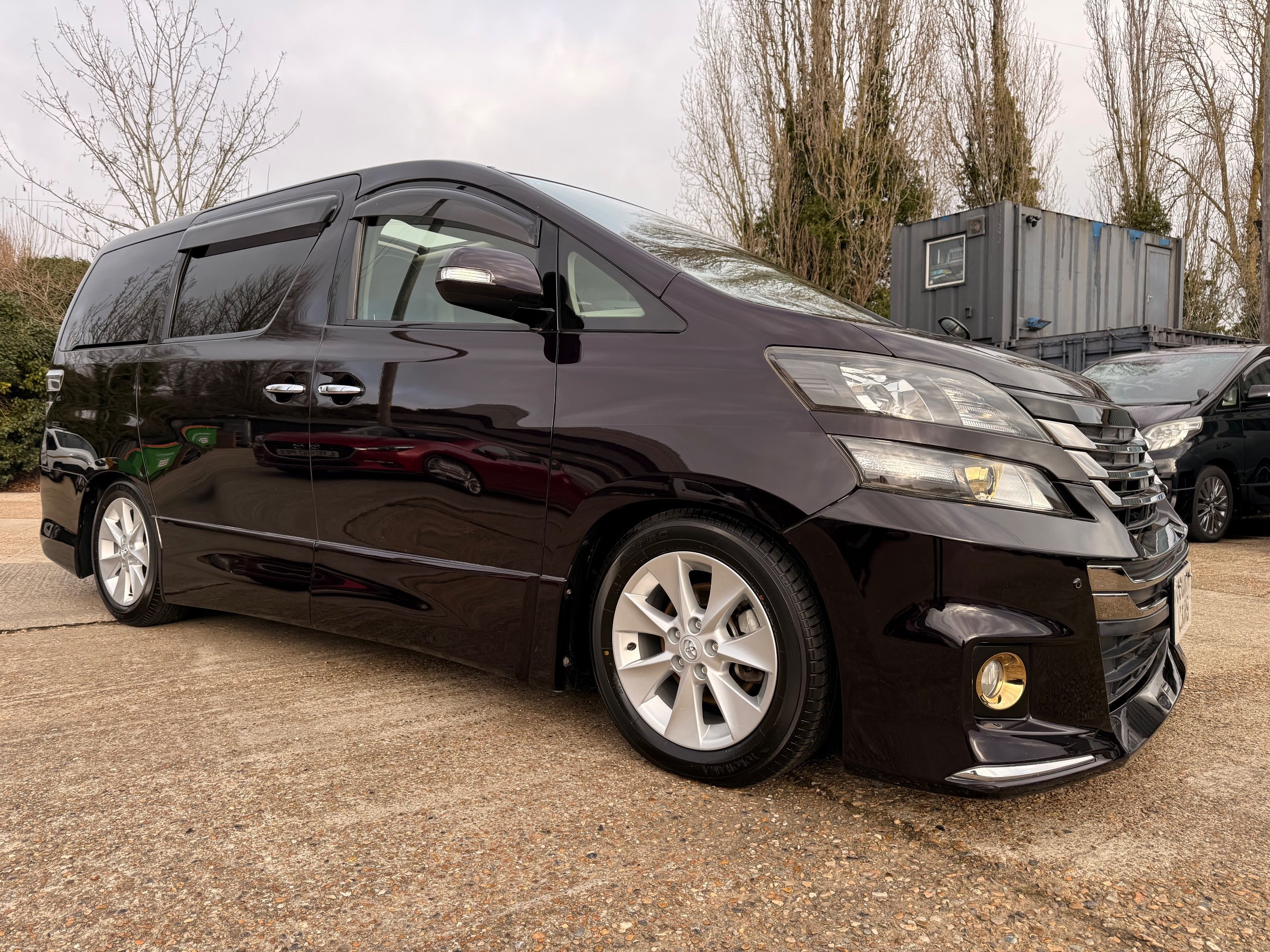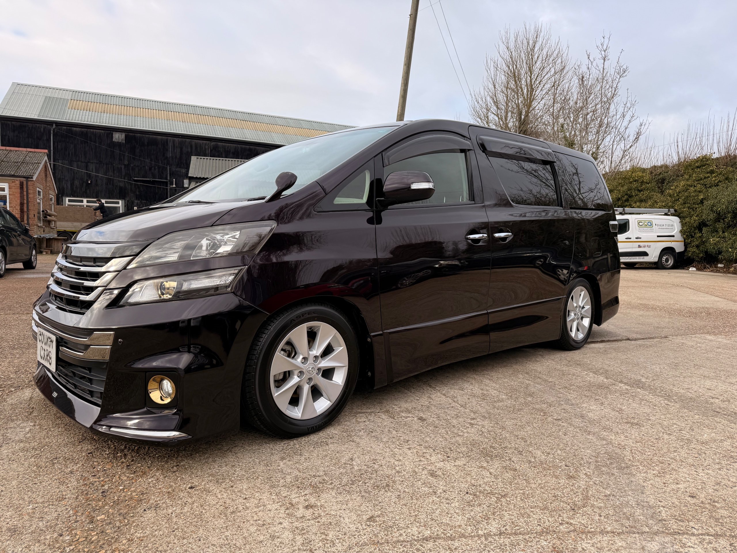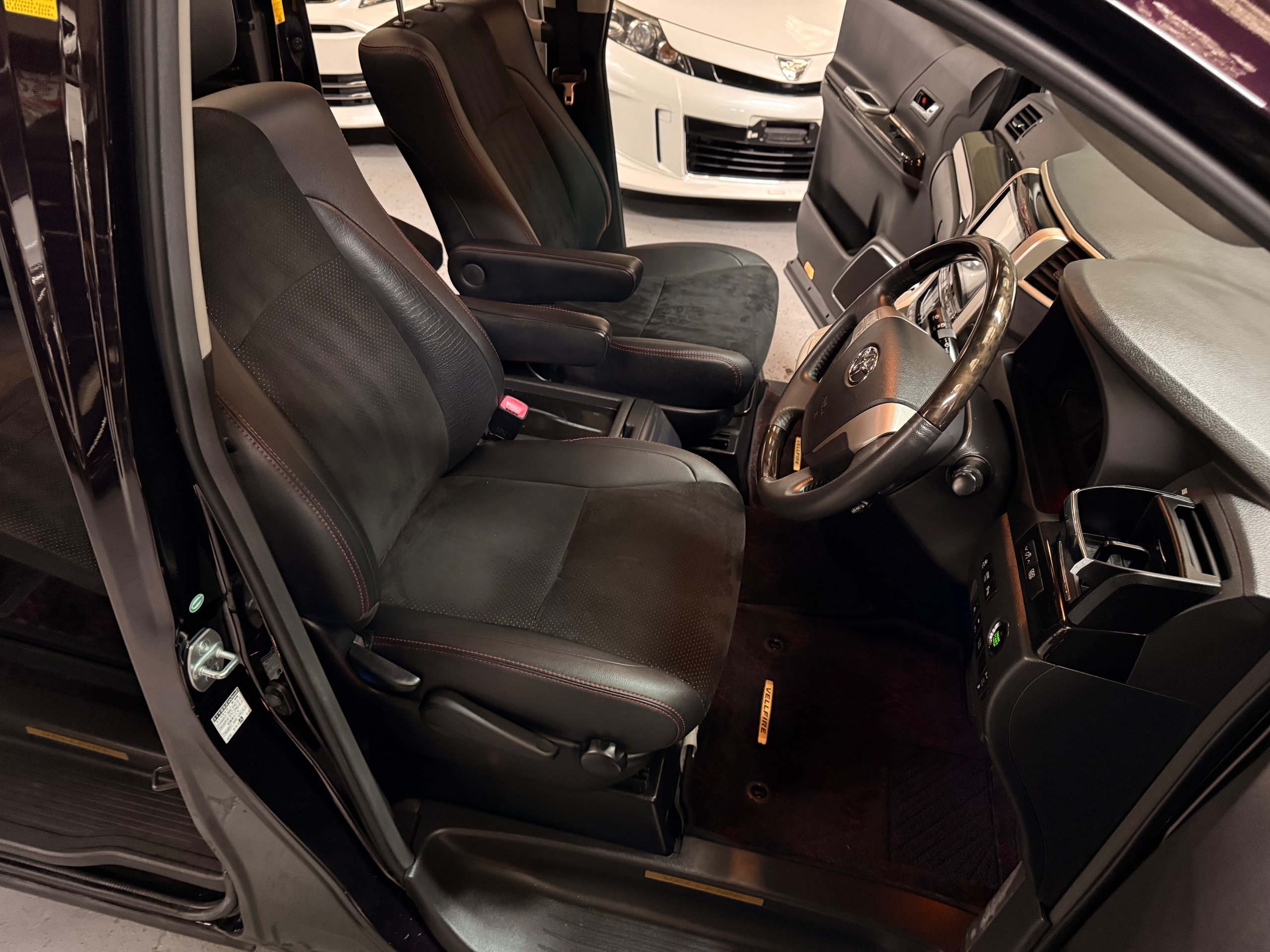 2013 Toyota Vellfire 2.4Z GOLDEN EYES EDITION 2013-63-Reg, Face-lift edition, Finished in Stunning Metallic Purple paintwork, Twin Electric Soft Closing Sliding Doors, Electric Soft closing Tailgate, Twin Sunroofs, Rear Electric Sunroof, Front spots with Gold Surrounds, Full Privacy Glass, Rear Spoiler with built in brake light, 18” Toyota dark silver Alloys, Hodellista Front grille and Front Splitter, Key-less Entry, Key-less start, 7 Seater 7 Unblemished Half Black leather seats with red stitching, The Front Seats have armrests, Centre console with flip up cup holders, The centre seats are Lounge style seats with extra leg rests and twin armrests on each seat, The seats also slide forwards and backwards and side to side with a folding centre table with built in cup holders, easy access to the rear seats, Isofix centre seats, The rear seats fold away to give way to a large boot, Strip L.E.D lighting, Ambient lighting, Push button Start, Front and Rear parking sensors, Traction Control, Front and Rear Electric windows, Twin Sunroofs, Colour reversing camera, Isofix points, Stereo System with Apple CarPlay,Red and Black Golden eyes floor mats, Cruise Control, Only covered a Genuine 73,000 Miles With All the Genuine paperwork from Japan including the auction sheet and Export Certificate which both prove the mileage and condition before it left Japan