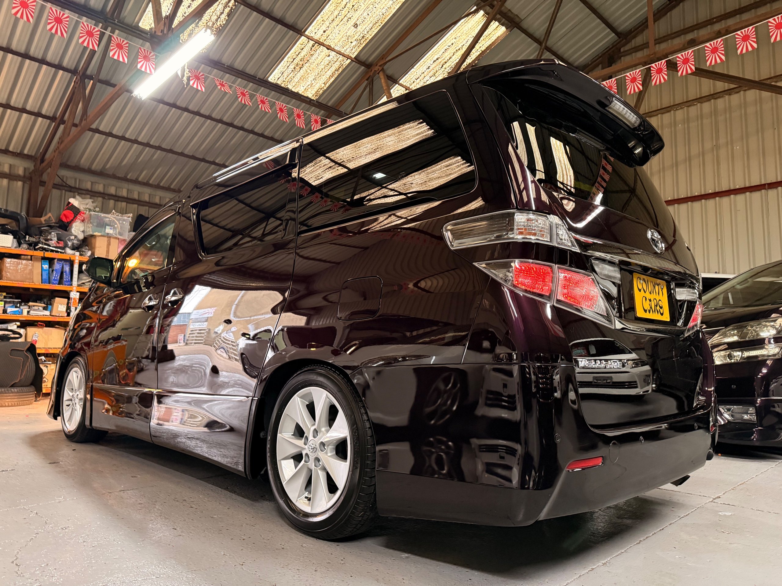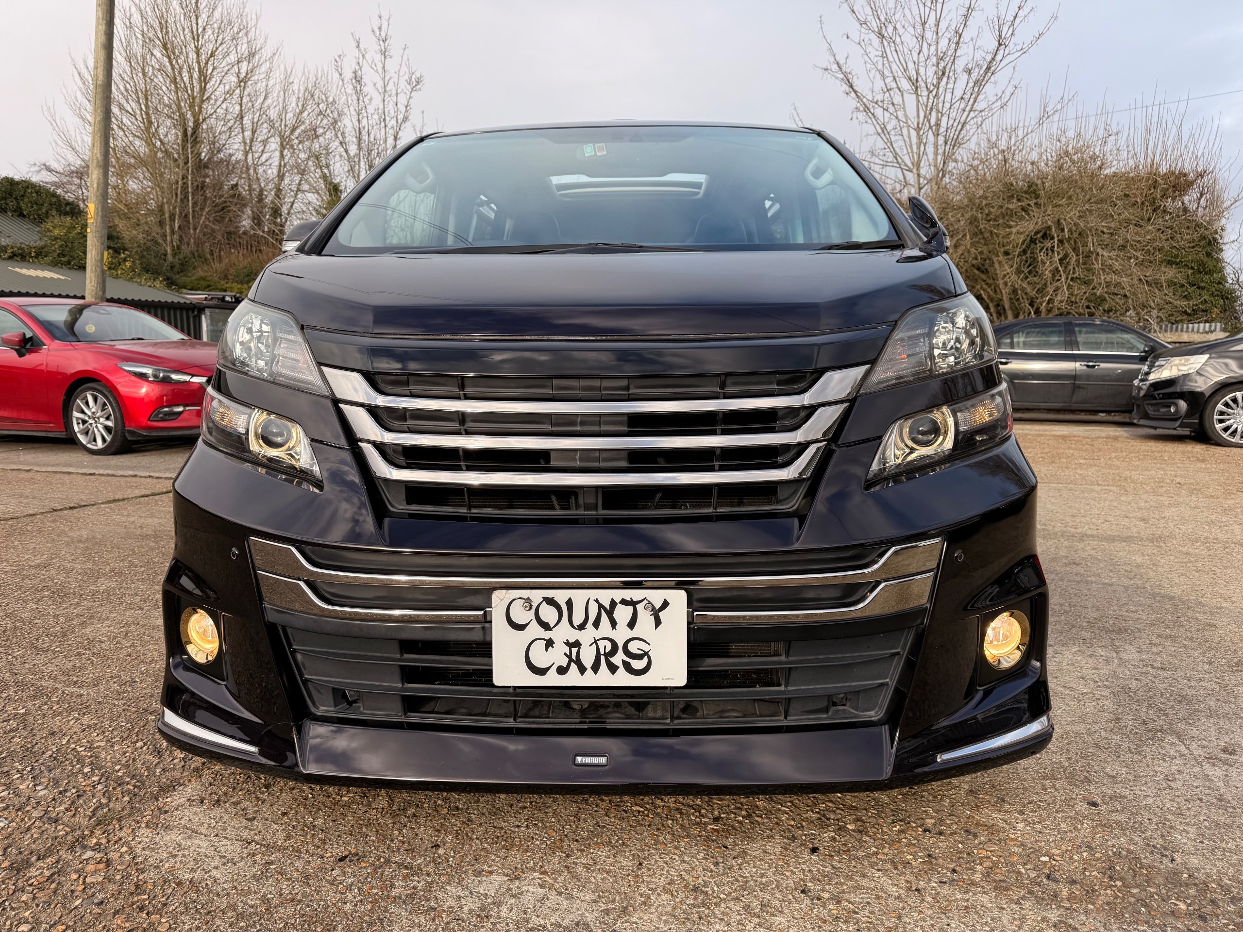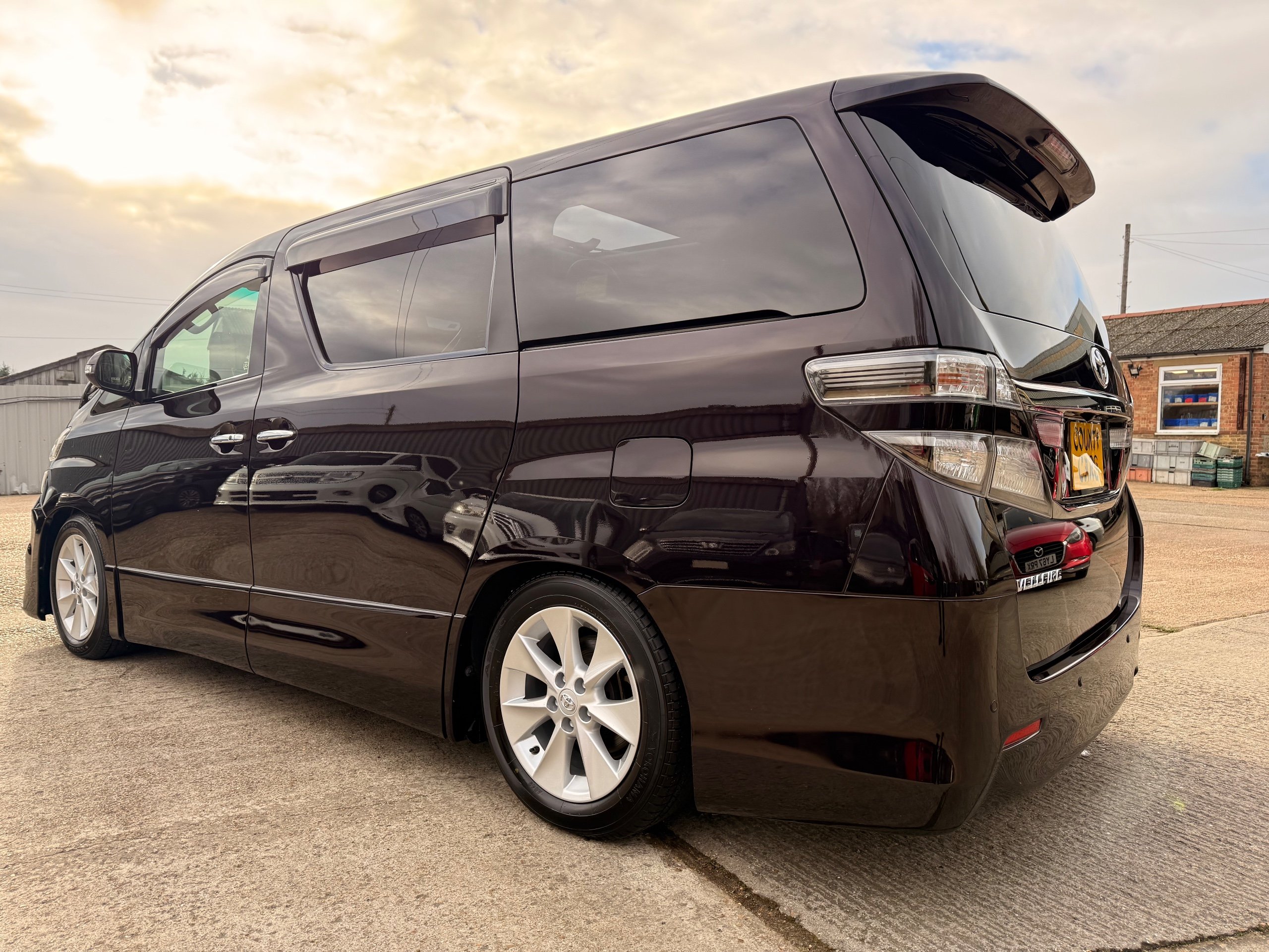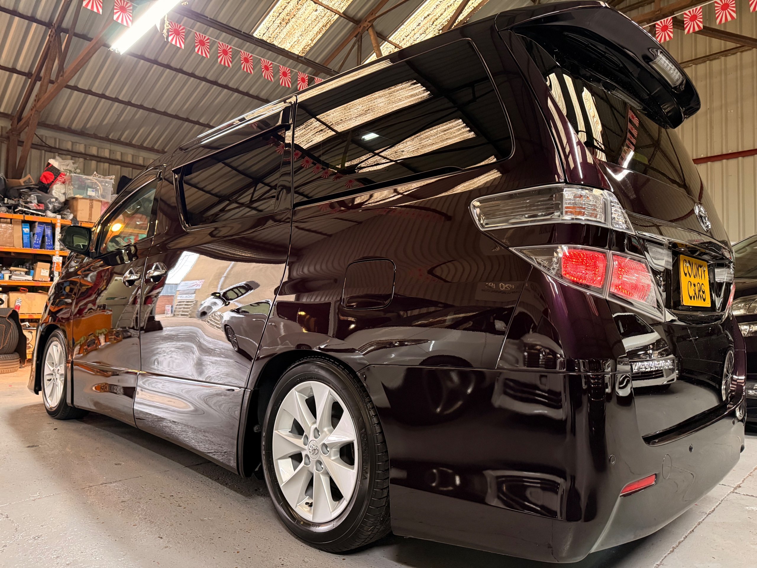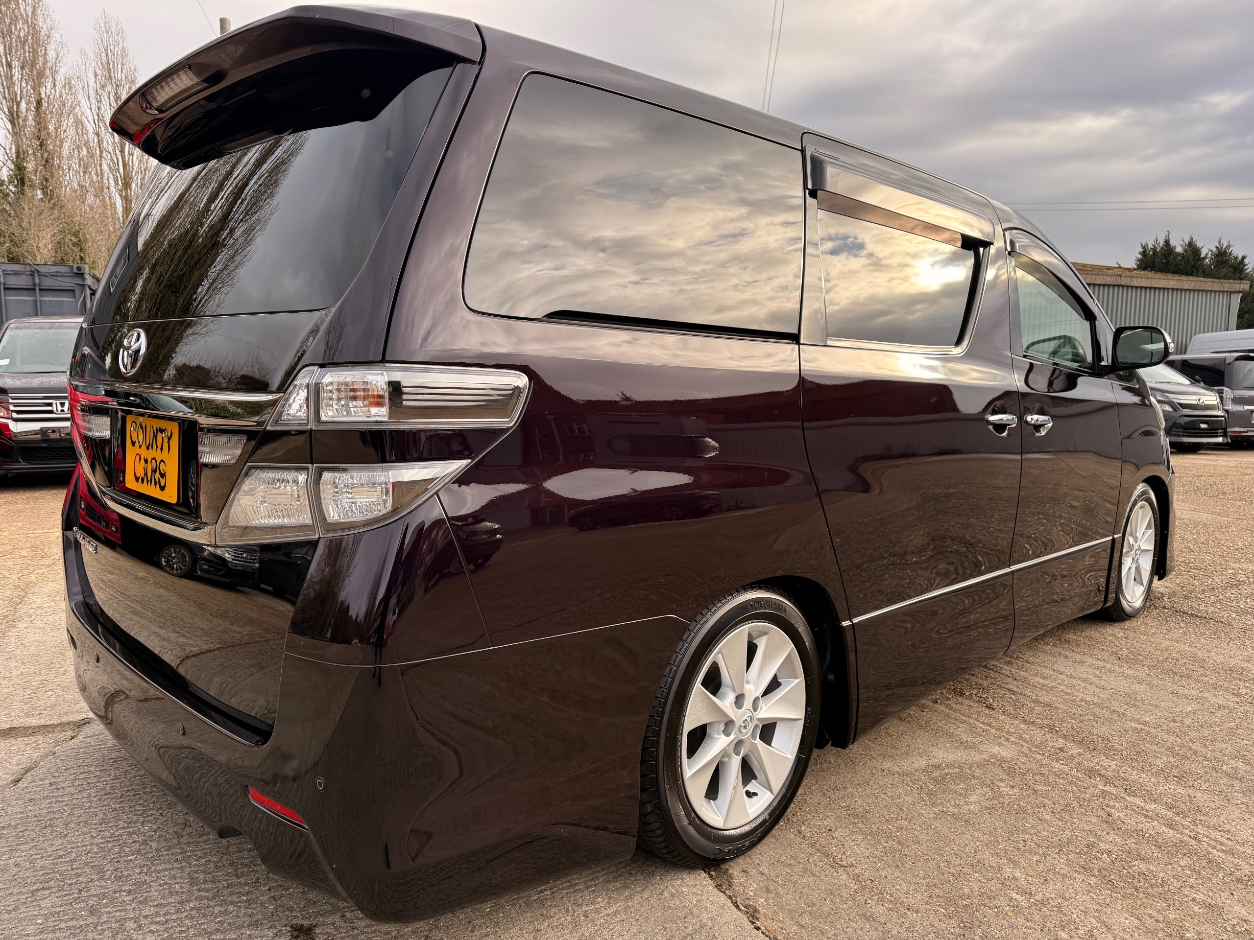 2013 Toyota Vellfire 2.4Z GOLDEN EYES EDITION 2013-63-Reg, Face-lift edition, Finished in Stunning Metallic Purple paintwork, Twin Electric Soft Closing Sliding Doors, Electric Soft closing Tailgate, Twin Sunroofs, Rear Electric Sunroof, Front spots with Gold Surrounds, Full Privacy Glass, Rear Spoiler with built in brake light, 18” Toyota dark silver Alloys, Hodellista Front grille and Front Splitter, Key-less Entry, Key-less start, 7 Seater 7 Unblemished Half Black leather seats with red stitching, The Front Seats have armrests, Centre console with flip up cup holders, The centre seats are Lounge style seats with extra leg rests and twin armrests on each seat, The seats also slide forwards and backwards and side to side with a folding centre table with built in cup holders, easy access to the rear seats, Isofix centre seats, The rear seats fold away to give way to a large boot, Strip L.E.D lighting, Ambient lighting, Push button Start, Front and Rear parking sensors, Traction Control, Front and Rear Electric windows, Twin Sunroofs, Colour reversing camera, Isofix points, Stereo System with Apple CarPlay,Red and Black Golden eyes floor mats, Cruise Control, Only covered a Genuine 73,000 Miles With All the Genuine paperwork from Japan including the auction sheet and Export Certificate which both prove the mileage and condition before it left Japan