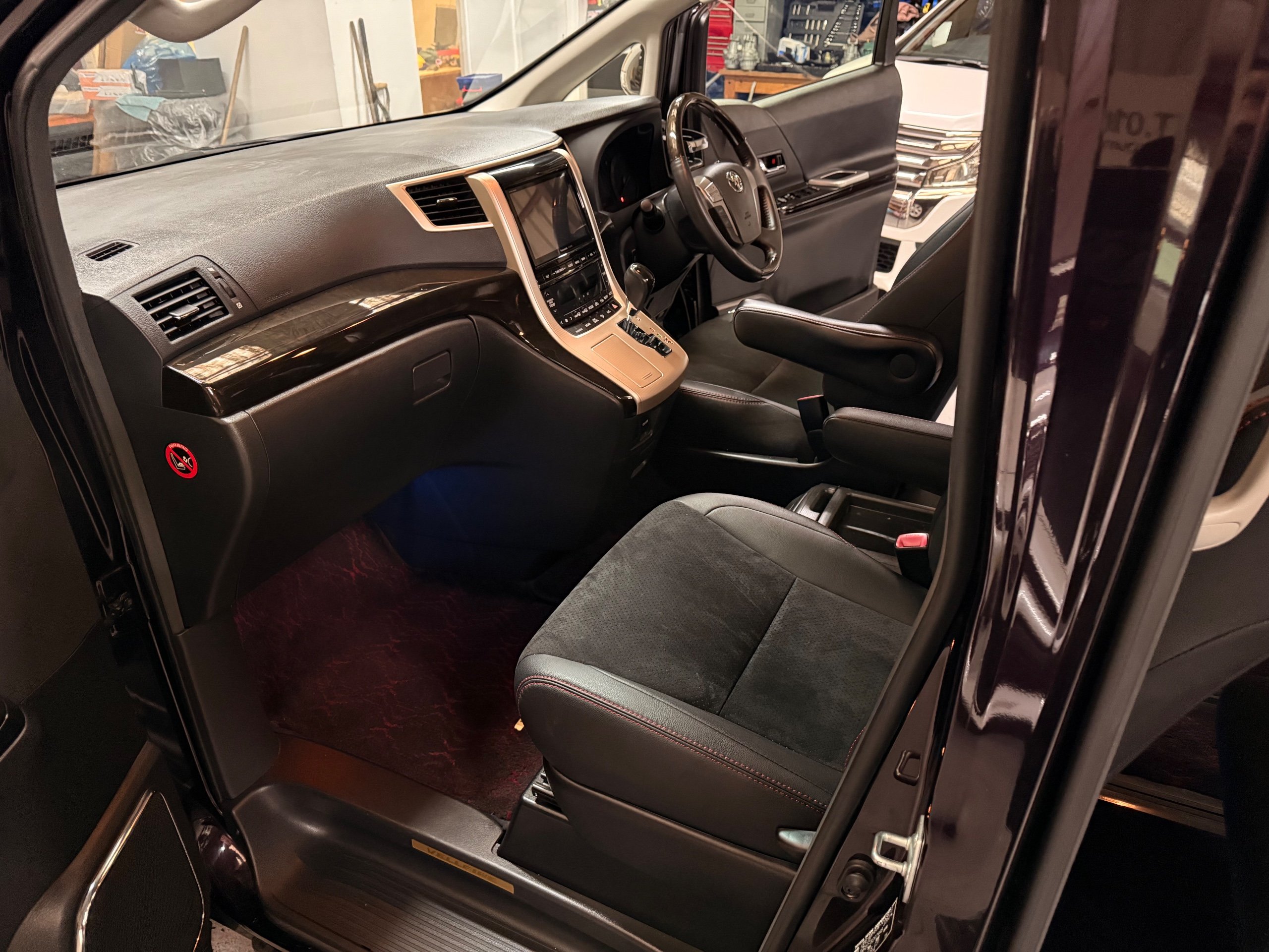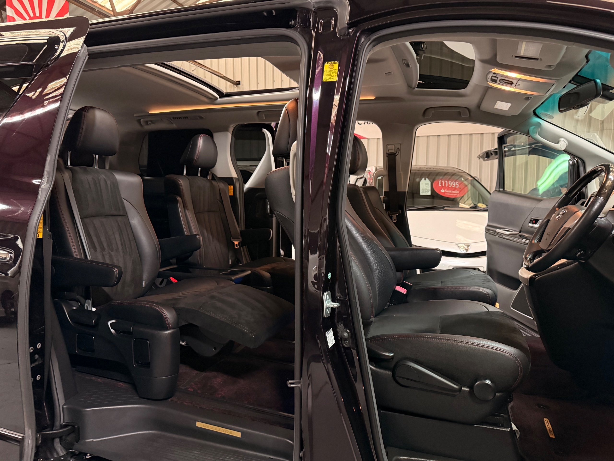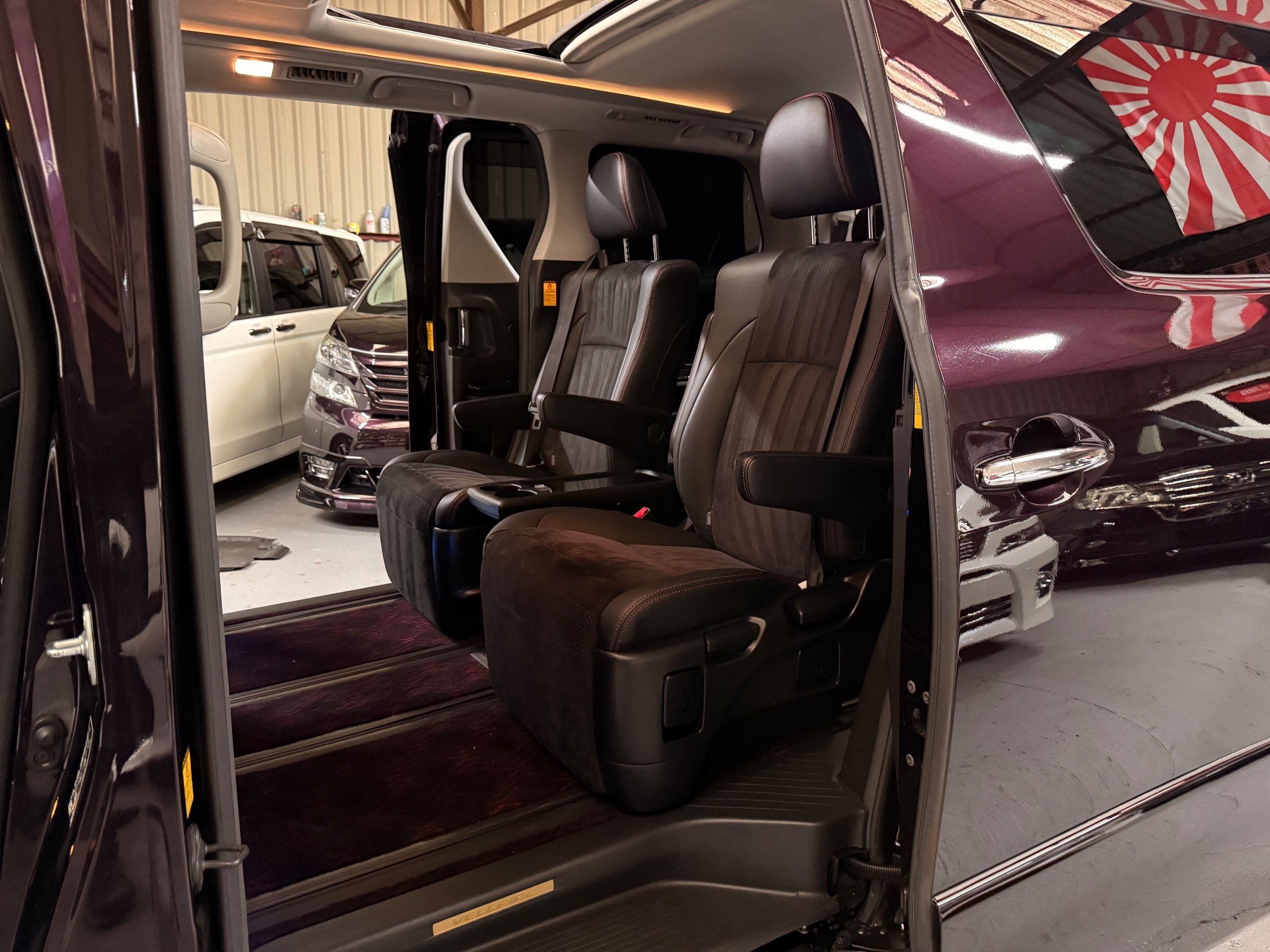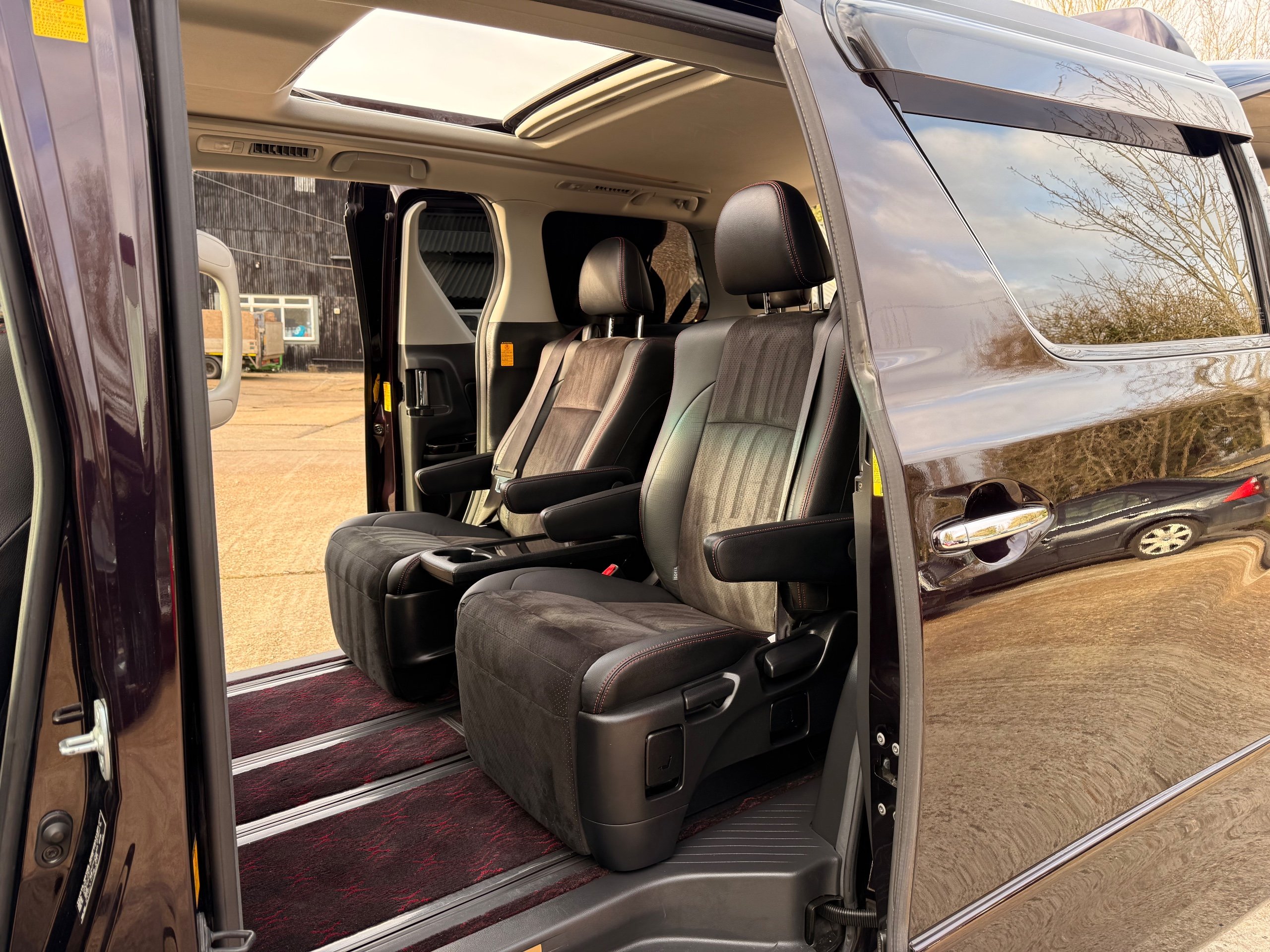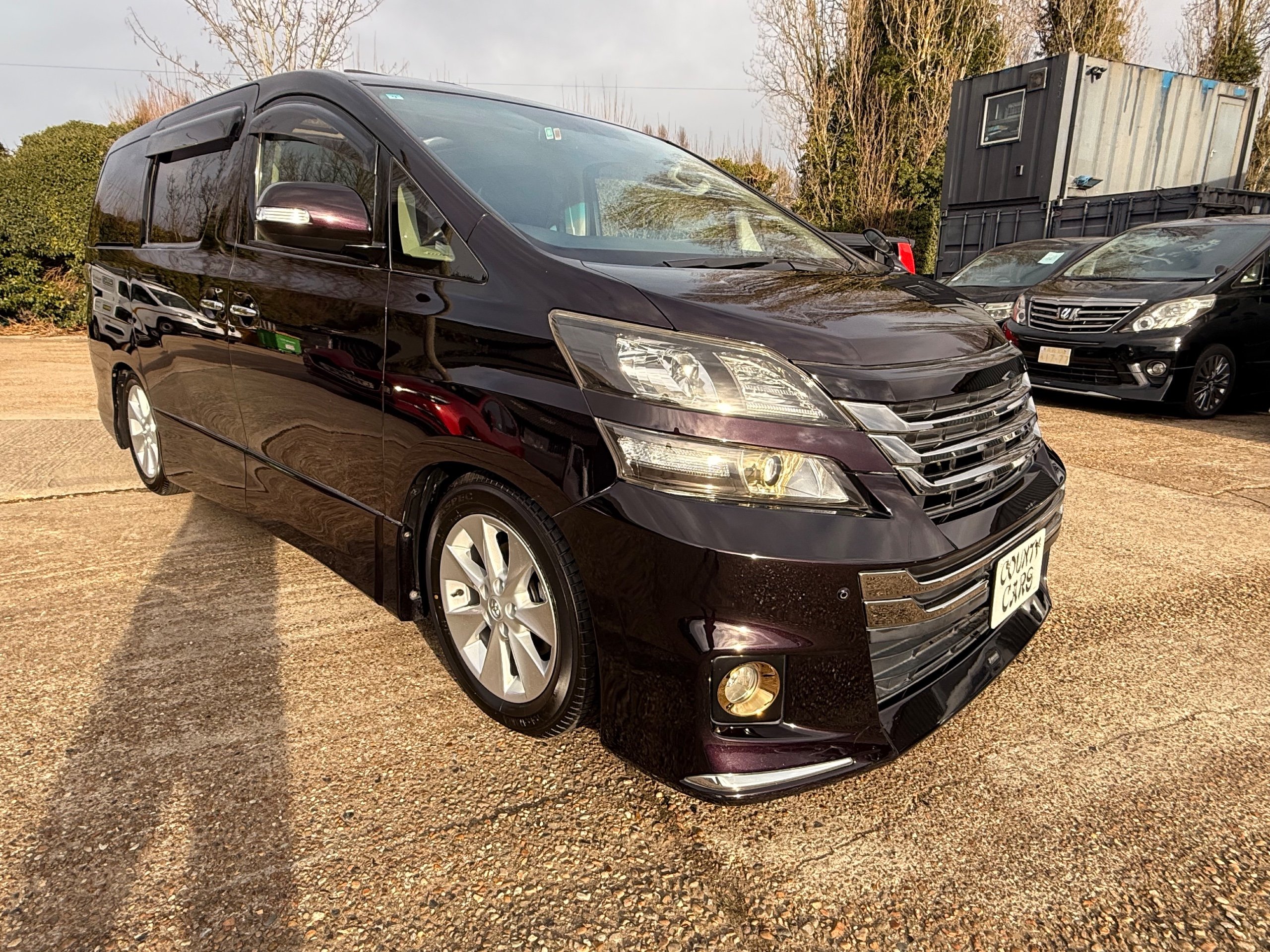 2013 Toyota Vellfire 2.4Z GOLDEN EYES EDITION 2013-63-Reg, Face-lift edition, Finished in Stunning Metallic Purple paintwork, Twin Electric Soft Closing Sliding Doors, Electric Soft closing Tailgate, Twin Sunroofs, Rear Electric Sunroof, Front spots with Gold Surrounds, Full Privacy Glass, Rear Spoiler with built in brake light, 18” Toyota dark silver Alloys, Hodellista Front grille and Front Splitter, Key-less Entry, Key-less start, 7 Seater 7 Unblemished Half Black leather seats with red stitching, The Front Seats have armrests, Centre console with flip up cup holders, The centre seats are Lounge style seats with extra leg rests and twin armrests on each seat, The seats also slide forwards and backwards and side to side with a folding centre table with built in cup holders, easy access to the rear seats, Isofix centre seats, The rear seats fold away to give way to a large boot, Strip L.E.D lighting, Ambient lighting, Push button Start, Front and Rear parking sensors, Traction Control, Front and Rear Electric windows, Twin Sunroofs, Colour reversing camera, Isofix points, Stereo System with Apple CarPlay,Red and Black Golden eyes floor mats, Cruise Control, Only covered a Genuine 73,000 Miles With All the Genuine paperwork from Japan including the auction sheet and Export Certificate which both prove the mileage and condition before it left Japan