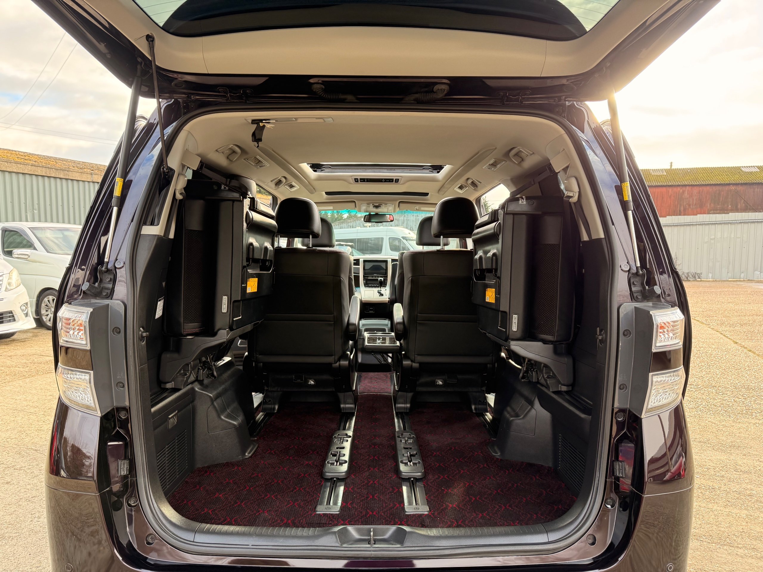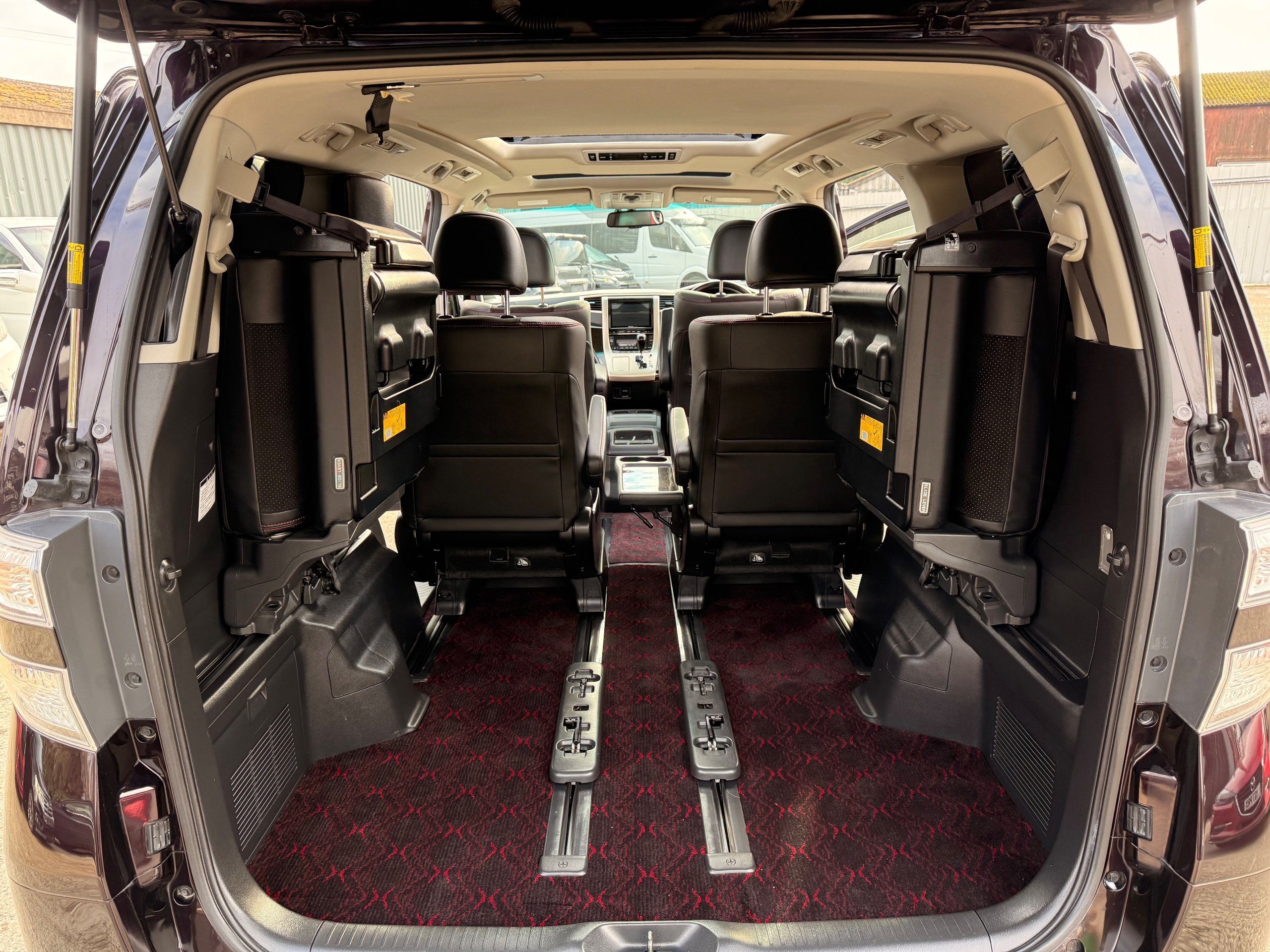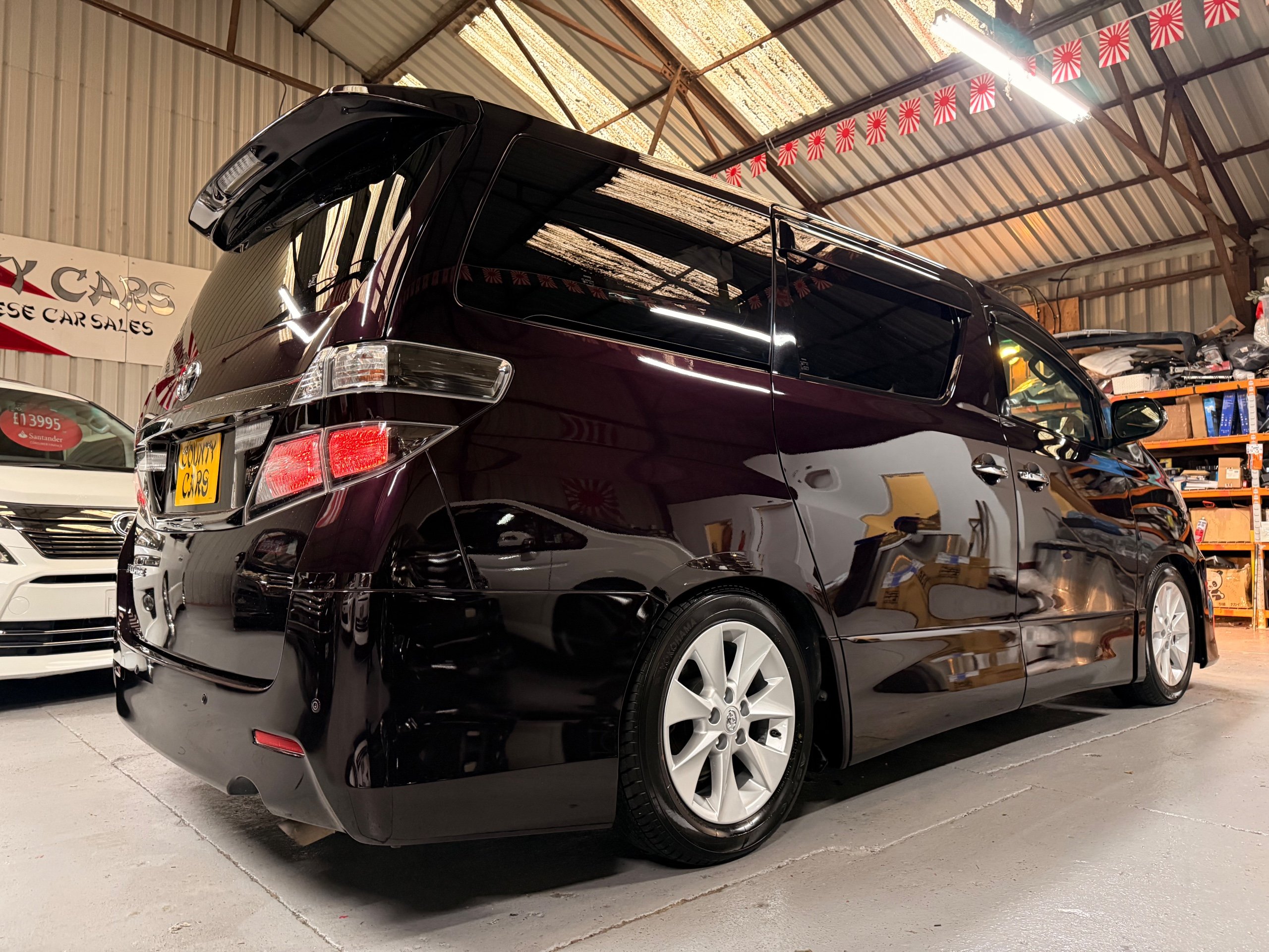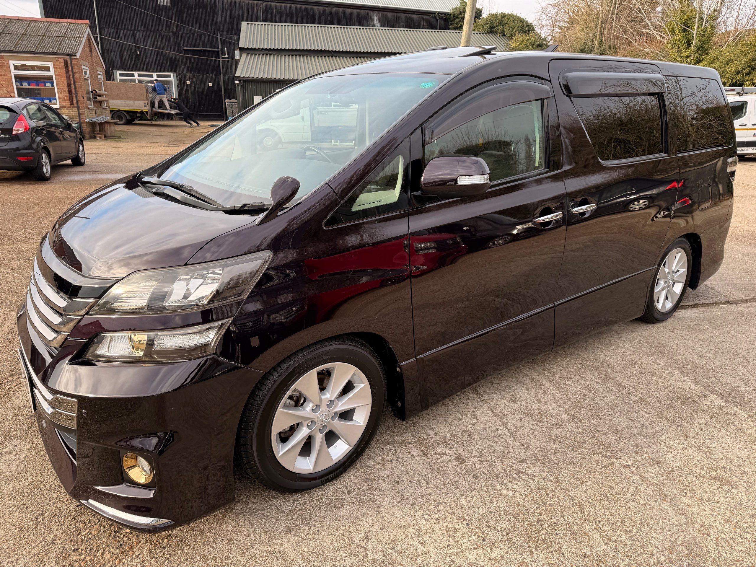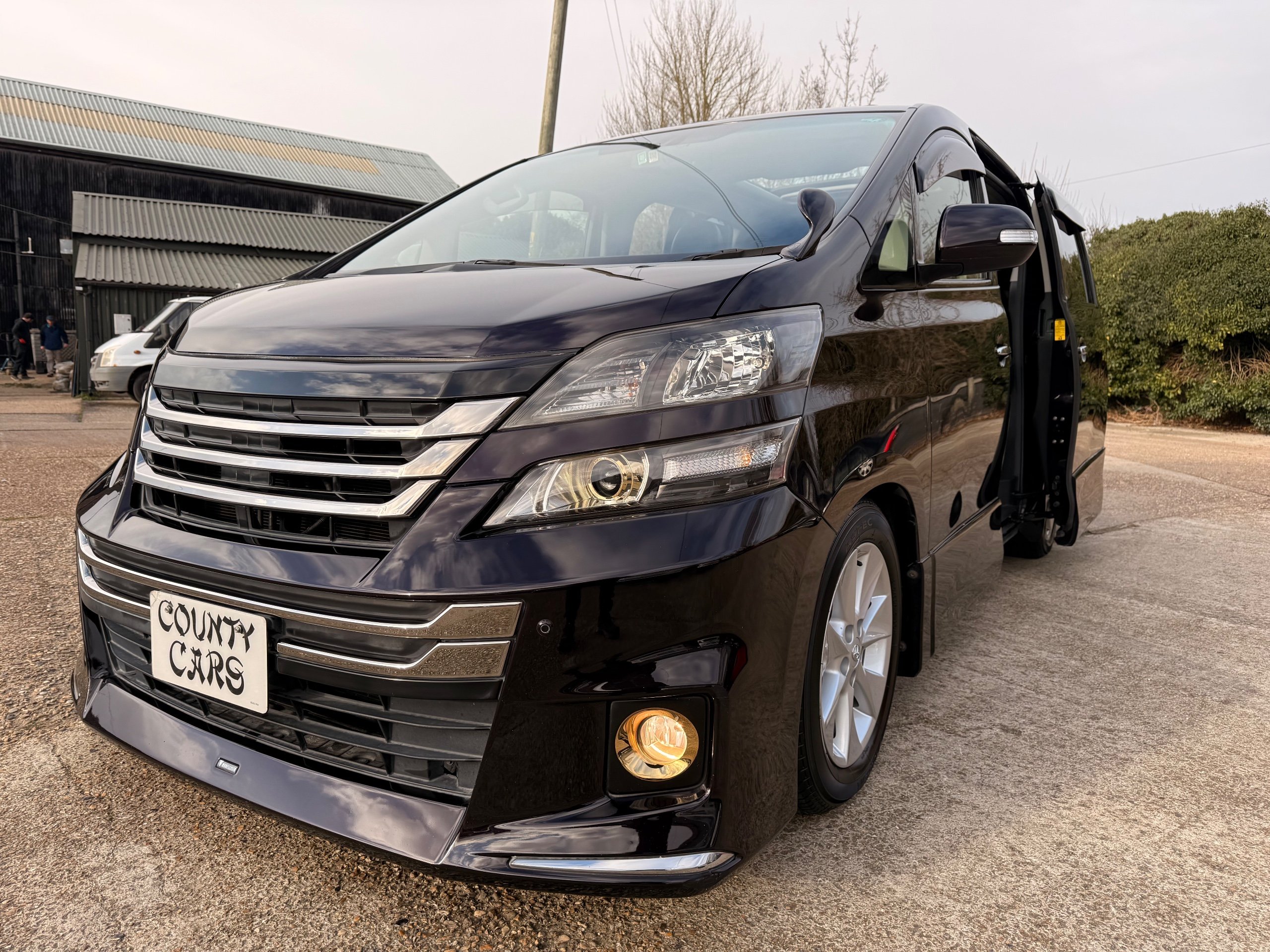 2013 Toyota Vellfire 2.4Z GOLDEN EYES EDITION 2013-63-Reg, Face-lift edition, Finished in Stunning Metallic Purple paintwork, Twin Electric Soft Closing Sliding Doors, Electric Soft closing Tailgate, Twin Sunroofs, Rear Electric Sunroof, Front spots with Gold Surrounds, Full Privacy Glass, Rear Spoiler with built in brake light, 18” Toyota dark silver Alloys, Hodellista Front grille and Front Splitter, Key-less Entry, Key-less start, 7 Seater 7 Unblemished Half Black leather seats with red stitching, The Front Seats have armrests, Centre console with flip up cup holders, The centre seats are Lounge style seats with extra leg rests and twin armrests on each seat, The seats also slide forwards and backwards and side to side with a folding centre table with built in cup holders, easy access to the rear seats, Isofix centre seats, The rear seats fold away to give way to a large boot, Strip L.E.D lighting, Ambient lighting, Push button Start, Front and Rear parking sensors, Traction Control, Front and Rear Electric windows, Twin Sunroofs, Colour reversing camera, Isofix points, Stereo System with Apple CarPlay,Red and Black Golden eyes floor mats, Cruise Control, Only covered a Genuine 73,000 Miles With All the Genuine paperwork from Japan including the auction sheet and Export Certificate which both prove the mileage and condition before it left Japan