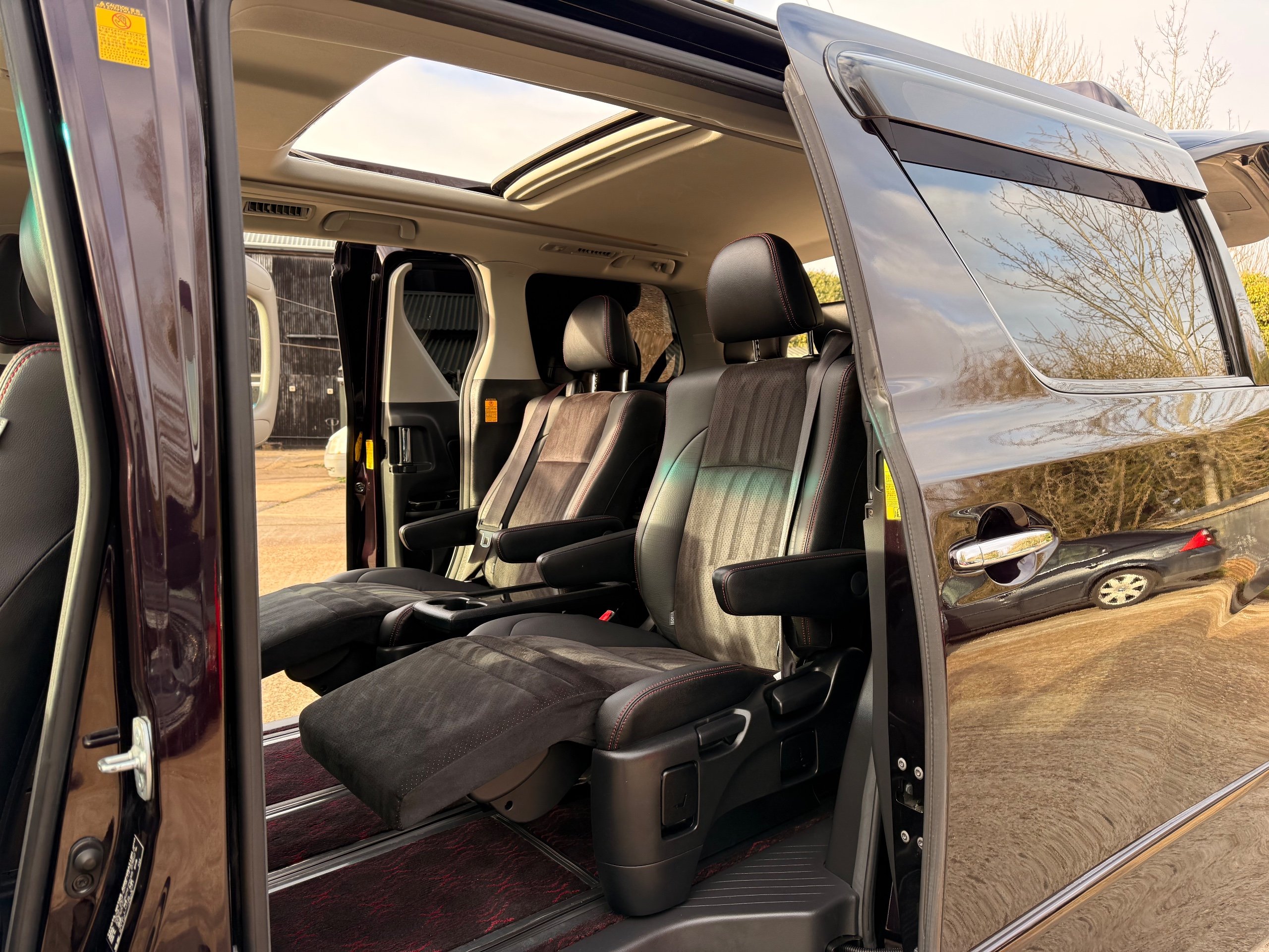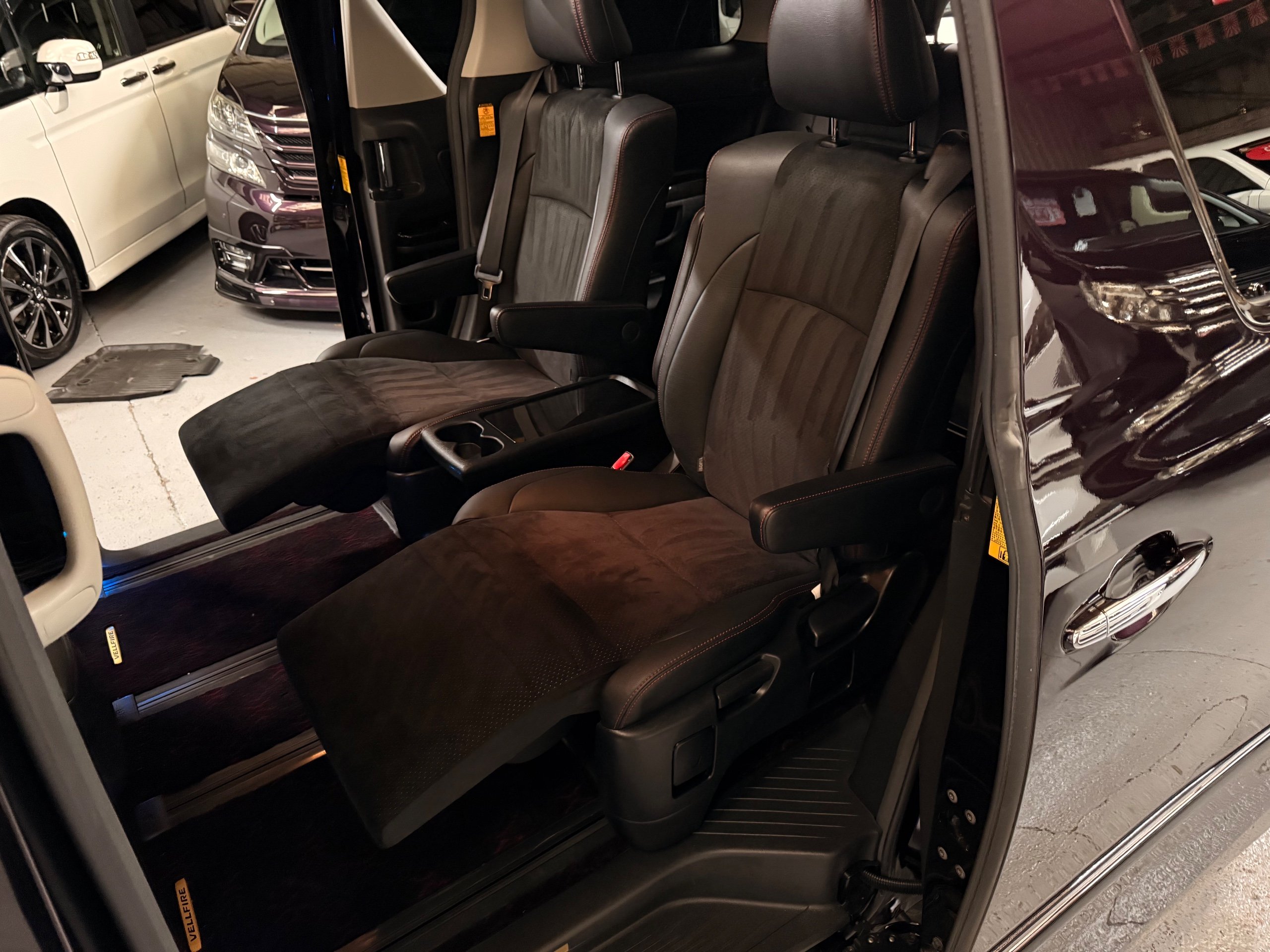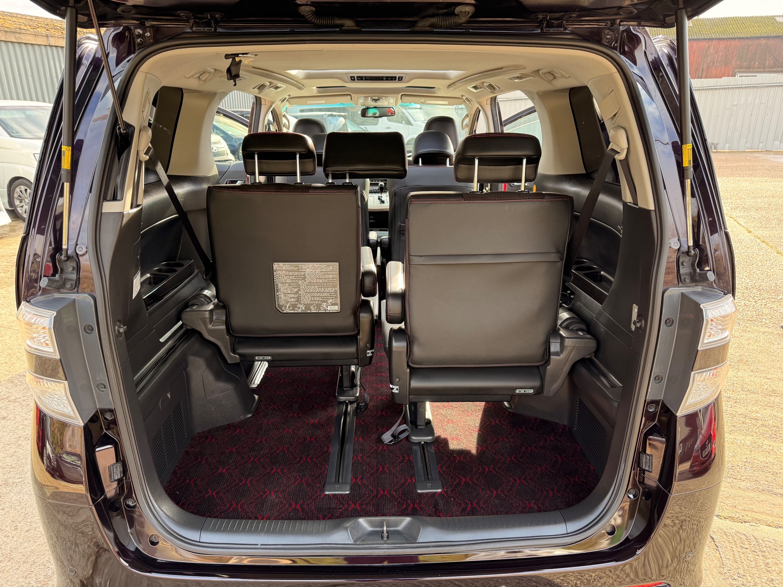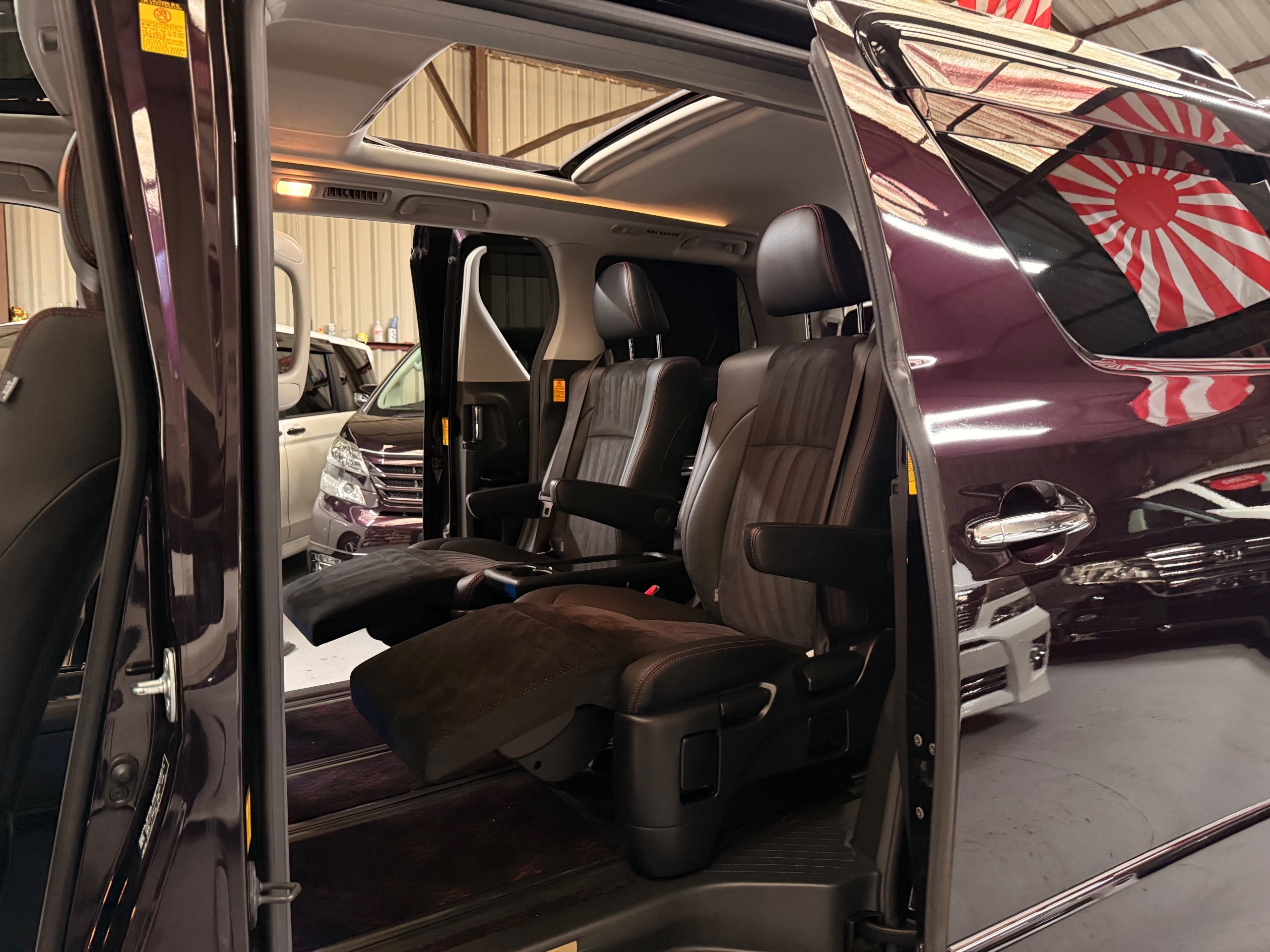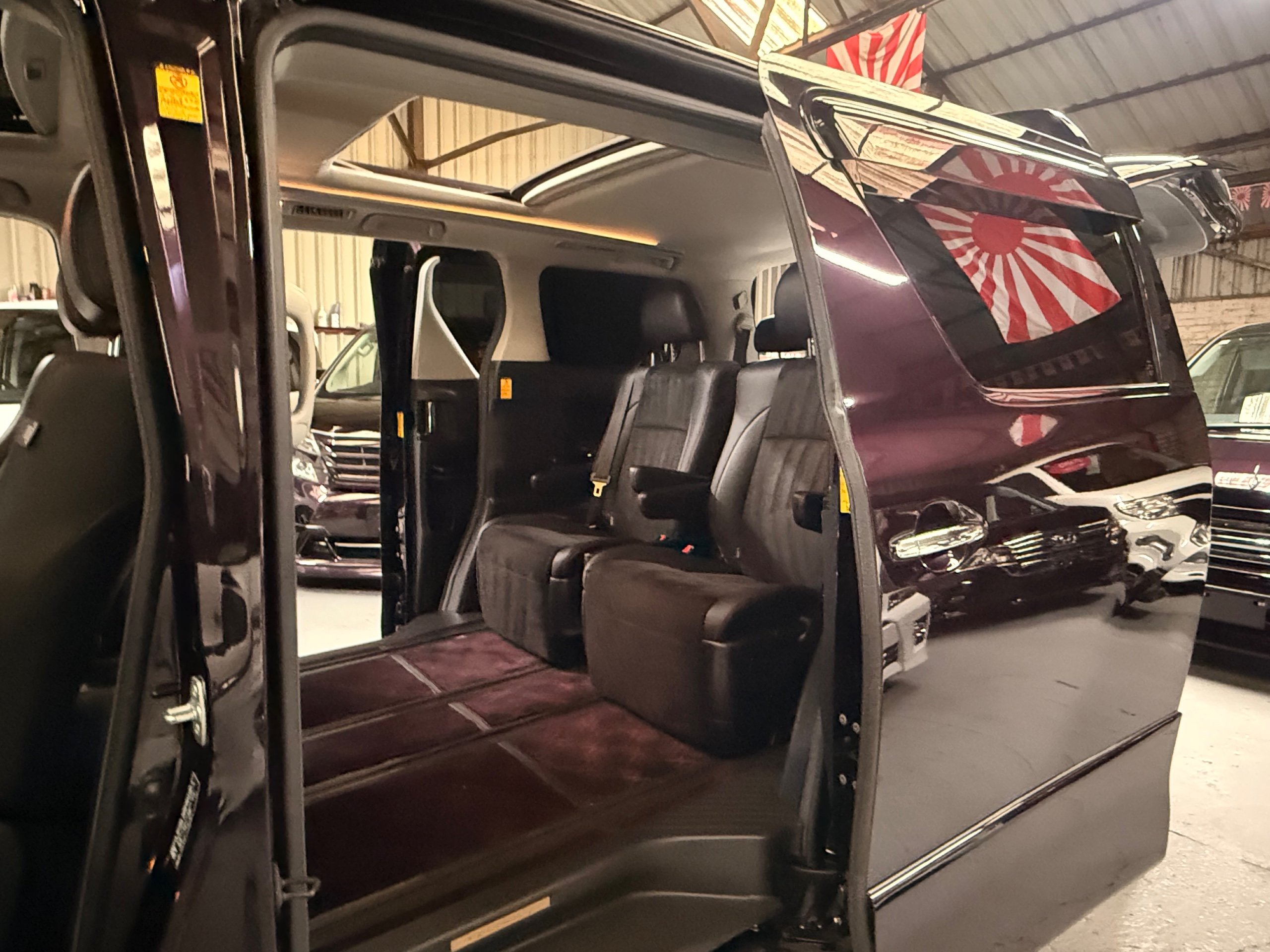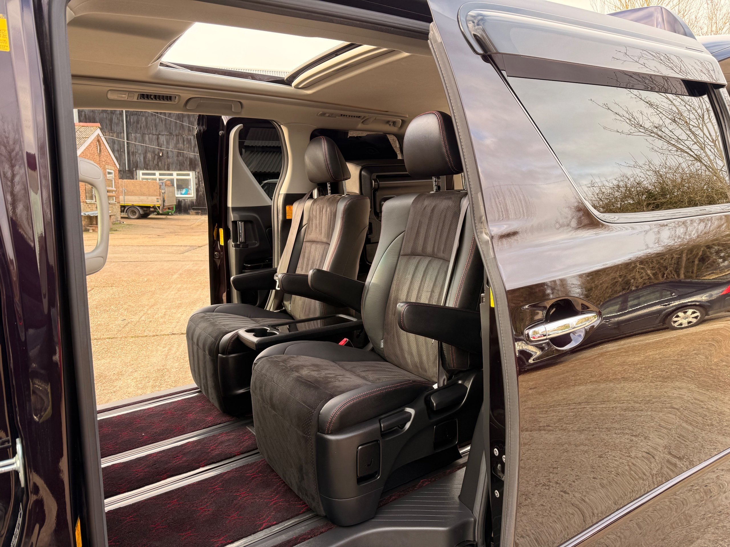 2013 Toyota Vellfire 2.4Z GOLDEN EYES EDITION 2013-63-Reg, Face-lift edition, Finished in Stunning Metallic Purple paintwork, Twin Electric Soft Closing Sliding Doors, Electric Soft closing Tailgate, Twin Sunroofs, Rear Electric Sunroof, Front spots with Gold Surrounds, Full Privacy Glass, Rear Spoiler with built in brake light, 18” Toyota dark silver Alloys, Hodellista Front grille and Front Splitter, Key-less Entry, Key-less start, 7 Seater 7 Unblemished Half Black leather seats with red stitching, The Front Seats have armrests, Centre console with flip up cup holders, The centre seats are Lounge style seats with extra leg rests and twin armrests on each seat, The seats also slide forwards and backwards and side to side with a folding centre table with built in cup holders, easy access to the rear seats, Isofix centre seats, The rear seats fold away to give way to a large boot, Strip L.E.D lighting, Ambient lighting, Push button Start, Front and Rear parking sensors, Traction Control, Front and Rear Electric windows, Twin Sunroofs, Colour reversing camera, Isofix points, Stereo System with Apple CarPlay,Red and Black Golden eyes floor mats, Cruise Control, Only covered a Genuine 73,000 Miles With All the Genuine paperwork from Japan including the auction sheet and Export Certificate which both prove the mileage and condition before it left Japan