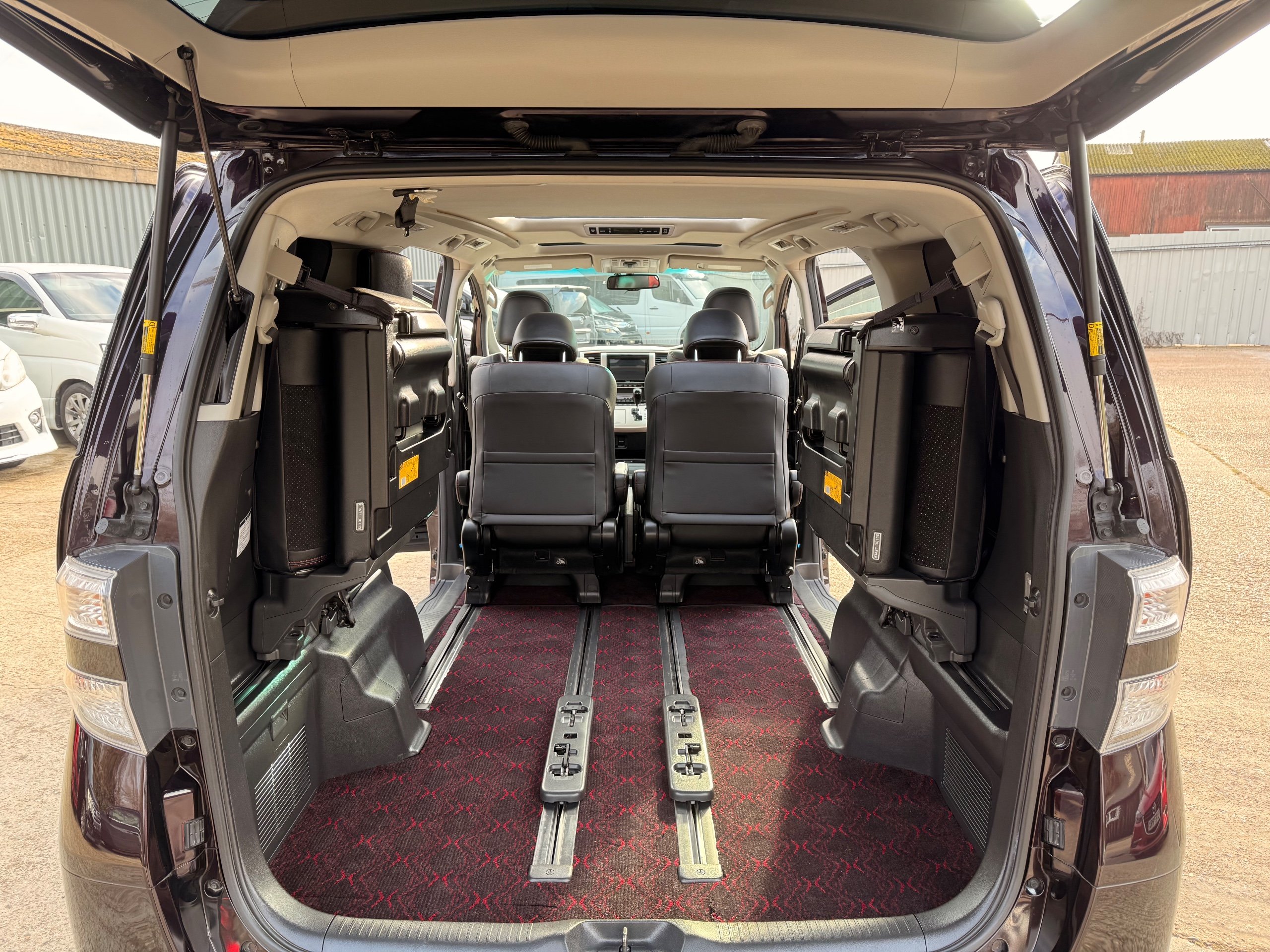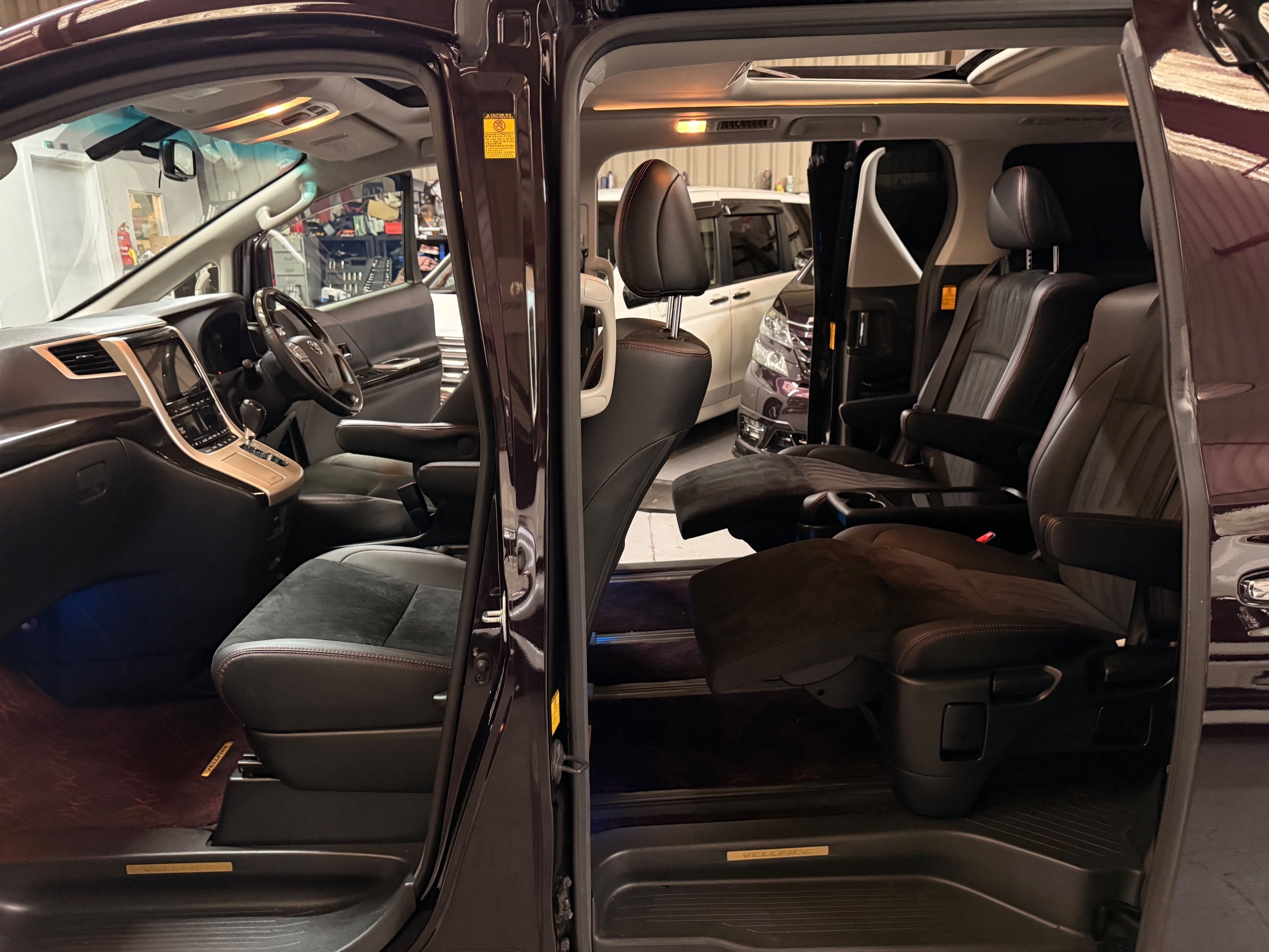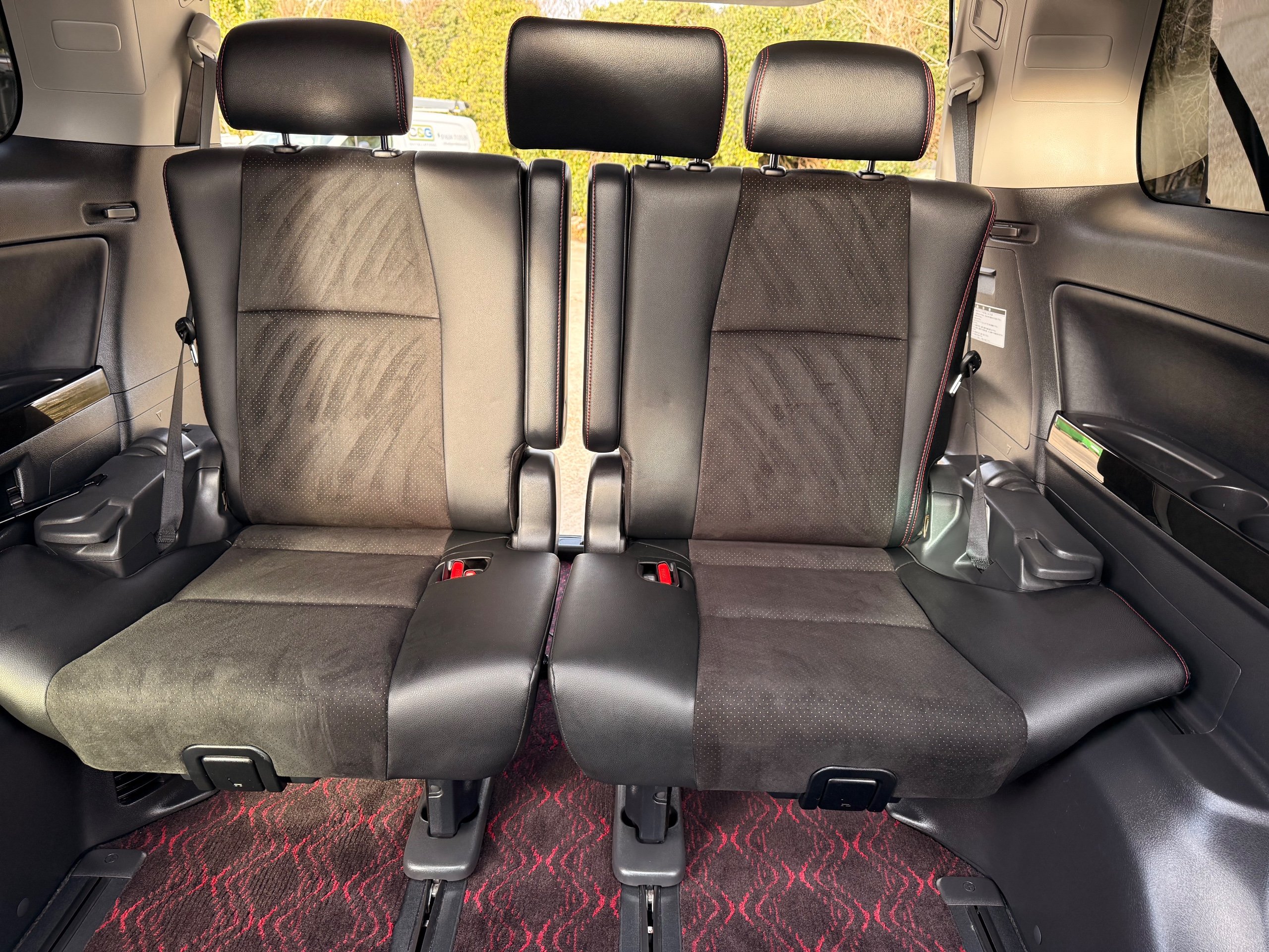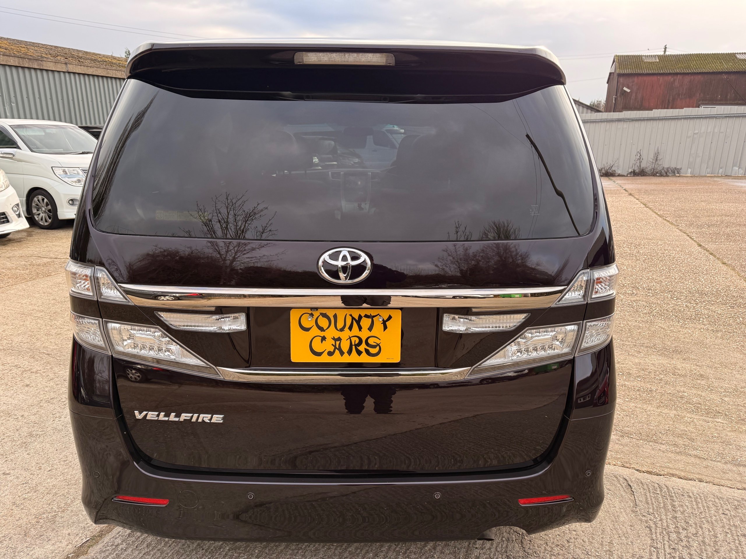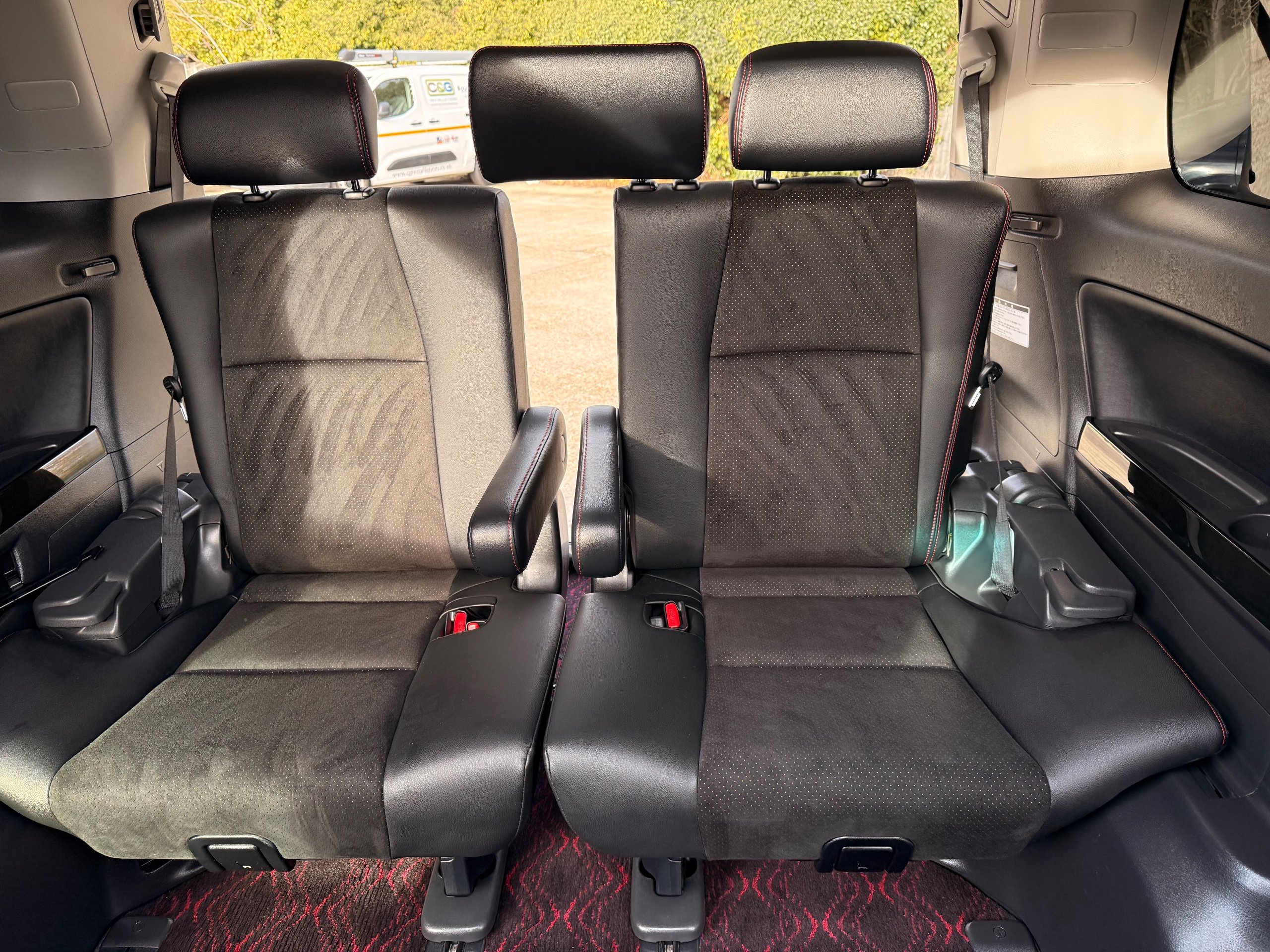 2013 Toyota Vellfire 2.4Z GOLDEN EYES EDITION 2013-63-Reg, Face-lift edition, Finished in Stunning Metallic Purple paintwork, Twin Electric Soft Closing Sliding Doors, Electric Soft closing Tailgate, Twin Sunroofs, Rear Electric Sunroof, Front spots with Gold Surrounds, Full Privacy Glass, Rear Spoiler with built in brake light, 18” Toyota dark silver Alloys, Hodellista Front grille and Front Splitter, Key-less Entry, Key-less start, 7 Seater 7 Unblemished Half Black leather seats with red stitching, The Front Seats have armrests, Centre console with flip up cup holders, The centre seats are Lounge style seats with extra leg rests and twin armrests on each seat, The seats also slide forwards and backwards and side to side with a folding centre table with built in cup holders, easy access to the rear seats, Isofix centre seats, The rear seats fold away to give way to a large boot, Strip L.E.D lighting, Ambient lighting, Push button Start, Front and Rear parking sensors, Traction Control, Front and Rear Electric windows, Twin Sunroofs, Colour reversing camera, Isofix points, Stereo System with Apple CarPlay,Red and Black Golden eyes floor mats, Cruise Control, Only covered a Genuine 73,000 Miles With All the Genuine paperwork from Japan including the auction sheet and Export Certificate which both prove the mileage and condition before it left Japan