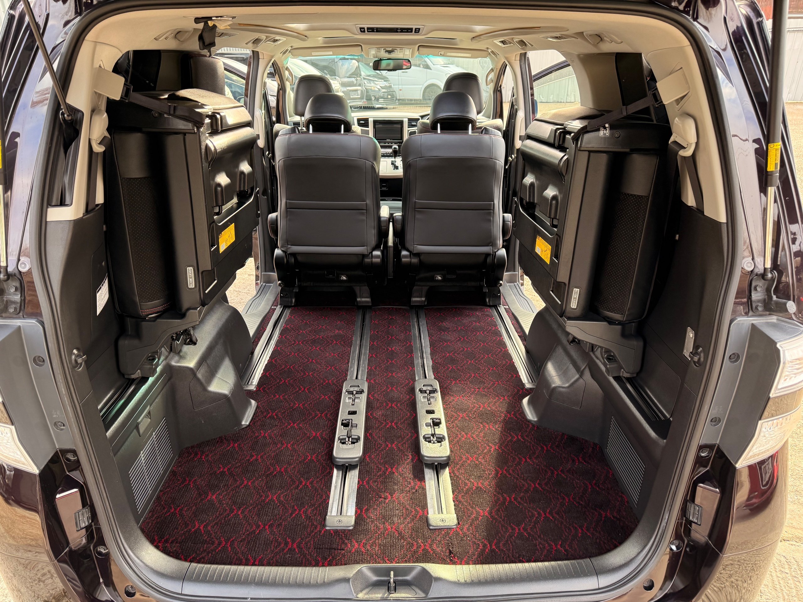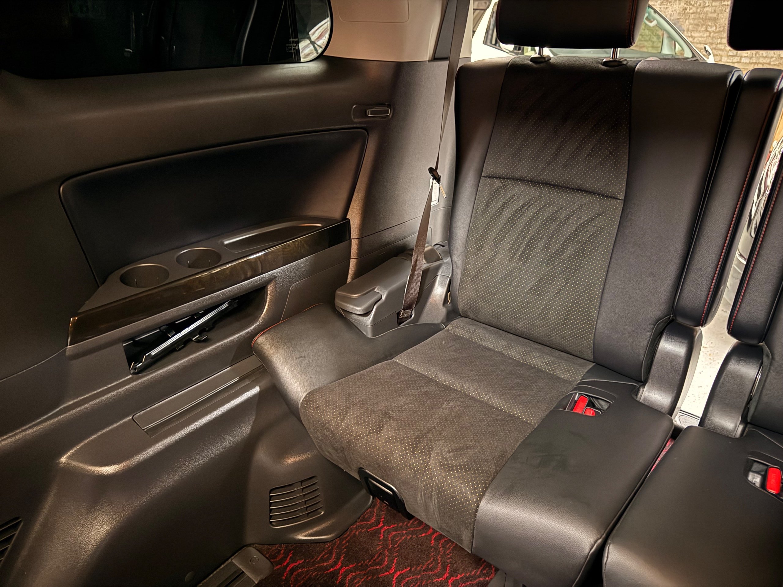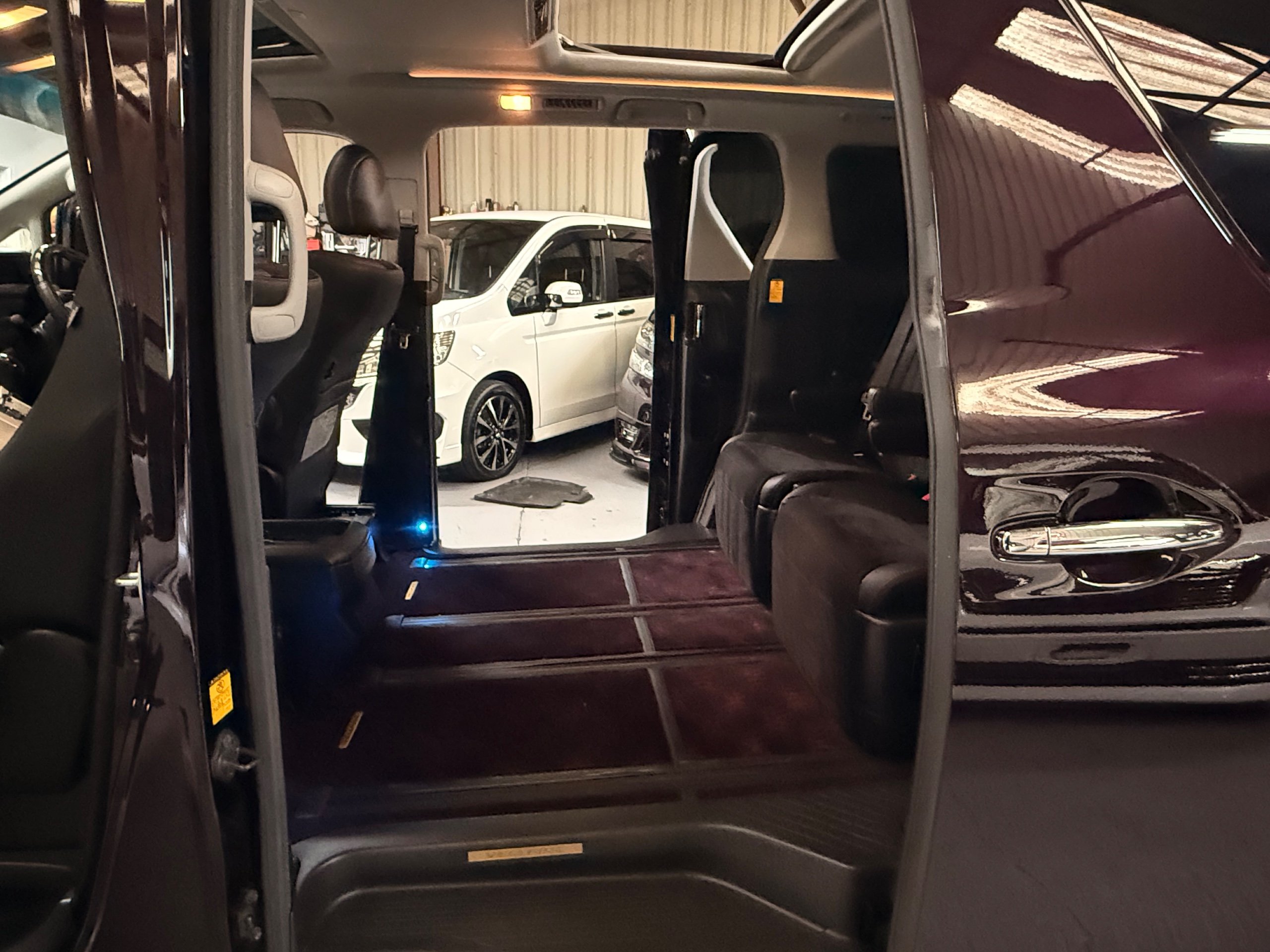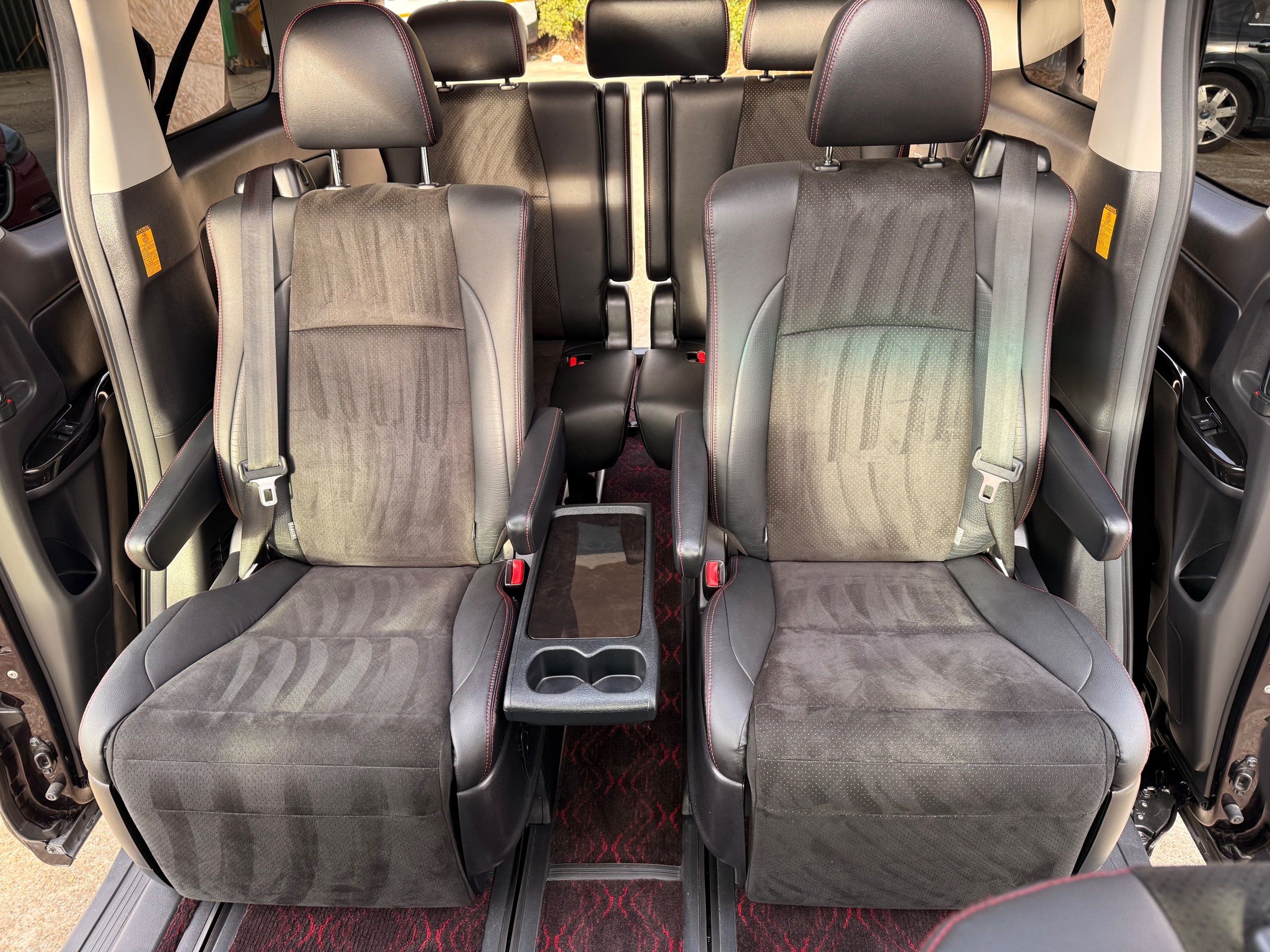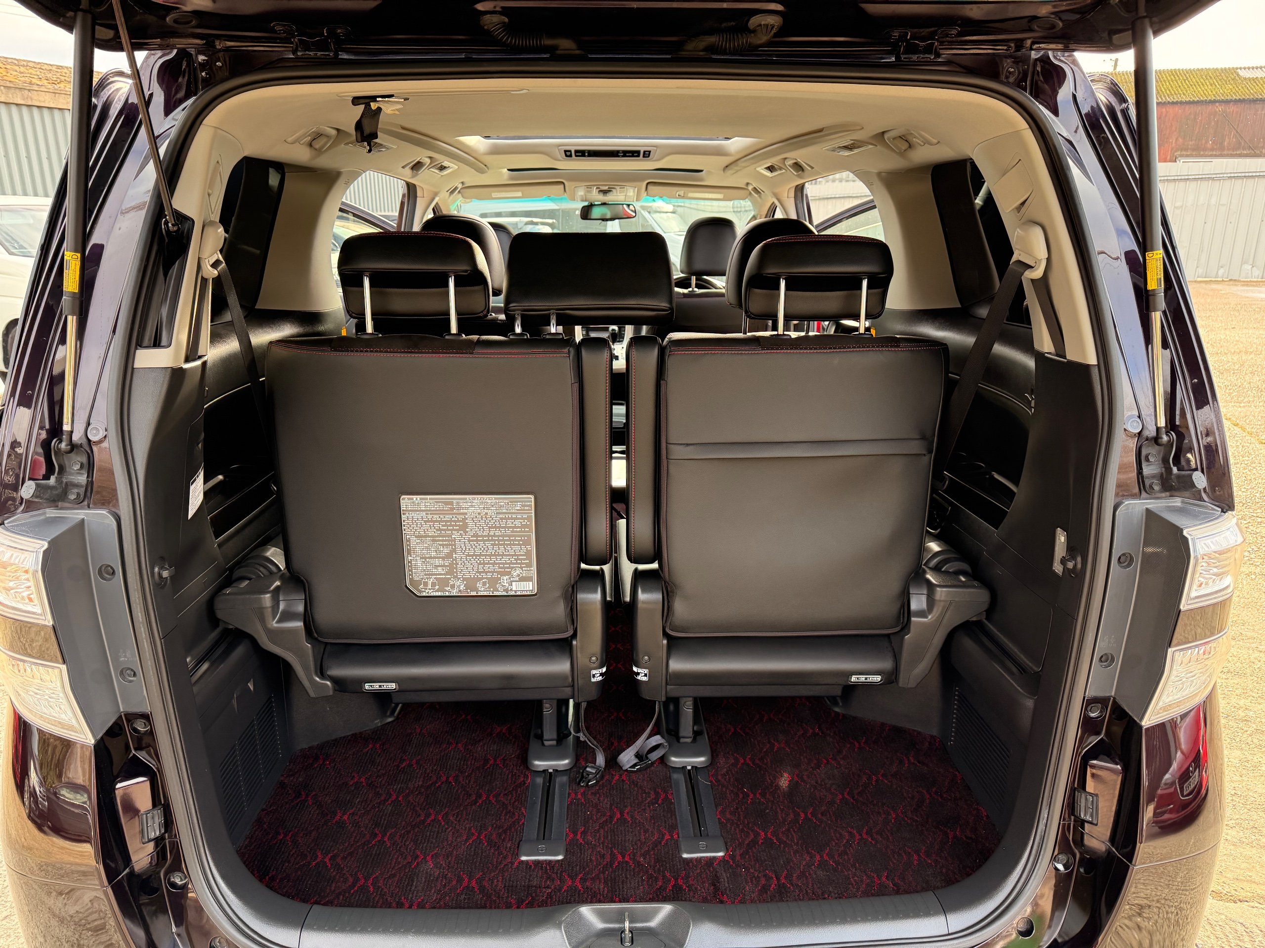 2013 Toyota Vellfire 2.4Z GOLDEN EYES EDITION 2013-63-Reg, Face-lift edition, Finished in Stunning Metallic Purple paintwork, Twin Electric Soft Closing Sliding Doors, Electric Soft closing Tailgate, Twin Sunroofs, Rear Electric Sunroof, Front spots with Gold Surrounds, Full Privacy Glass, Rear Spoiler with built in brake light, 18” Toyota dark silver Alloys, Hodellista Front grille and Front Splitter, Key-less Entry, Key-less start, 7 Seater 7 Unblemished Half Black leather seats with red stitching, The Front Seats have armrests, Centre console with flip up cup holders, The centre seats are Lounge style seats with extra leg rests and twin armrests on each seat, The seats also slide forwards and backwards and side to side with a folding centre table with built in cup holders, easy access to the rear seats, Isofix centre seats, The rear seats fold away to give way to a large boot, Strip L.E.D lighting, Ambient lighting, Push button Start, Front and Rear parking sensors, Traction Control, Front and Rear Electric windows, Twin Sunroofs, Colour reversing camera, Isofix points, Stereo System with Apple CarPlay,Red and Black Golden eyes floor mats, Cruise Control, Only covered a Genuine 73,000 Miles With All the Genuine paperwork from Japan including the auction sheet and Export Certificate which both prove the mileage and condition before it left Japan
