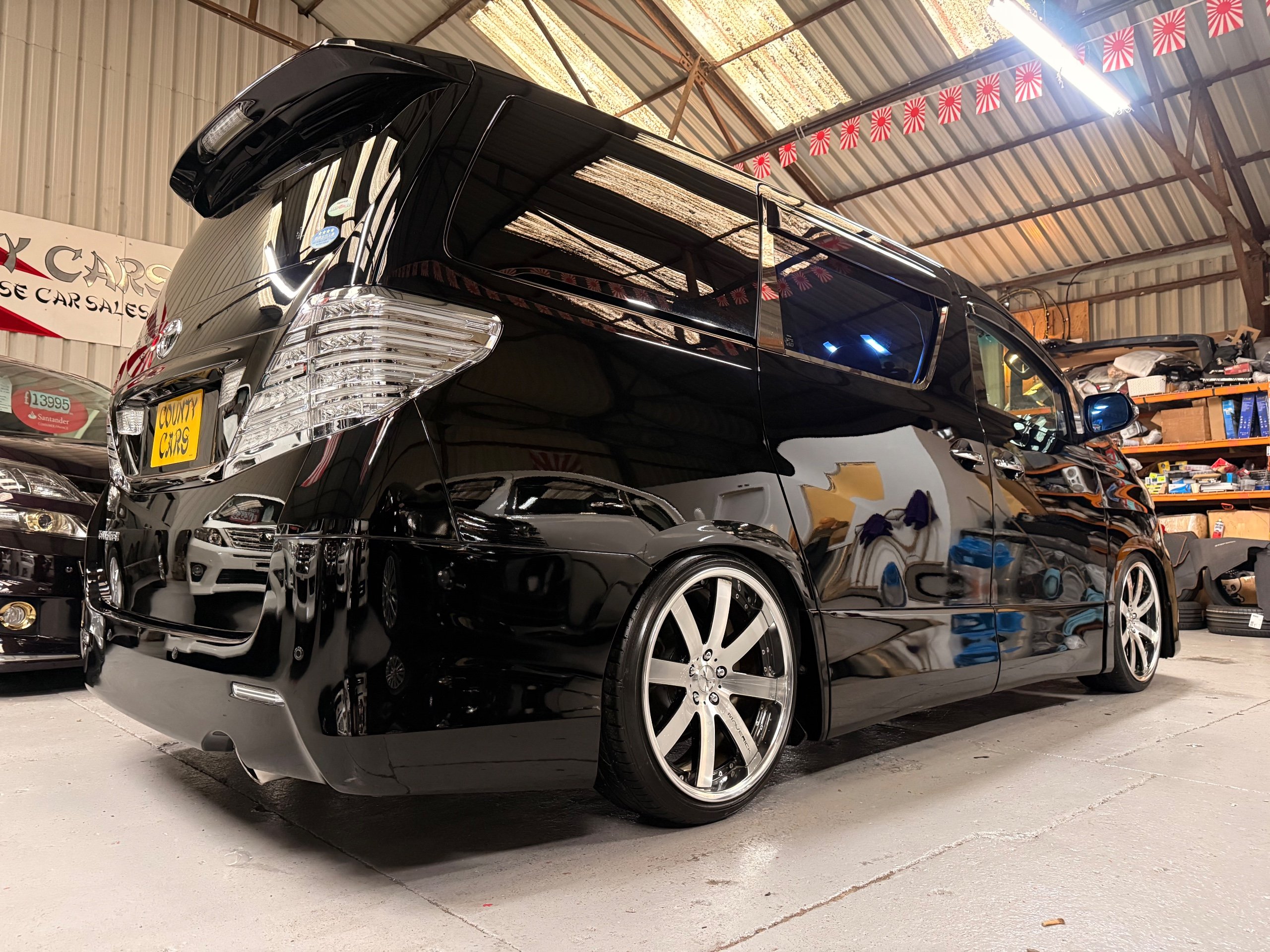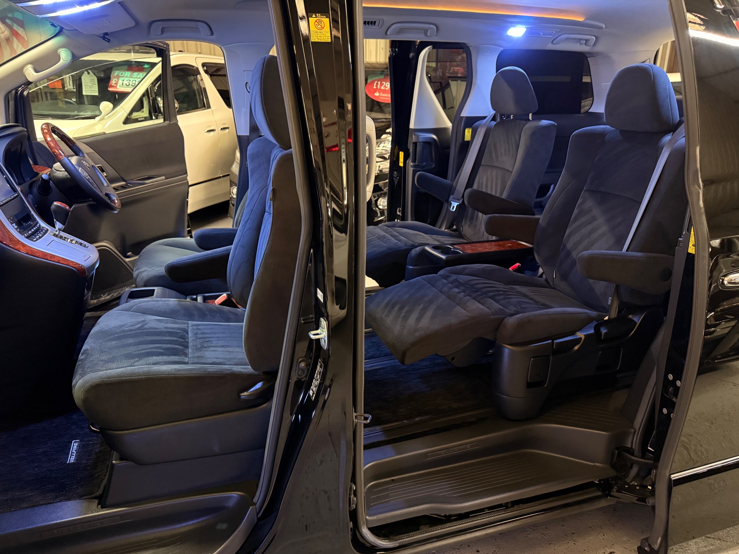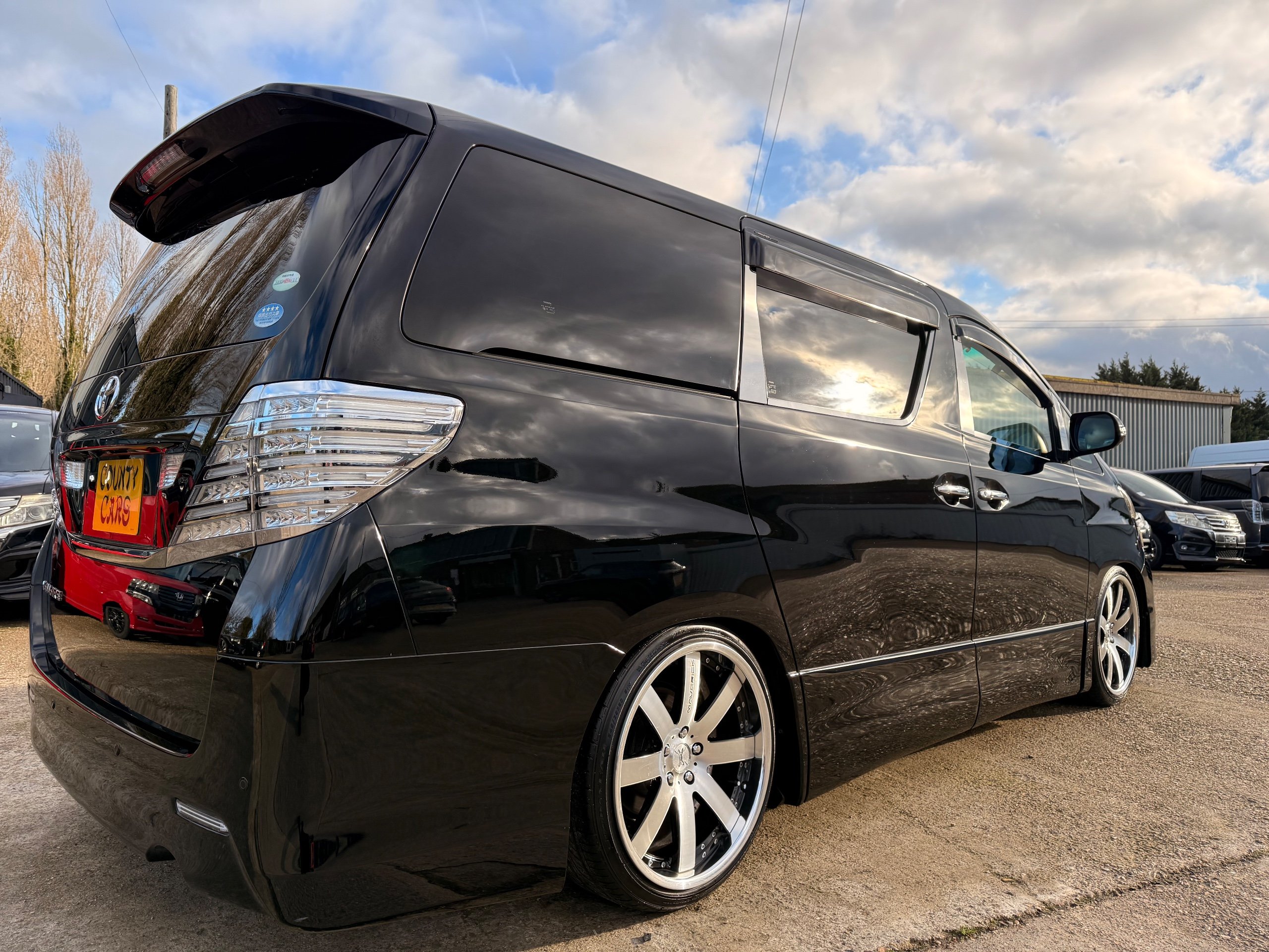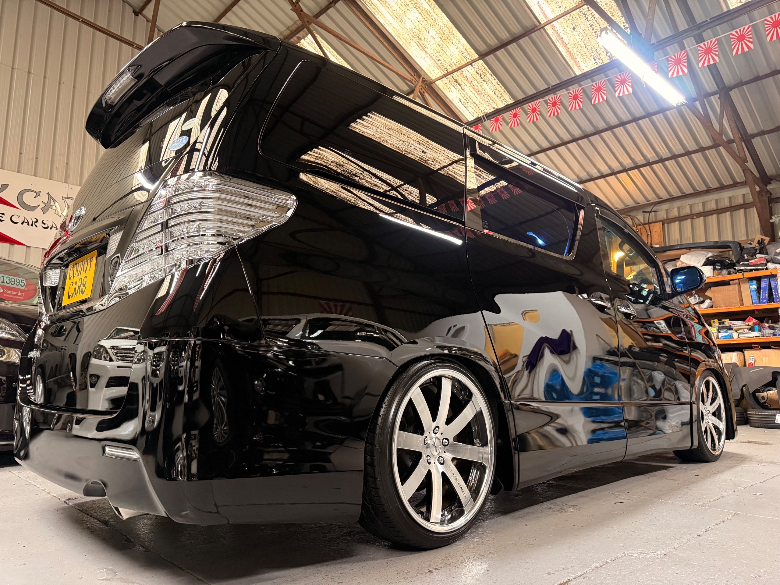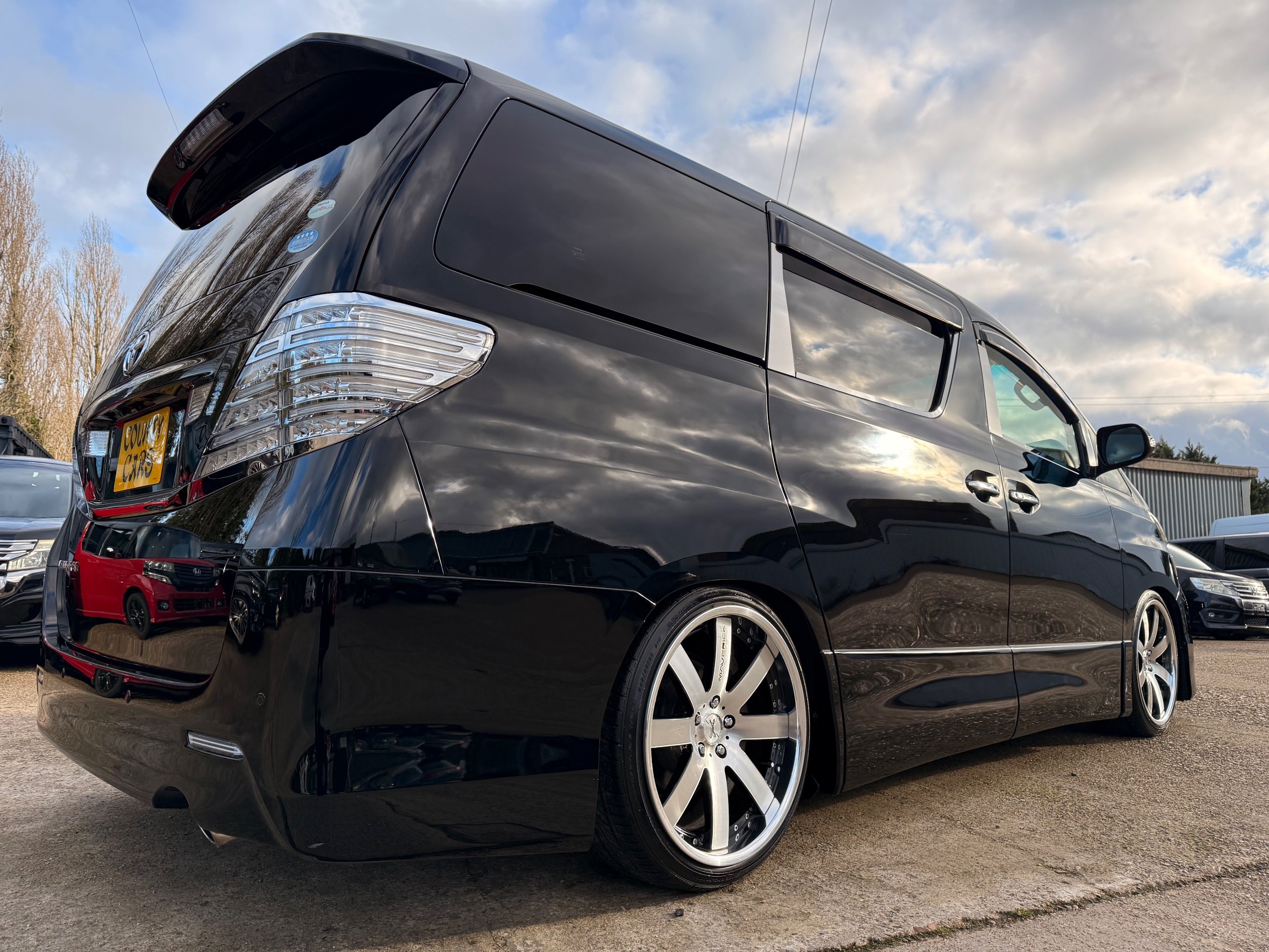2010 Toyota Vellfire 2.4Z platinum Selection, Grade 4.5 2010-60-Reg, Finished in Stunning Unmarked Black paintwork, Twin Electric Soft Closing Sliding Doors, Electric Soft Closing Tailgate, Front spots Full Privacy Glass, Rear Spoiler with built in brake light, Stunning set of 20" Maverick Alloys, The best set of rear l.e.d Clear lights, Rear bumper l.e.d lights, Key-less Entry, Key-less start, 7 Seater 7 Unblemished Black Alcantara Seats, The centre seats are Lounge style seats with extra leg rests, The seats also slide forwards and backwards and side to side with a folding centre table with built in cup holders, easy access to the rear seats, The rear seats fold away to give way to a large boot, Strip L.E.D lighting, Ambient lighting, Push button Start, Front and Rear parking sensors, Traction Control, Front and Rear Electric windows, Colour reversing camera, UK Stereo with Apple CarPlay, Electric Tailgate, Isofix points, Only covered a Genuine 20,000 Miles With All the Genuine paperwork from Japan including the auction sheet and The Export Certificate which both prove the mileage and condition before it left Japan Nationwide delivery service available