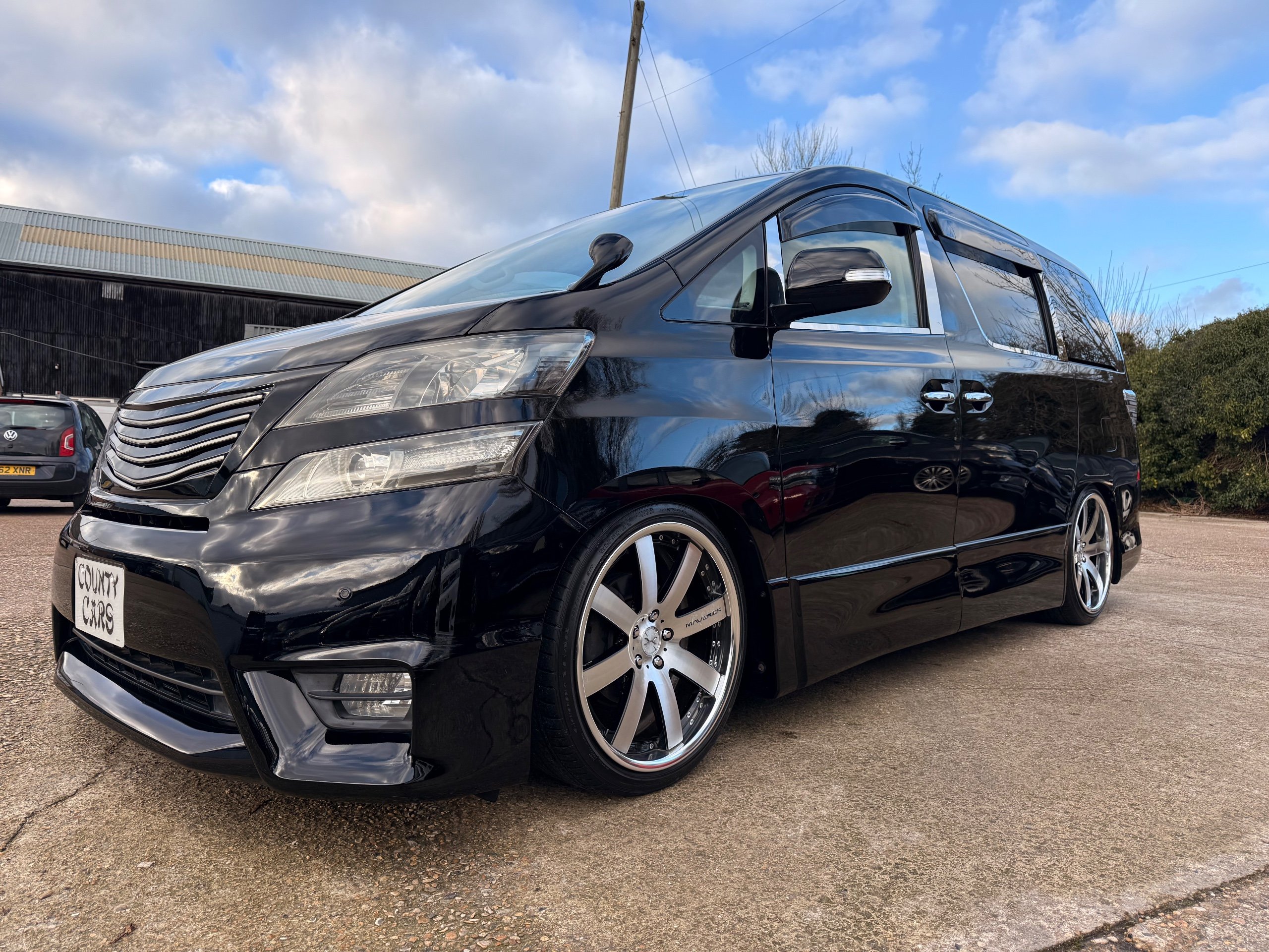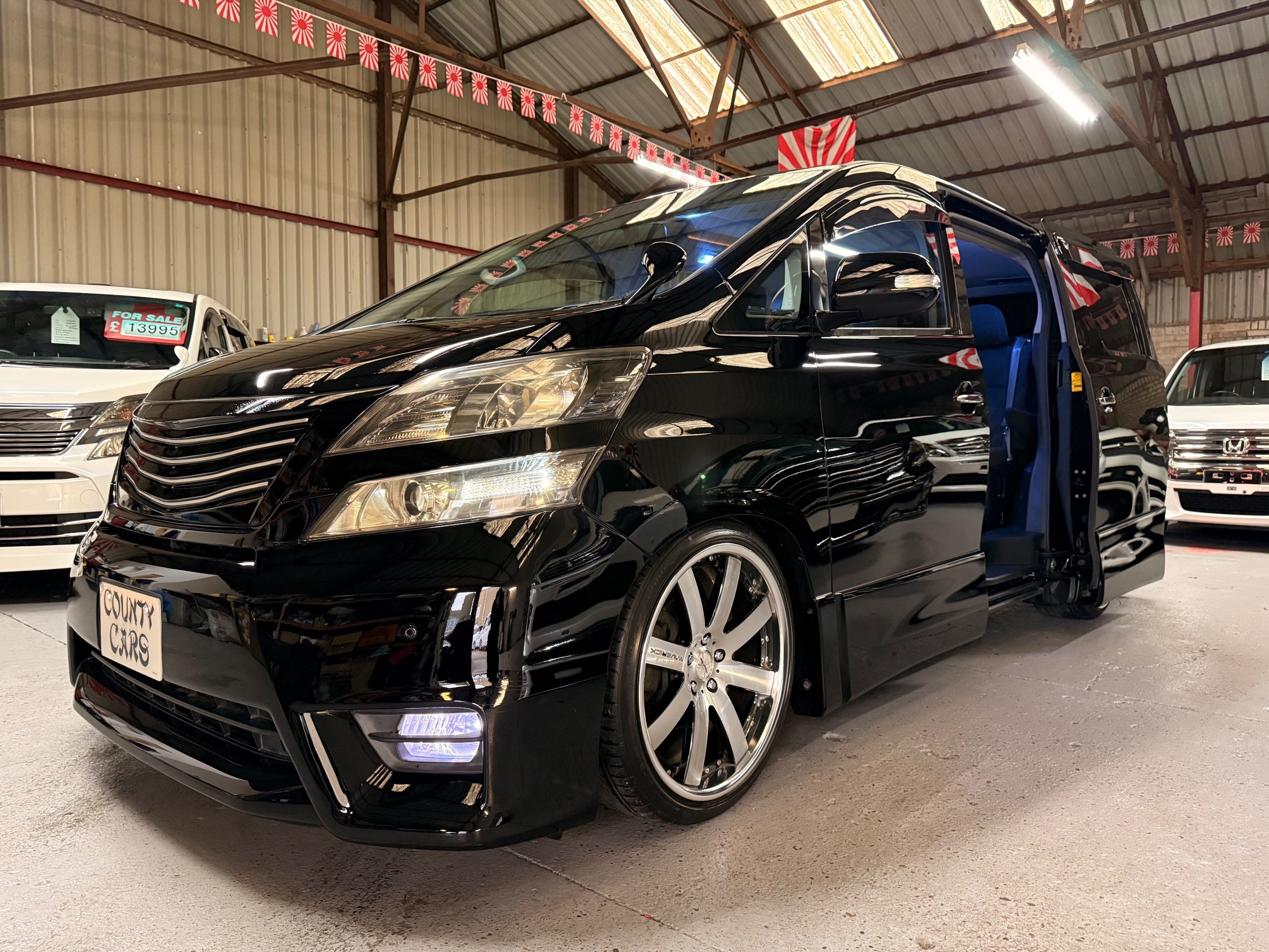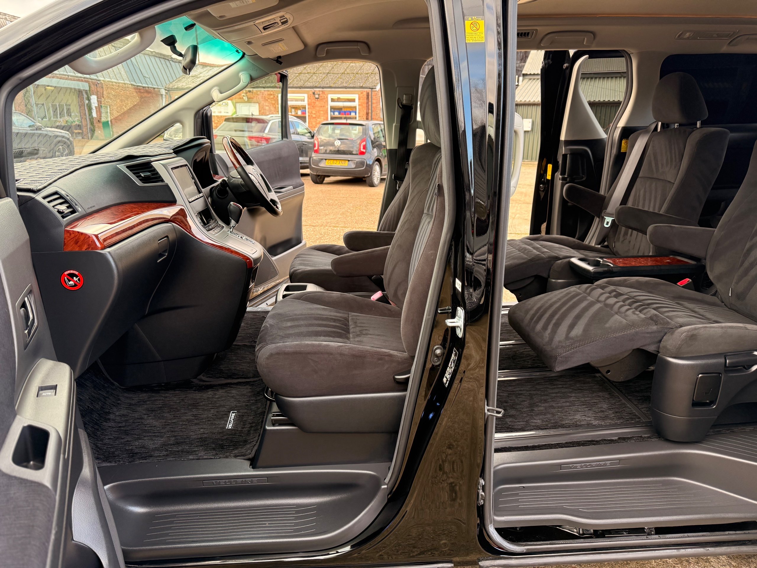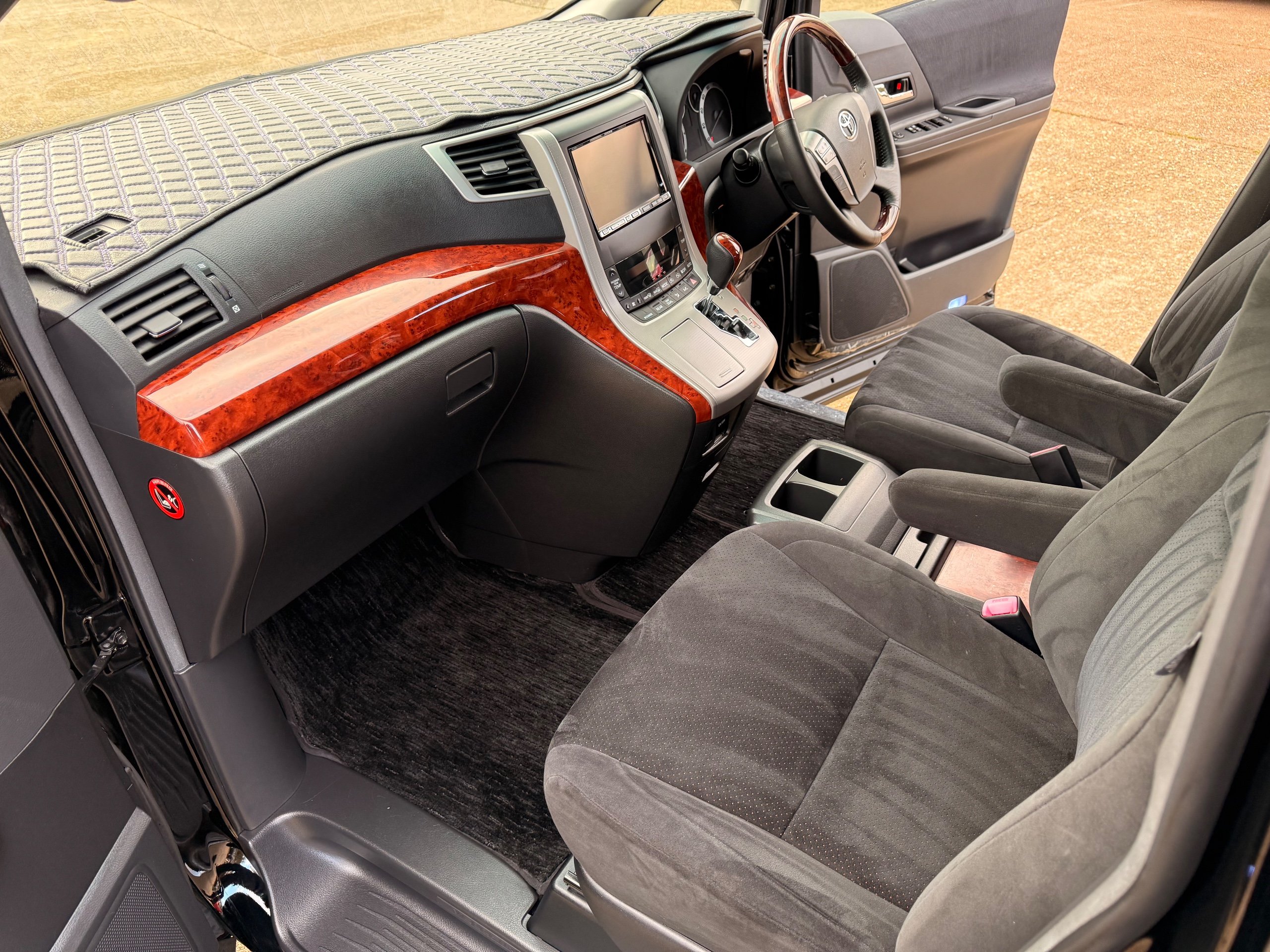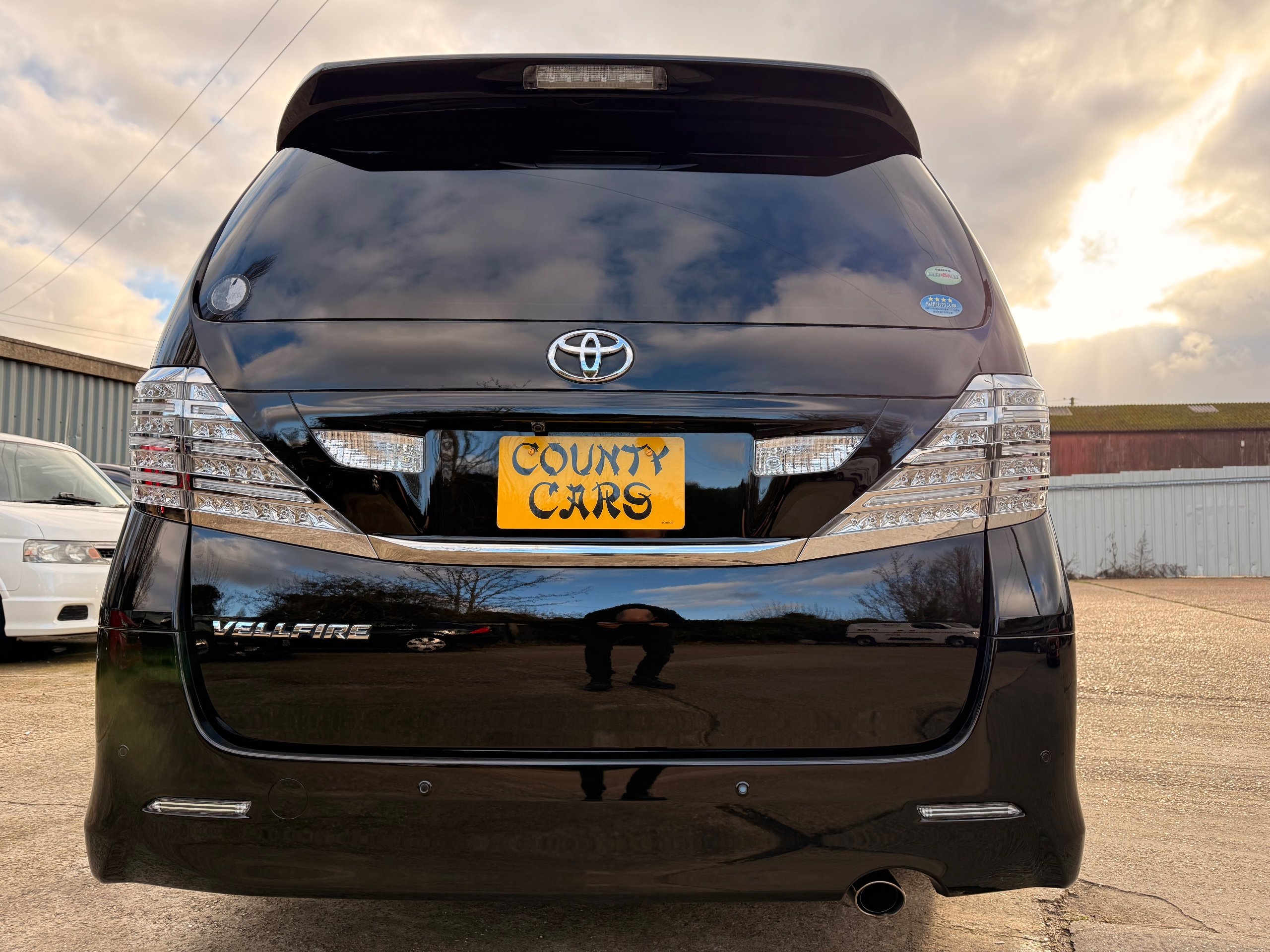2010 Toyota Vellfire 2.4Z platinum Selection, Grade 4.5 2010-60-Reg, Finished in Stunning Unmarked Black paintwork, Twin Electric Soft Closing Sliding Doors, Electric Soft Closing Tailgate, Front spots Full Privacy Glass, Rear Spoiler with built in brake light, Stunning set of 20" Maverick Alloys, The best set of rear l.e.d Clear lights, Rear bumper l.e.d lights, Key-less Entry, Key-less start, 7 Seater 7 Unblemished Black Alcantara Seats, The centre seats are Lounge style seats with extra leg rests, The seats also slide forwards and backwards and side to side with a folding centre table with built in cup holders, easy access to the rear seats, The rear seats fold away to give way to a large boot, Strip L.E.D lighting, Ambient lighting, Push button Start, Front and Rear parking sensors, Traction Control, Front and Rear Electric windows, Colour reversing camera, UK Stereo with Apple CarPlay, Electric Tailgate, Isofix points, Only covered a Genuine 20,000 Miles With All the Genuine paperwork from Japan including the auction sheet and The Export Certificate which both prove the mileage and condition before it left Japan Nationwide delivery service available