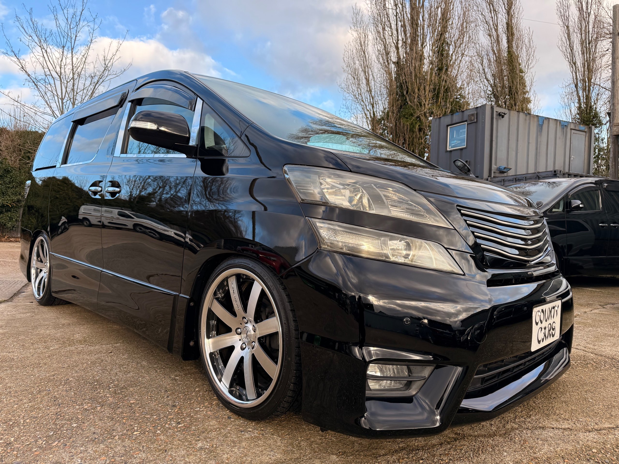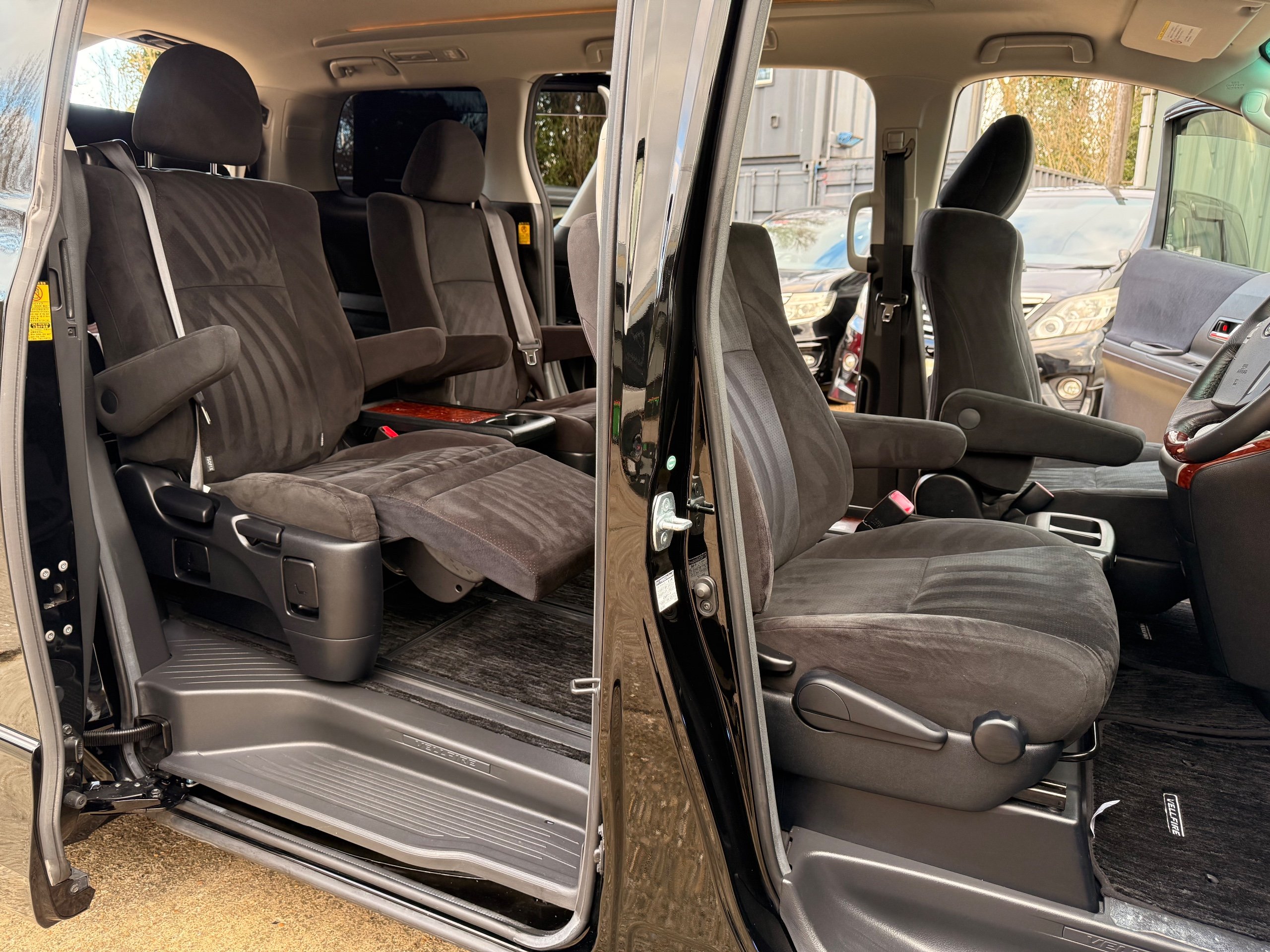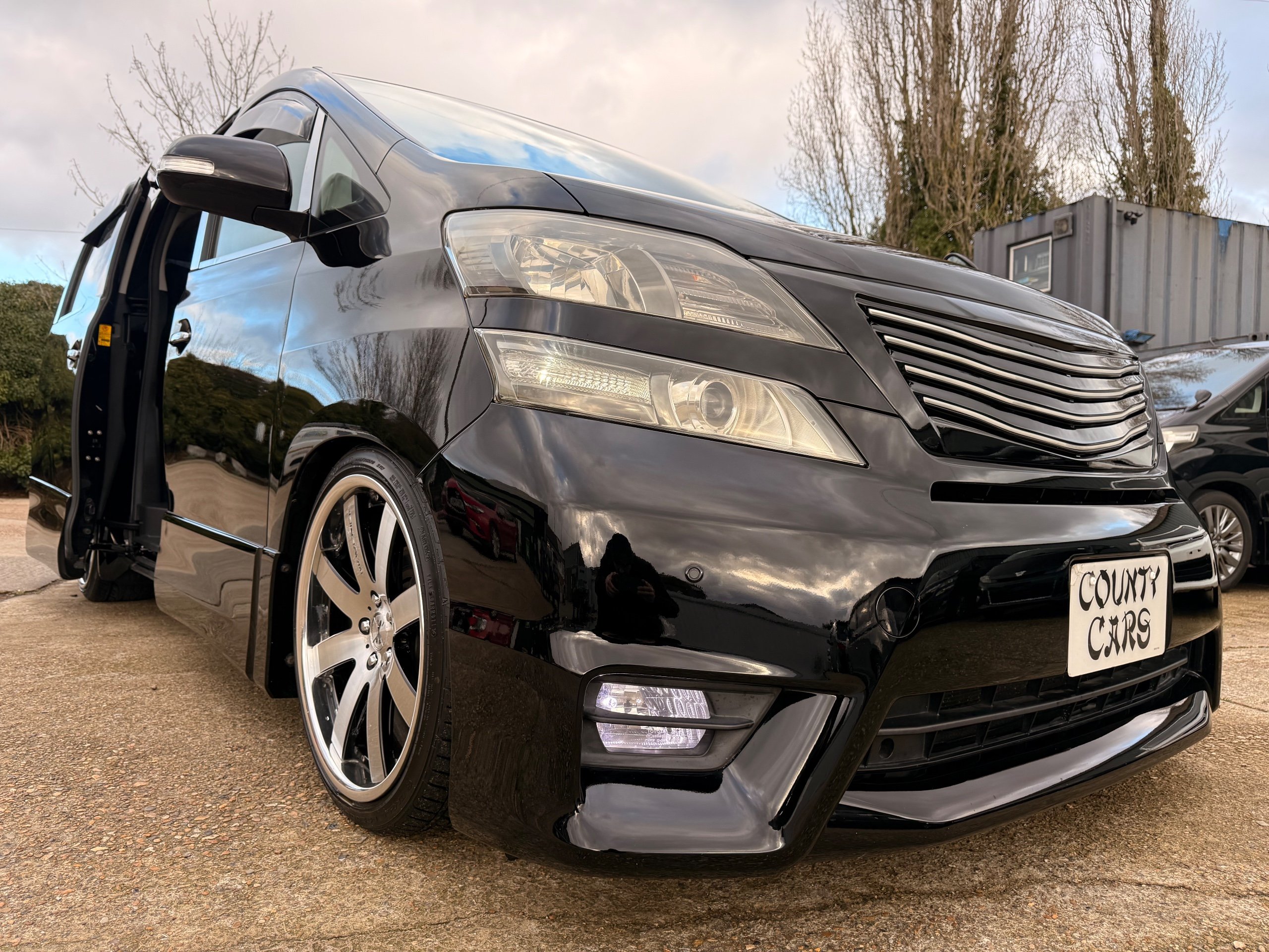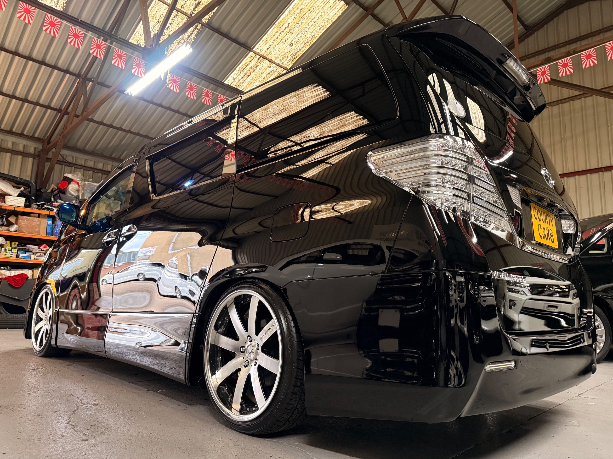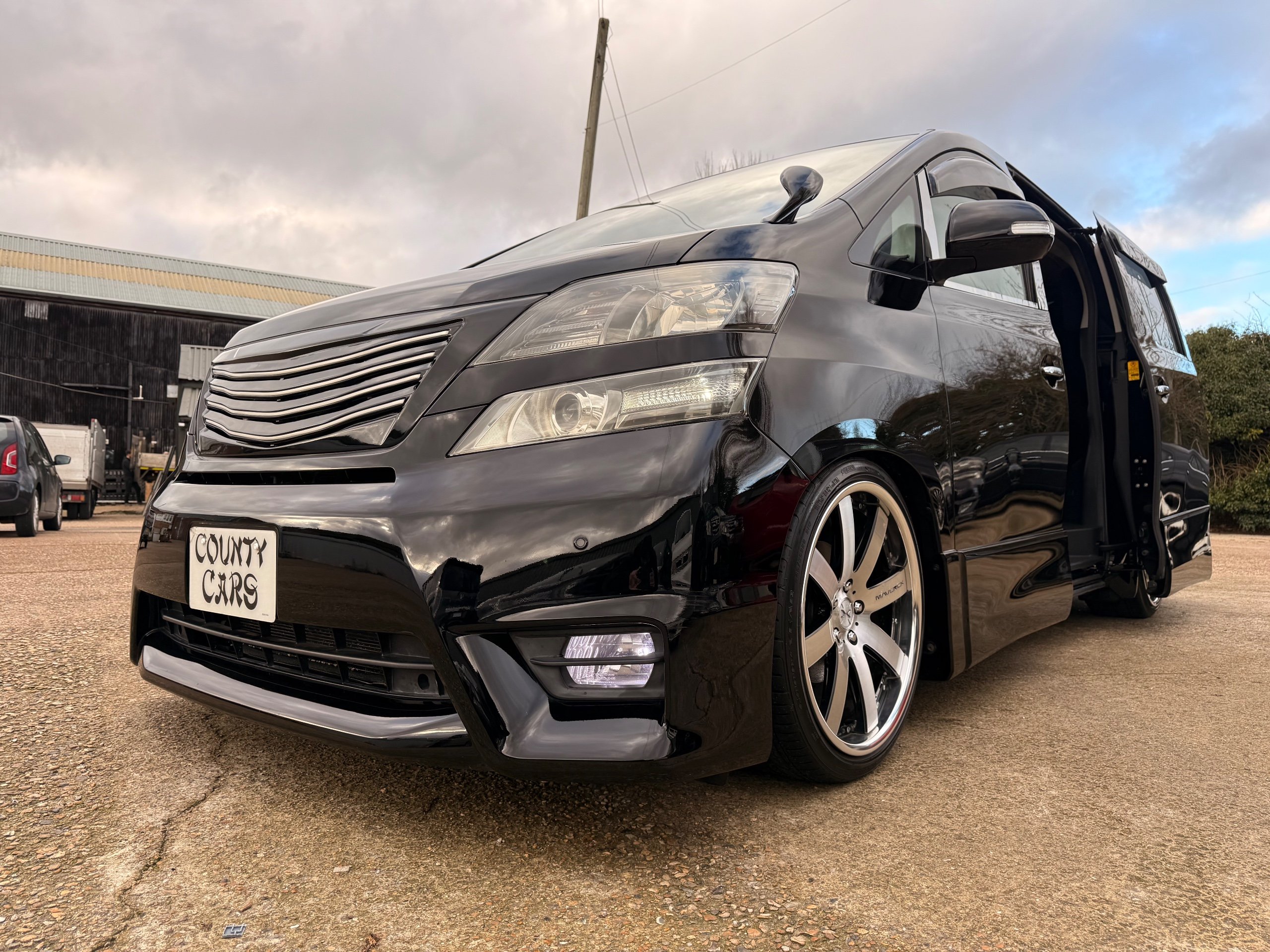 2010 Toyota Vellfire 2.4Z platinum Selection, Grade 4.5 2010-60-Reg, Finished in Stunning Unmarked Black paintwork, Twin Electric Soft Closing Sliding Doors, Electric Soft Closing Tailgate, Front spots Full Privacy Glass, Rear Spoiler with built in brake light, Stunning set of 20" Maverick Alloys, The best set of rear l.e.d Clear lights, Rear bumper l.e.d lights, Key-less Entry, Key-less start, 7 Seater 7 Unblemished Black Alcantara Seats, The centre seats are Lounge style seats with extra leg rests, The seats also slide forwards and backwards and side to side with a folding centre table with built in cup holders, easy access to the rear seats, The rear seats fold away to give way to a large boot, Strip L.E.D lighting, Ambient lighting, Push button Start, Front and Rear parking sensors, Traction Control, Front and Rear Electric windows, Colour reversing camera, UK Stereo with Apple CarPlay, Electric Tailgate, Isofix points, Only covered a Genuine 20,000 Miles With All the Genuine paperwork from Japan including the auction sheet and The Export Certificate which both prove the mileage and condition before it left Japan Nationwide delivery service available