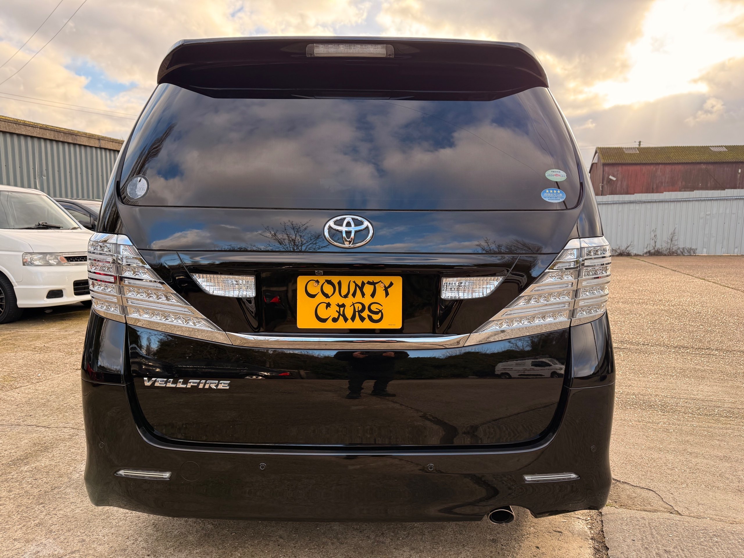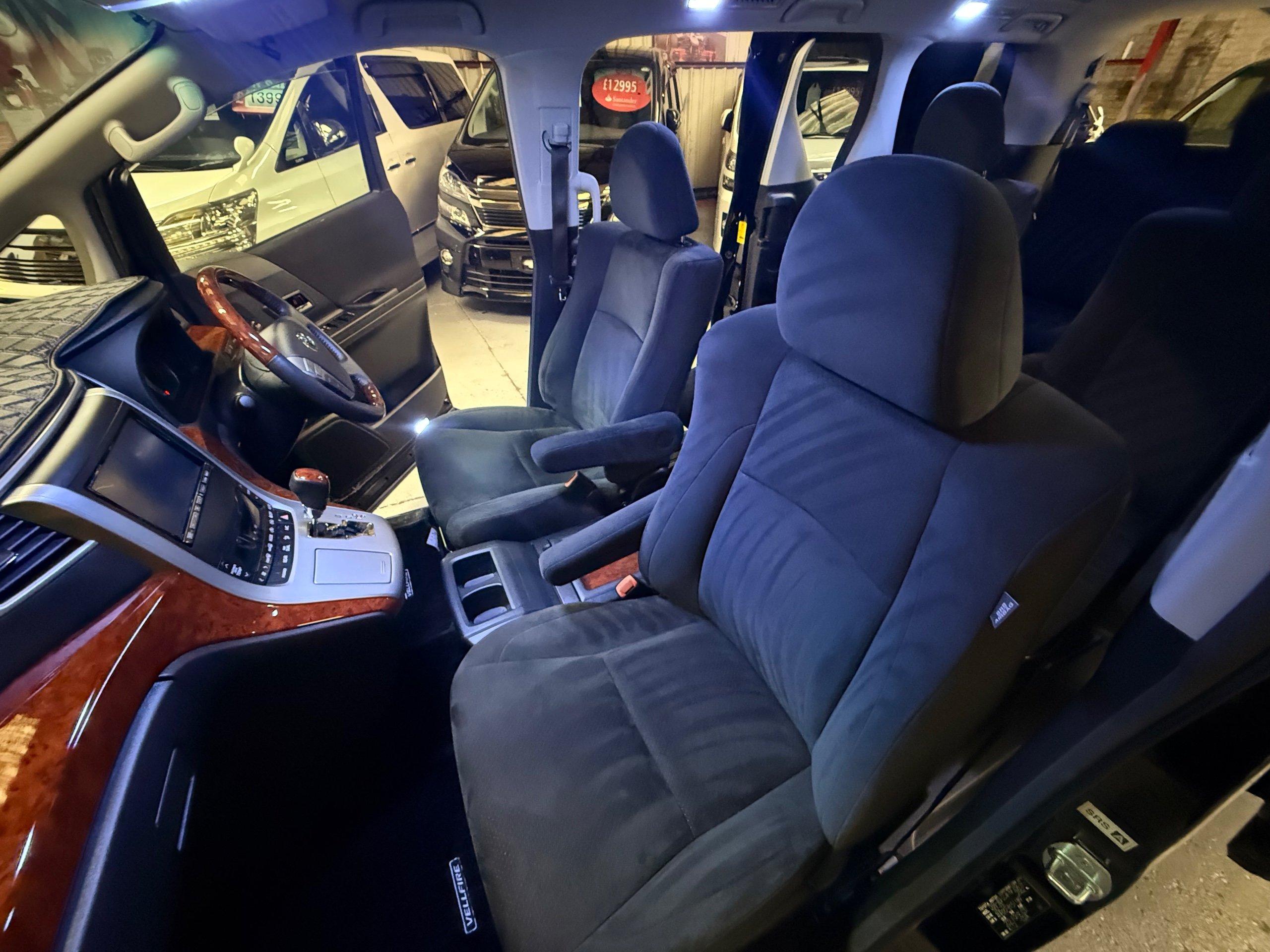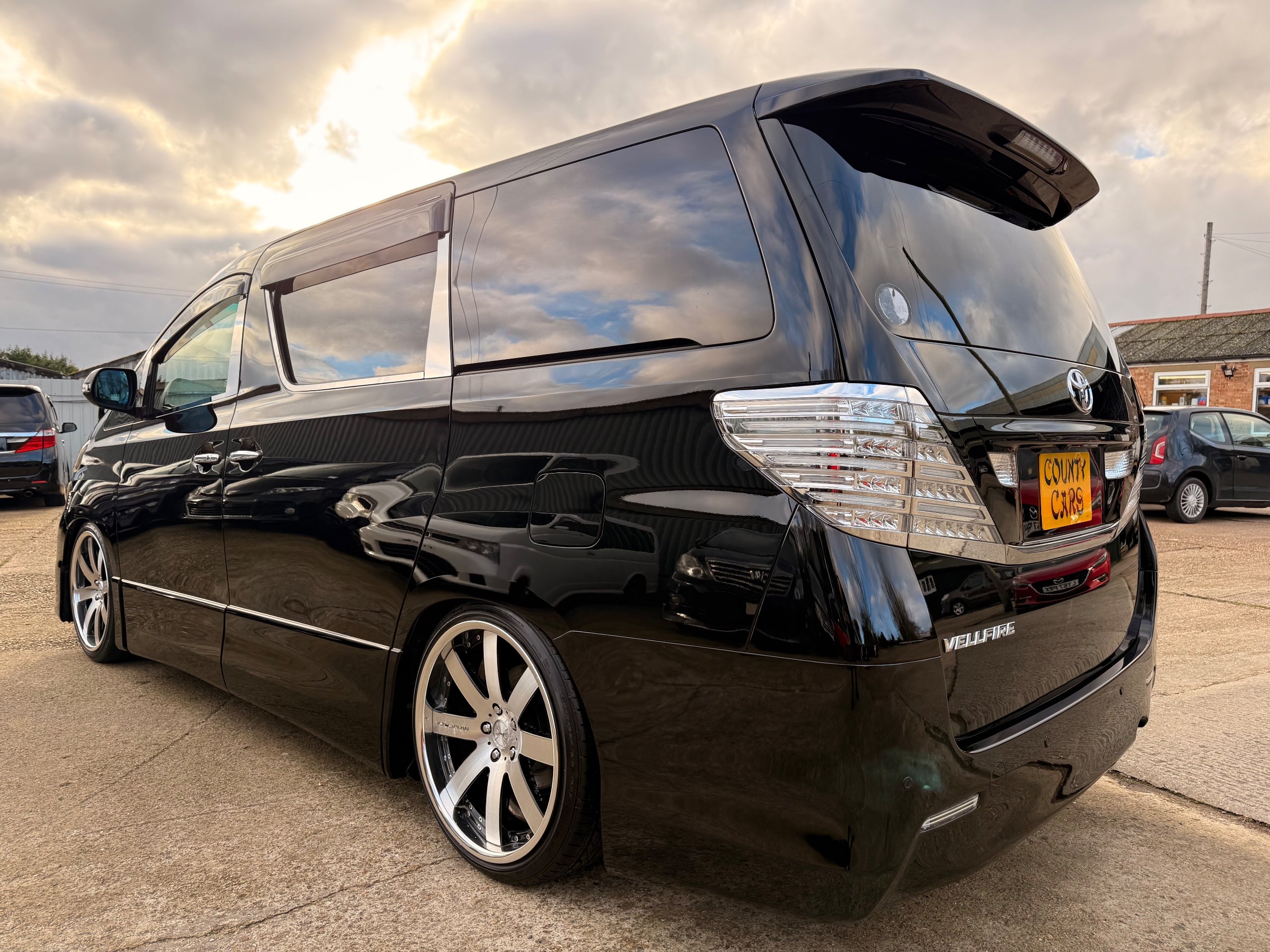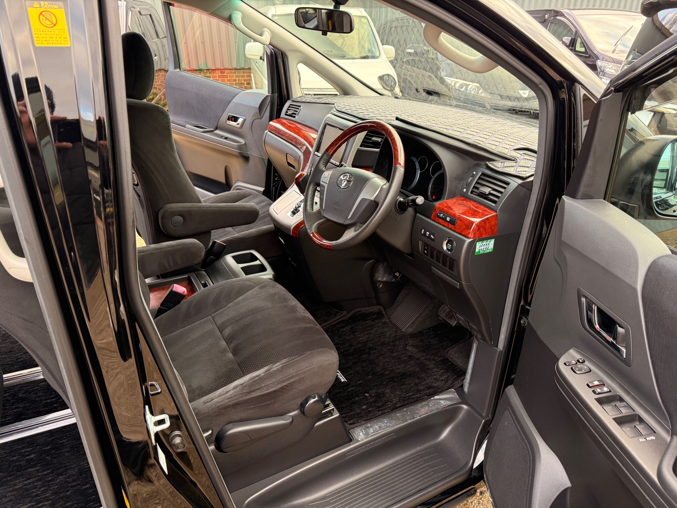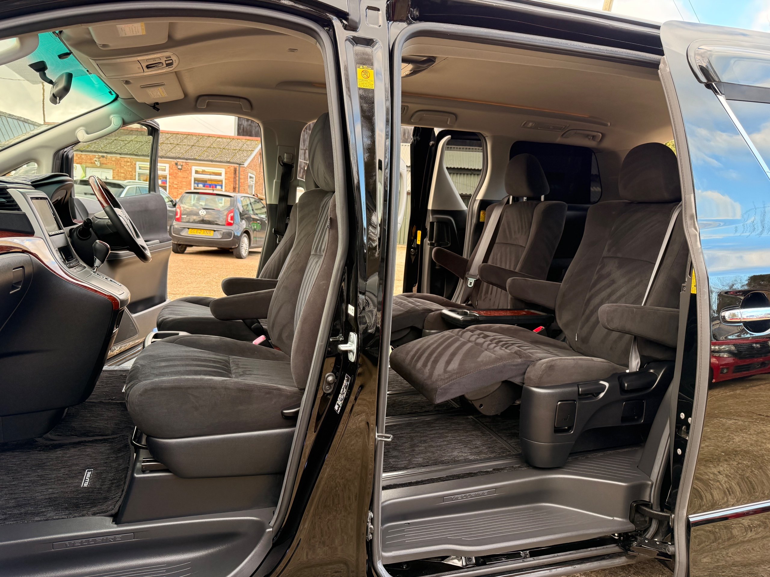 2010 Toyota Vellfire 2.4Z platinum Selection, Grade 4.5 2010-60-Reg, Finished in Stunning Unmarked Black paintwork, Twin Electric Soft Closing Sliding Doors, Electric Soft Closing Tailgate, Front spots Full Privacy Glass, Rear Spoiler with built in brake light, Stunning set of 20" Maverick Alloys, The best set of rear l.e.d Clear lights, Rear bumper l.e.d lights, Key-less Entry, Key-less start, 7 Seater 7 Unblemished Black Alcantara Seats, The centre seats are Lounge style seats with extra leg rests, The seats also slide forwards and backwards and side to side with a folding centre table with built in cup holders, easy access to the rear seats, The rear seats fold away to give way to a large boot, Strip L.E.D lighting, Ambient lighting, Push button Start, Front and Rear parking sensors, Traction Control, Front and Rear Electric windows, Colour reversing camera, UK Stereo with Apple CarPlay, Electric Tailgate, Isofix points, Only covered a Genuine 20,000 Miles With All the Genuine paperwork from Japan including the auction sheet and The Export Certificate which both prove the mileage and condition before it left Japan Nationwide delivery service available