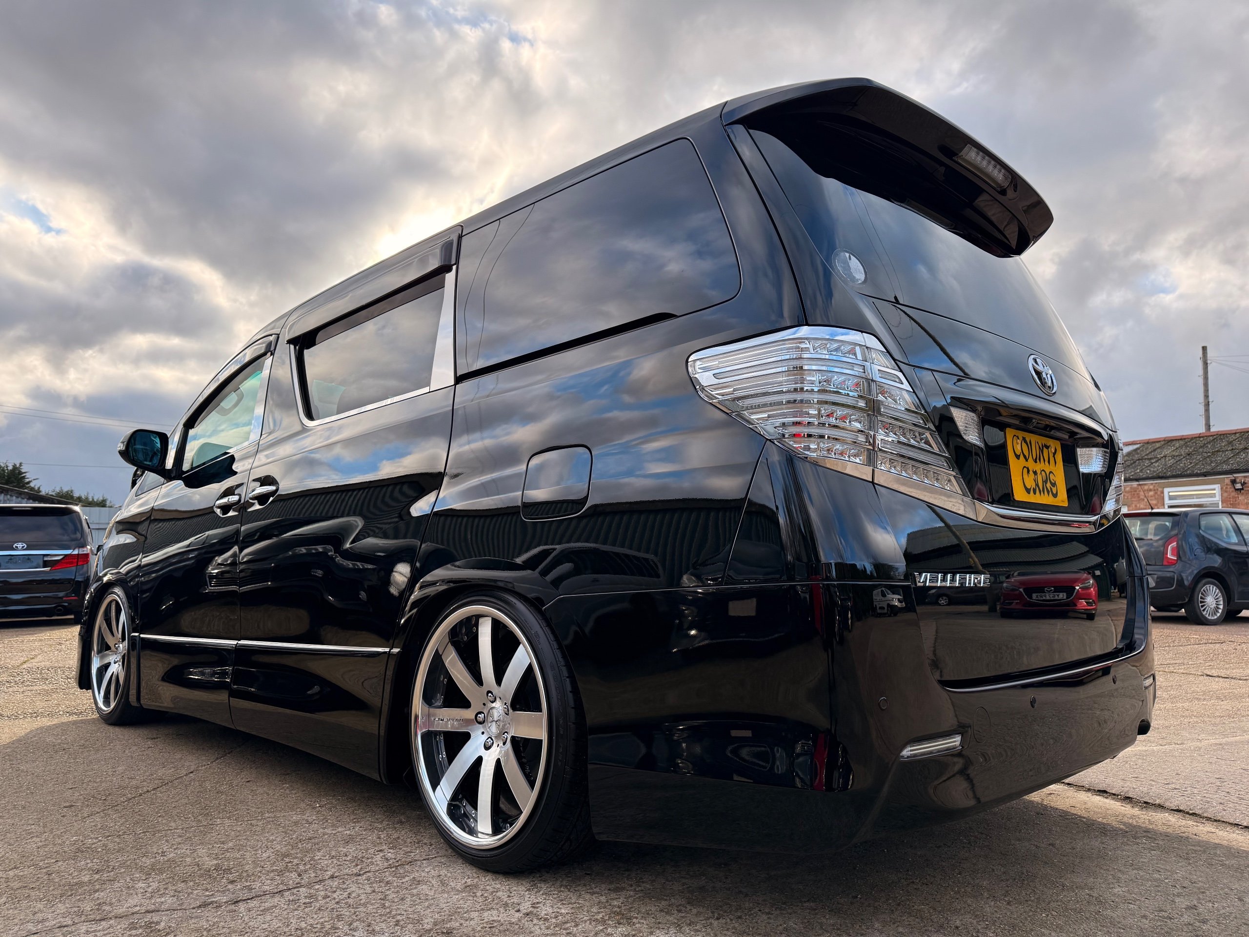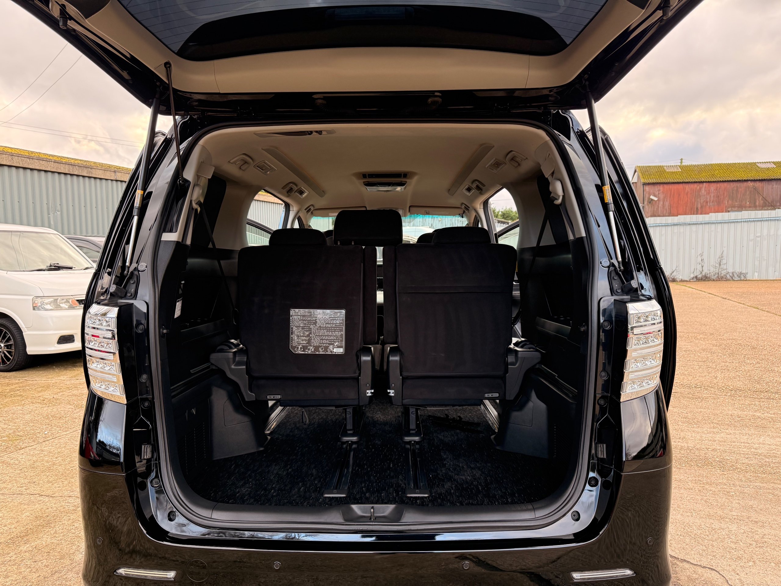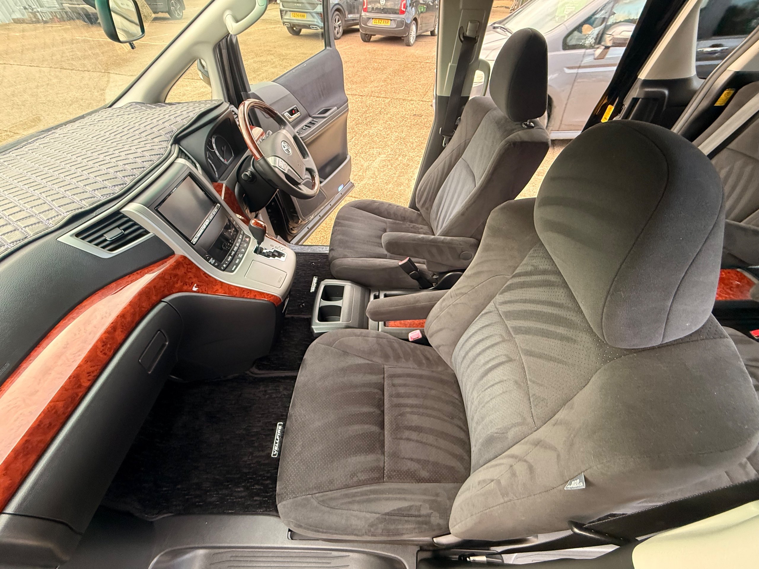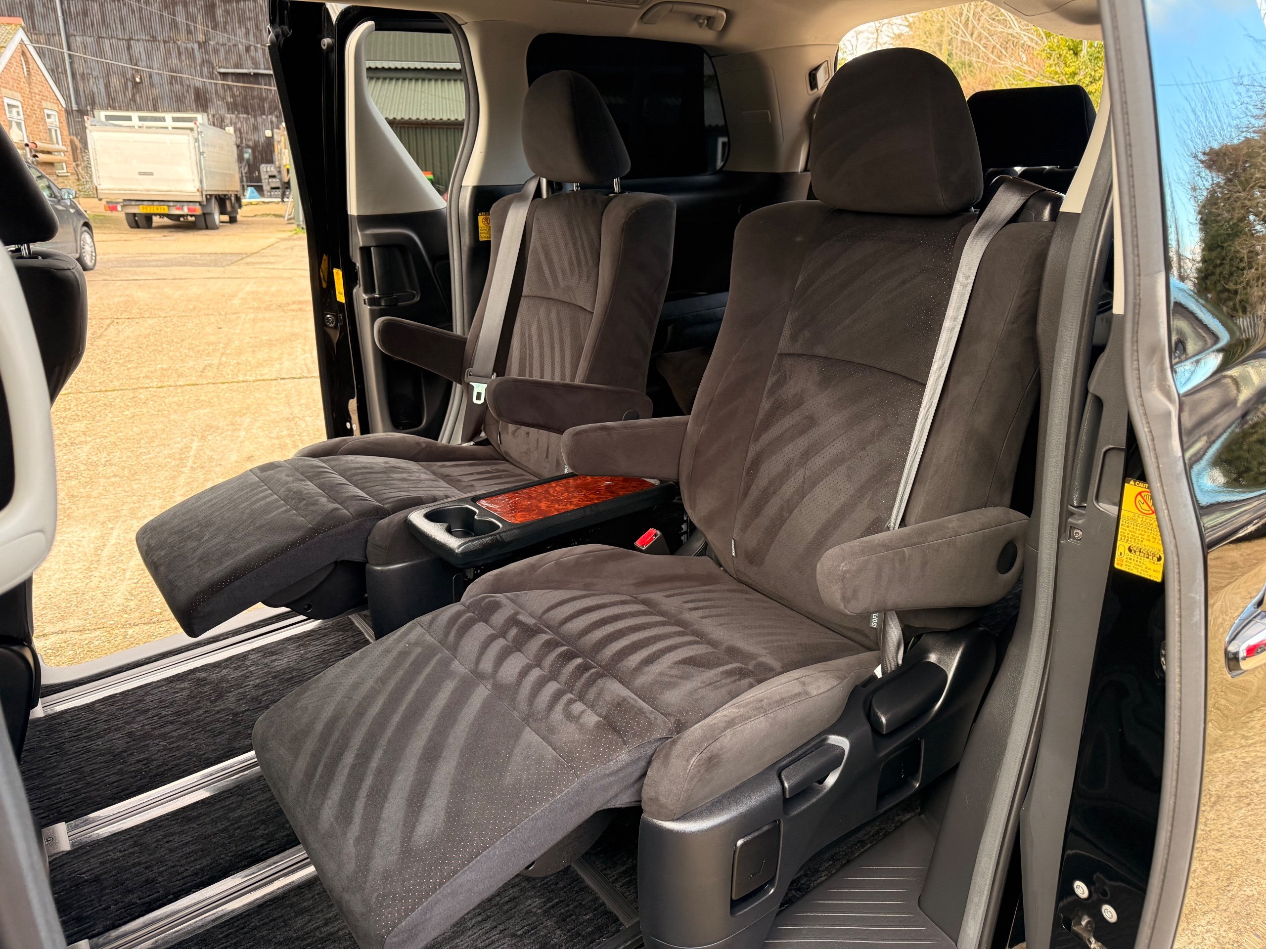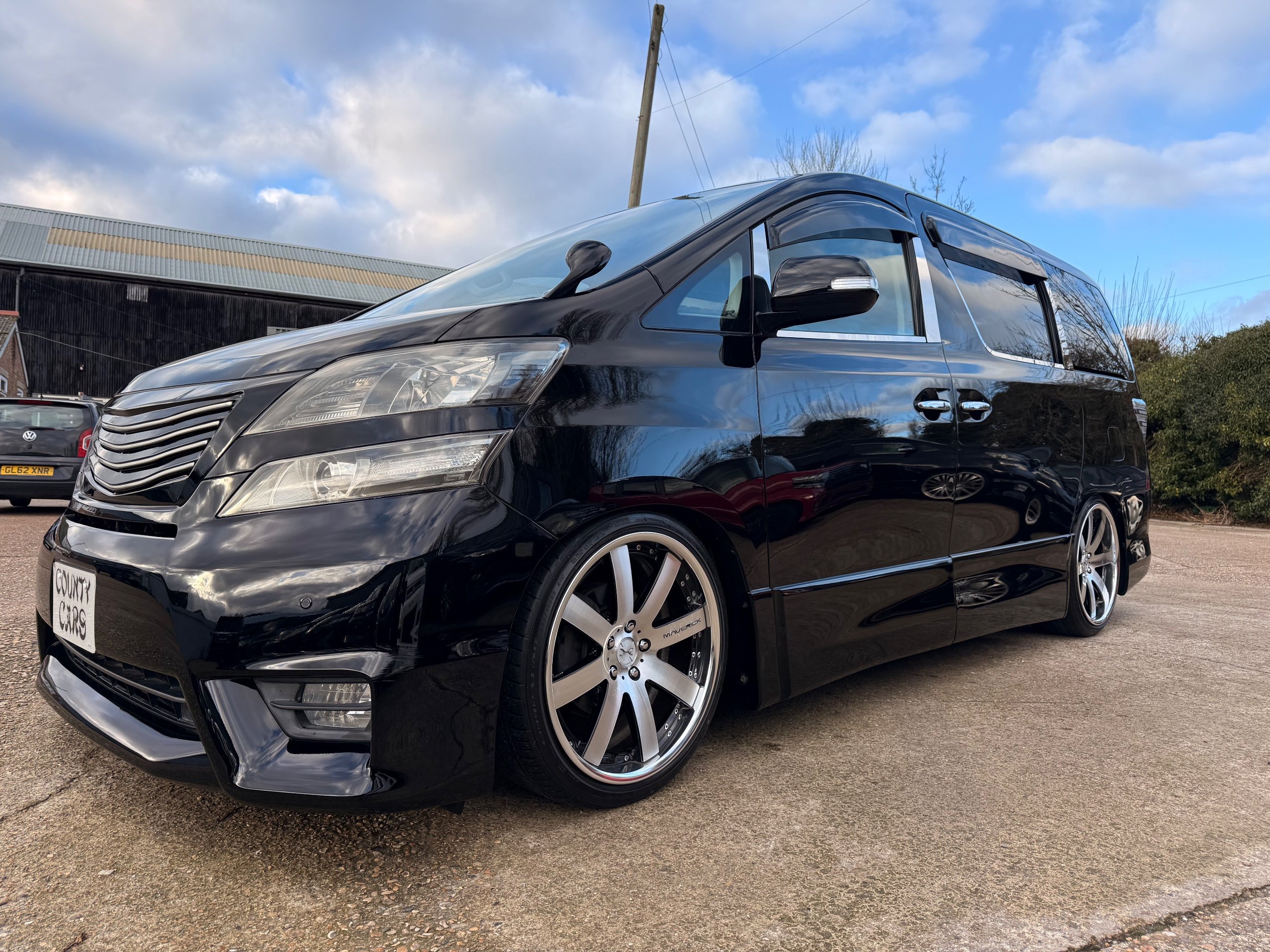 2010 Toyota Vellfire 2.4Z platinum Selection, Grade 4.5 2010-60-Reg, Finished in Stunning Unmarked Black paintwork, Twin Electric Soft Closing Sliding Doors, Electric Soft Closing Tailgate, Front spots Full Privacy Glass, Rear Spoiler with built in brake light, Stunning set of 20" Maverick Alloys, The best set of rear l.e.d Clear lights, Rear bumper l.e.d lights, Key-less Entry, Key-less start, 7 Seater 7 Unblemished Black Alcantara Seats, The centre seats are Lounge style seats with extra leg rests, The seats also slide forwards and backwards and side to side with a folding centre table with built in cup holders, easy access to the rear seats, The rear seats fold away to give way to a large boot, Strip L.E.D lighting, Ambient lighting, Push button Start, Front and Rear parking sensors, Traction Control, Front and Rear Electric windows, Colour reversing camera, UK Stereo with Apple CarPlay, Electric Tailgate, Isofix points, Only covered a Genuine 20,000 Miles With All the Genuine paperwork from Japan including the auction sheet and The Export Certificate which both prove the mileage and condition before it left Japan Nationwide delivery service available