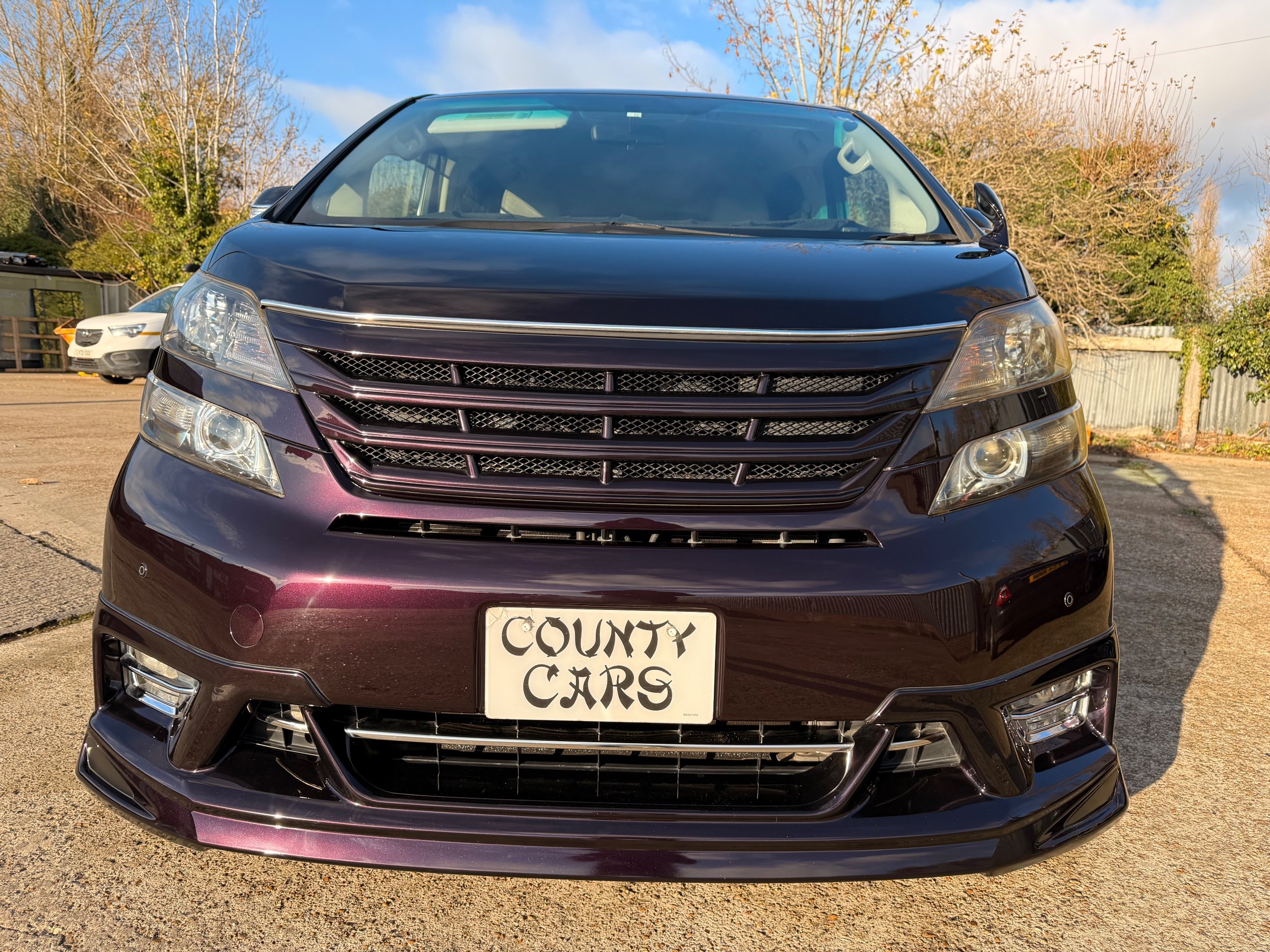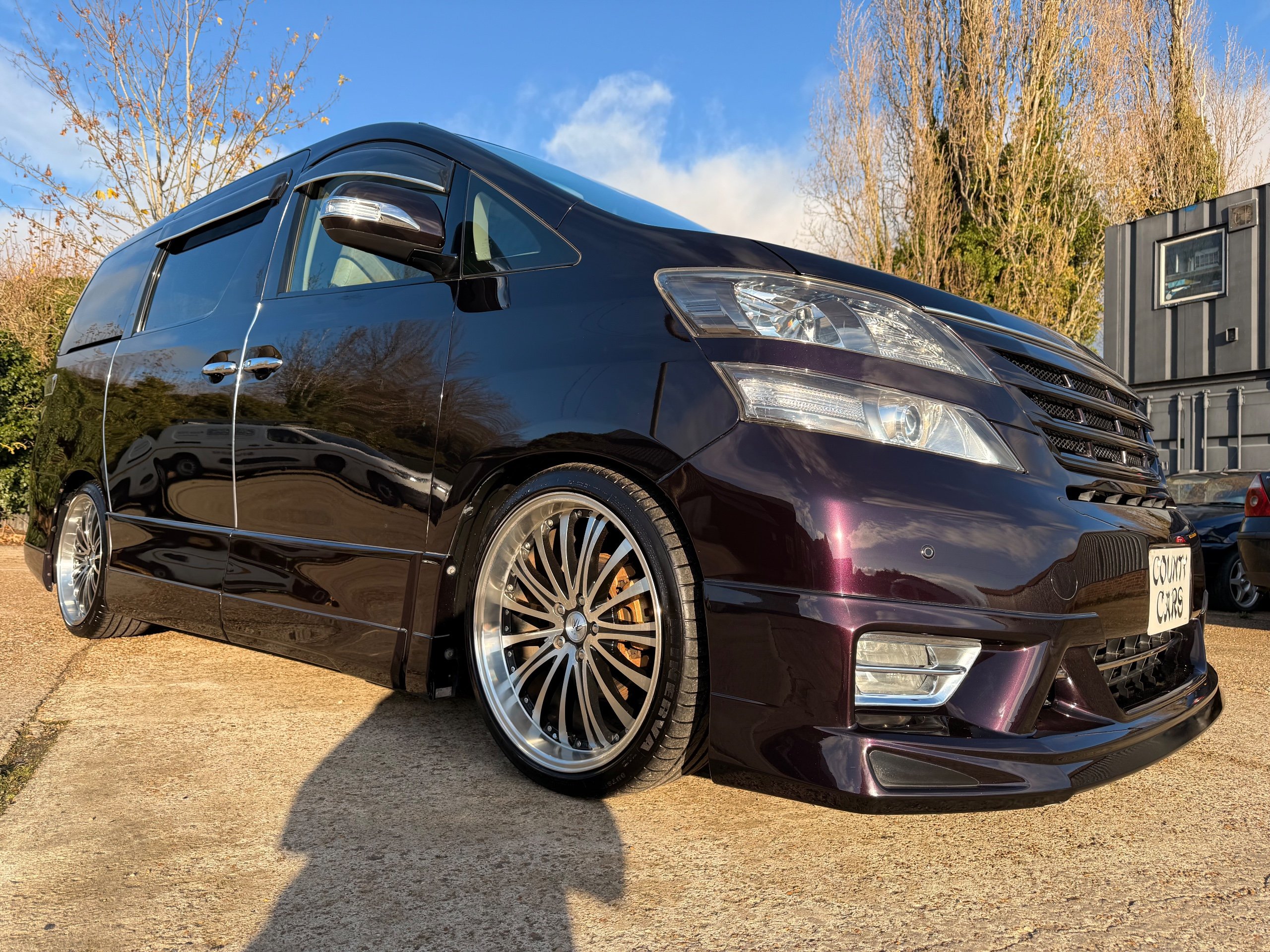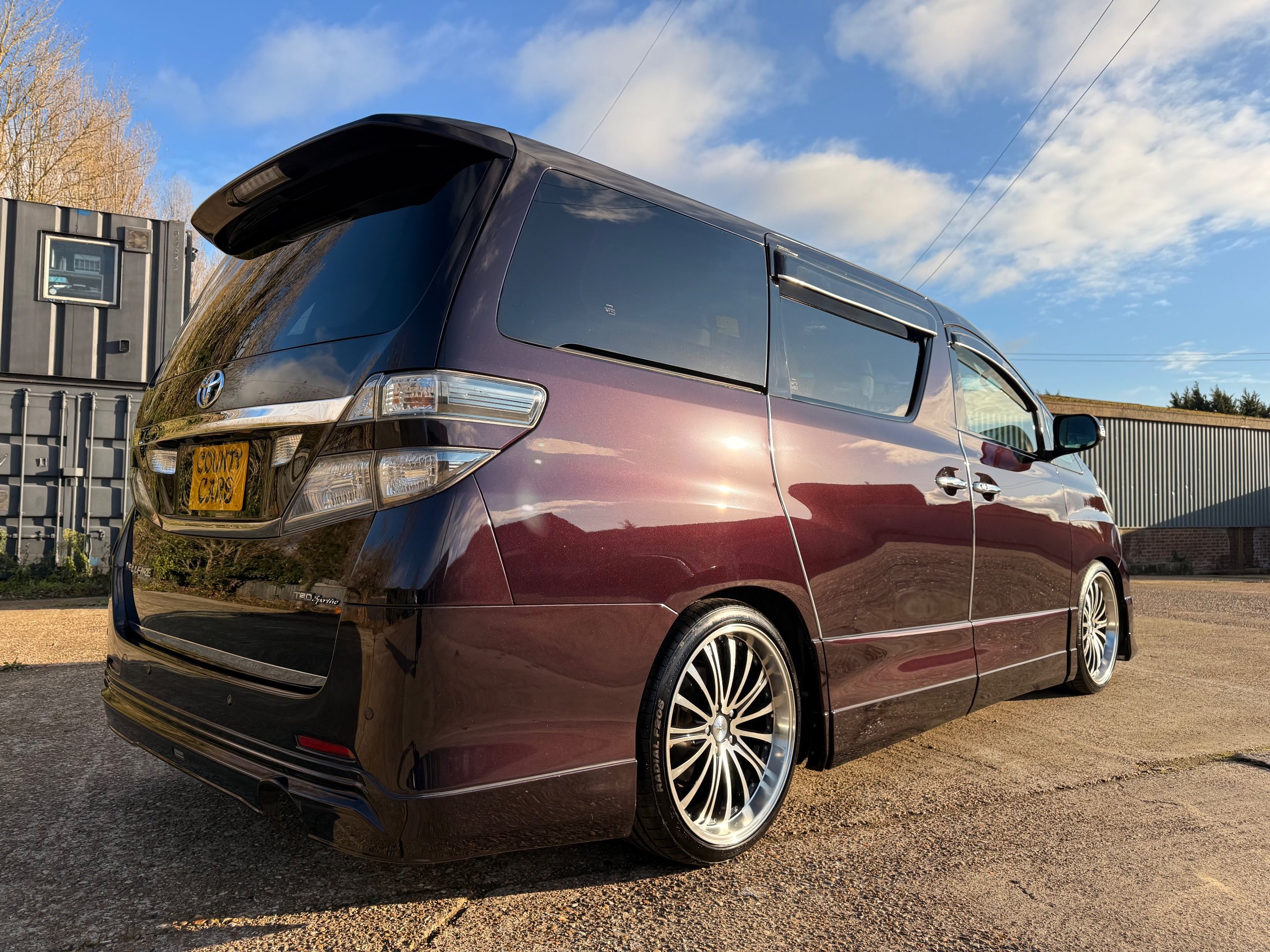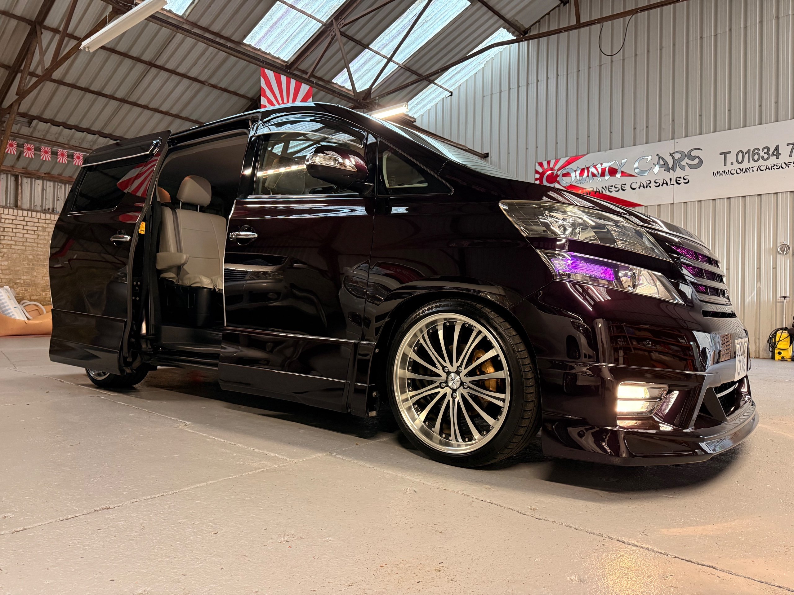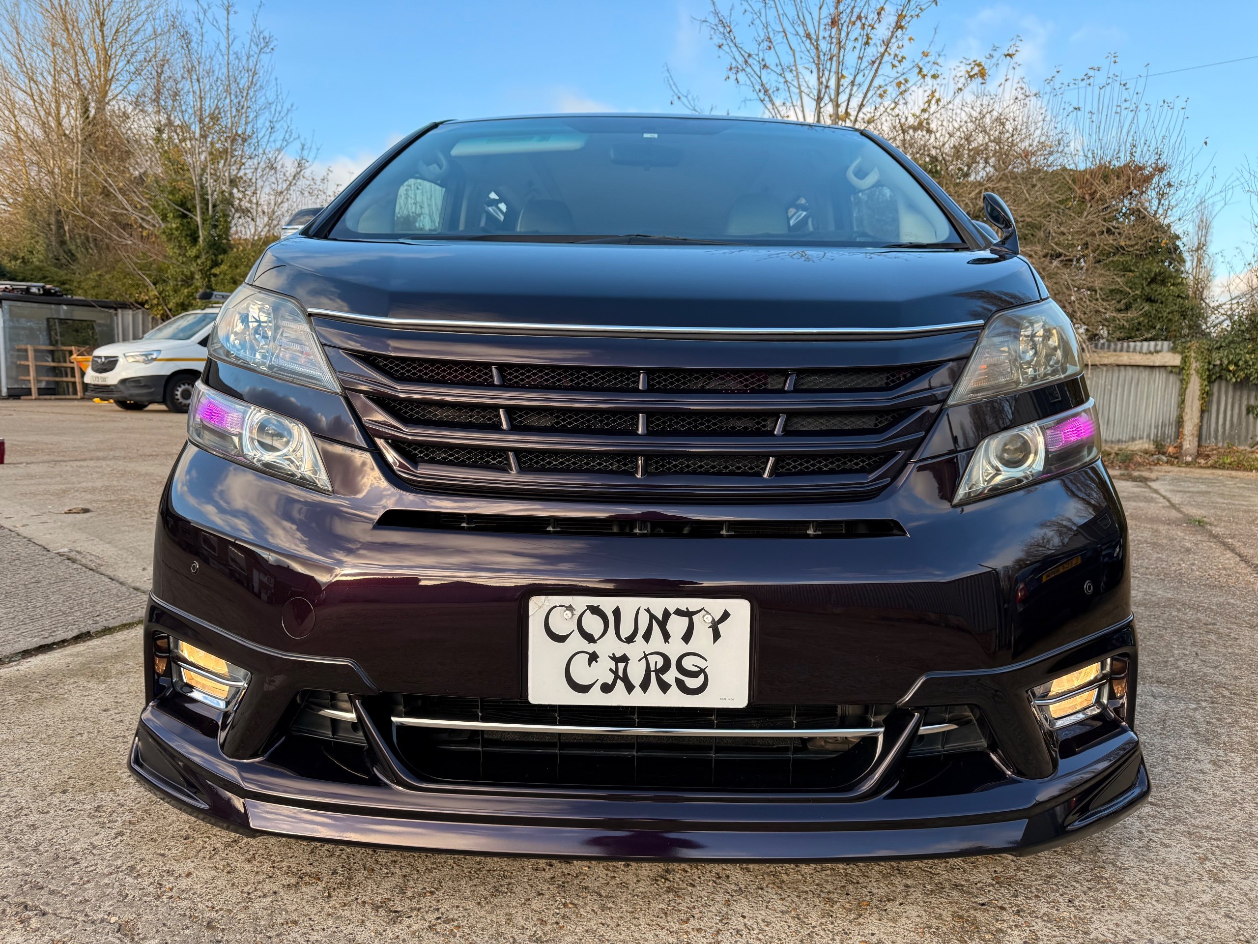 2010 Toyota Vellfire 2.4Z platinum Selection, 2010-10-Reg, Finished in Stunning Unmarked Metallic Purple paintwork, Twin Electric Soft Closing Sliding Doors, Electric Tailgate, Front spots with chrome covers, Full Privacy Glass, Rear Spoiler with built in brake light, L.E.D Lights, Chrome door handles, fold in wing mirrors with built in clear indicators with chrome covers, 20” multi spoke alloys with black gloss centres, rear chrome boot strip, Key-less Entry, Key-less start, 7 Seater 7 Unblemished Grey Leather look Expensive Seat Covers, The centre seats are Lounge style seats with extra leg rests, The seats also slide forwards and backwards and side to side with a folding centre table with built in cup holders, easy access to the rear seats, The rear seats fold away to give way to a large boot, Strip L.E.D lighting, blue foot well lights,Push button Start Front and Rear parking sensors, Traction Control, Front and Rear Electric windows, Colour reversing camera, Stereo with Apple CarPlay and Android Auto, Electric Tailgate, Isofix points, Full Dash Wood Kit, Chrome Air vent covers Only covered a Genuine 63,000 Miles With All the Genuine paperwork from Japan including the auction sheet and the Export Certificate which both prove the mileage and condition before it left Japan, Car VX Checked